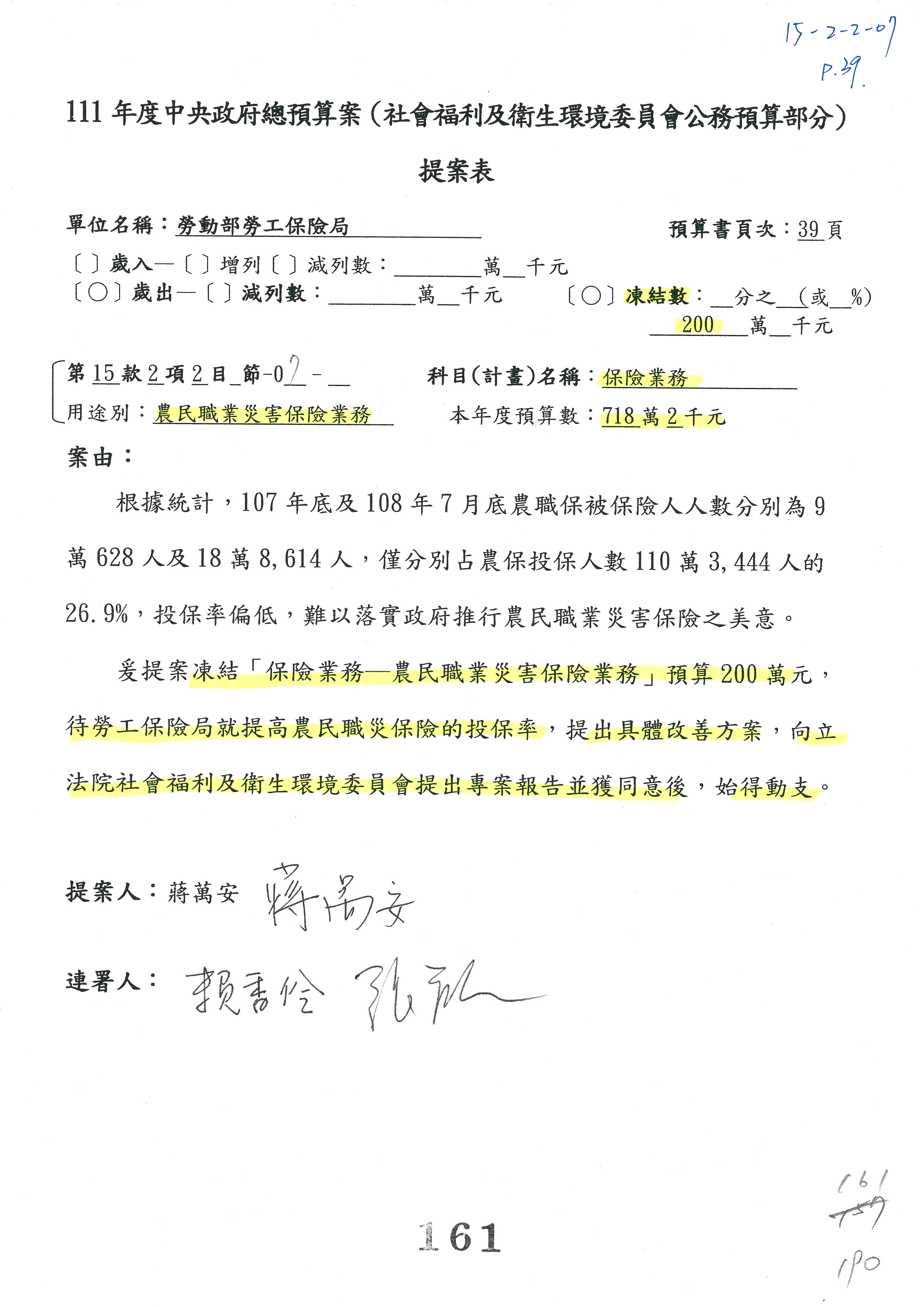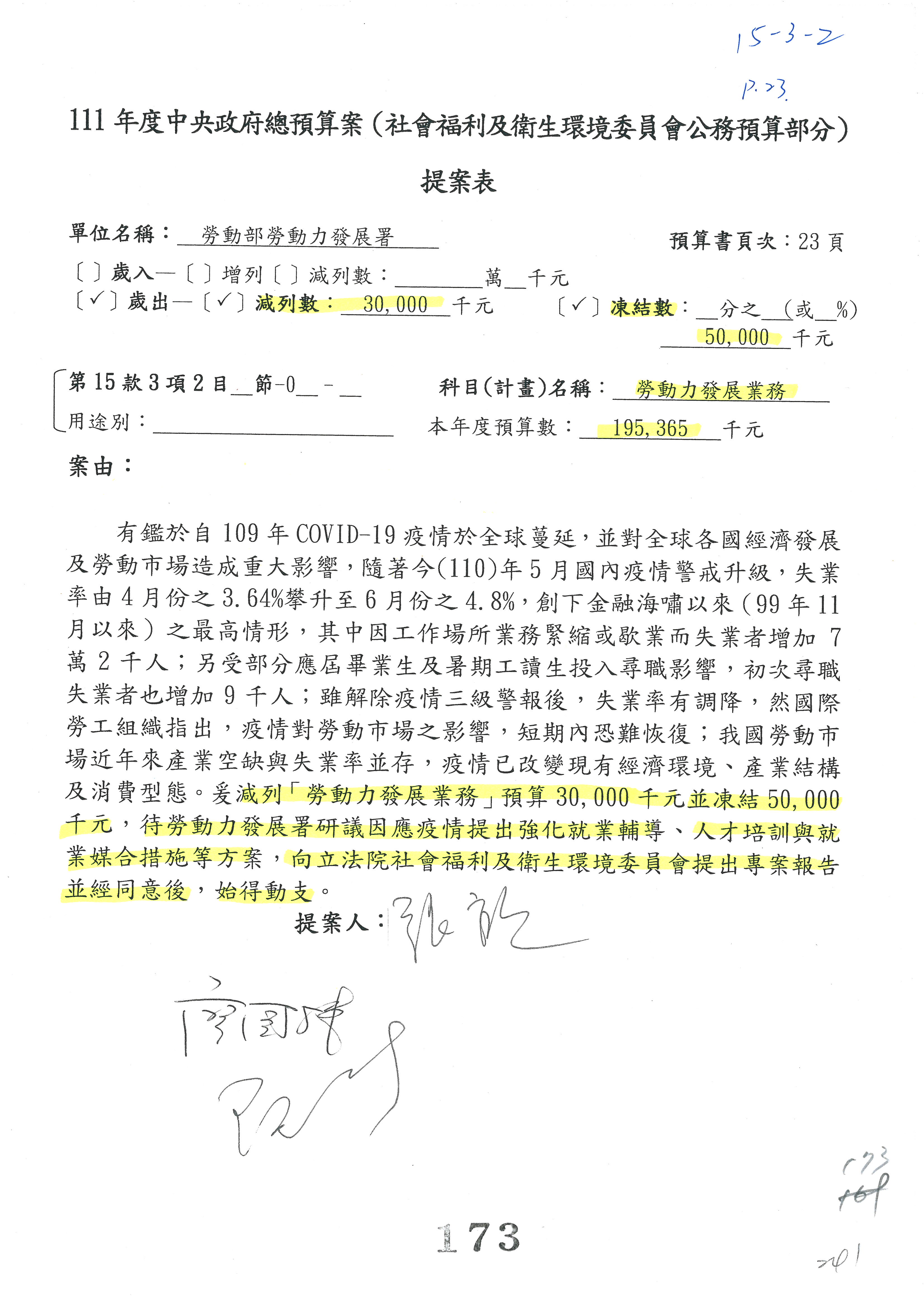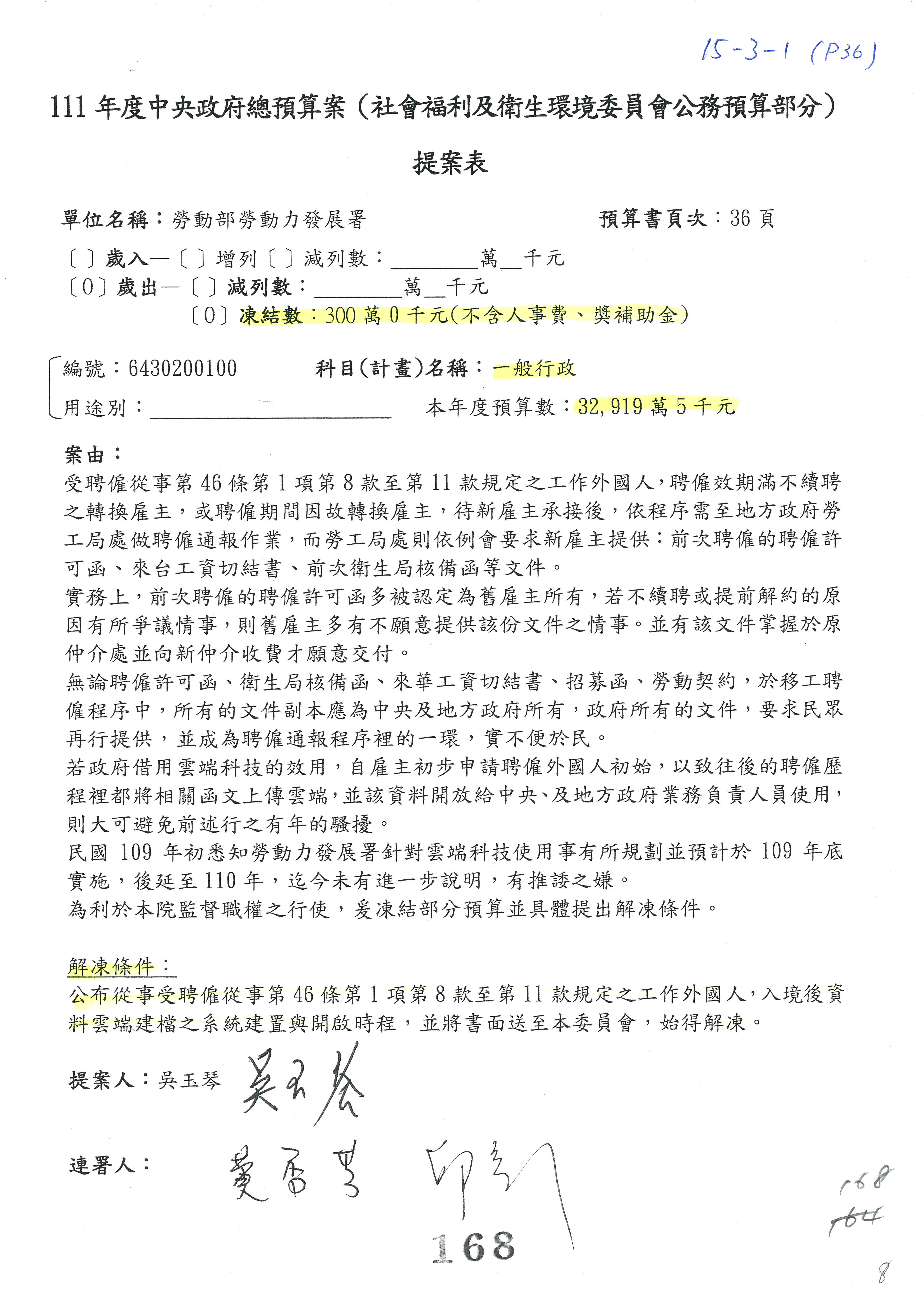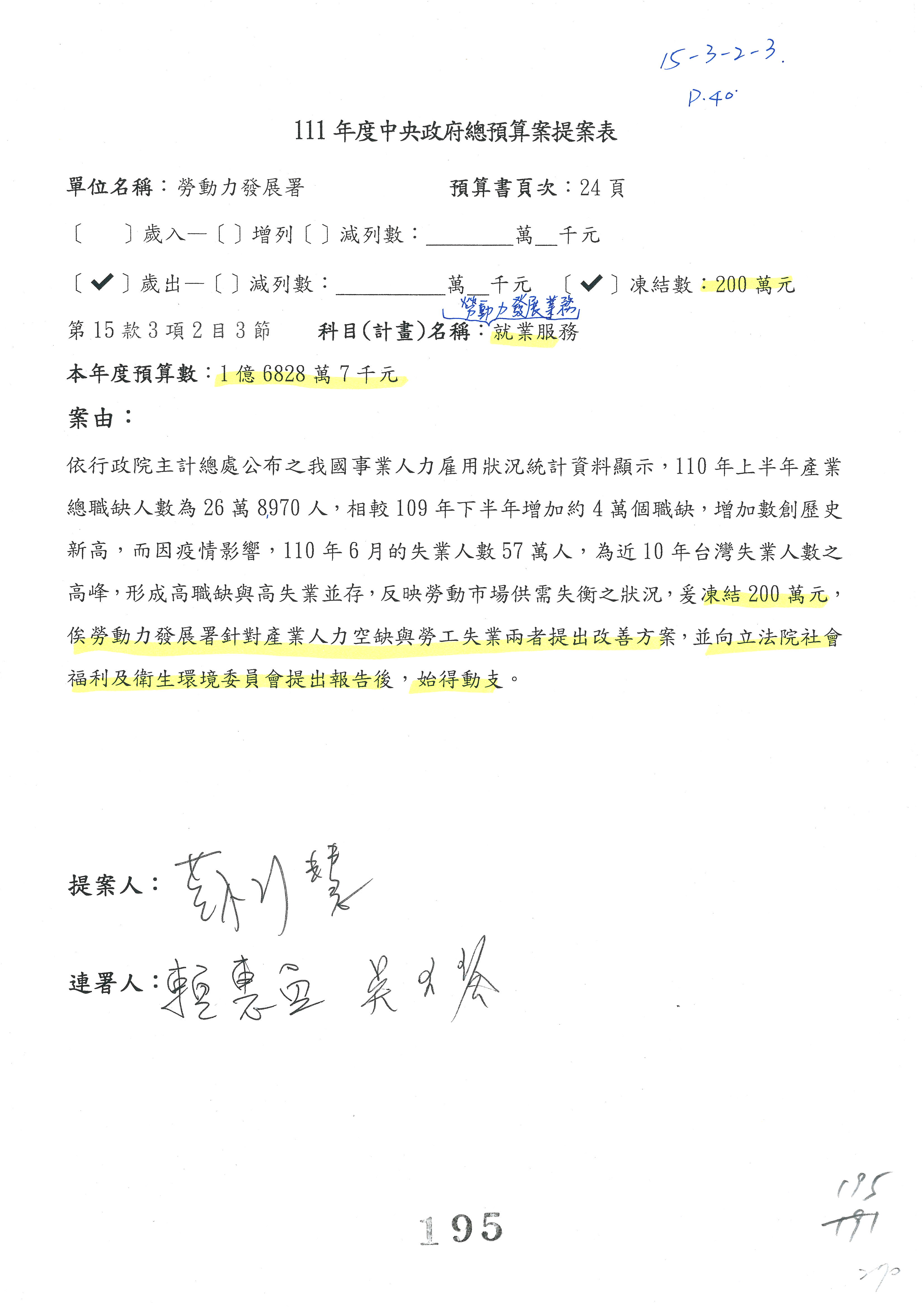 陳司長美女:我們會遵照委員指示,持續研議勞保財務改善的對策,委員同意改凍10萬元,併第3案凍結,提書面報告後始得動支,委員已簽署。