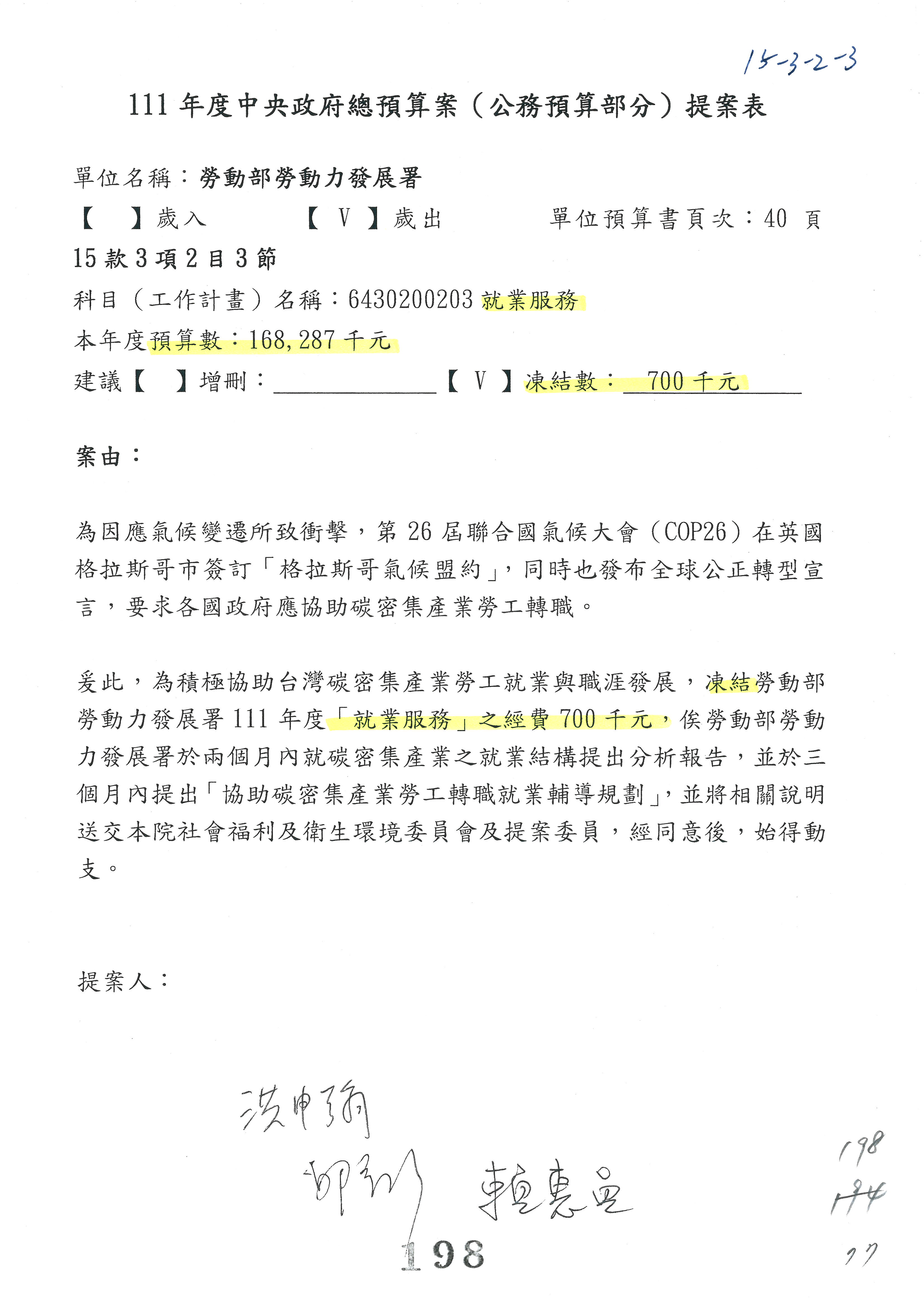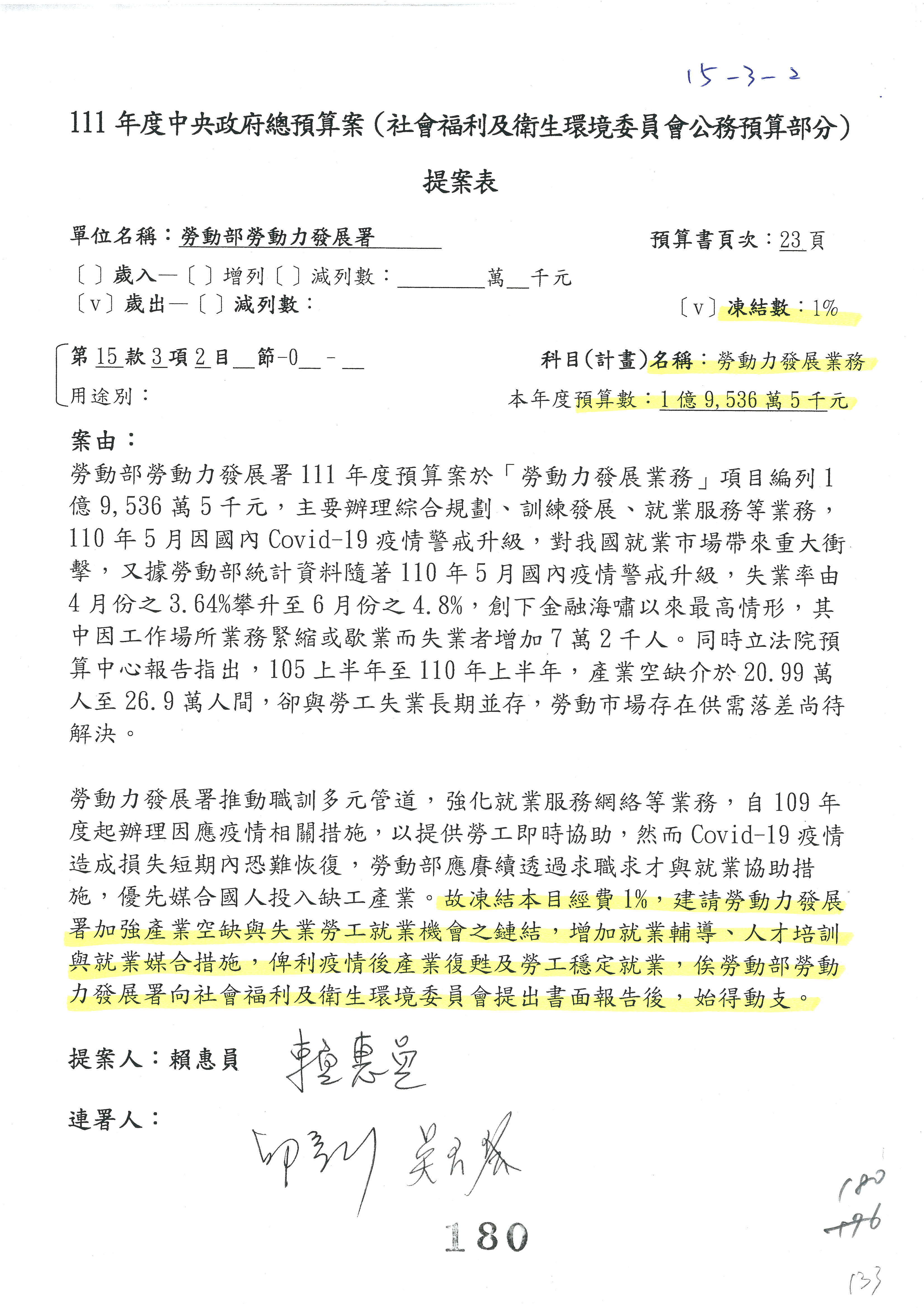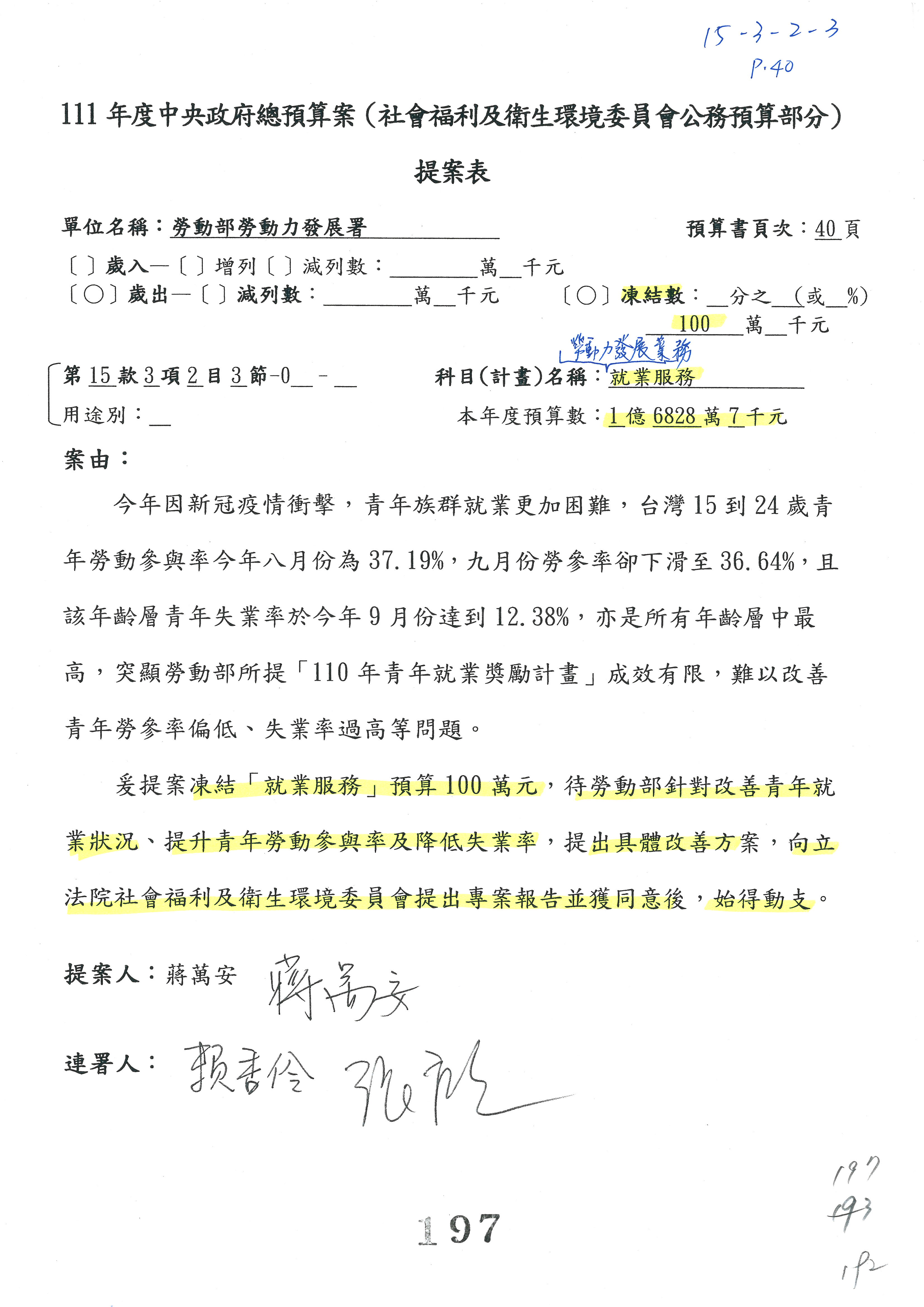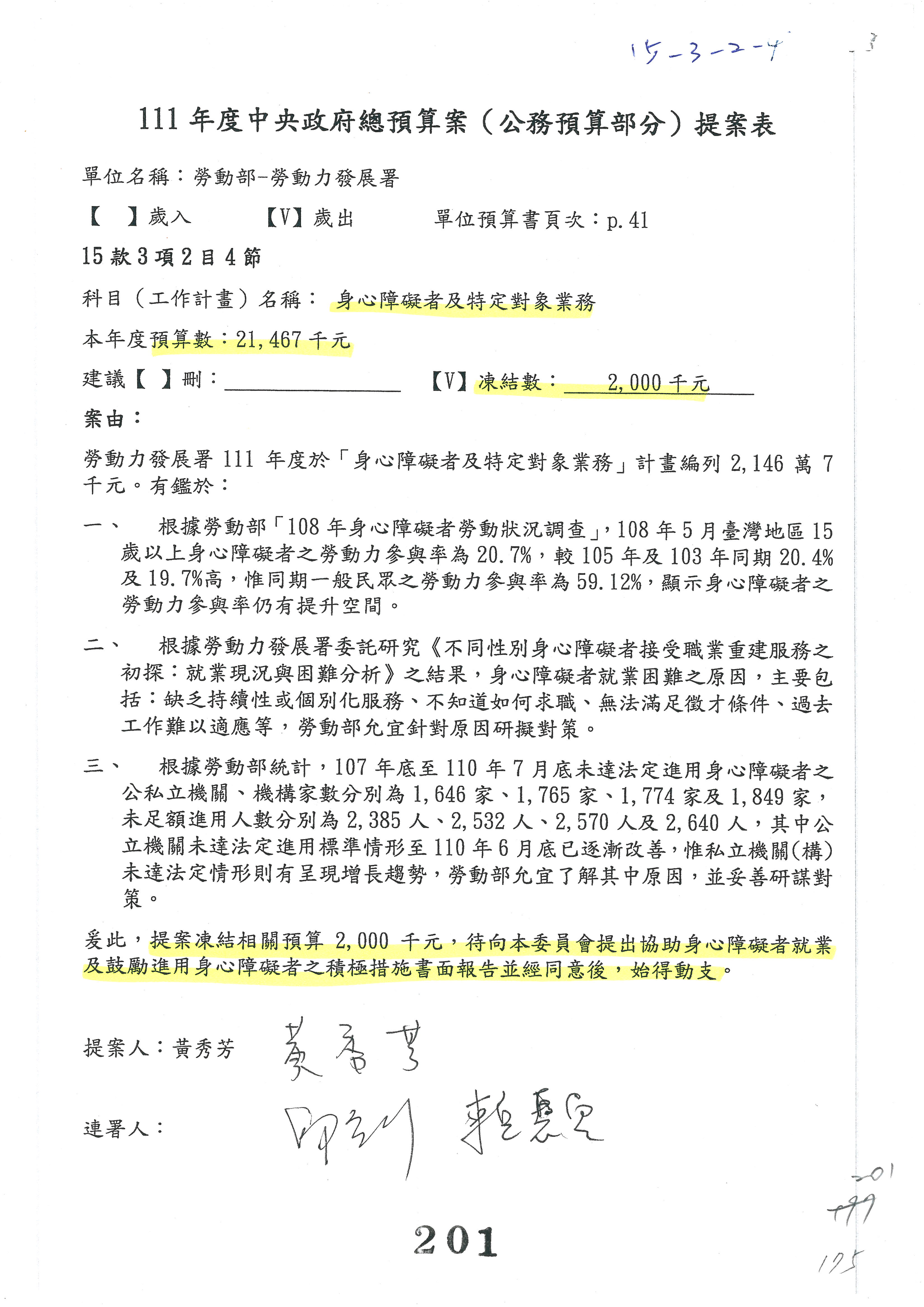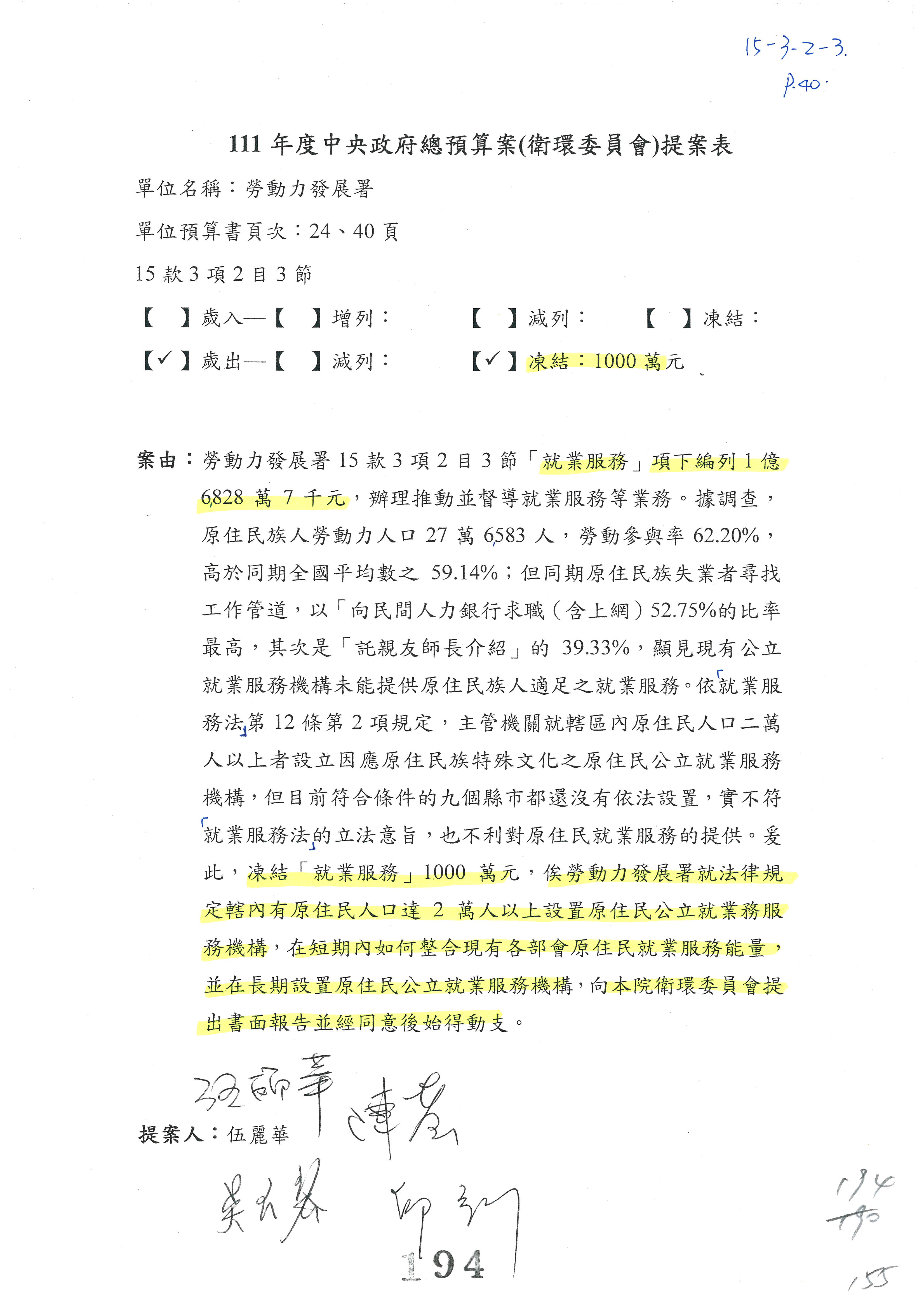 陳司長美女:我們會遵照委員指示,持續研議勞保財務改善的對策,委員同意改凍10萬元,併第3案凍結,提書面報告後始得動支,委員已簽署。