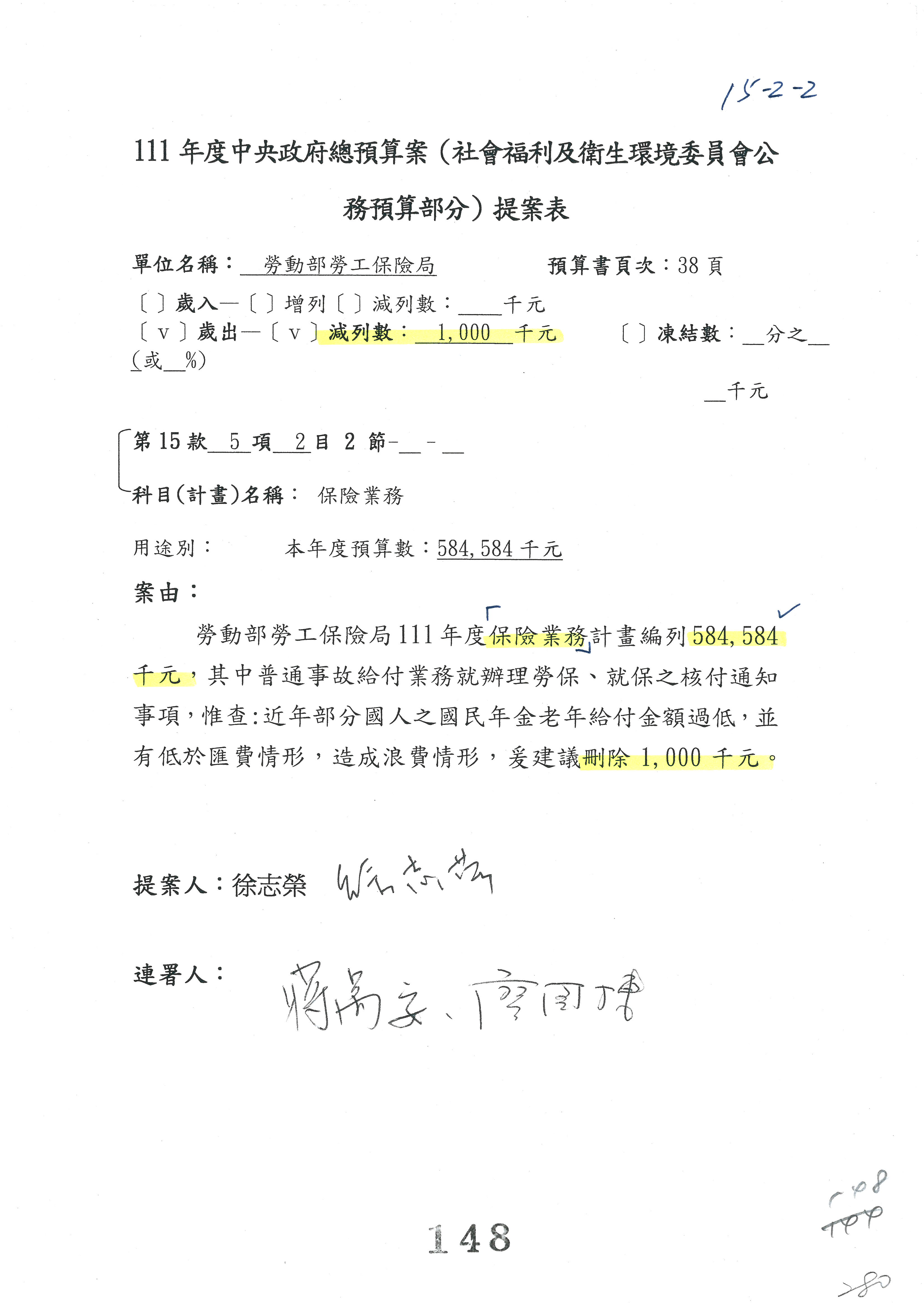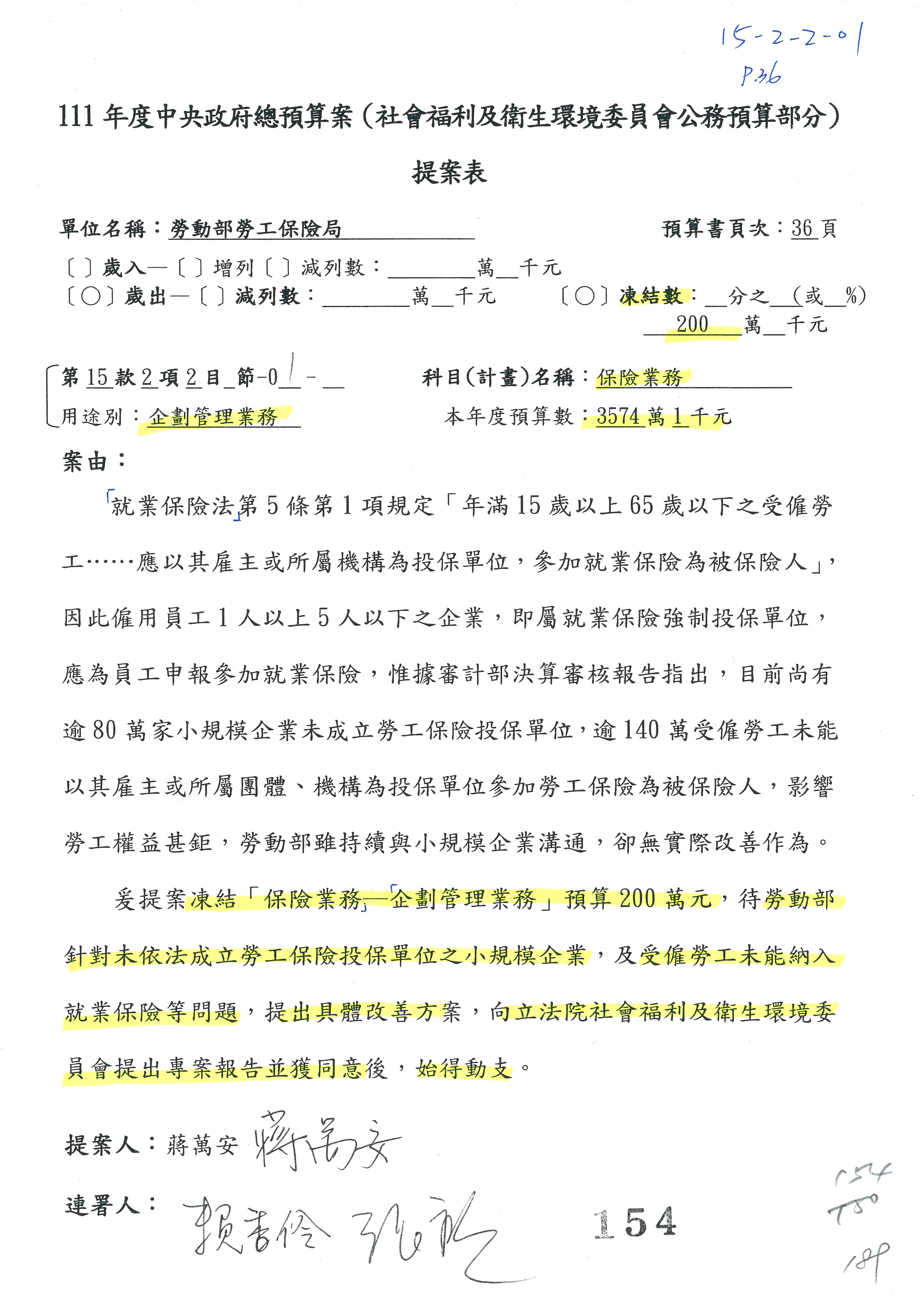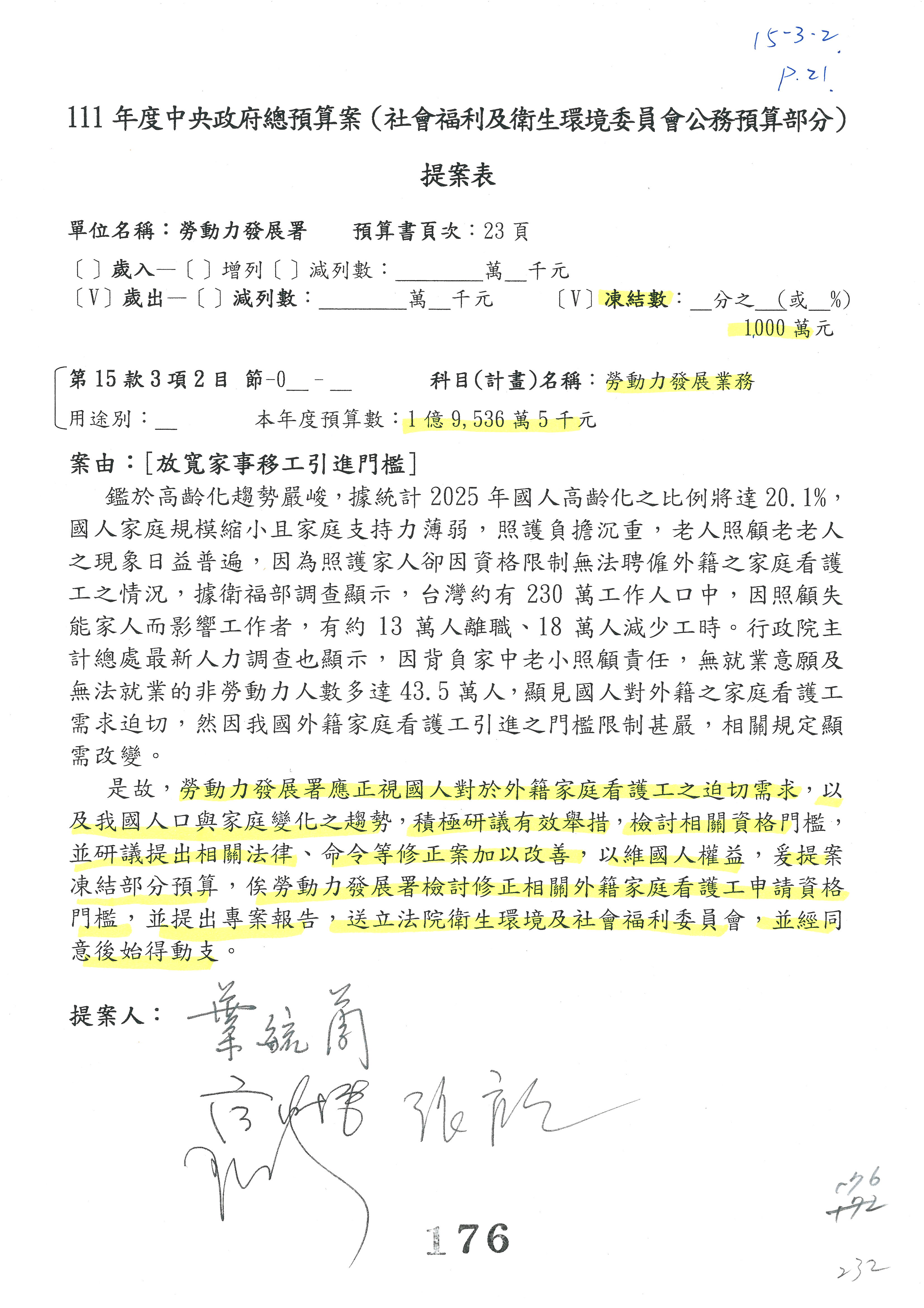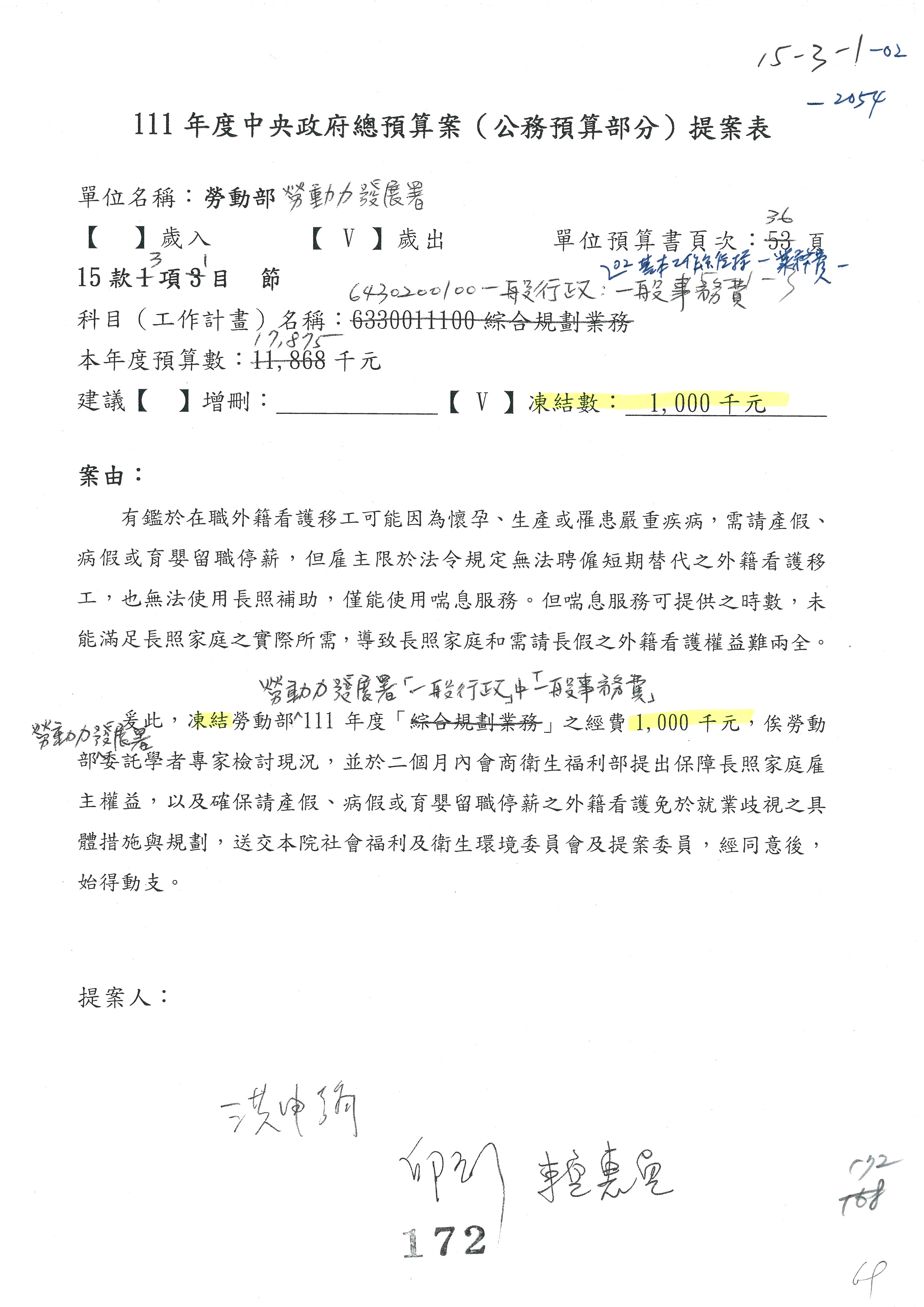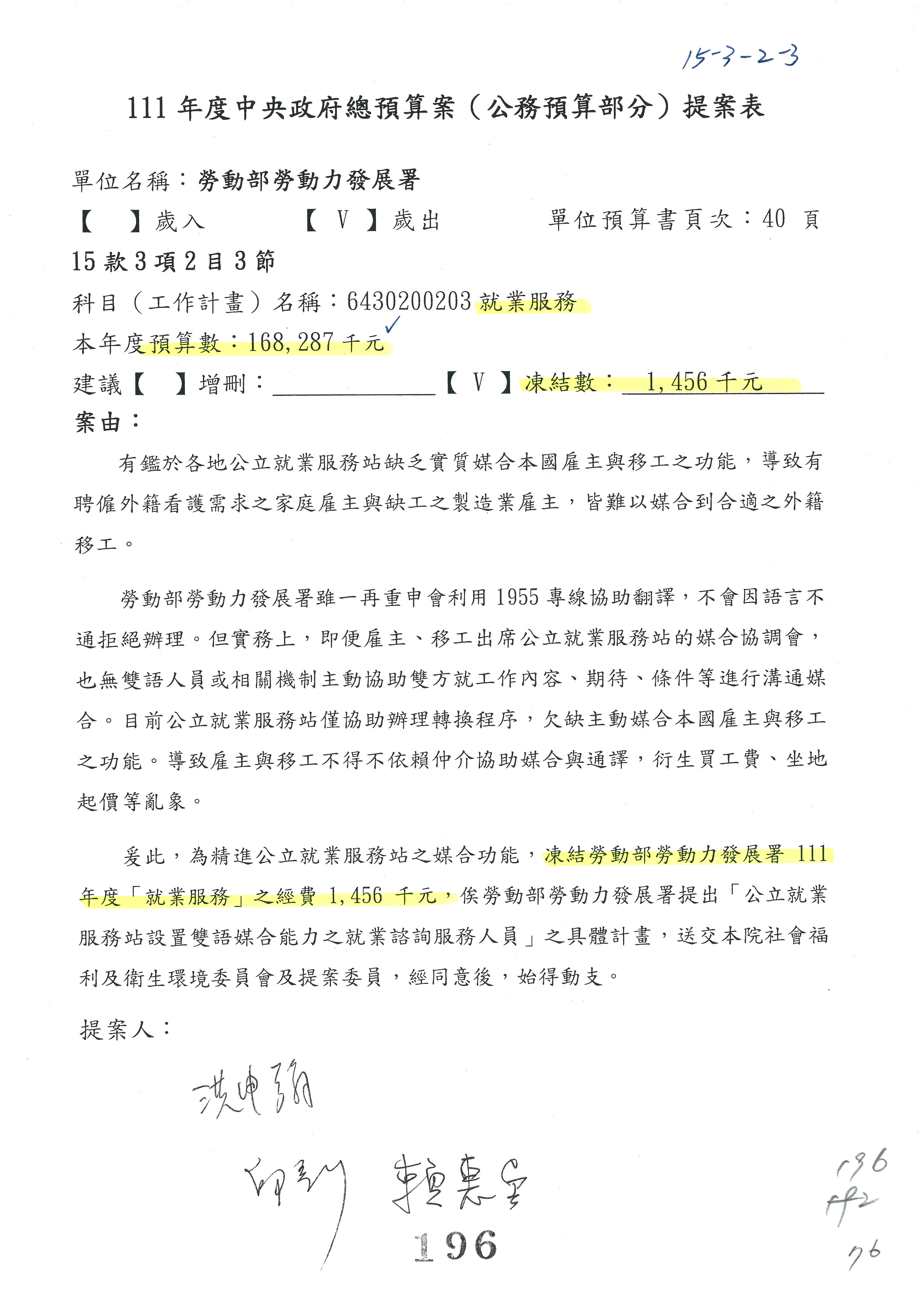 陳司長美女:我們會遵照委員指示,持續研議勞保財務改善的對策,委員同意改凍10萬元,併第3案凍結,提書面報告後始得動支,委員已簽署。