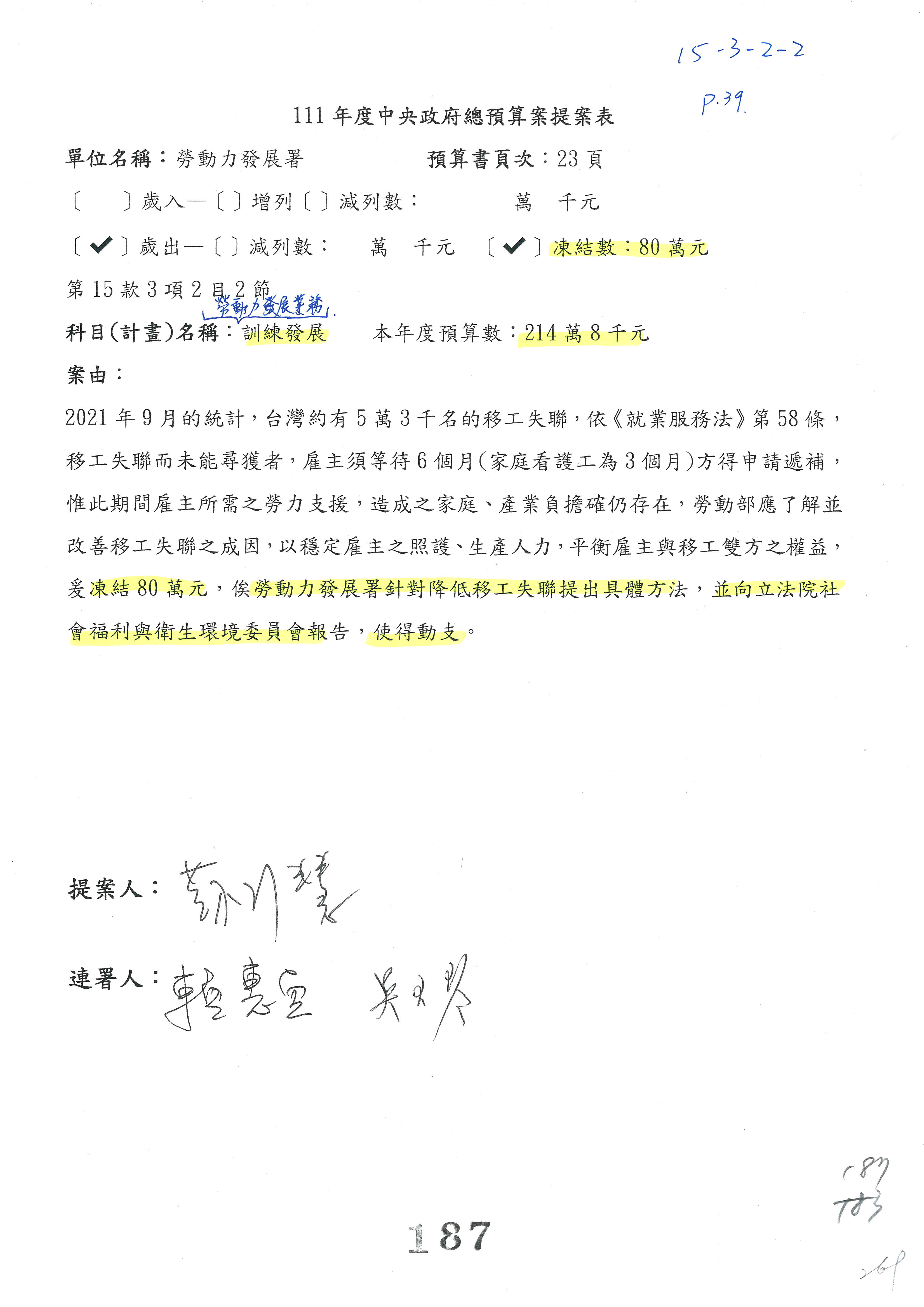 謝司長倩蒨:勞動福祉退休司報告,第87案是賴惠員委員的提案,跟委員辦公室溝通後,凍結20萬元,賴委員已經簽署。