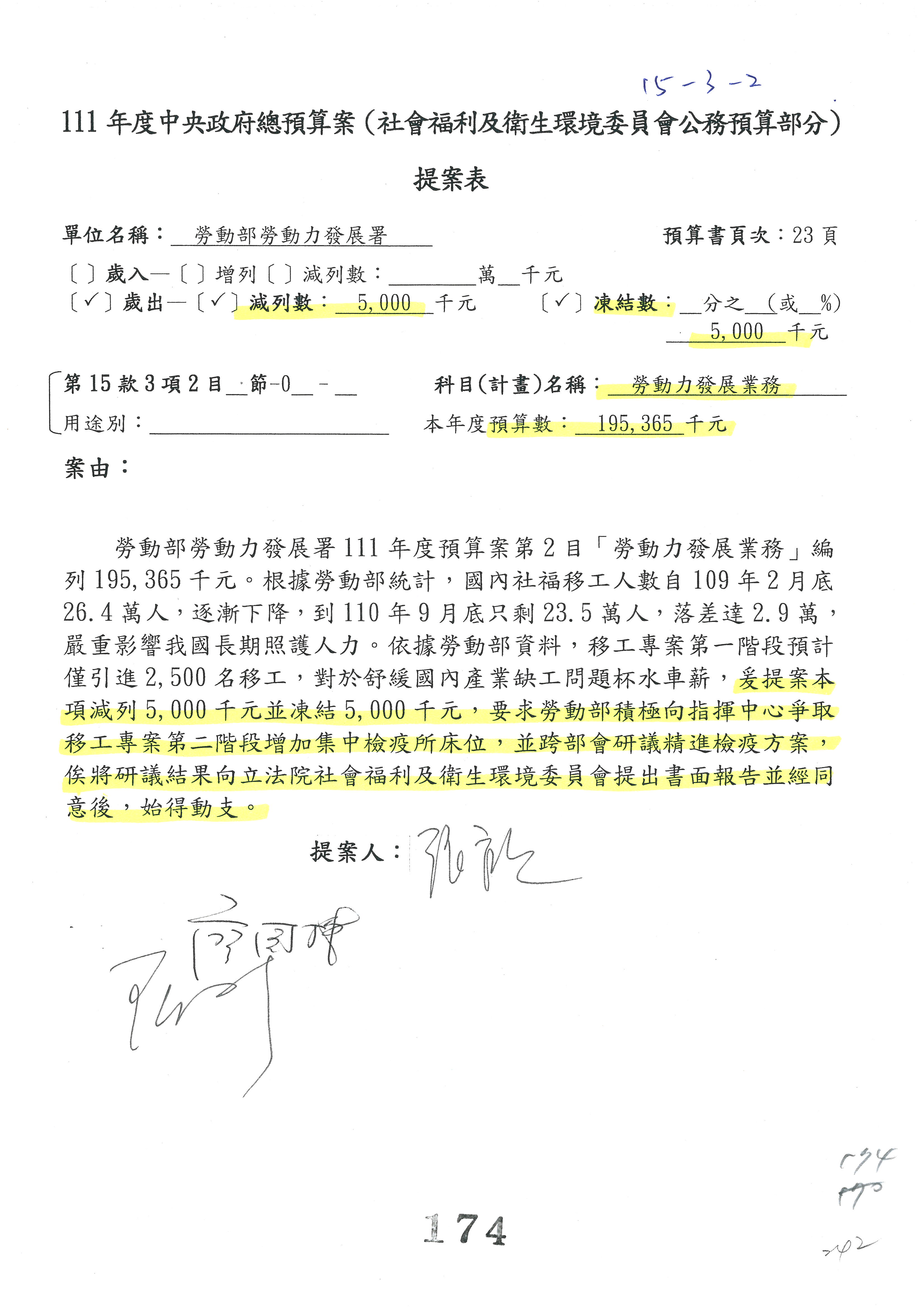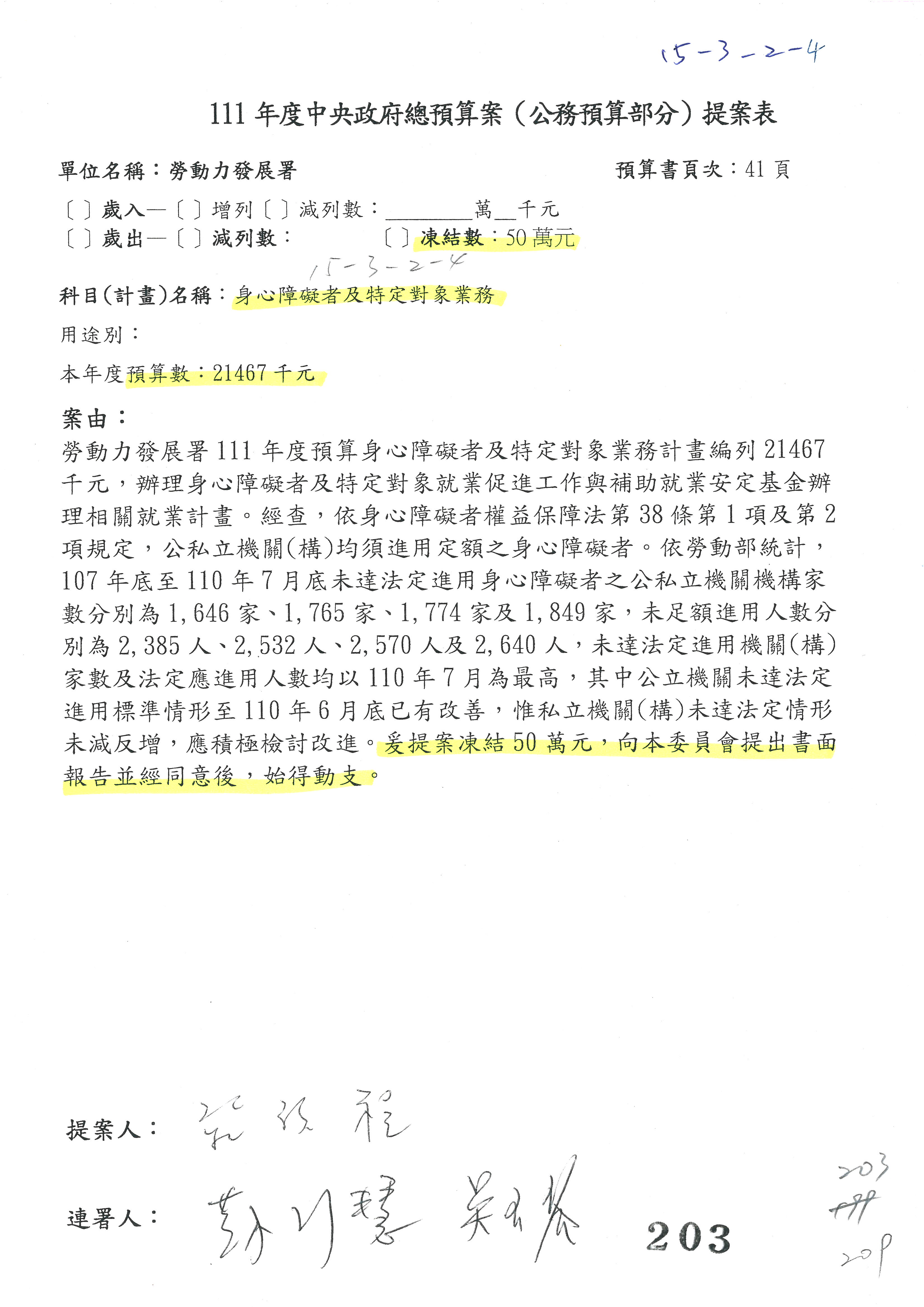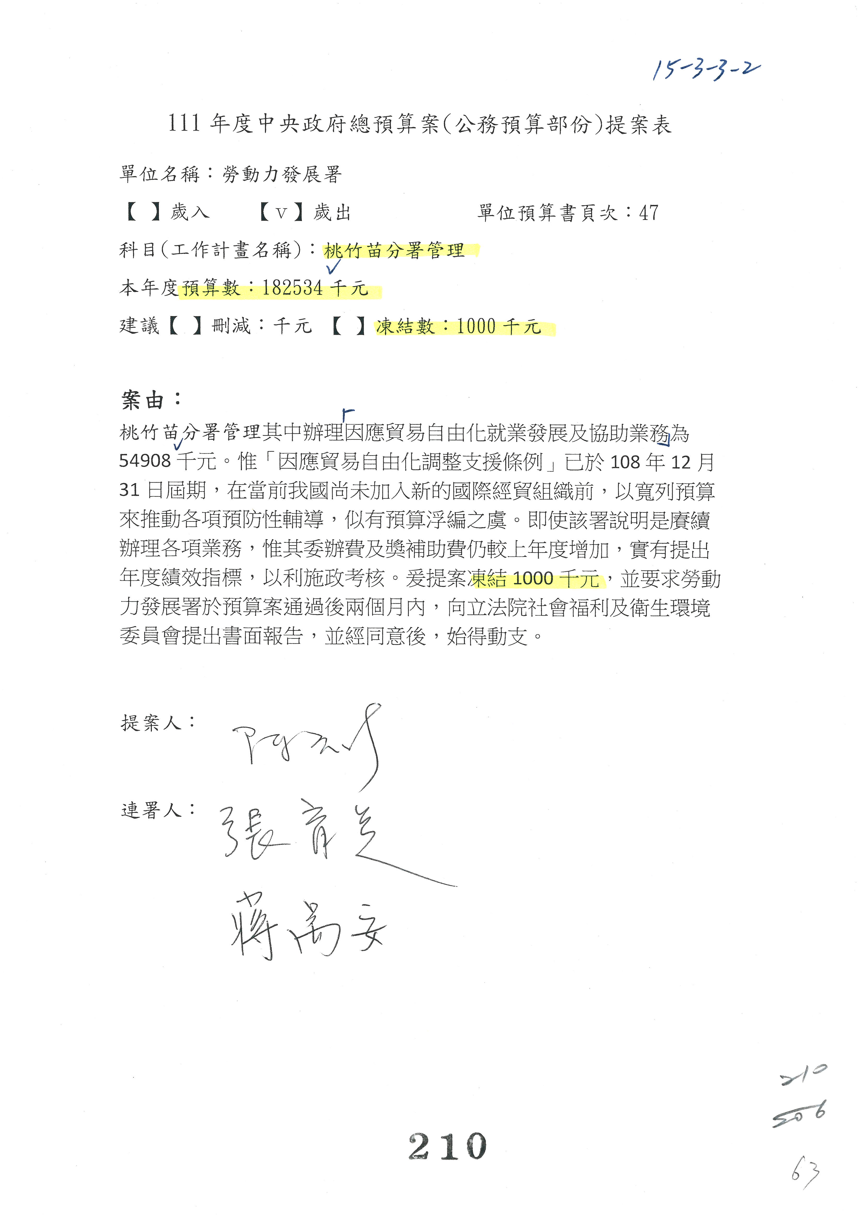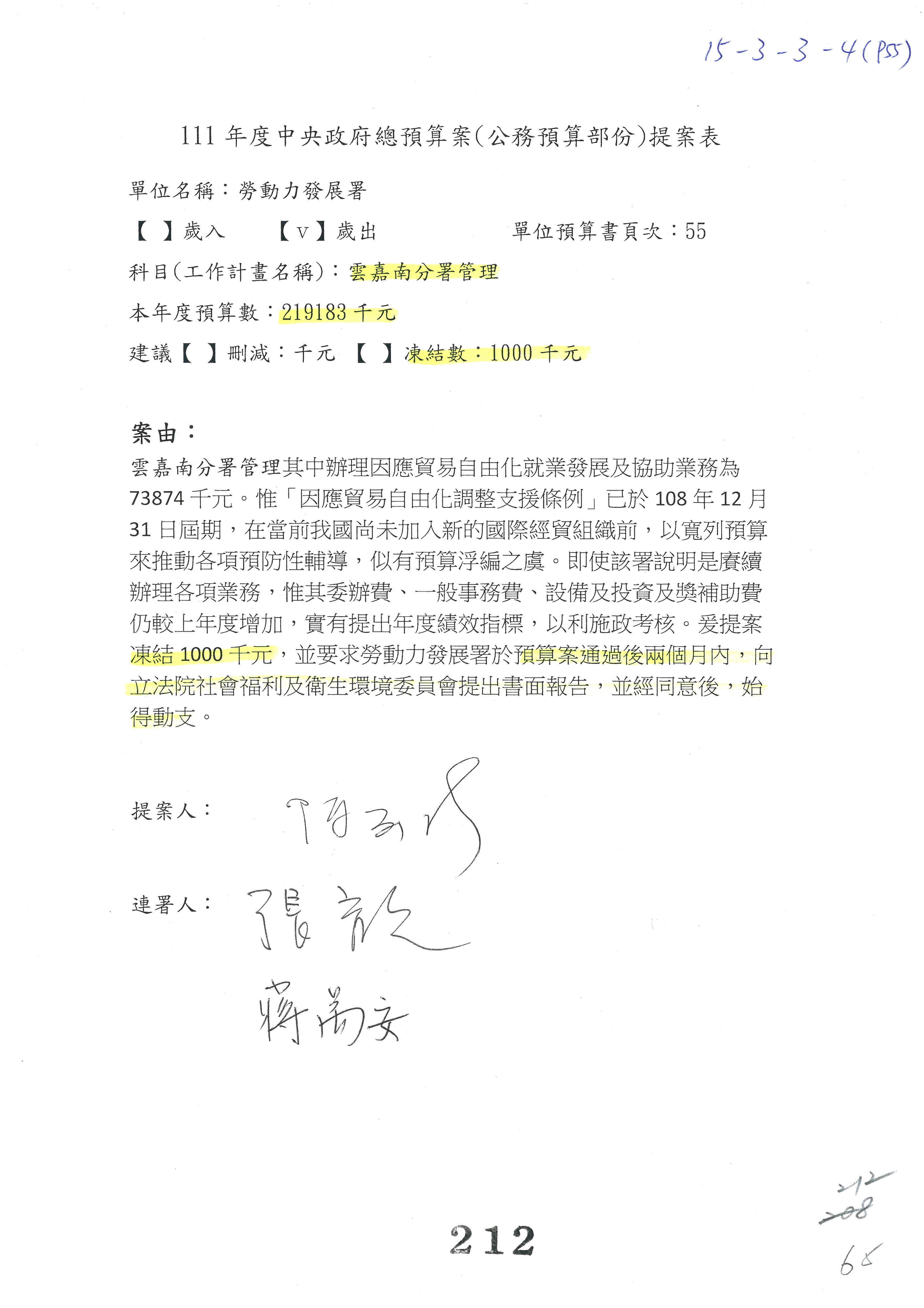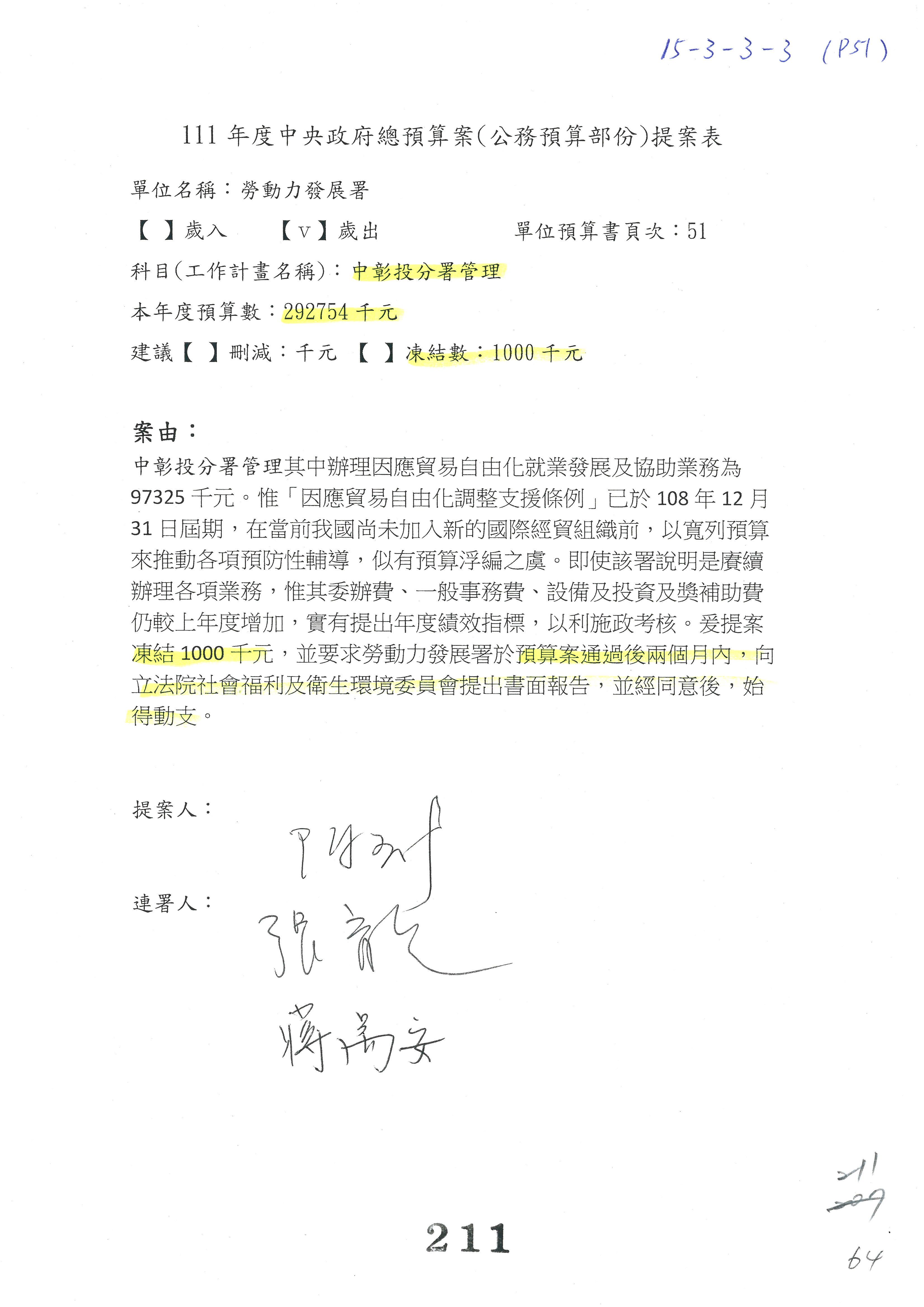 陳司長美女:第3案委員同意改凍10萬元,並同意跟其他委員提案併案,已簽署。