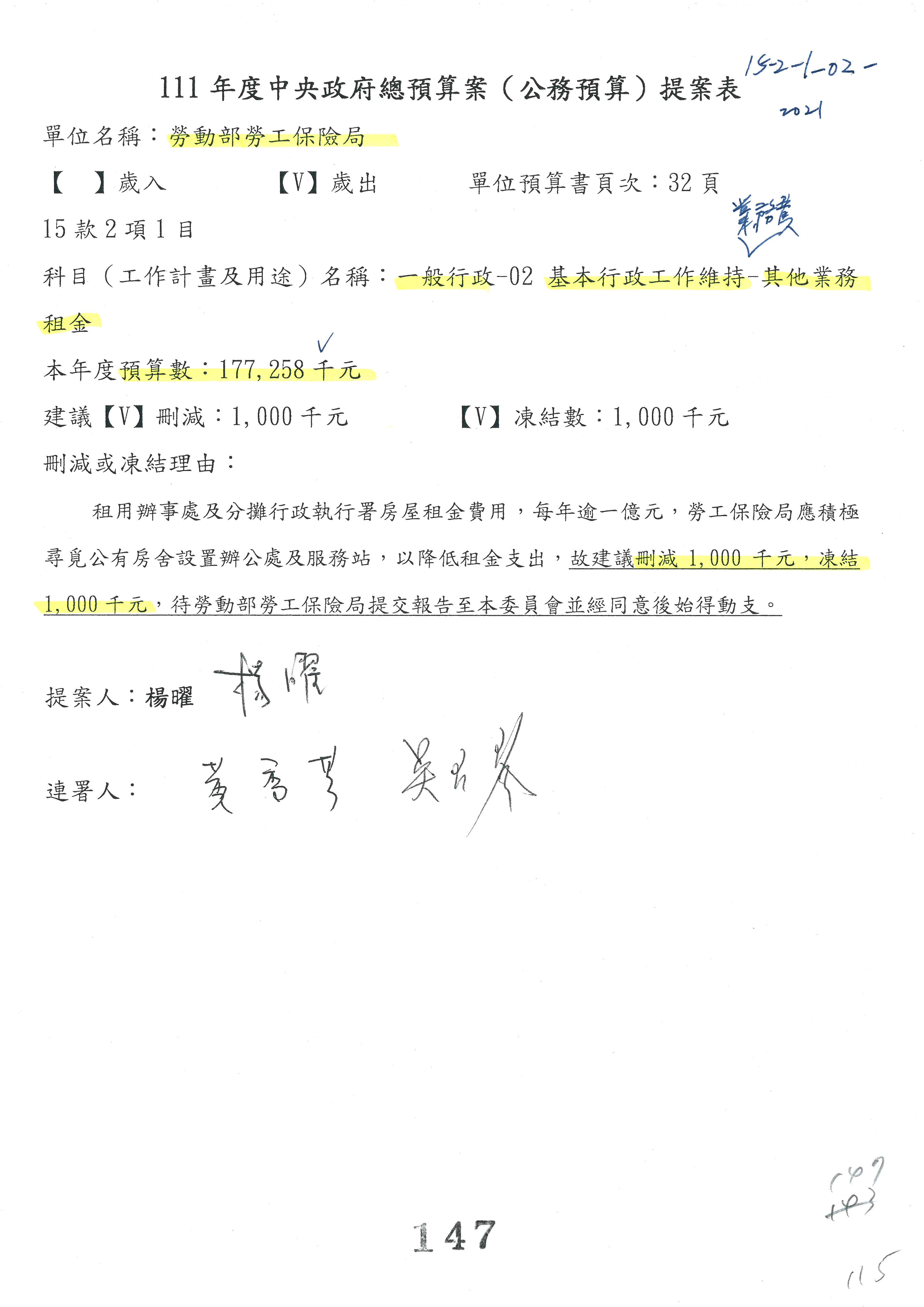 王司長厚誠:第95案已經跟楊曜委員辦公室溝通,同意改為減列預算30萬元,然後不凍結,已經簽署了,謝謝。