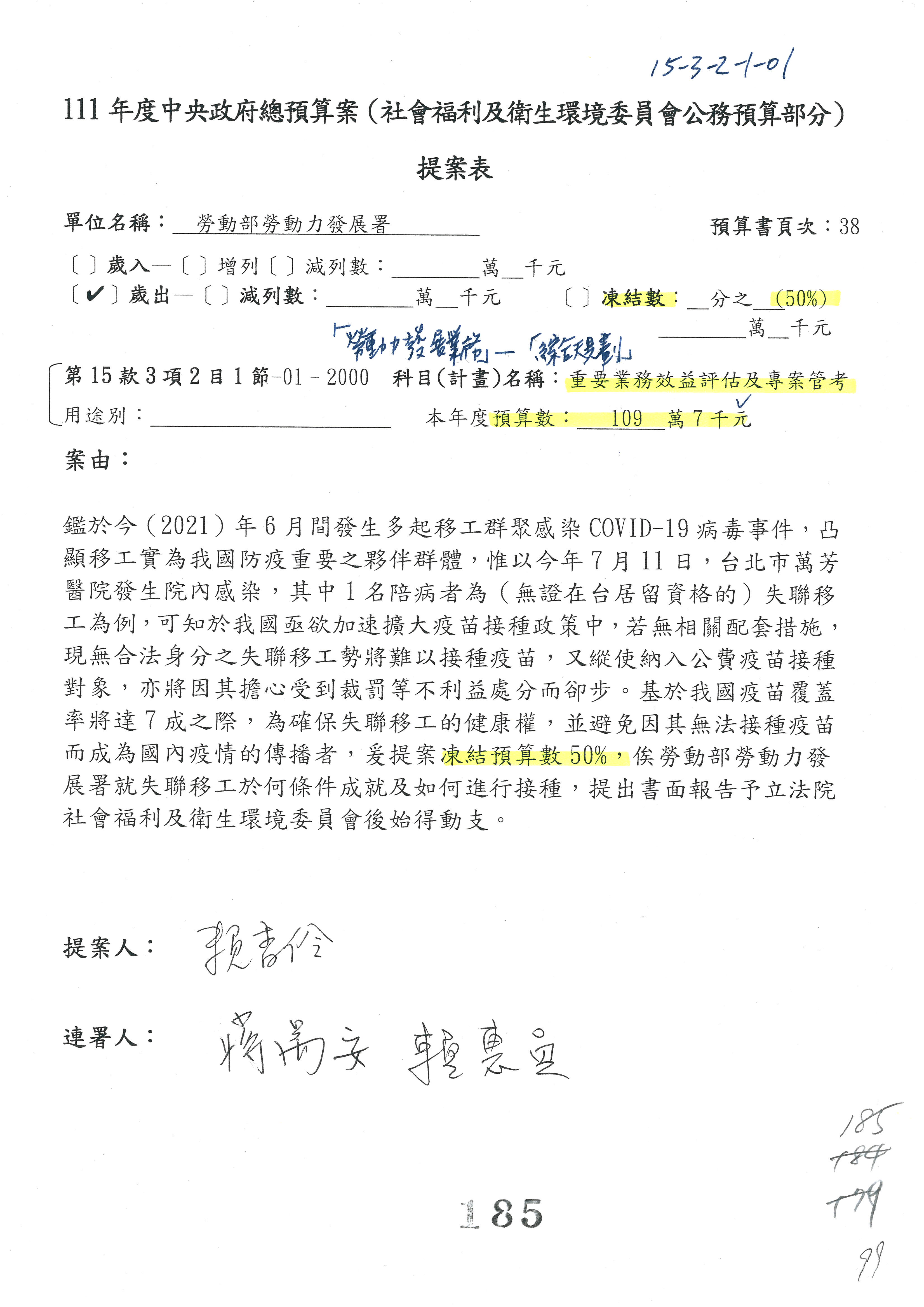 蔡署長孟良:第85案跟陳委員辦公室溝通後,同意改凍結100萬元,已經簽署。