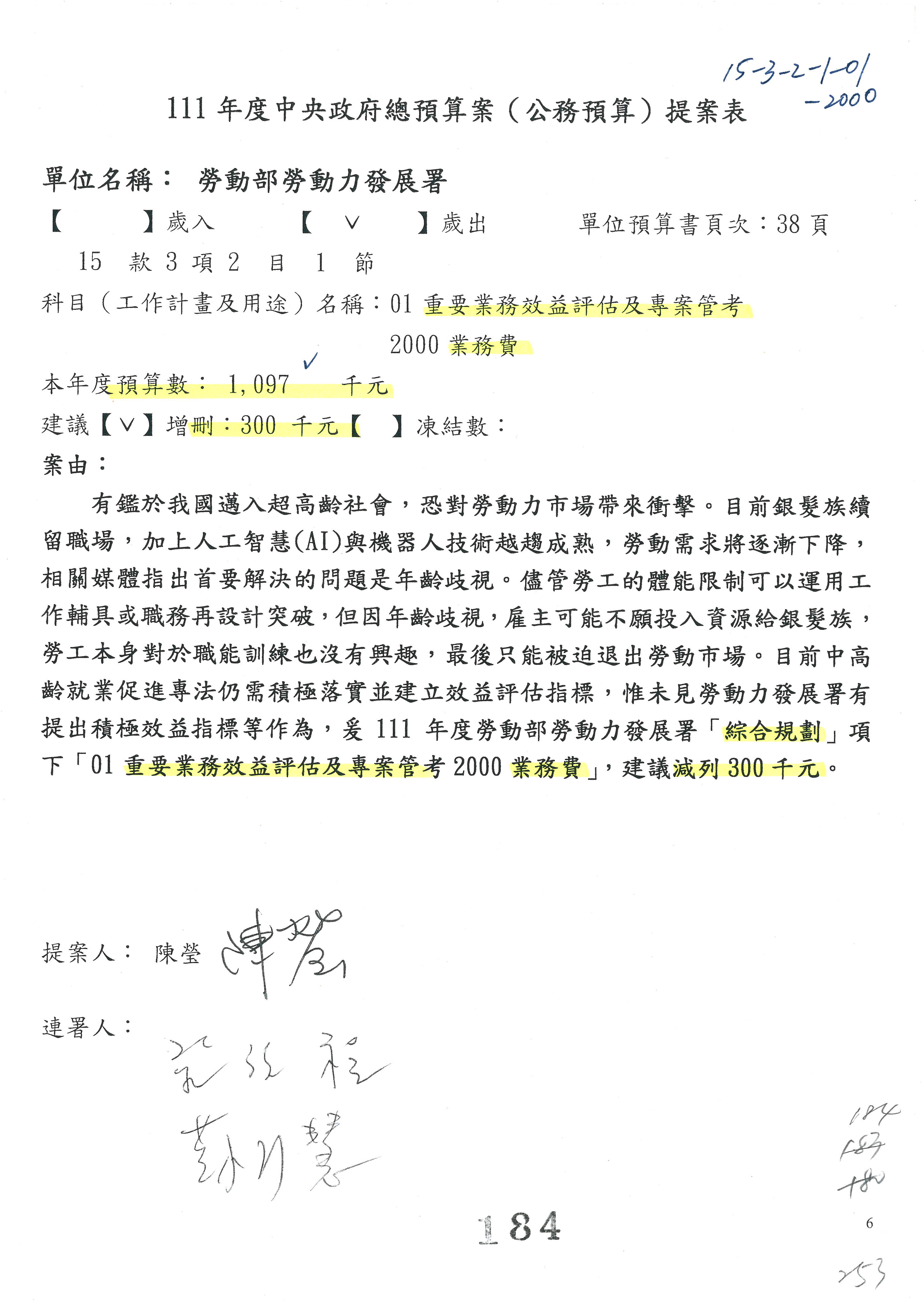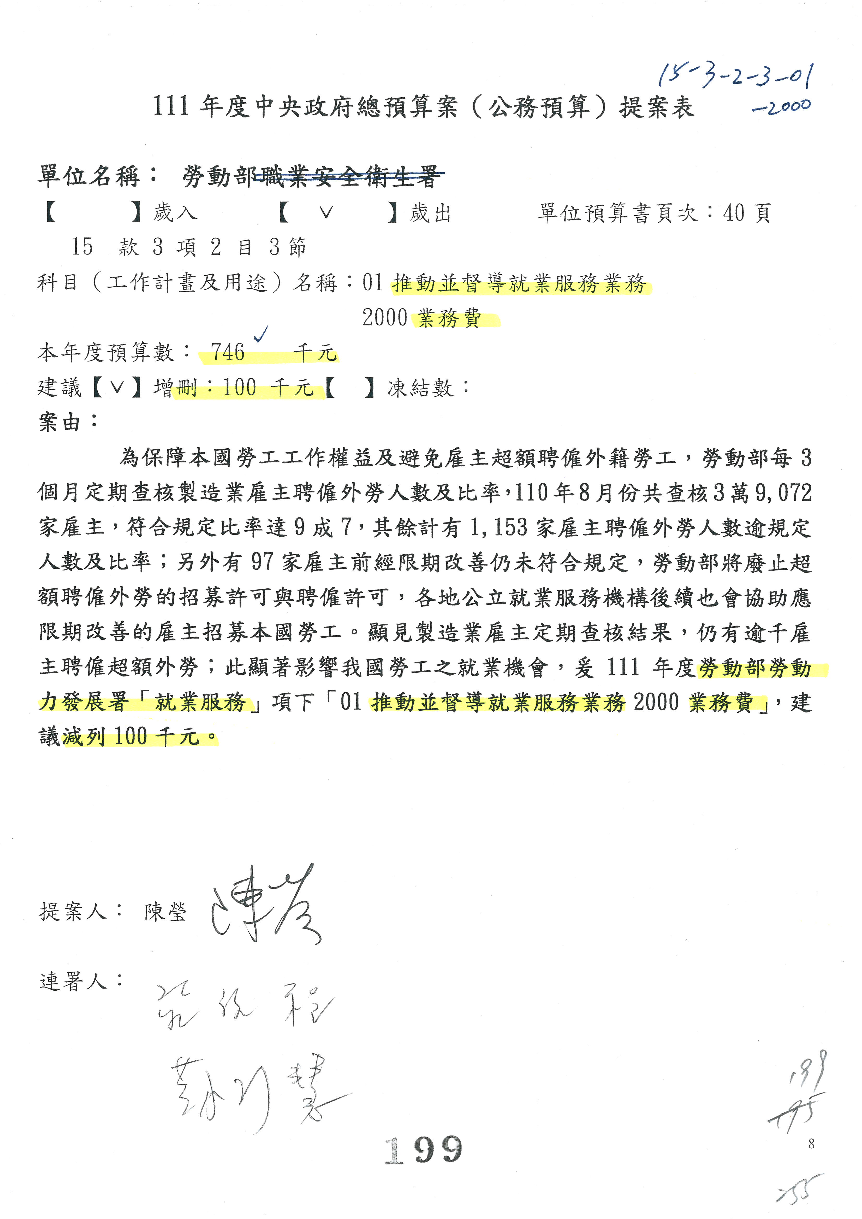鄒署長子廉:第97案,楊委員同意併第96案,同意併刪100萬元,委員已經簽署。