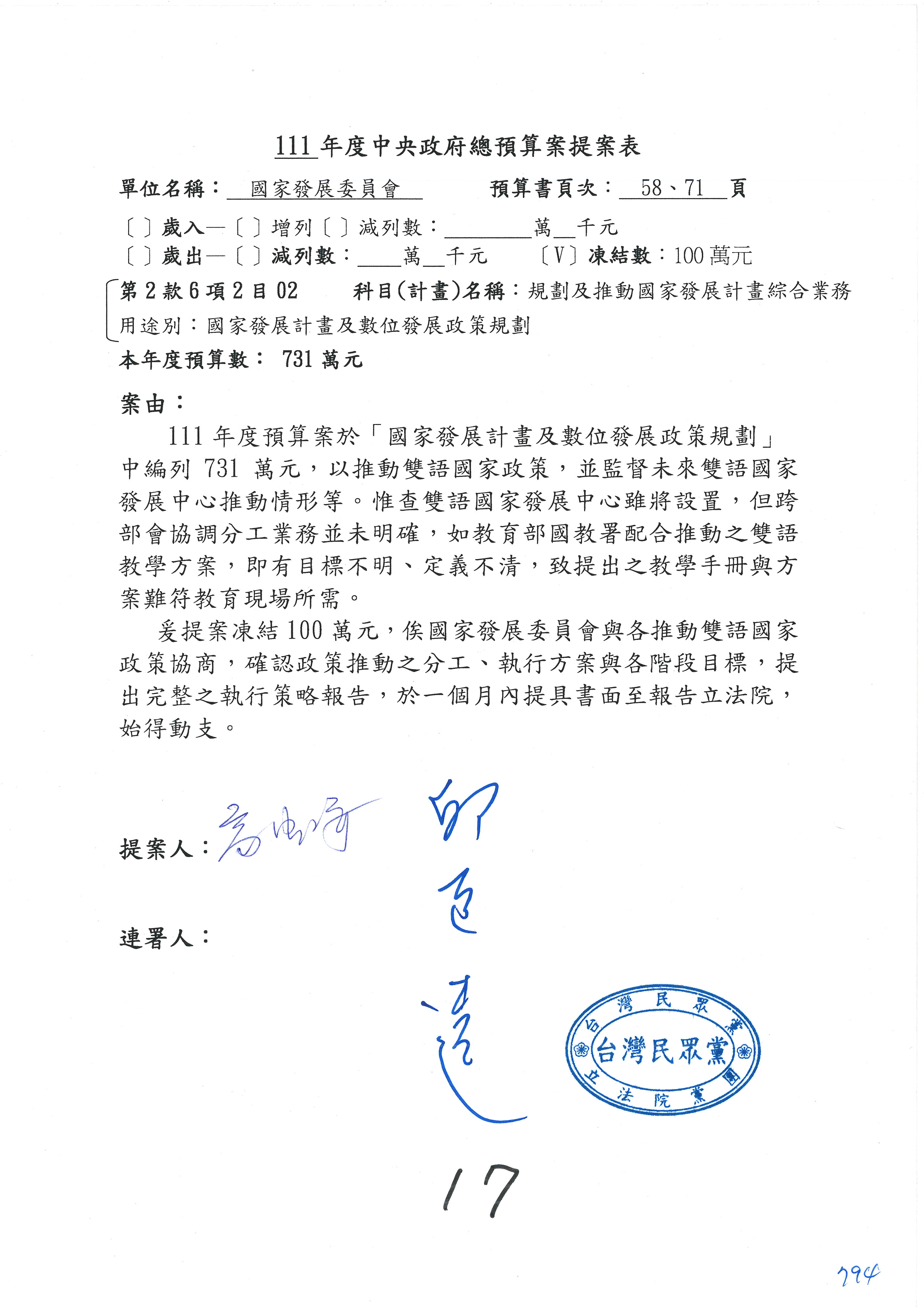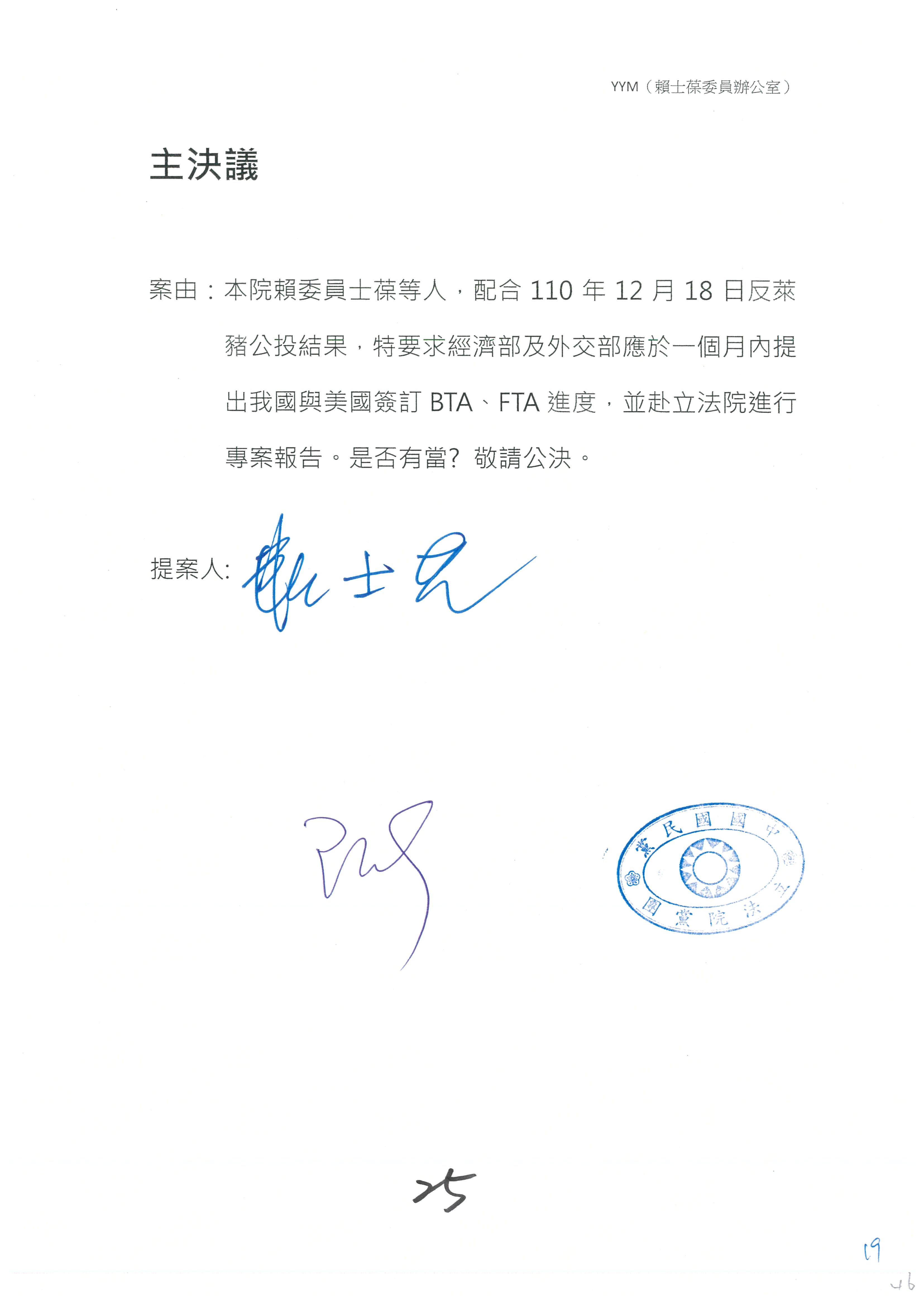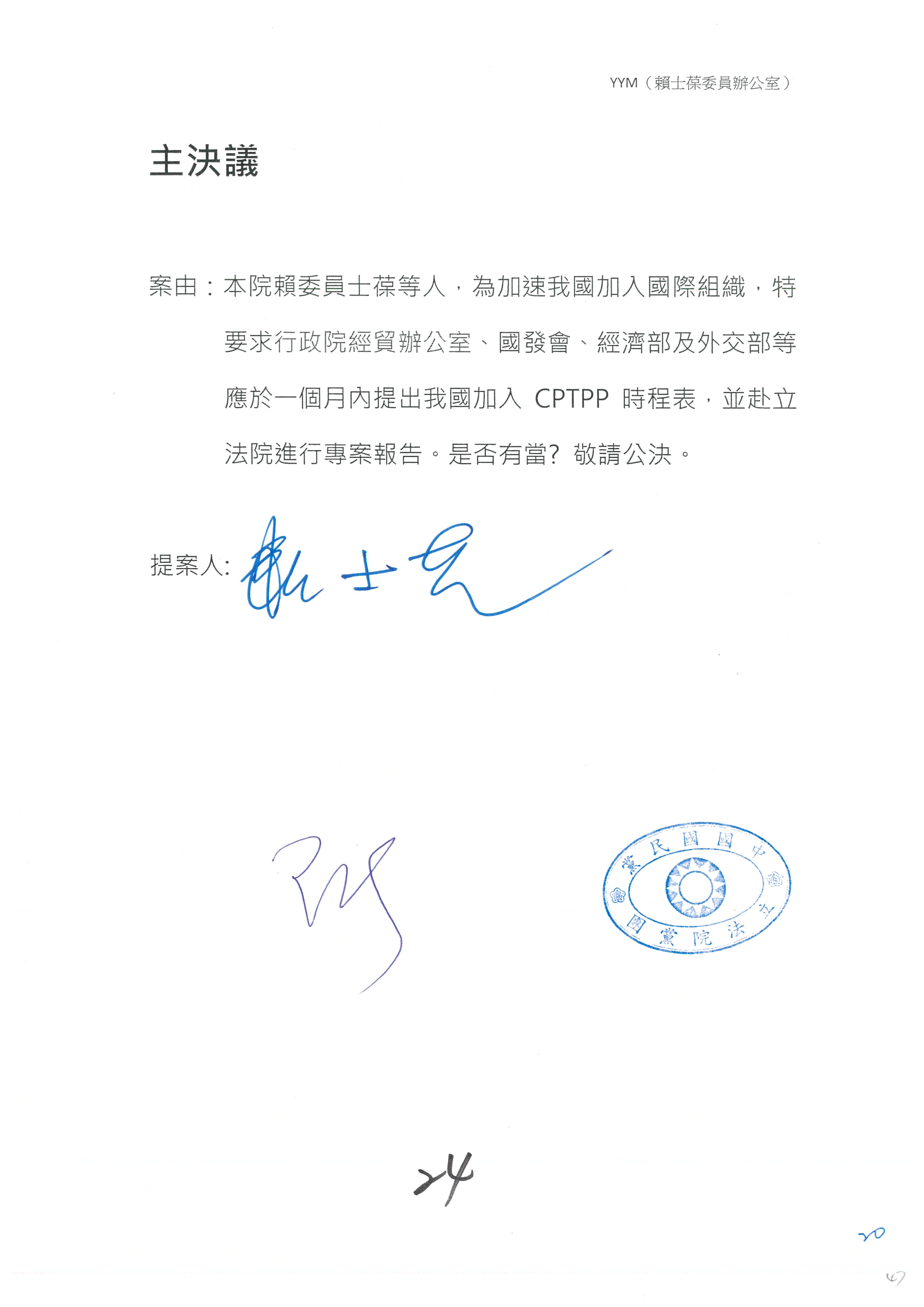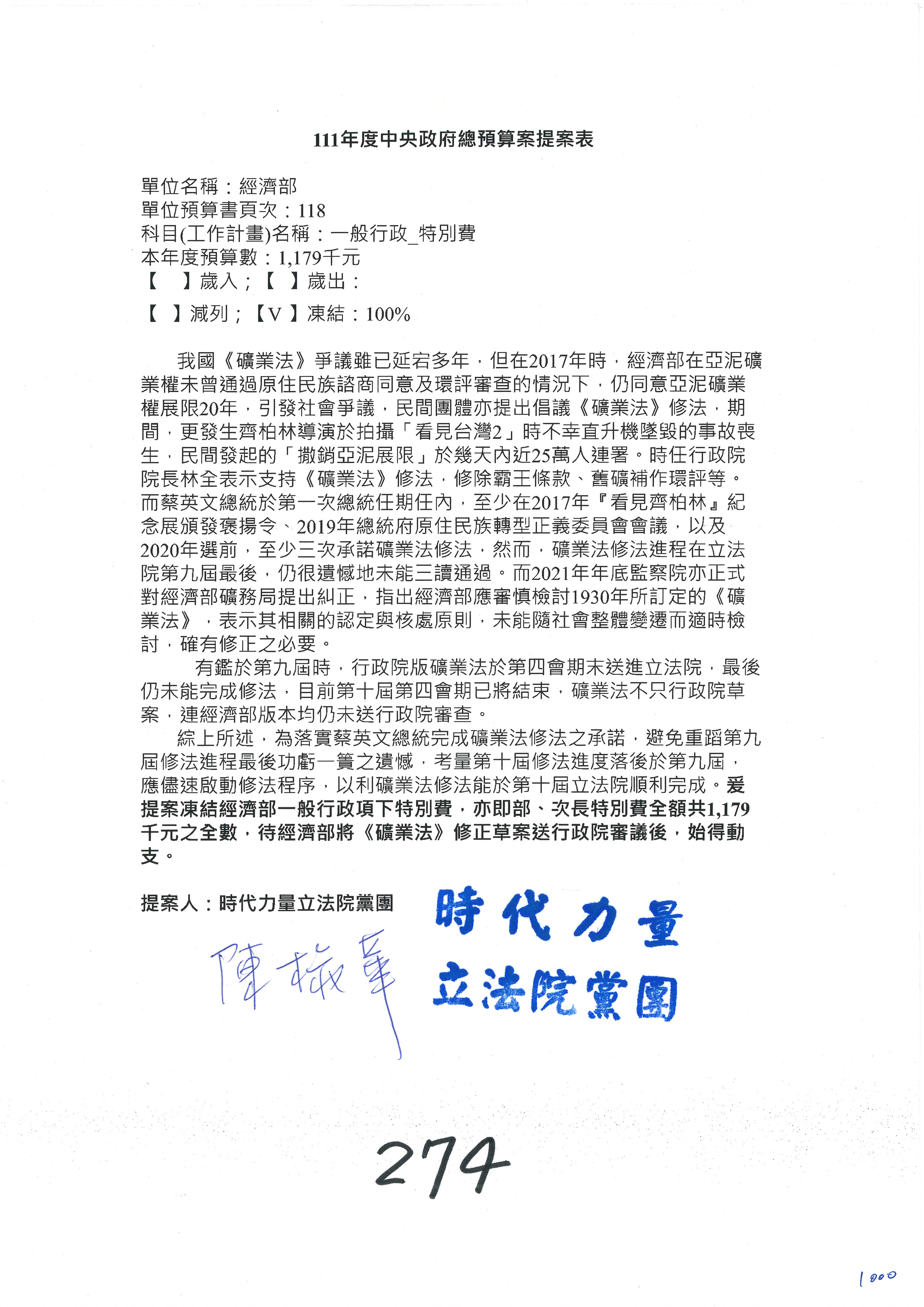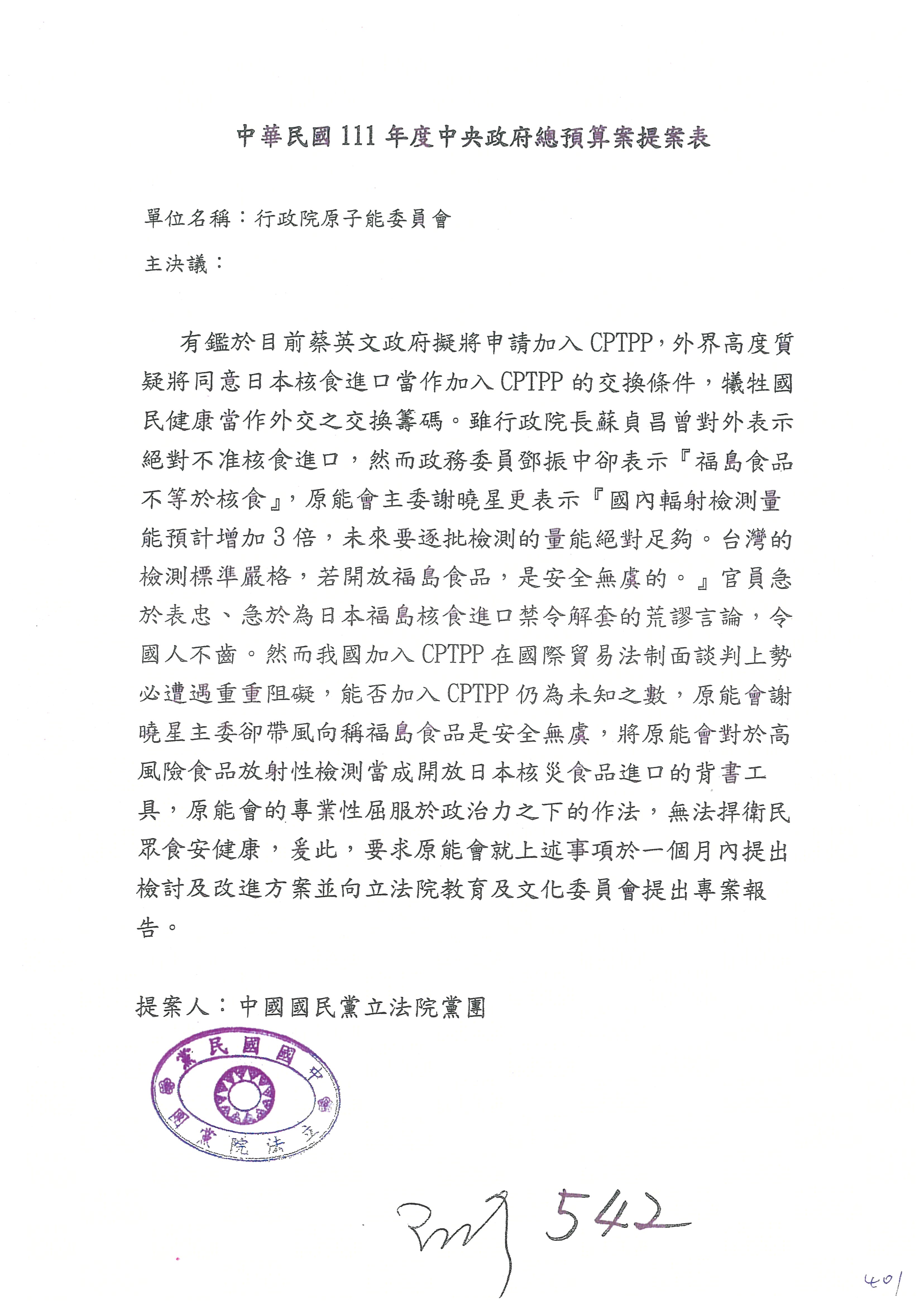 此外,對於要開放日本福島的核食,本黨團強烈地要求不可以拿人民的健康作為任何交換的條件。人民的健康是沒有可以討論的,人民的健康也不可以拿來作為政府之間的交換條件,因此本黨團會嚴守審查預算的紀律。
