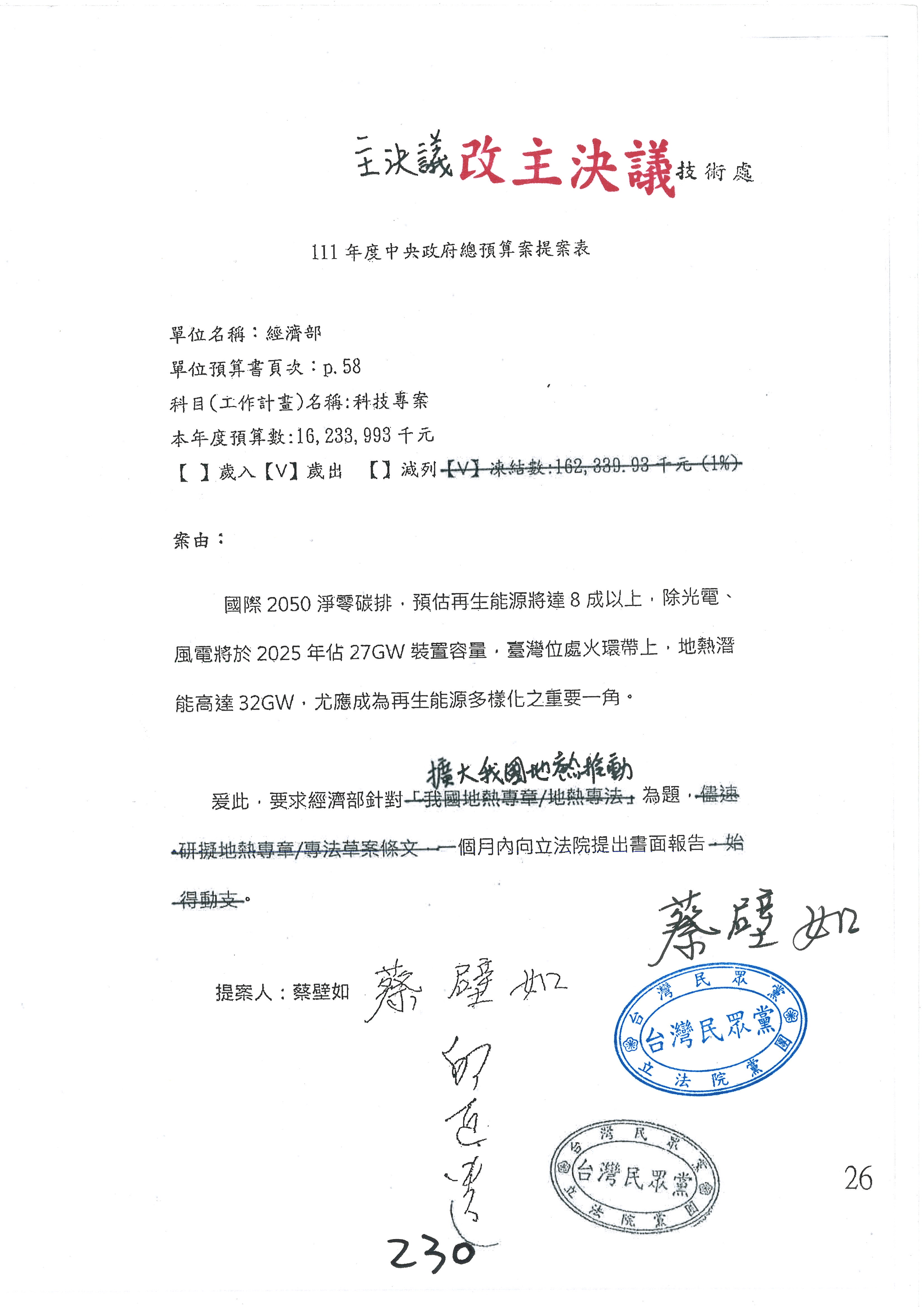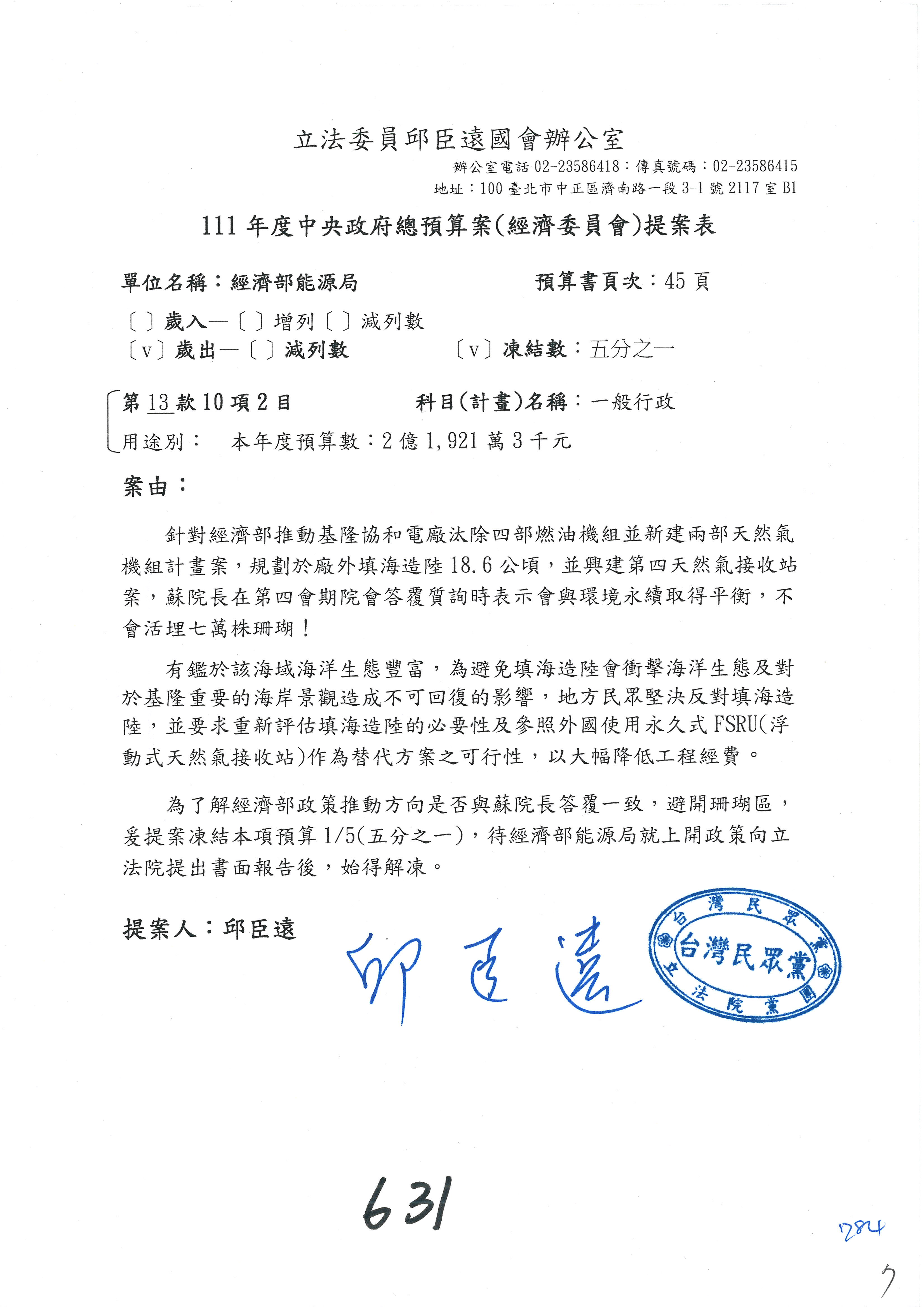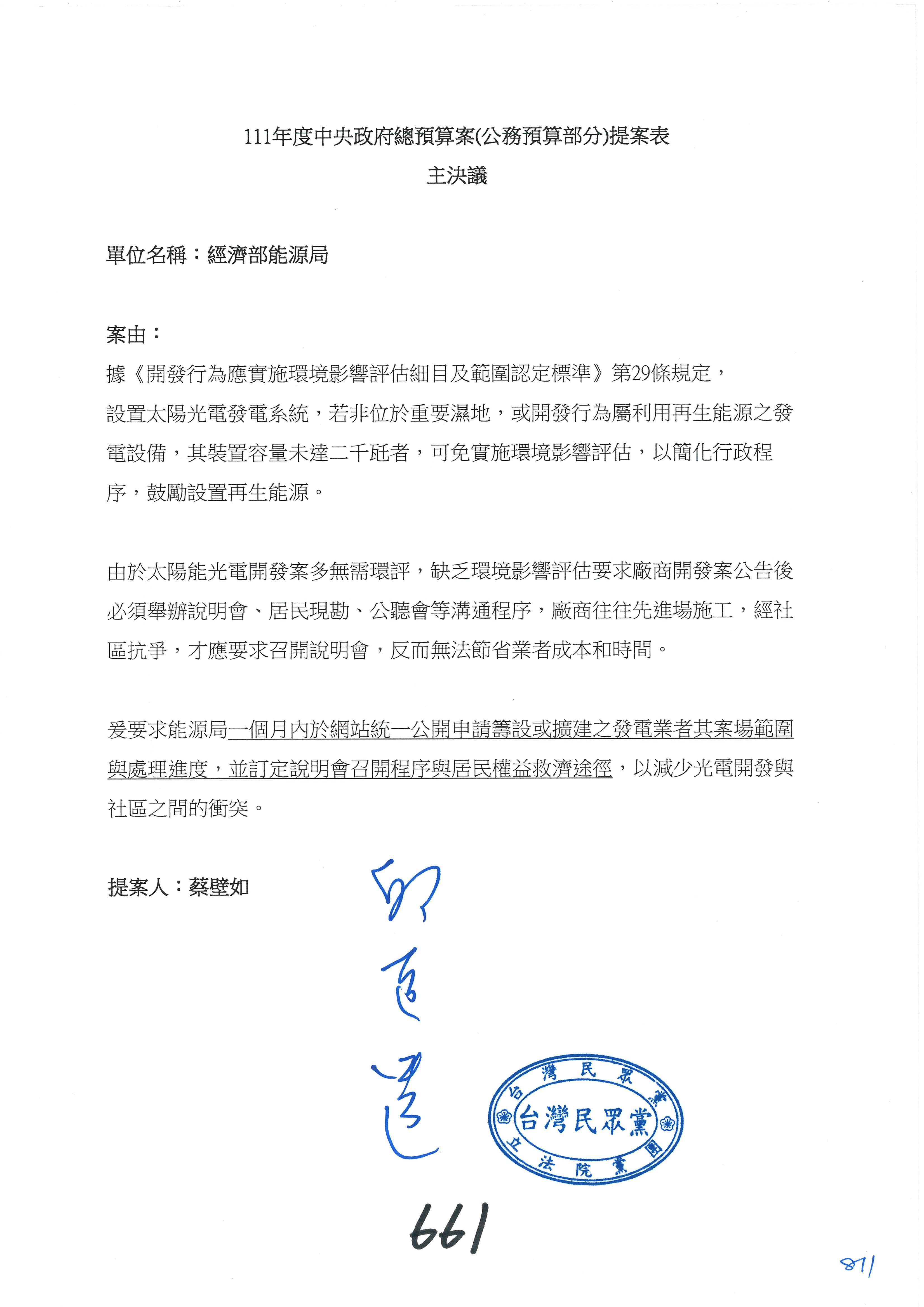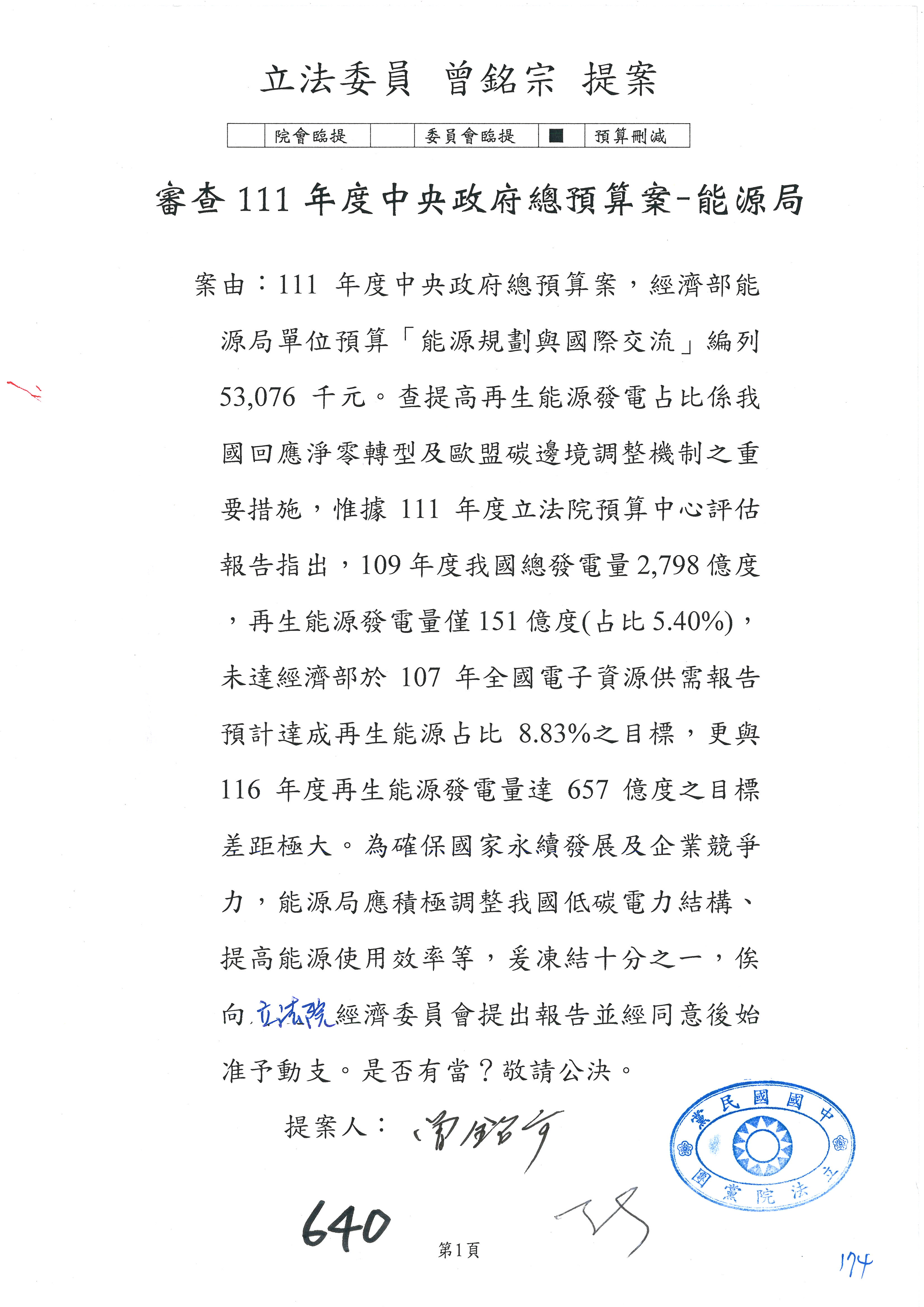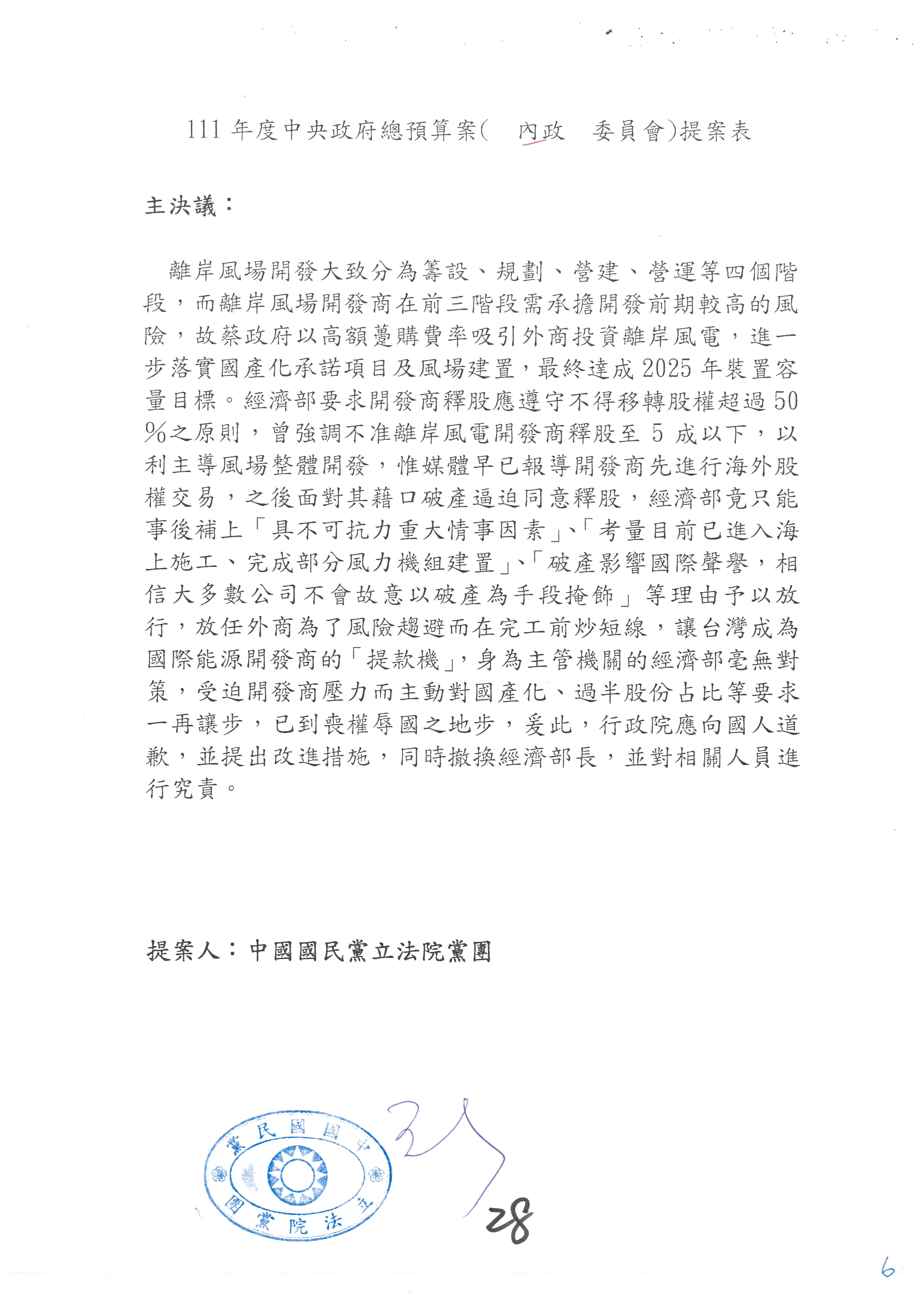 其次,對於經濟部、台電離岸風電所簽的第一個合約居然用每度5.8元作為躉購費率,我們長期對這個標案有意見,也就是說,20年下來會讓人民多付9,100億元。我們會持續地監督,希望台電不要把人民當成凱子。