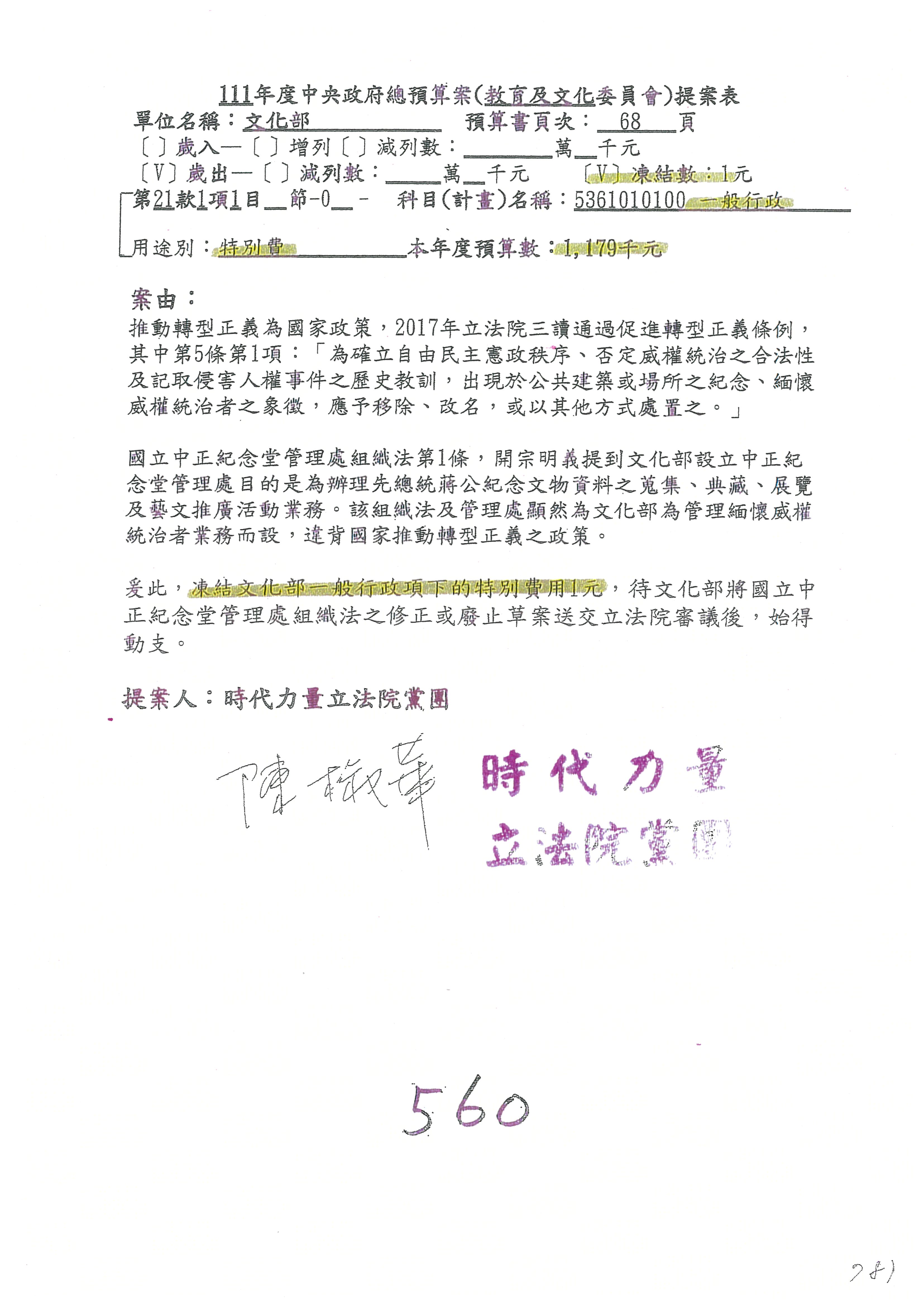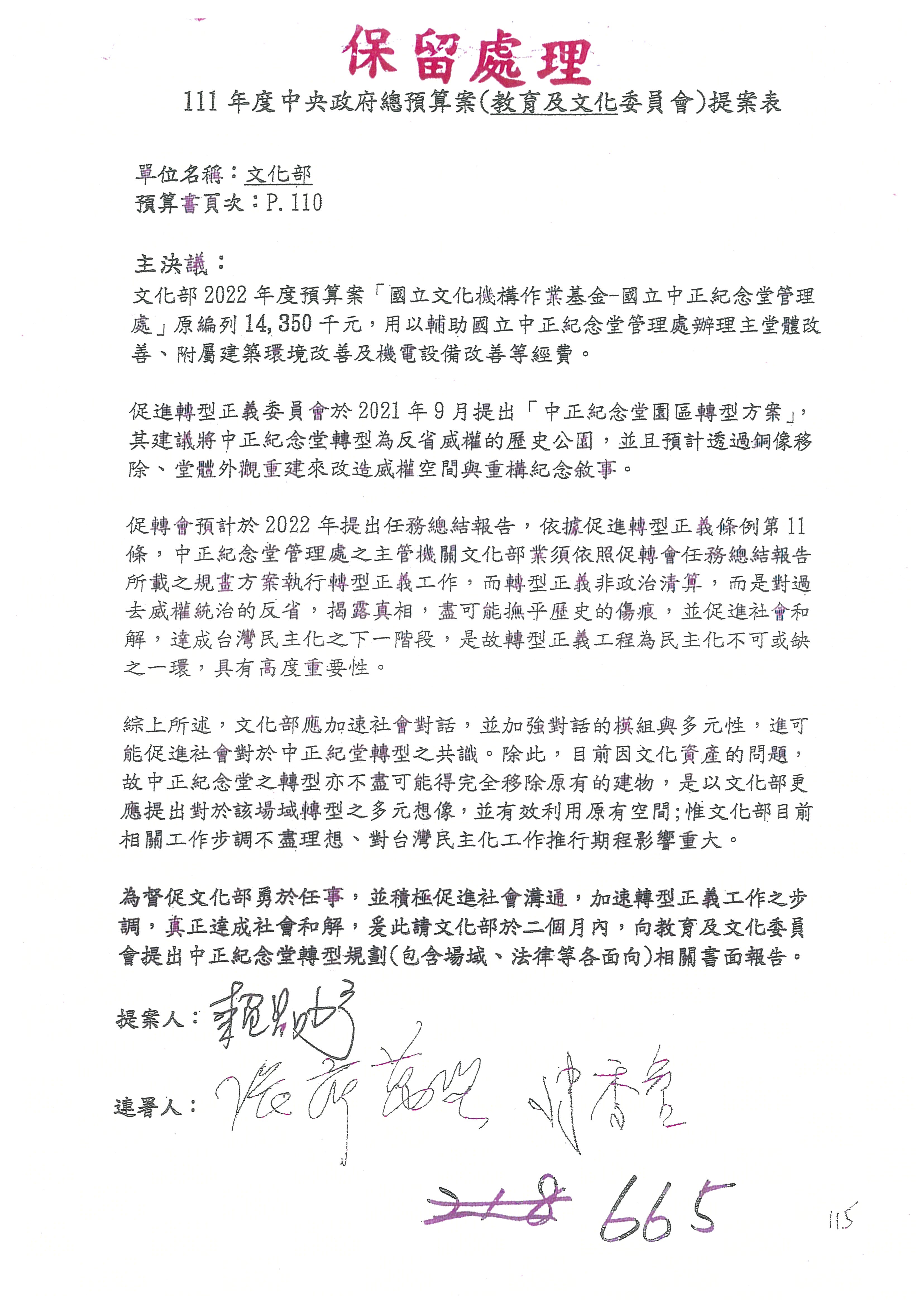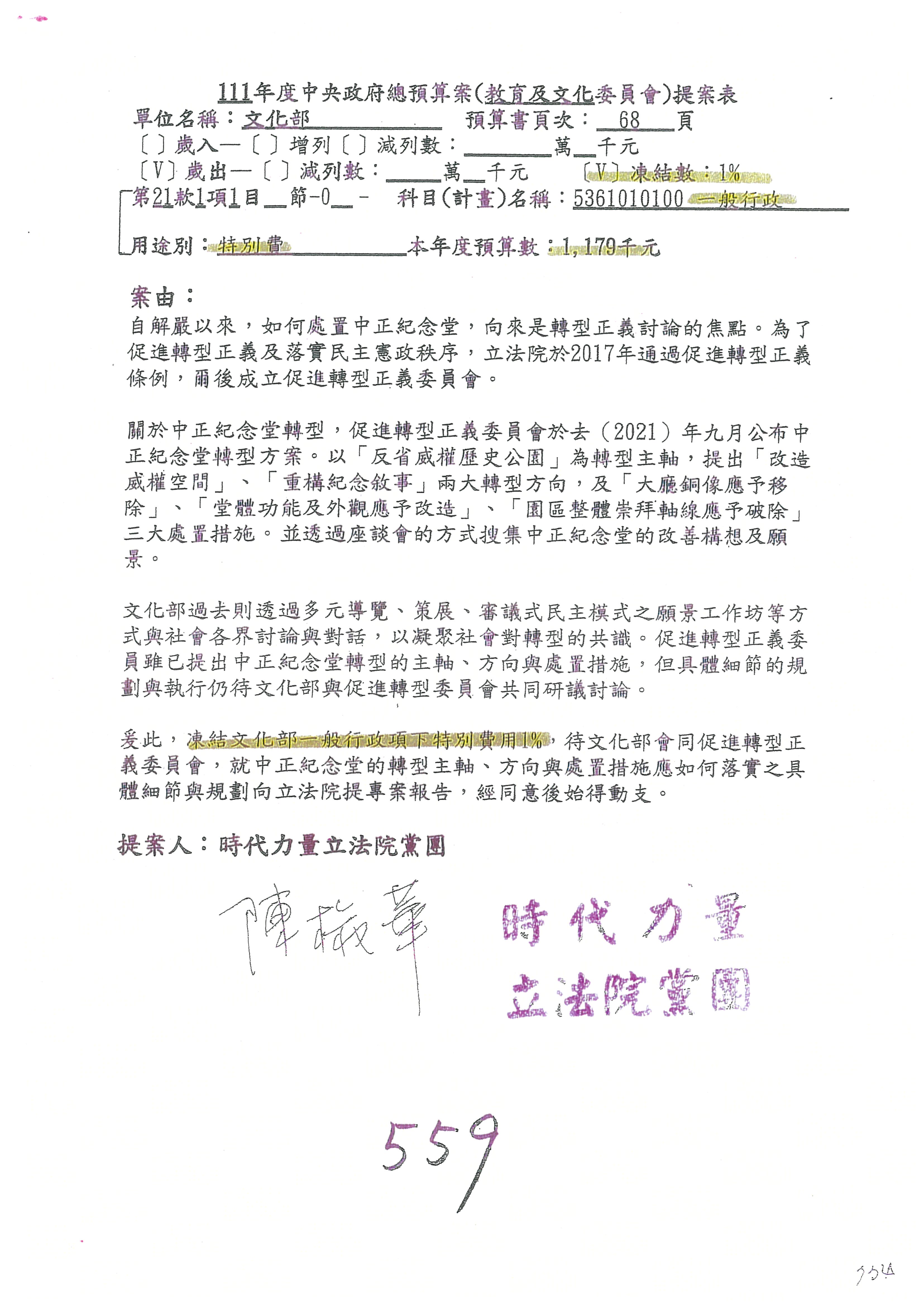 陳委員椒華:(17時14分)主席、各位同仁。將做為威權象徵的中正紀念堂轉型是我國民主化的一大進程,也是促進轉型正義工程的重中之重。促轉會在去年提出中正紀念堂轉型的主軸方向和處置措施,文化部就應該肩負起中正紀念堂轉型的重責大任,提出具體的轉型規劃。針對本次的預算提案,時代力量提出預算凍結,請文化部具體提出國立中正紀念堂管理處組織法的修正或廢止草案,送交本院審議。