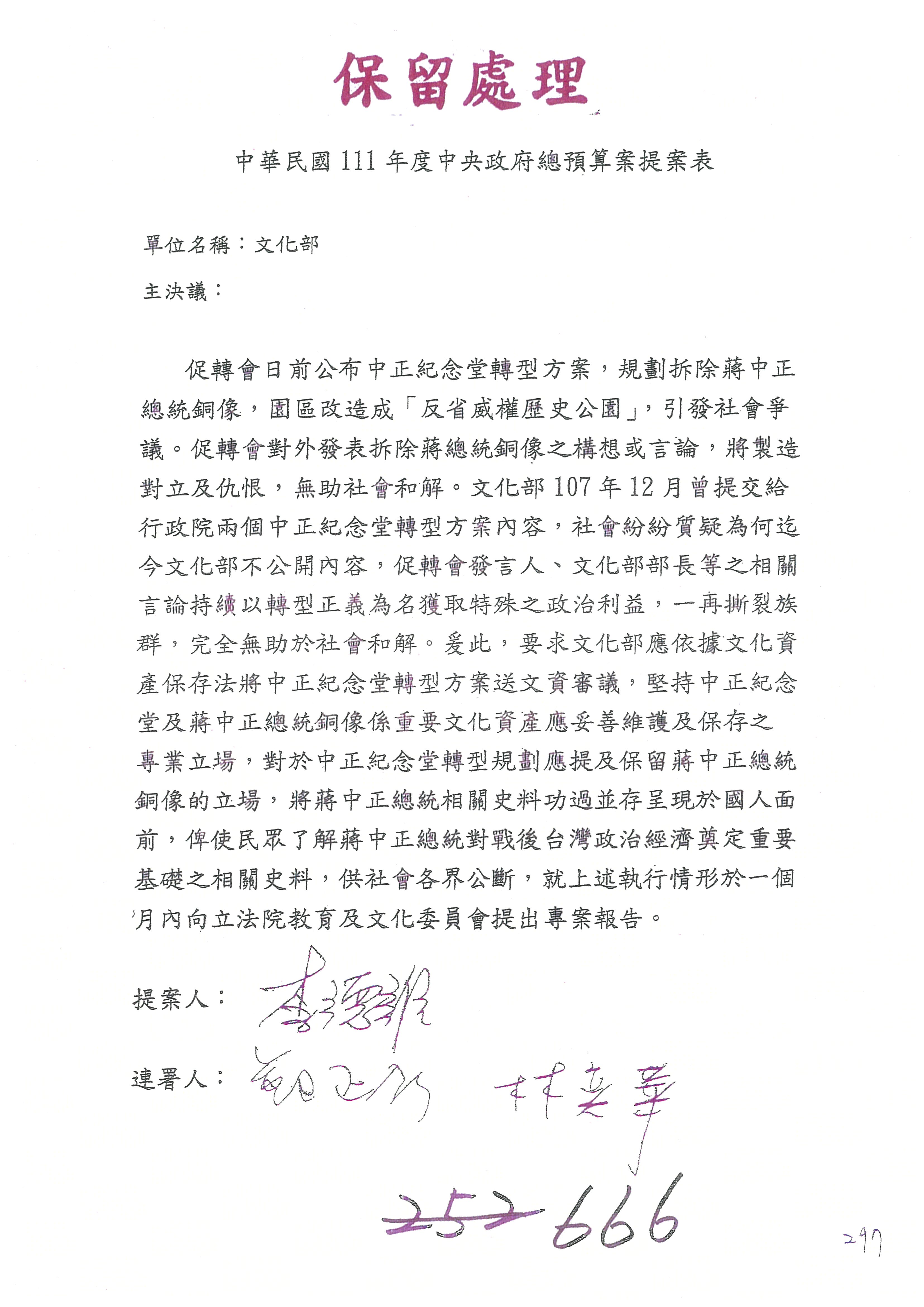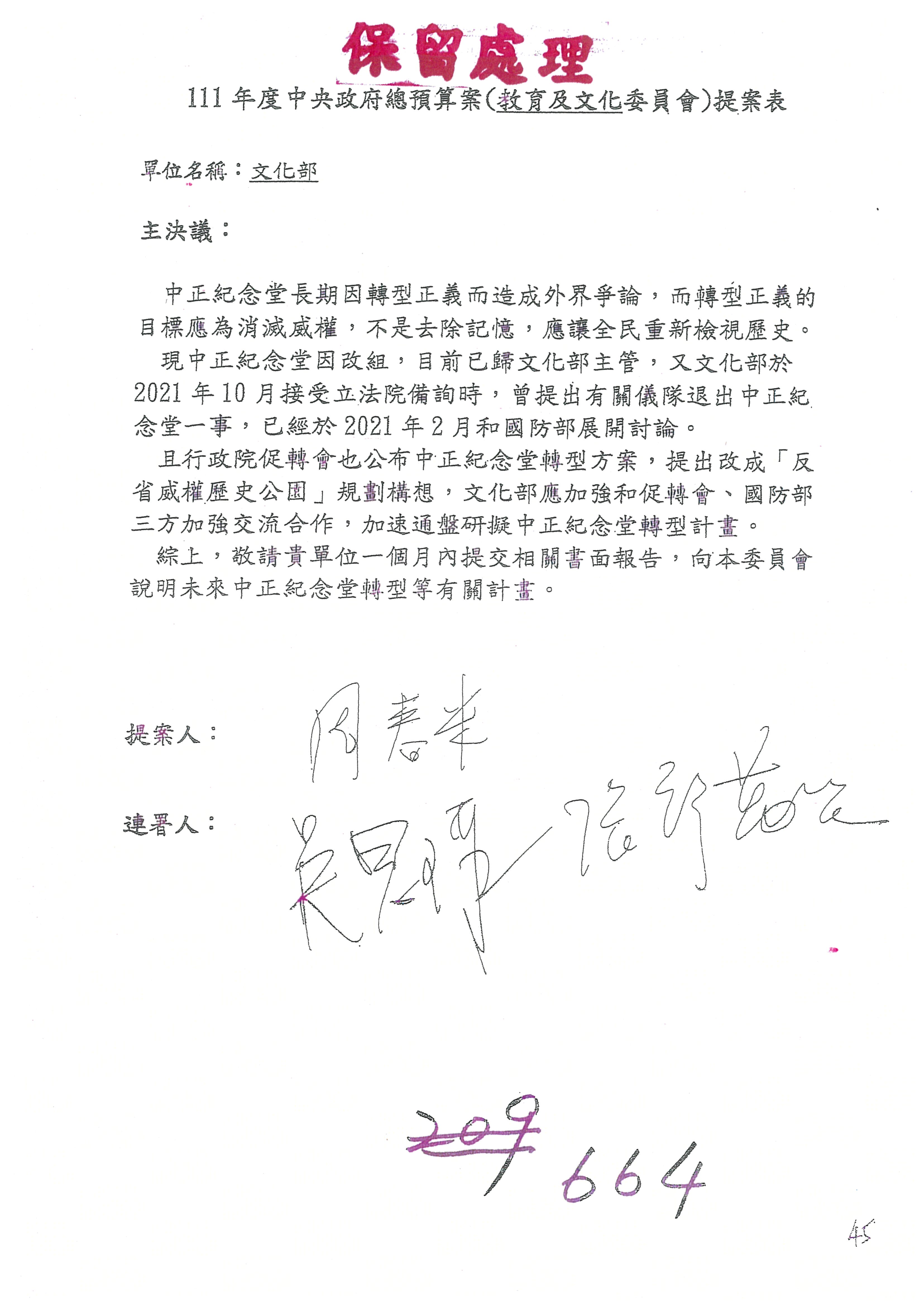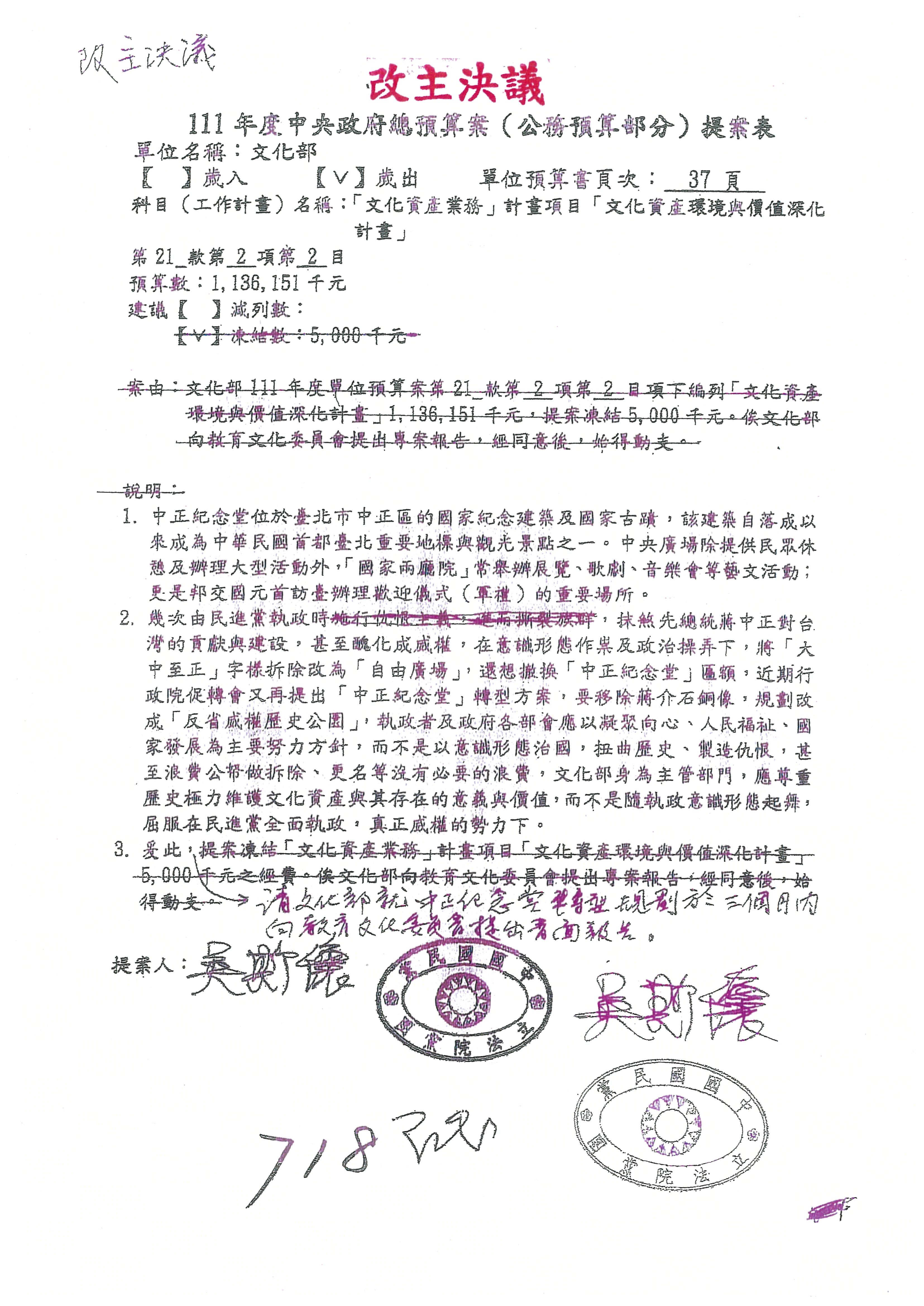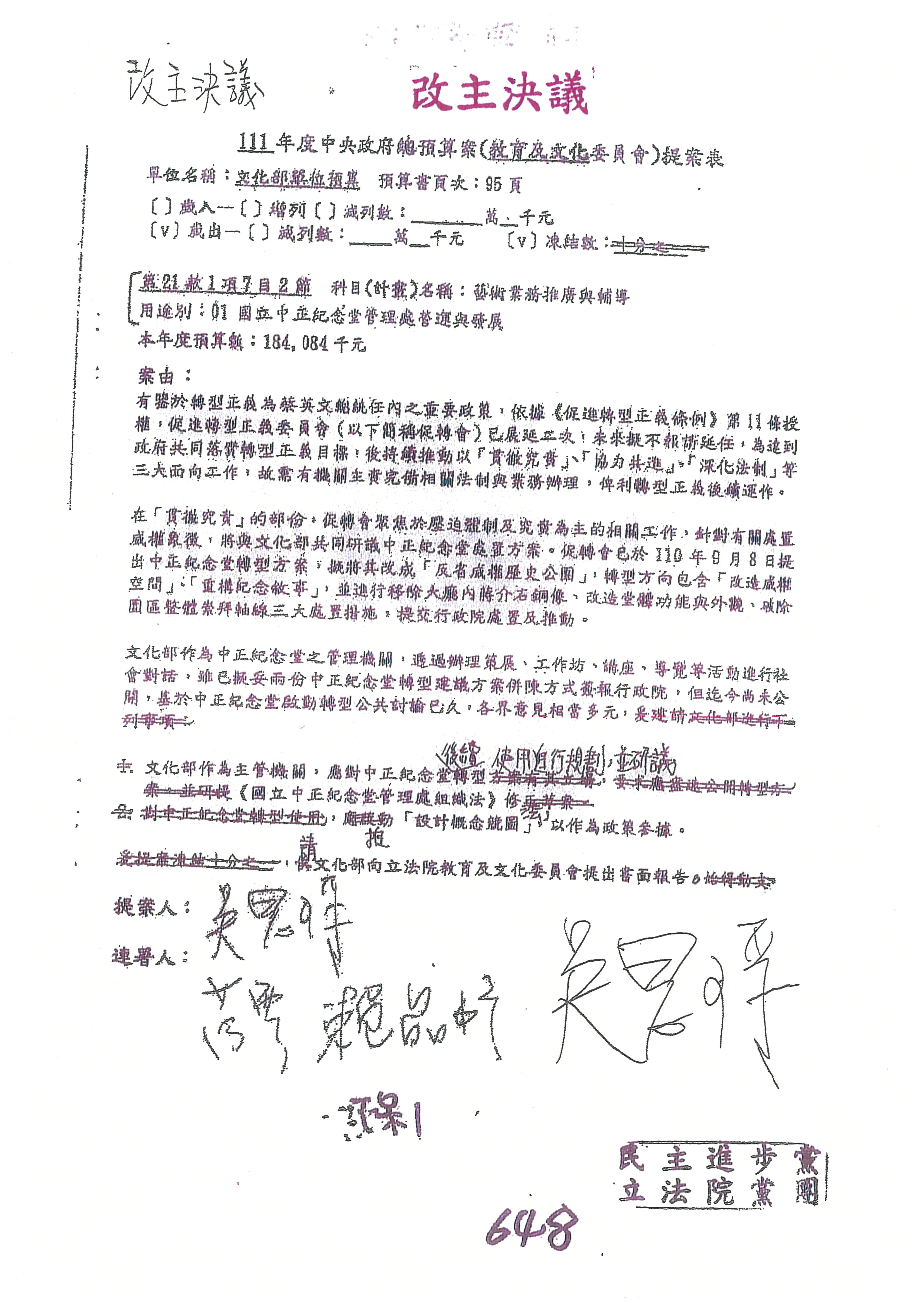 陳委員椒華:(17時14分)主席、各位同仁。將做為威權象徵的中正紀念堂轉型是我國民主化的一大進程,也是促進轉型正義工程的重中之重。促轉會在去年提出中正紀念堂轉型的主軸方向和處置措施,文化部就應該肩負起中正紀念堂轉型的重責大任,提出具體的轉型規劃。針對本次的預算提案,時代力量提出預算凍結,請文化部具體提出國立中正紀念堂管理處組織法的修正或廢止草案,送交本院審議。