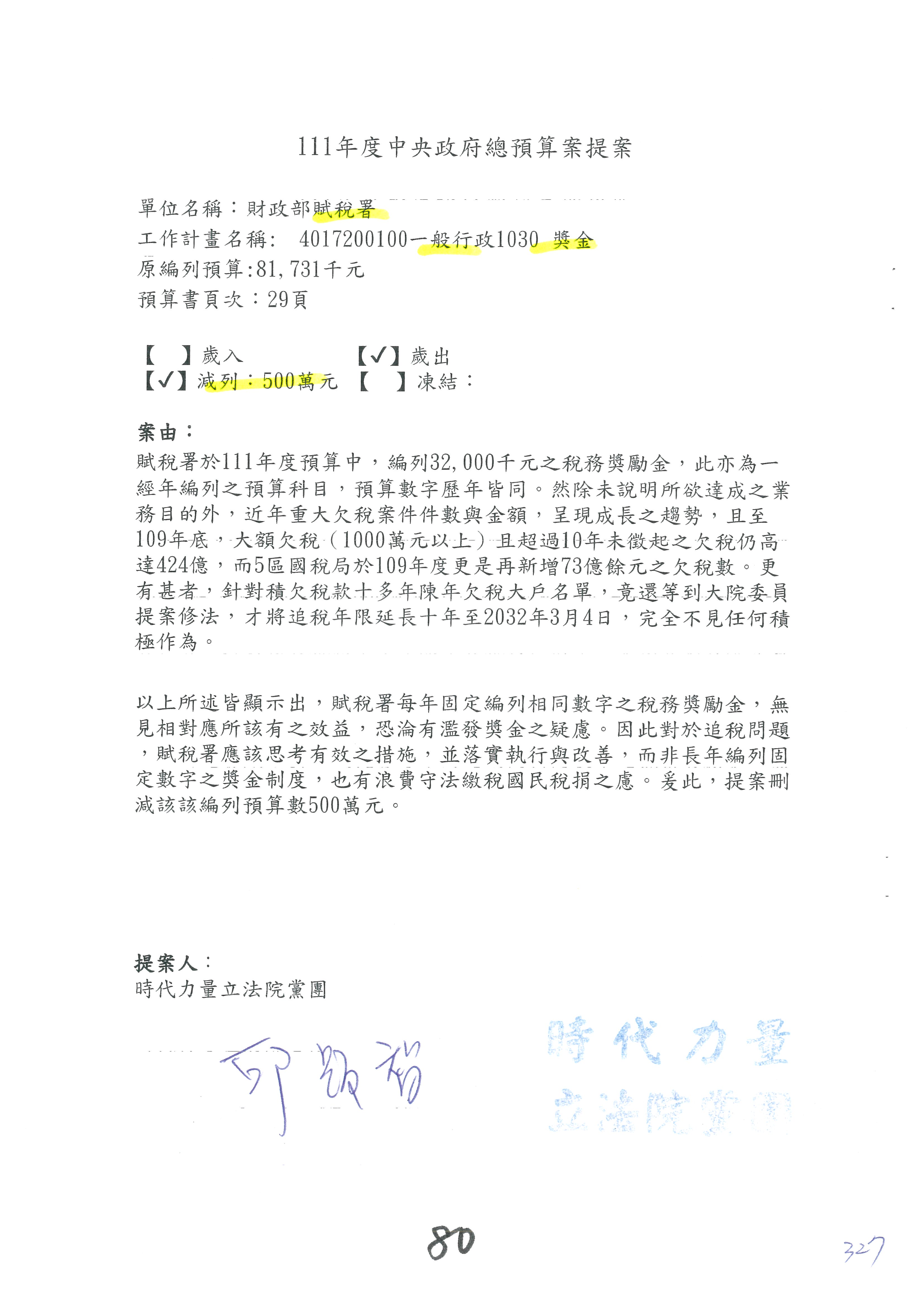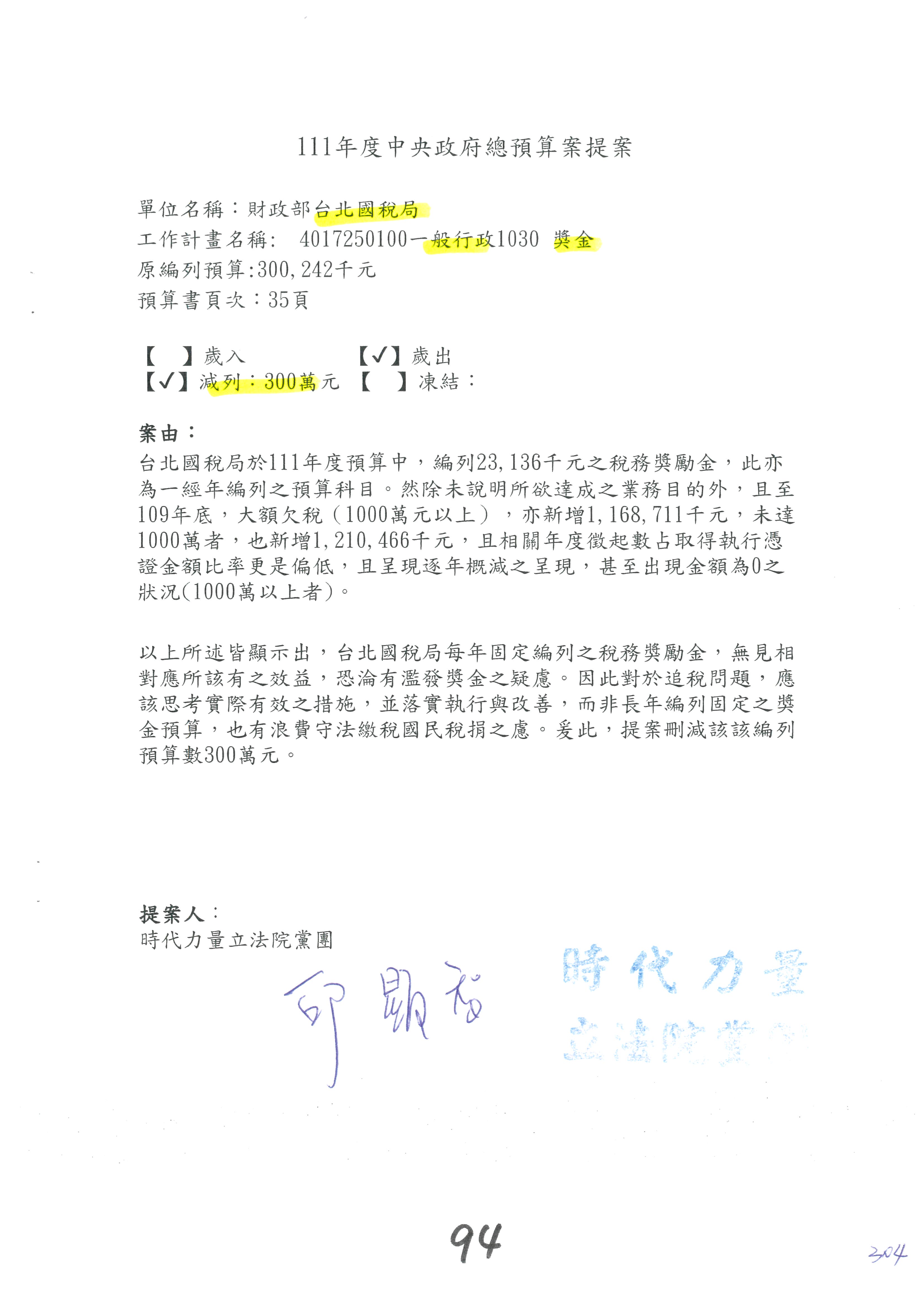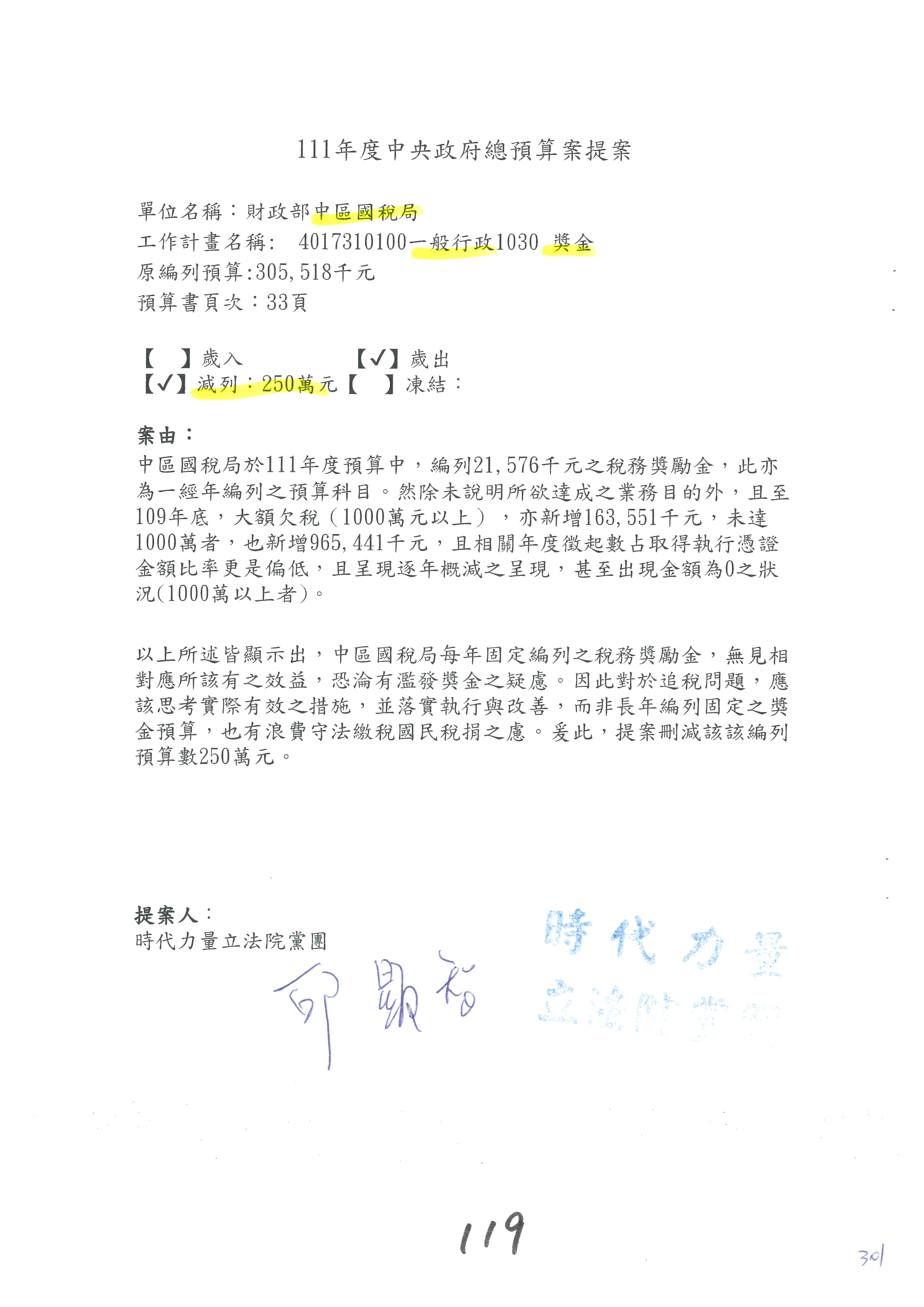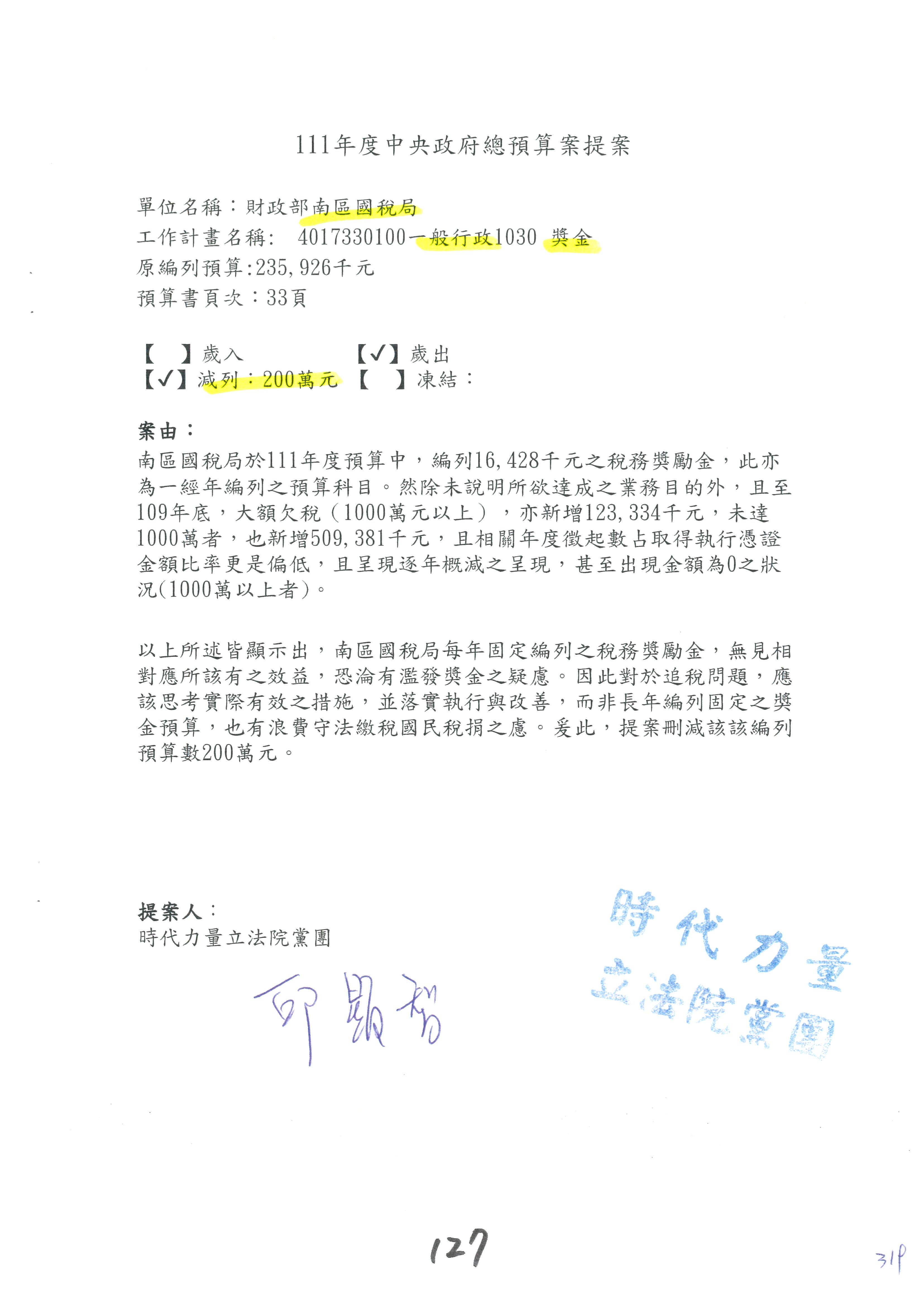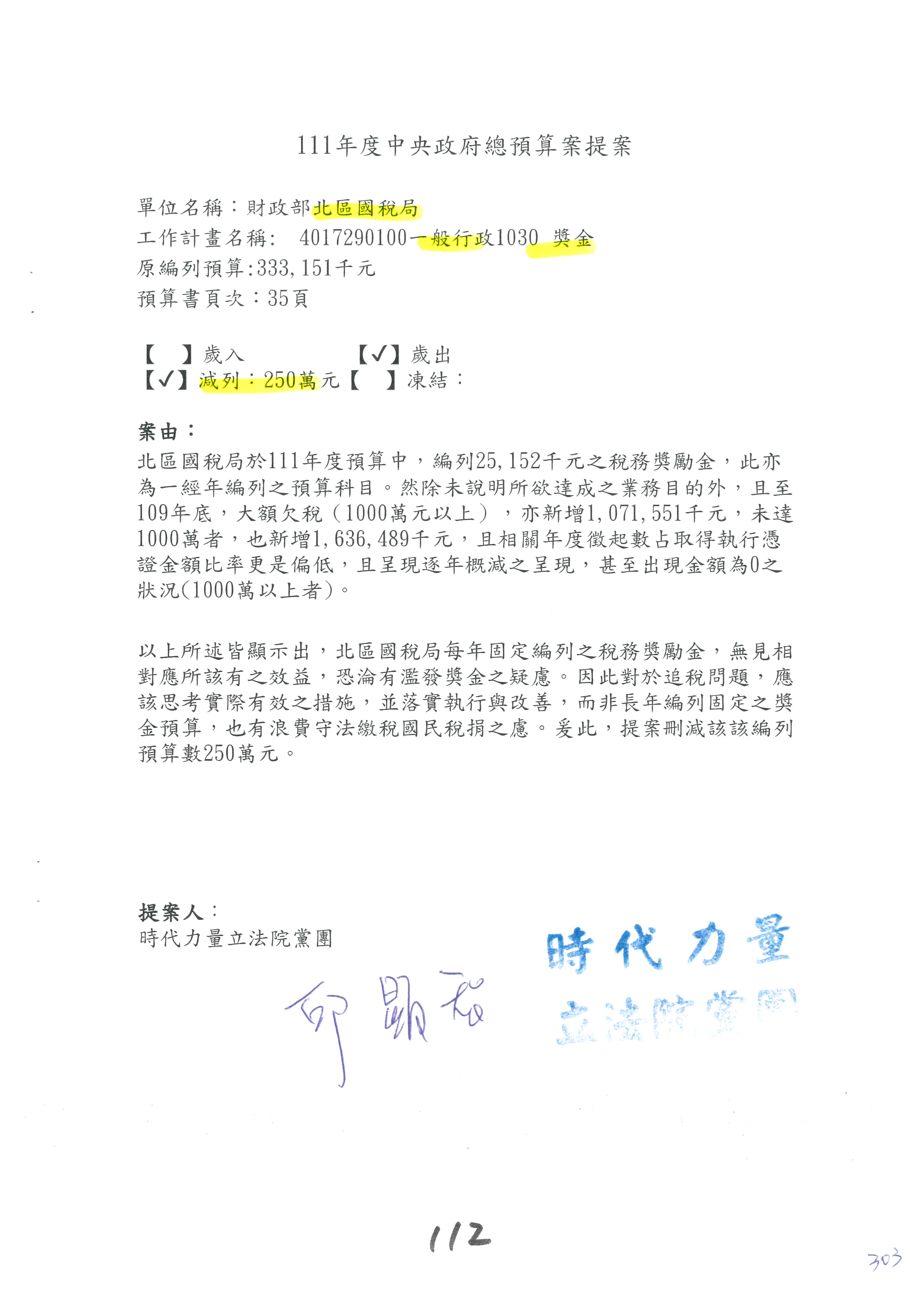 就稅務獎勵金的預算編列而言,稅務獎勵金的發放制度一直沒有正式的法制,此外連監察院也在107年調查報告中提出稅務獎勵金缺乏法源依據並要求改進,因此時代力量也提案針對稅務署及五區稅務局提出要求減列,希望能夠改進這個問題。