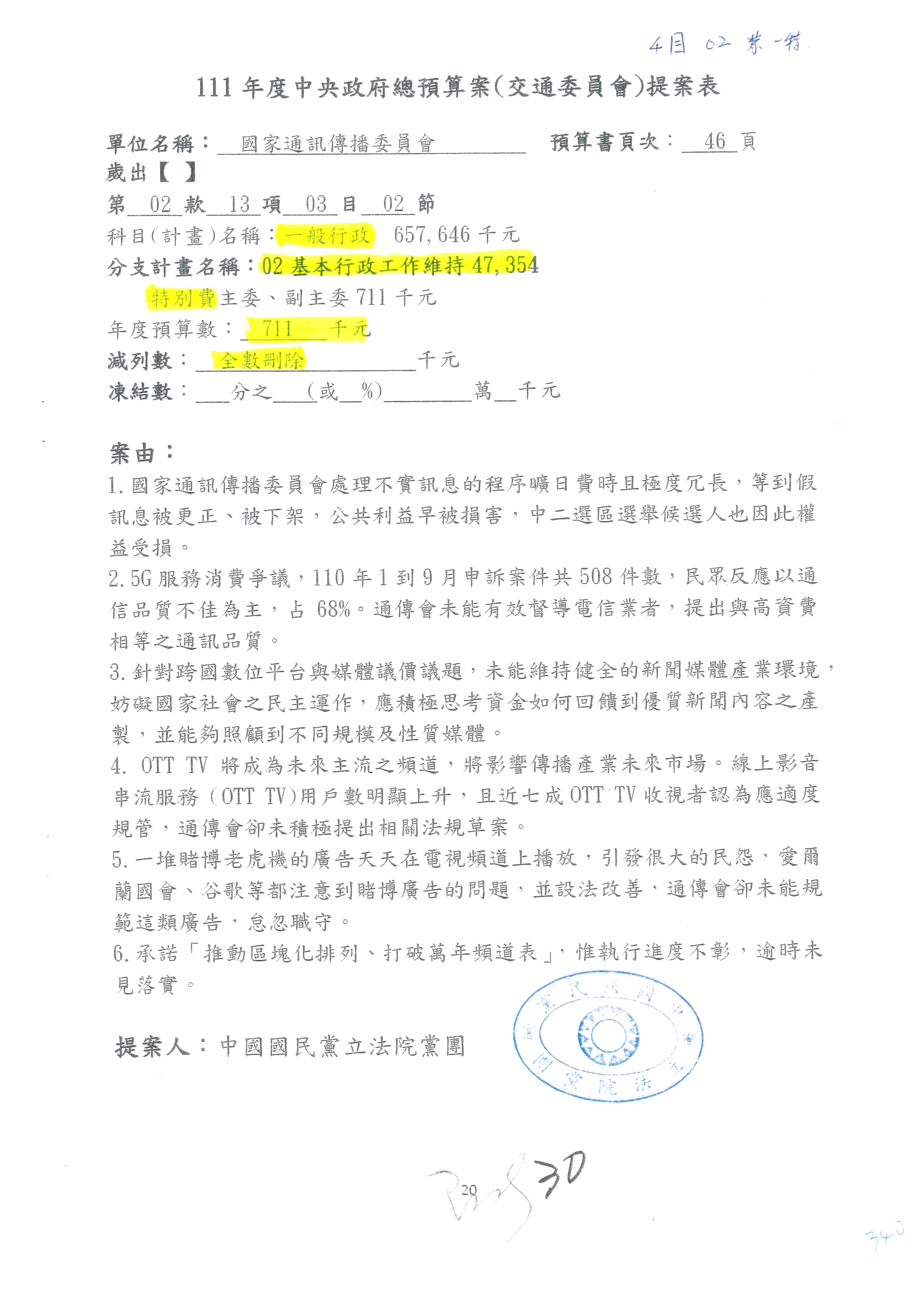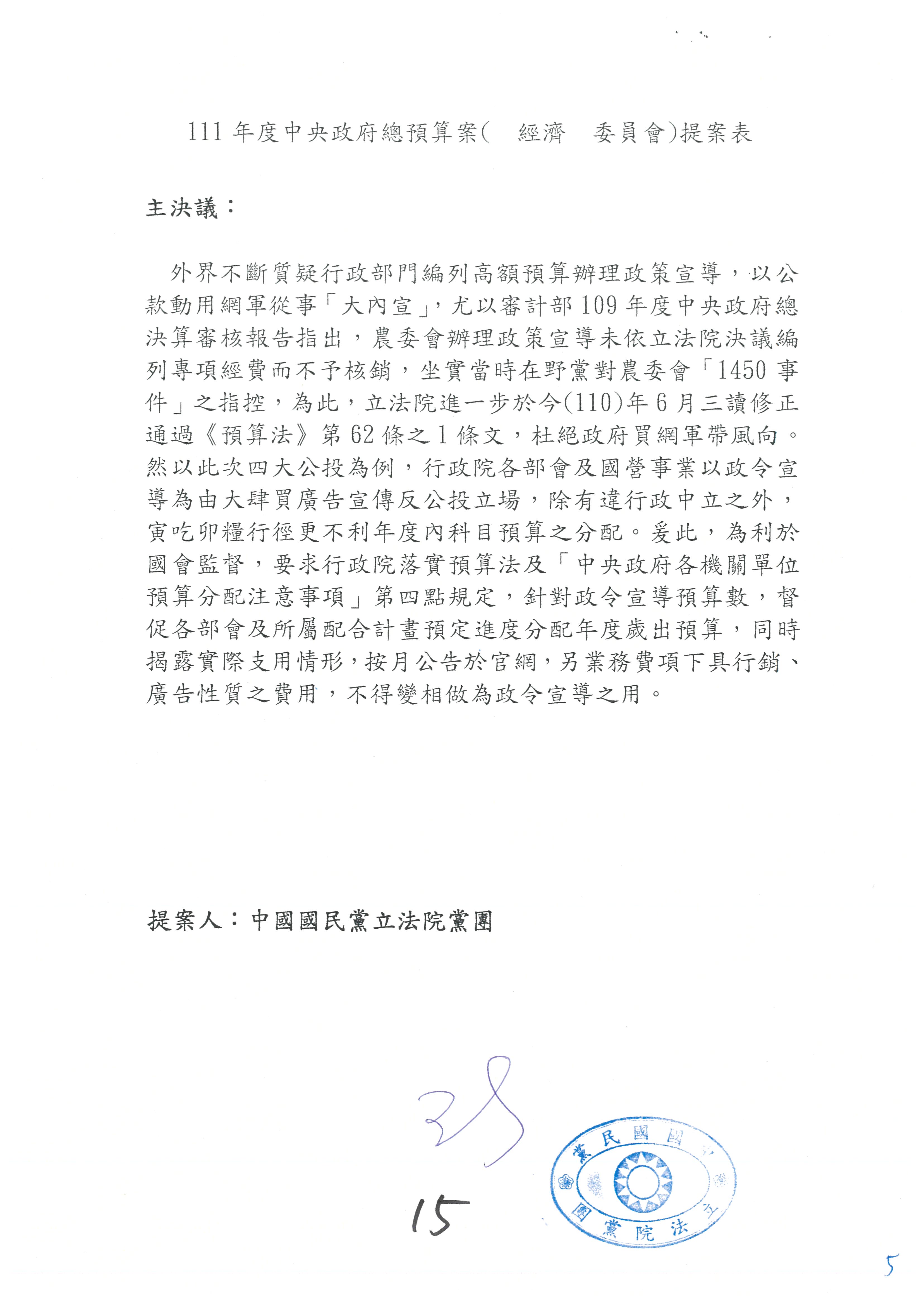 費委員鴻泰:(17時21分)主席副院長、各位委員。111年度中央政府總預算總共有2兆2,600多億元,占我們的GDP將近八分之一。在那麼大的數字裡面,本黨團希望這些預算都花在刀口上,也就是說,我們在經濟發展及社會福利上面應該要多所分配,不必要的錢、不該浪費的錢,就希望儘量予以剔除。因此,對於各個部會政令宣導的費用,本黨團覺得只要各部會做得好,自然有媒體會報導,不需要多做宣導,這個部分的錢可以省下來做社會福利及經濟發展之用。