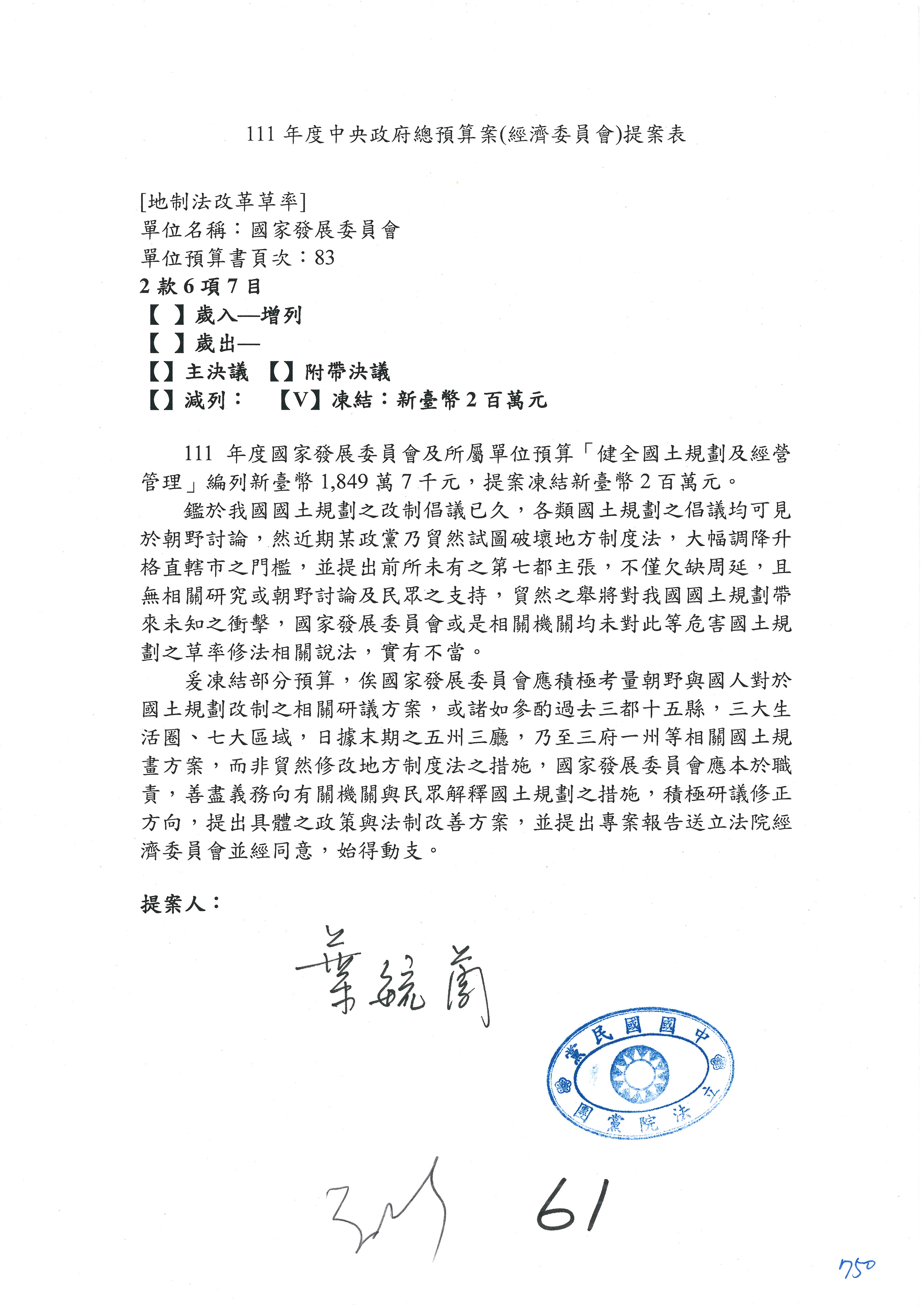 主席:報告表決結果:出席委員96人,贊成者36人,反對者59人,棄權者1人,贊成者少數,本案不通過。