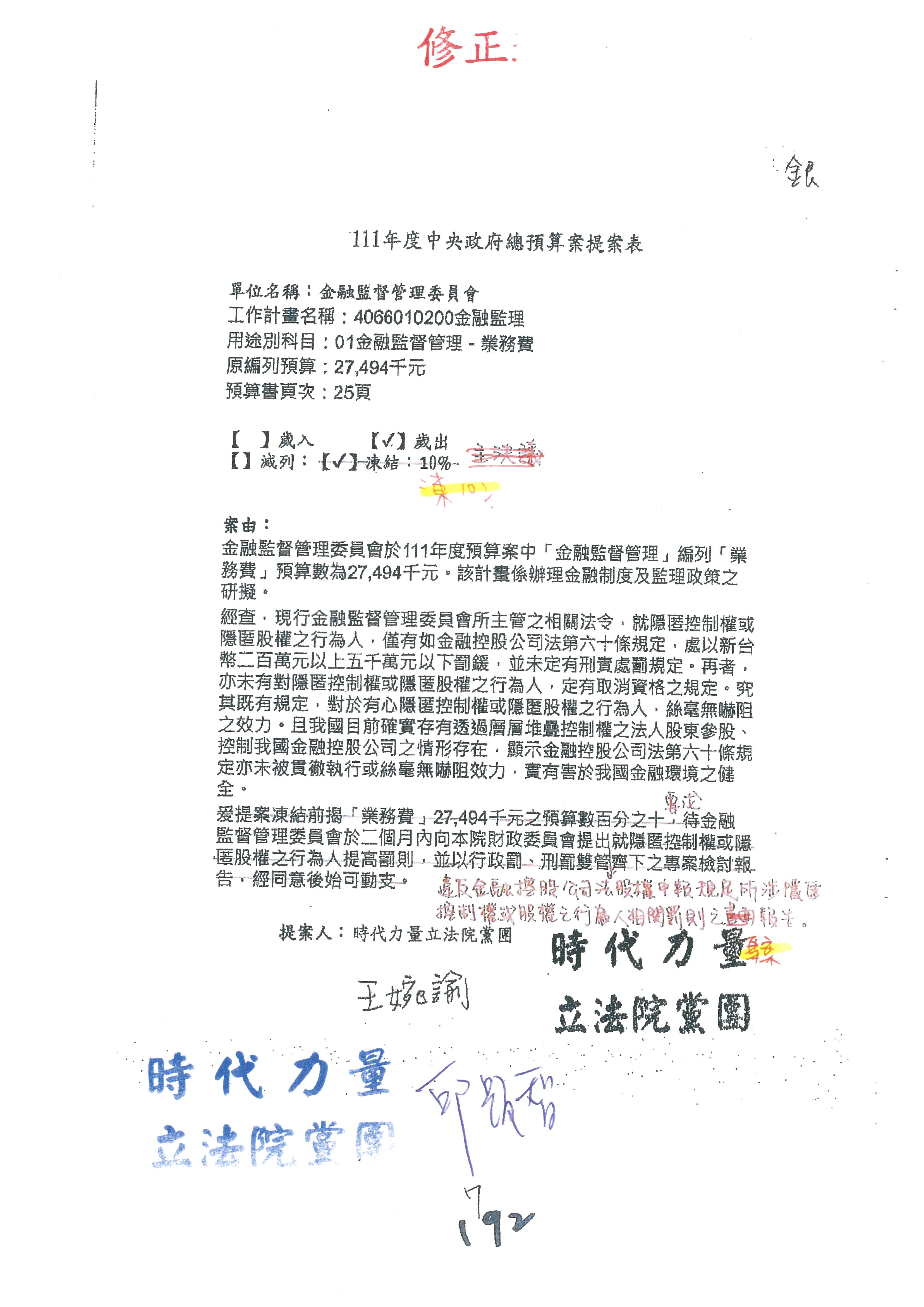 就財政金融方面,公司的穩健治理是確保企業永續經營以及保障投資者權益最重要的根基,時代力量提出包含凍結與決議文提案十多案,針對公股行庫董總舞弊案、法人董事派任更換制度、公司之實質受益人及最終控制權人的資訊公開揭露、企業隱匿控制權或隱匿股權等重大爭議,要求財政部及金管會等相關單位提出改善及政策規劃之書面或專案報告,以健全金融發展與保障消費者權益。