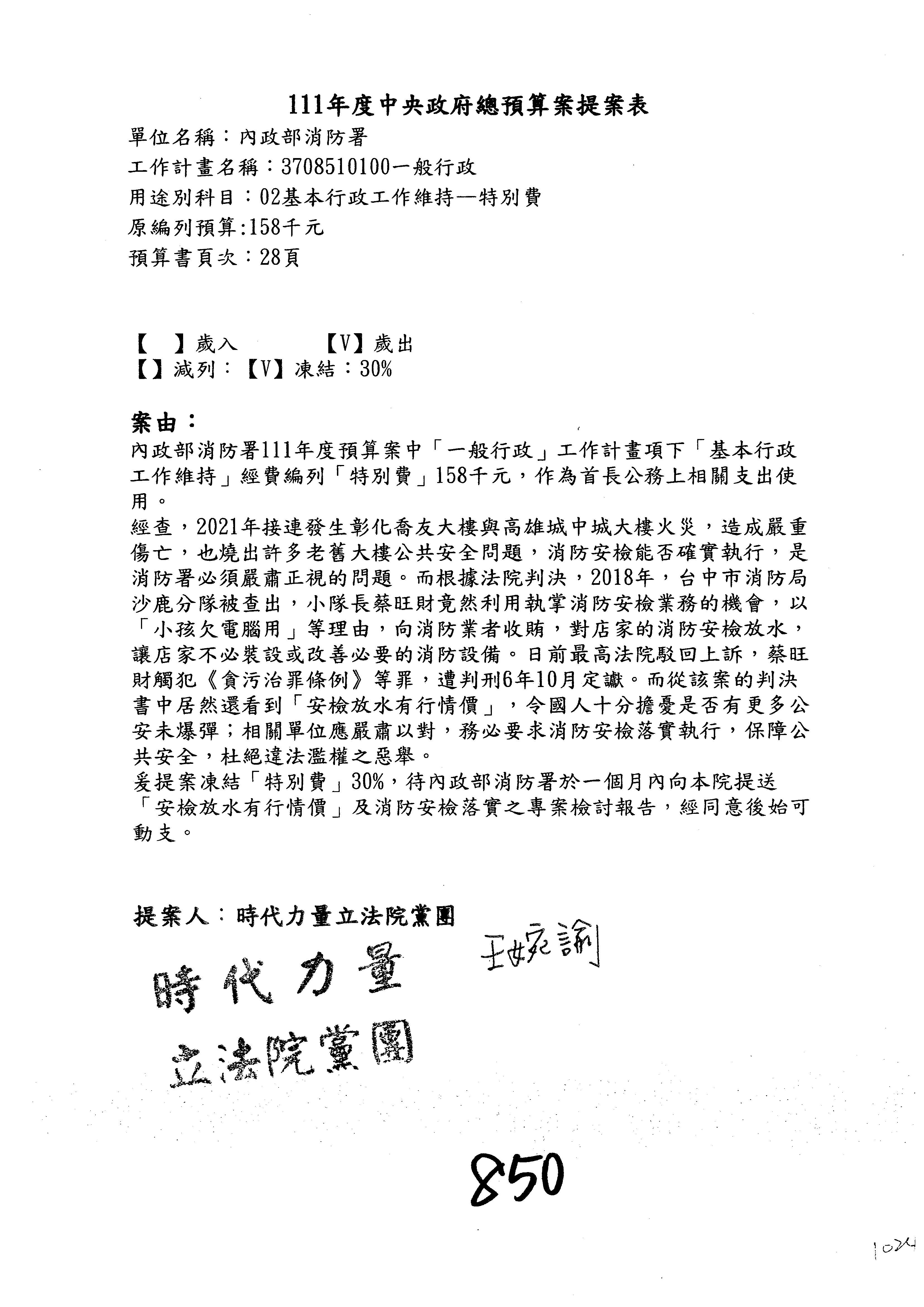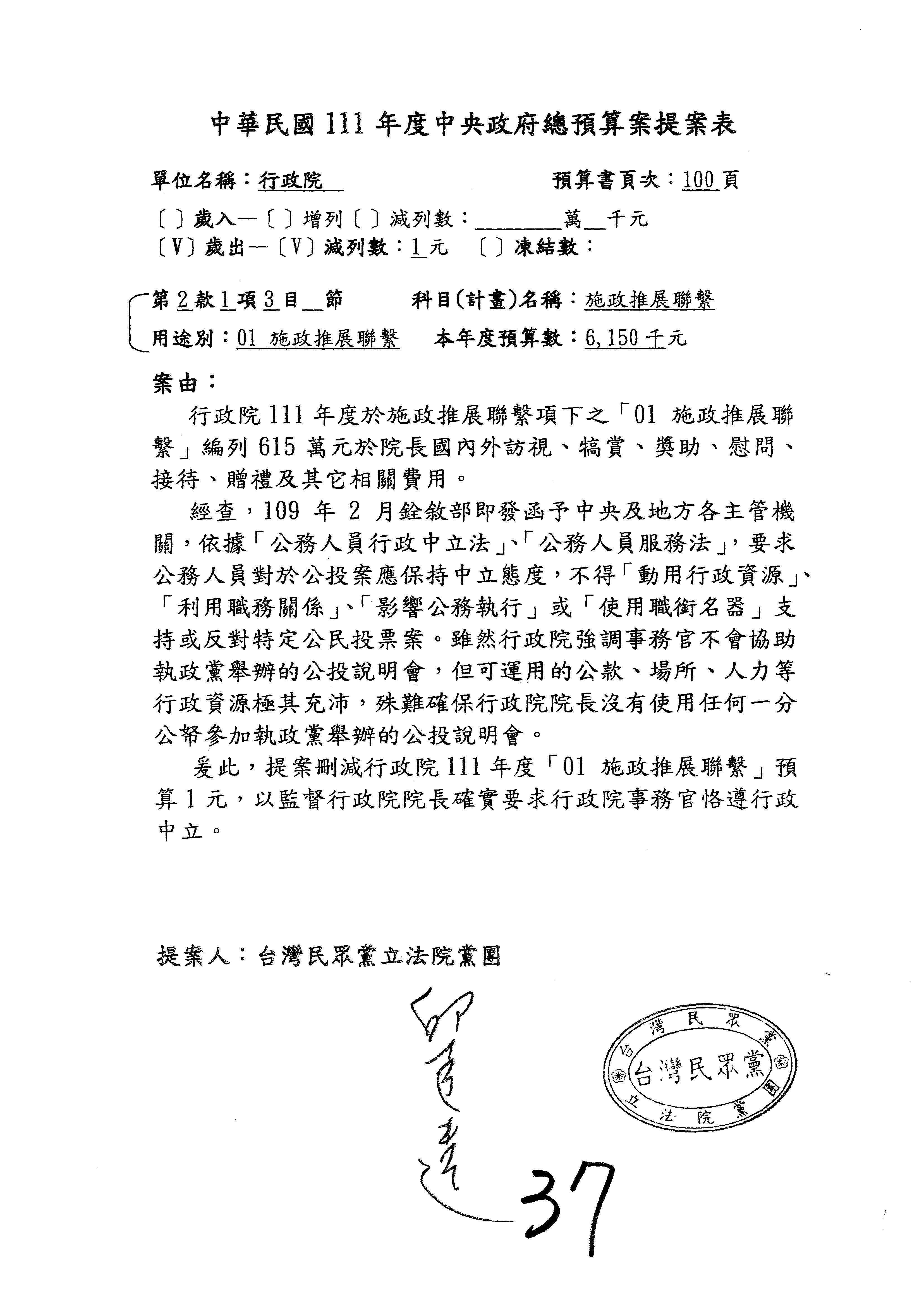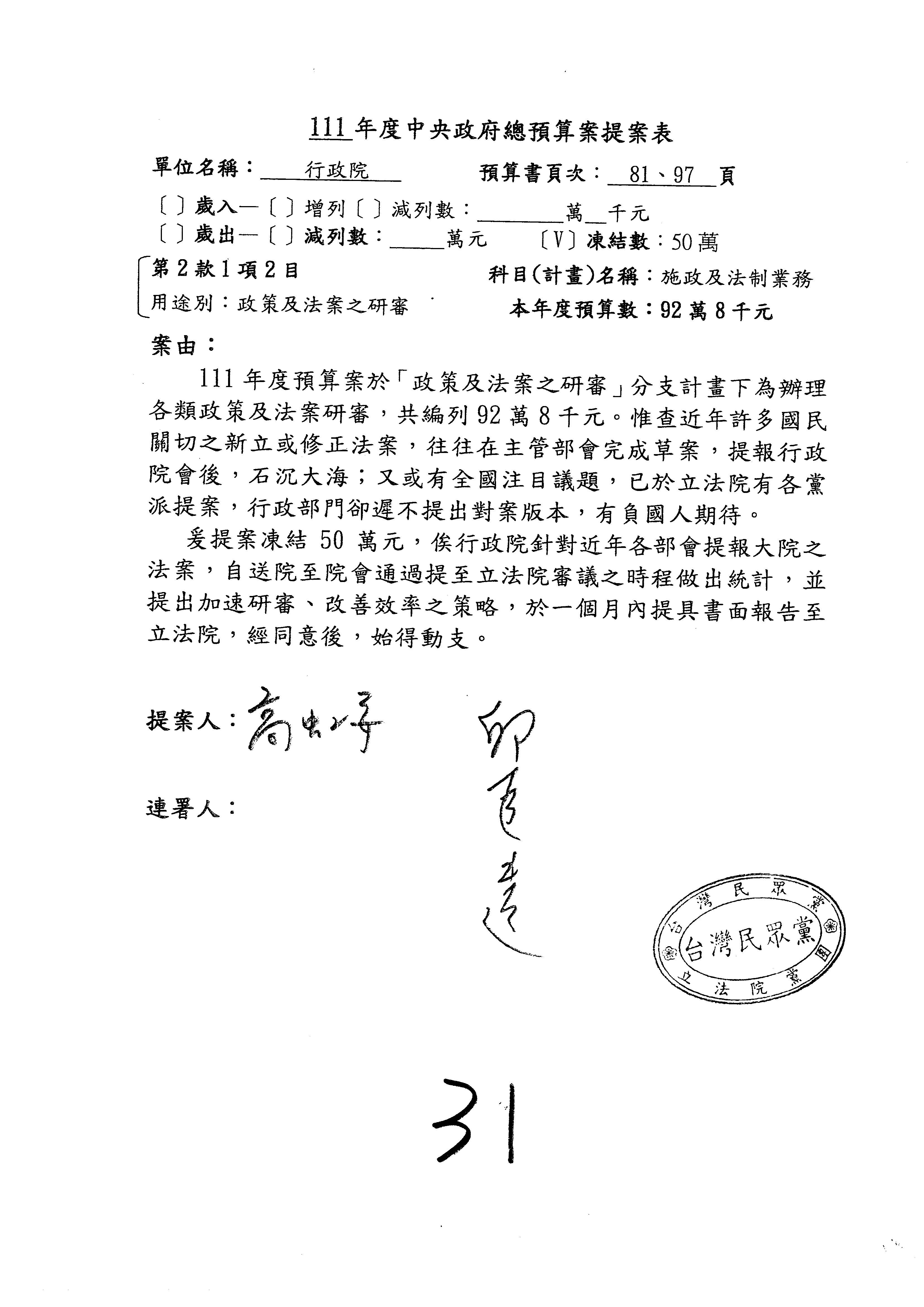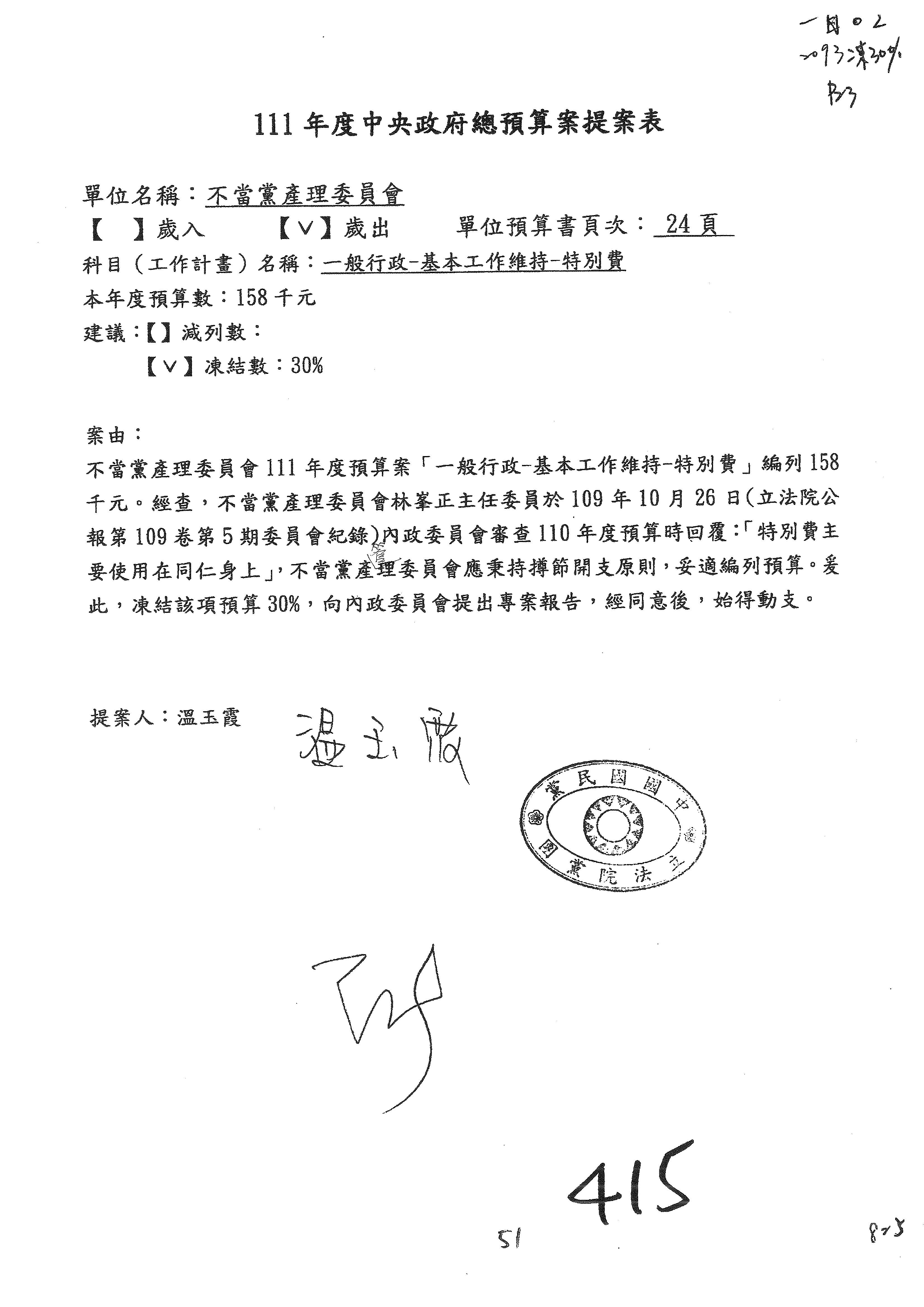 但是非常遺憾地在預算協商中,民進黨黨團對上述提案所凍結的首長特別費之態度是保留提案、提交院會表決。而中國國民黨黨團則是預算提案提及國民黨政治人物,包括林益世、秦儷舫、吳健保、李慶華等涉貪、涉弊都保留到院會表決。我們必須要問兩大黨這樣的態度,到底是不是真的有心要面對這麼多年來,兩黨輪流執政下所造成人民對司法不信任的狀況?