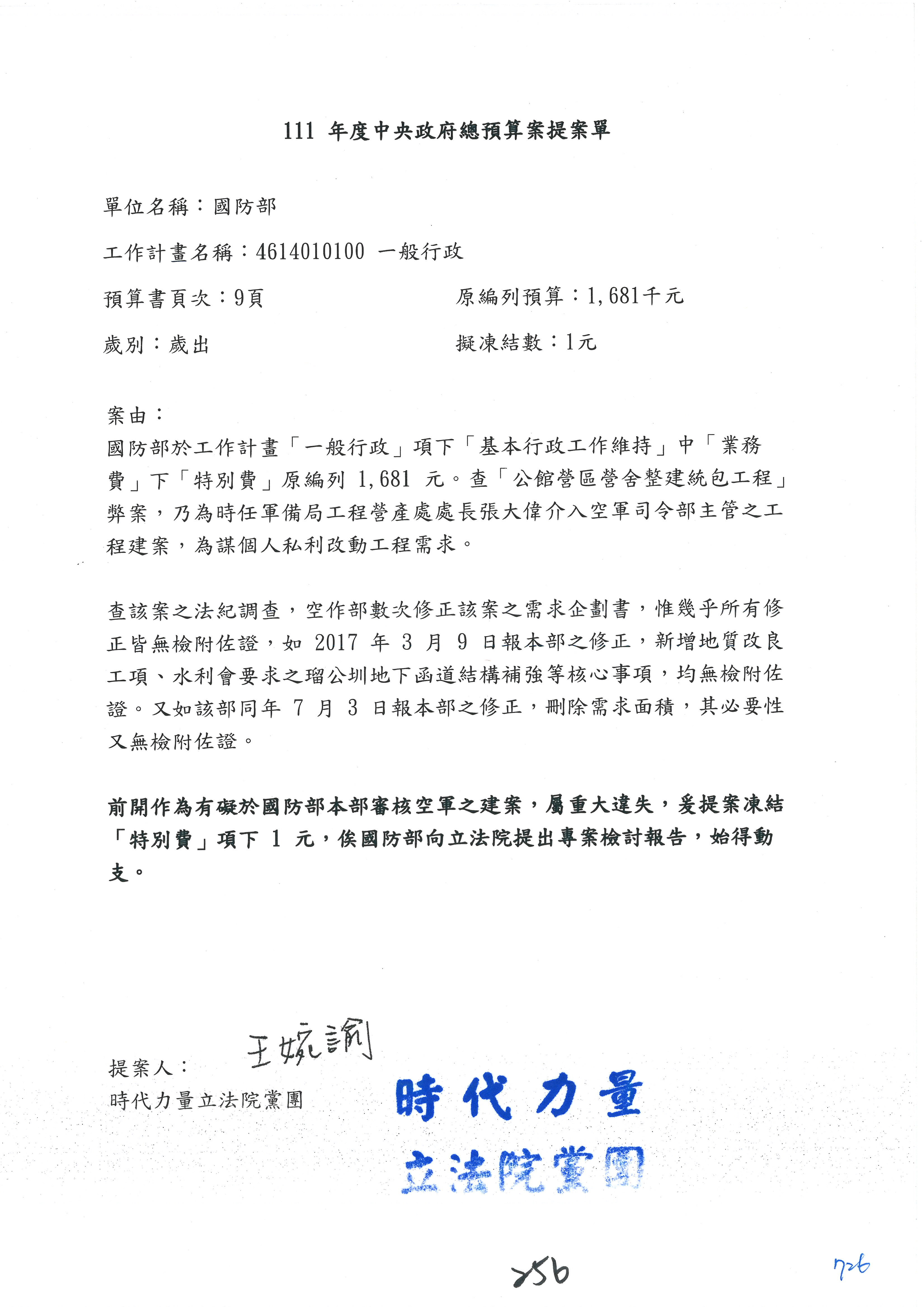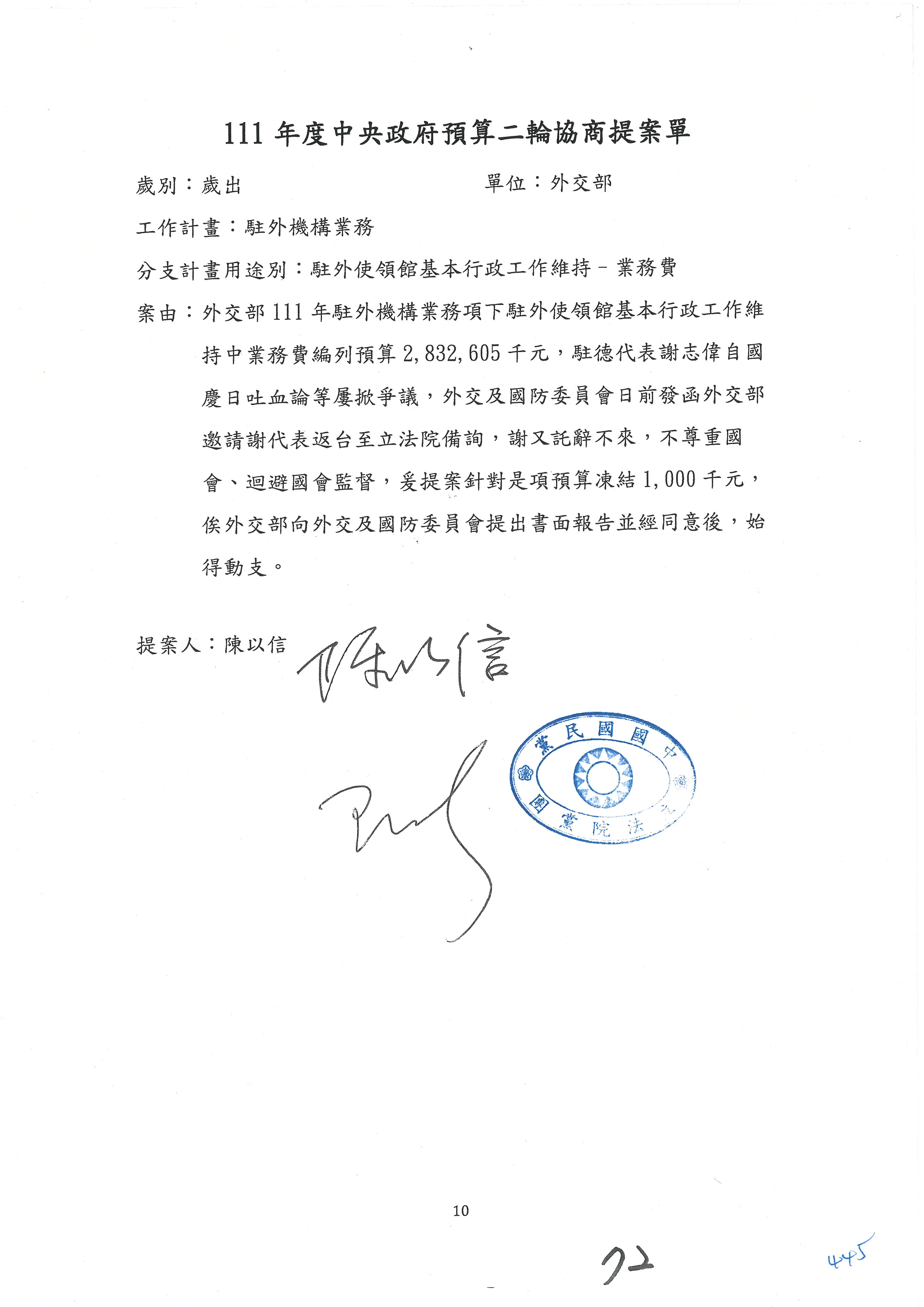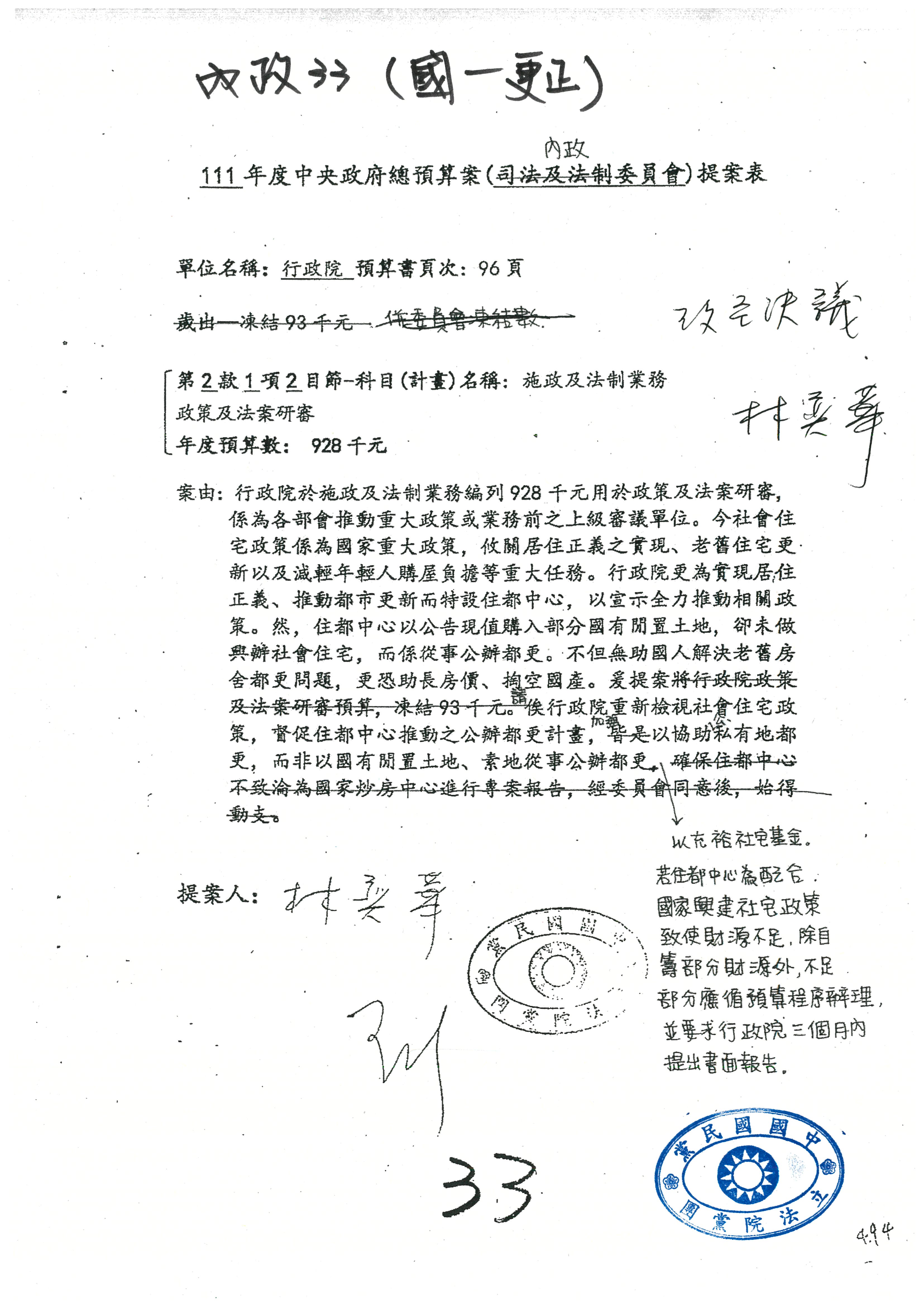 但是非常遺憾地在預算協商中,民進黨黨團對上述提案所凍結的首長特別費之態度是保留提案、提交院會表決。而中國國民黨黨團則是預算提案提及國民黨政治人物,包括林益世、秦儷舫、吳健保、李慶華等涉貪、涉弊都保留到院會表決。我們必須要問兩大黨這樣的態度,到底是不是真的有心要面對這麼多年來,兩黨輪流執政下所造成人民對司法不信任的狀況?