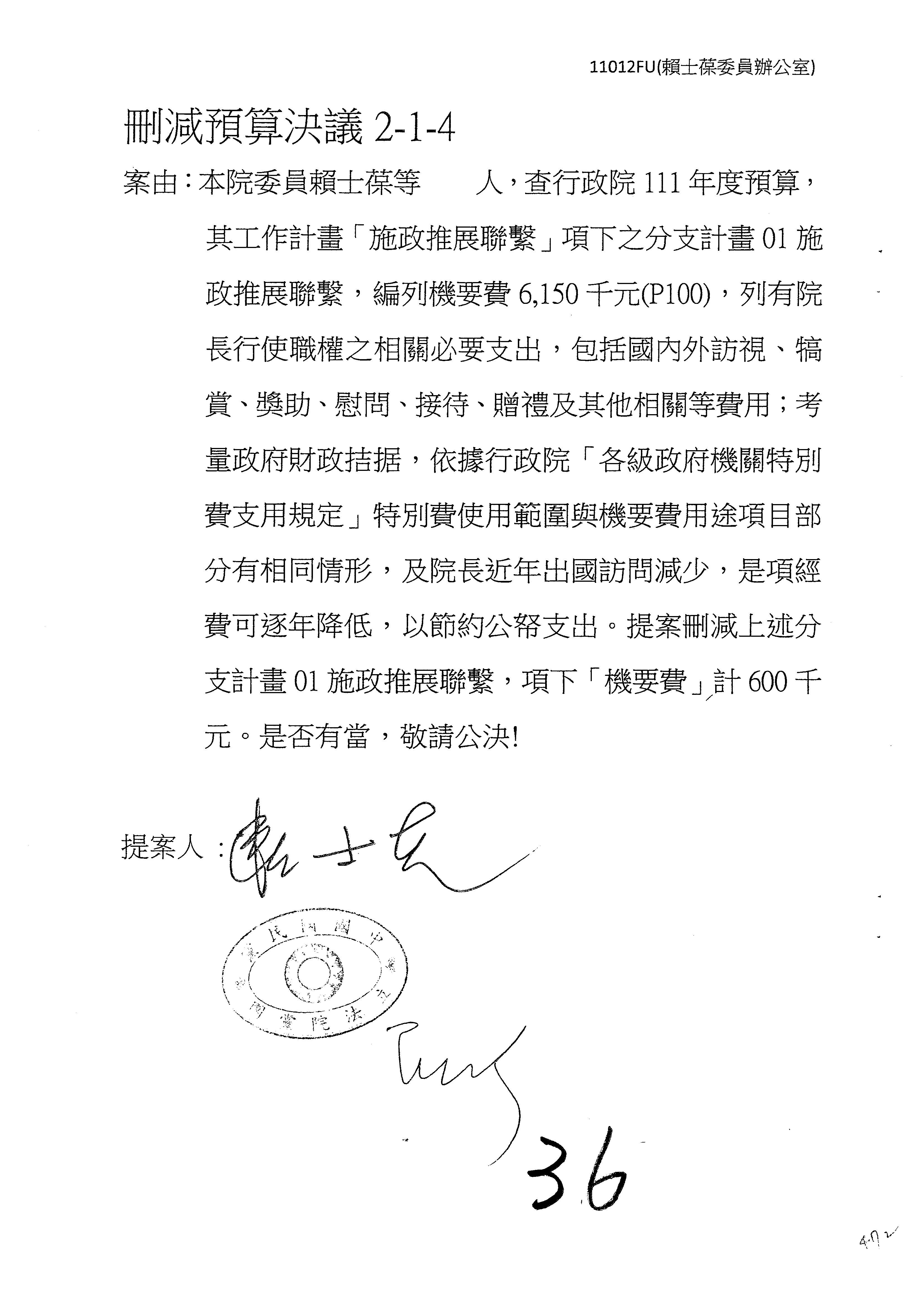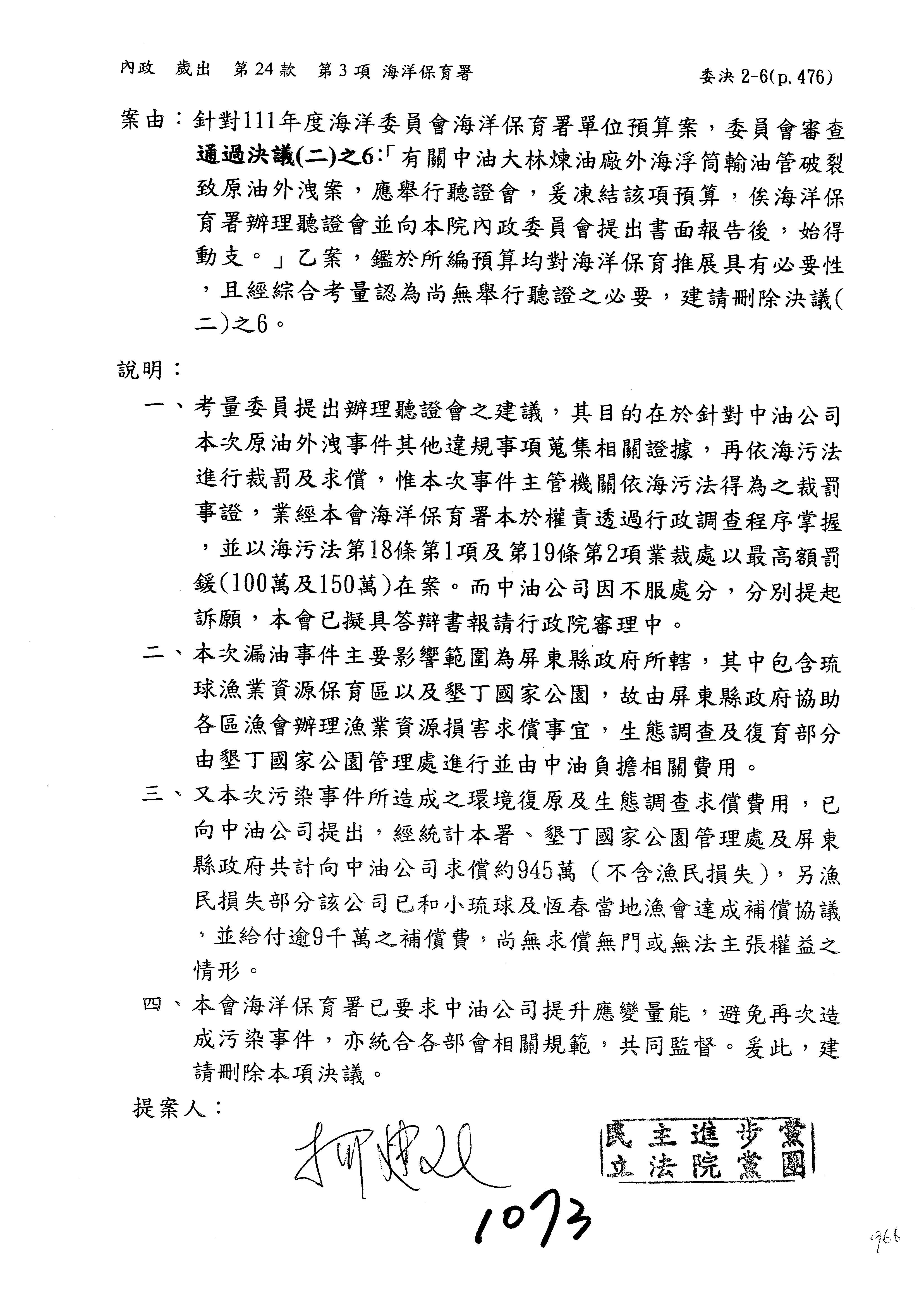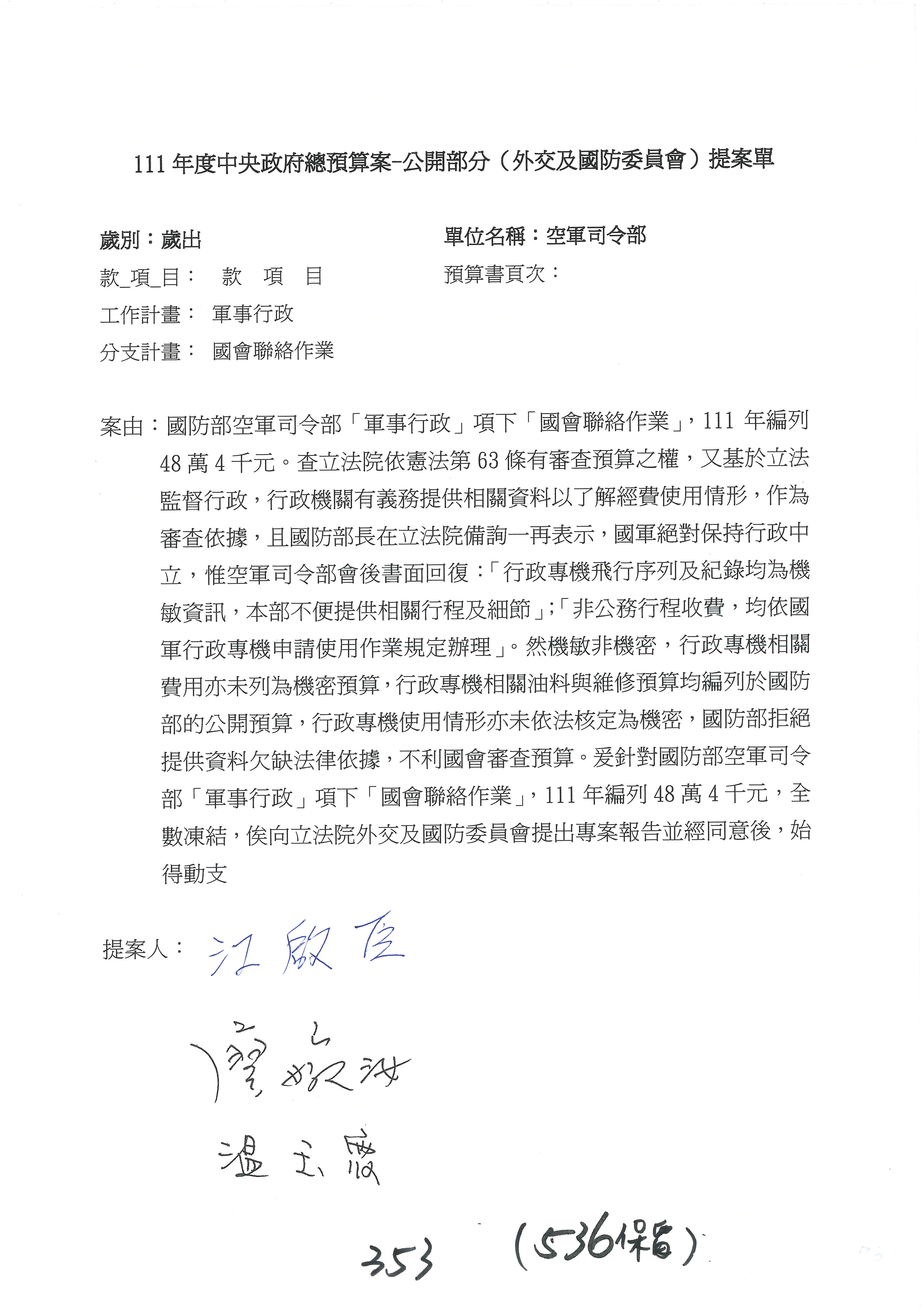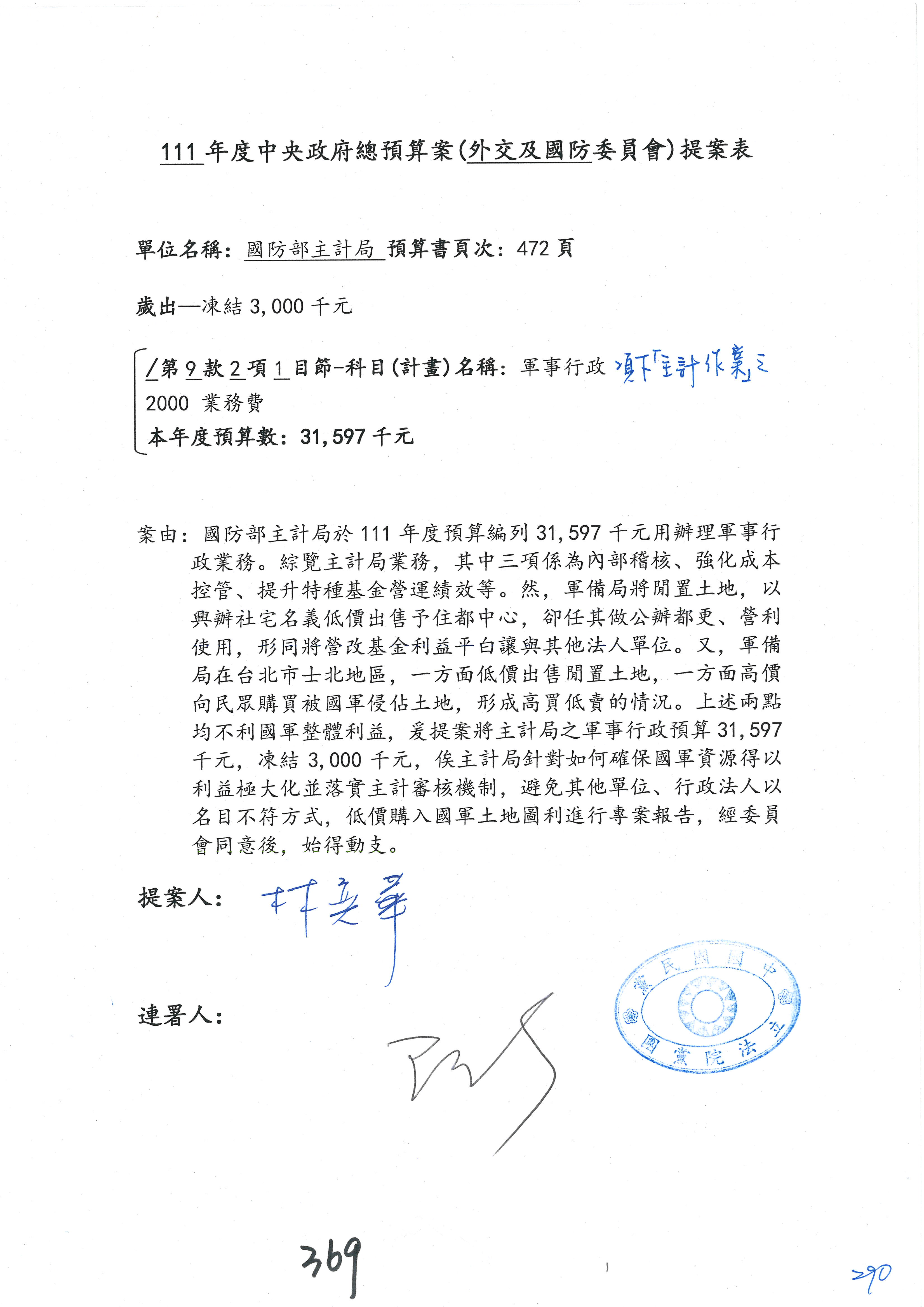 但是非常遺憾地在預算協商中,民進黨黨團對上述提案所凍結的首長特別費之態度是保留提案、提交院會表決。而中國國民黨黨團則是預算提案提及國民黨政治人物,包括林益世、秦儷舫、吳健保、李慶華等涉貪、涉弊都保留到院會表決。我們必須要問兩大黨這樣的態度,到底是不是真的有心要面對這麼多年來,兩黨輪流執政下所造成人民對司法不信任的狀況?