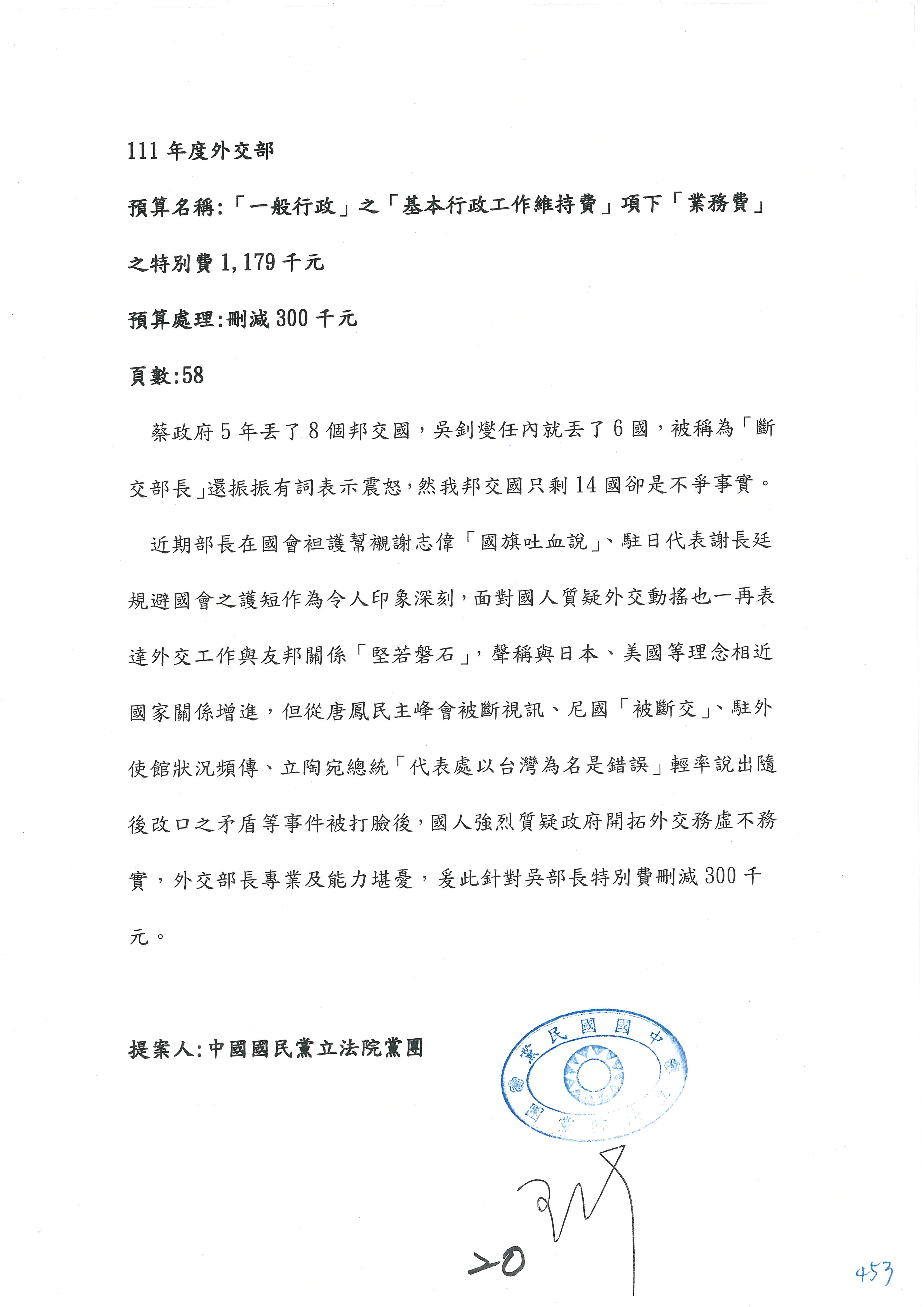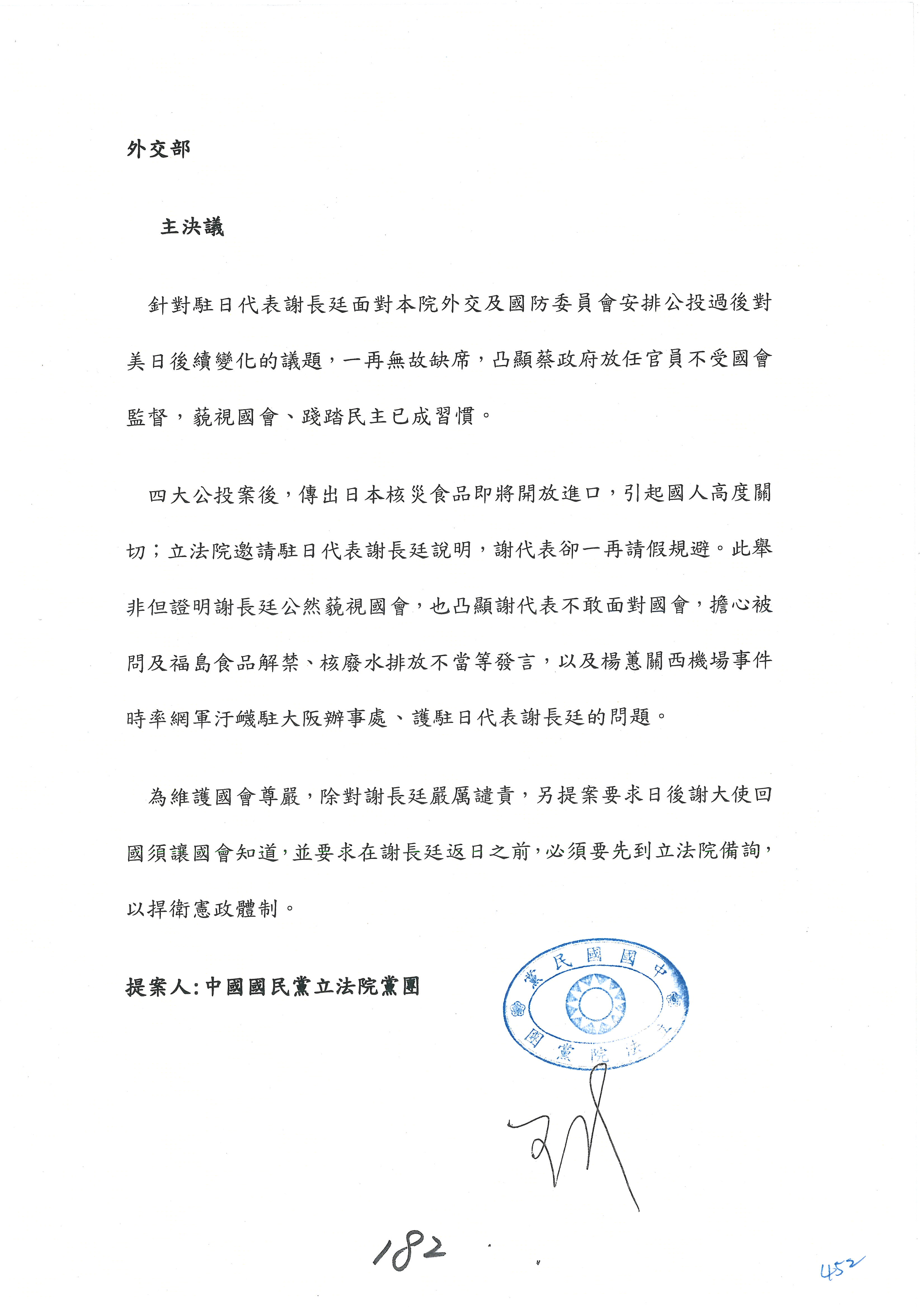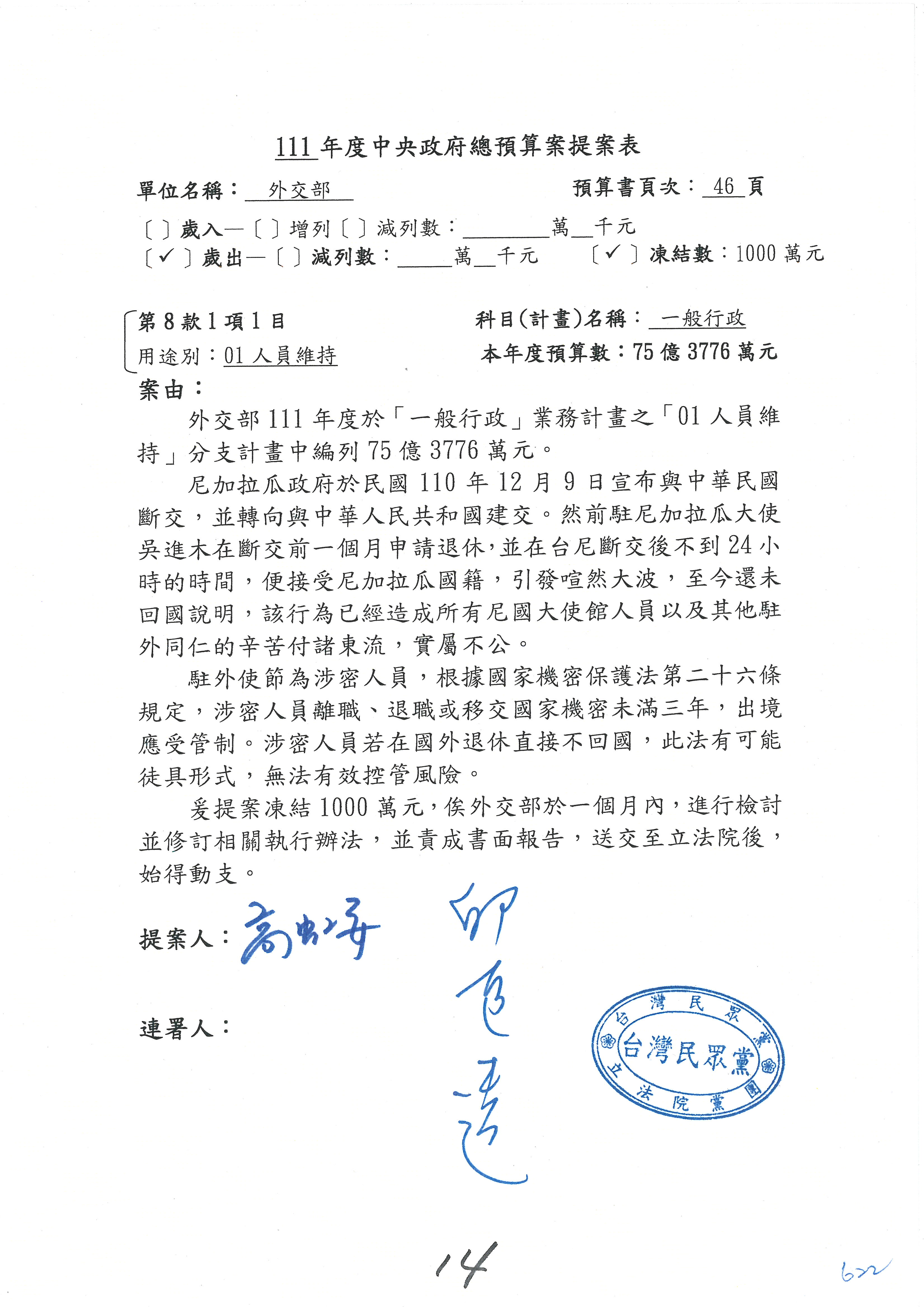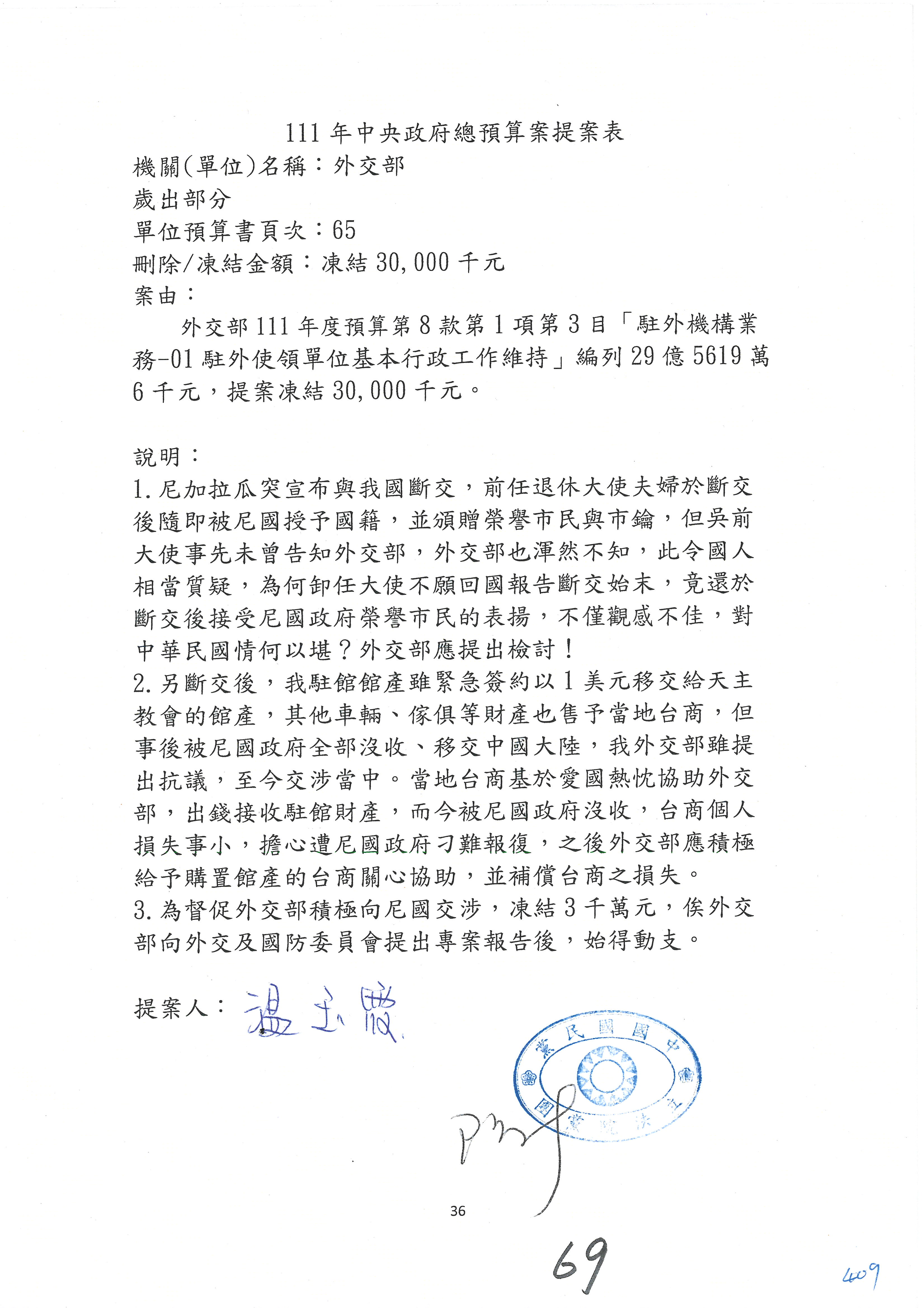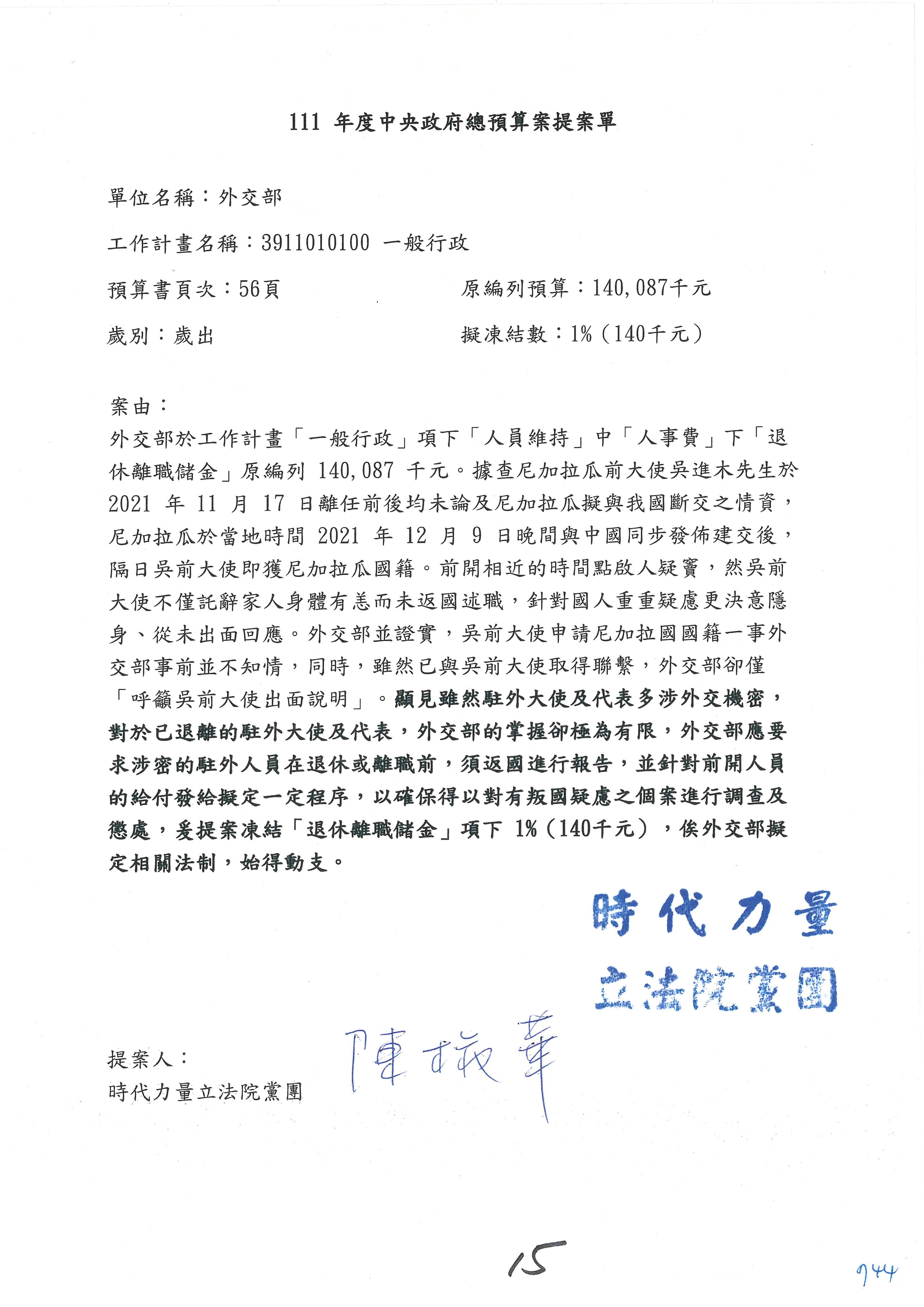 在國防及外交委員會的部分,民眾黨其實非常重視,像是尼加拉瓜大使吳進木,在斷交後卻未直接返臺,甚至還取得了尼國國籍,像這類的事情也一再顯示我們外交部的失能;坦白說,蔡政府上任以來,外交部等於幾乎快變成「斷交部」,有這麼多邦交國斷交,甚至還發生我國駐外大使竟然不回國的狀況,其實也是一個問題,在這個地方我們也希望要有所節制。