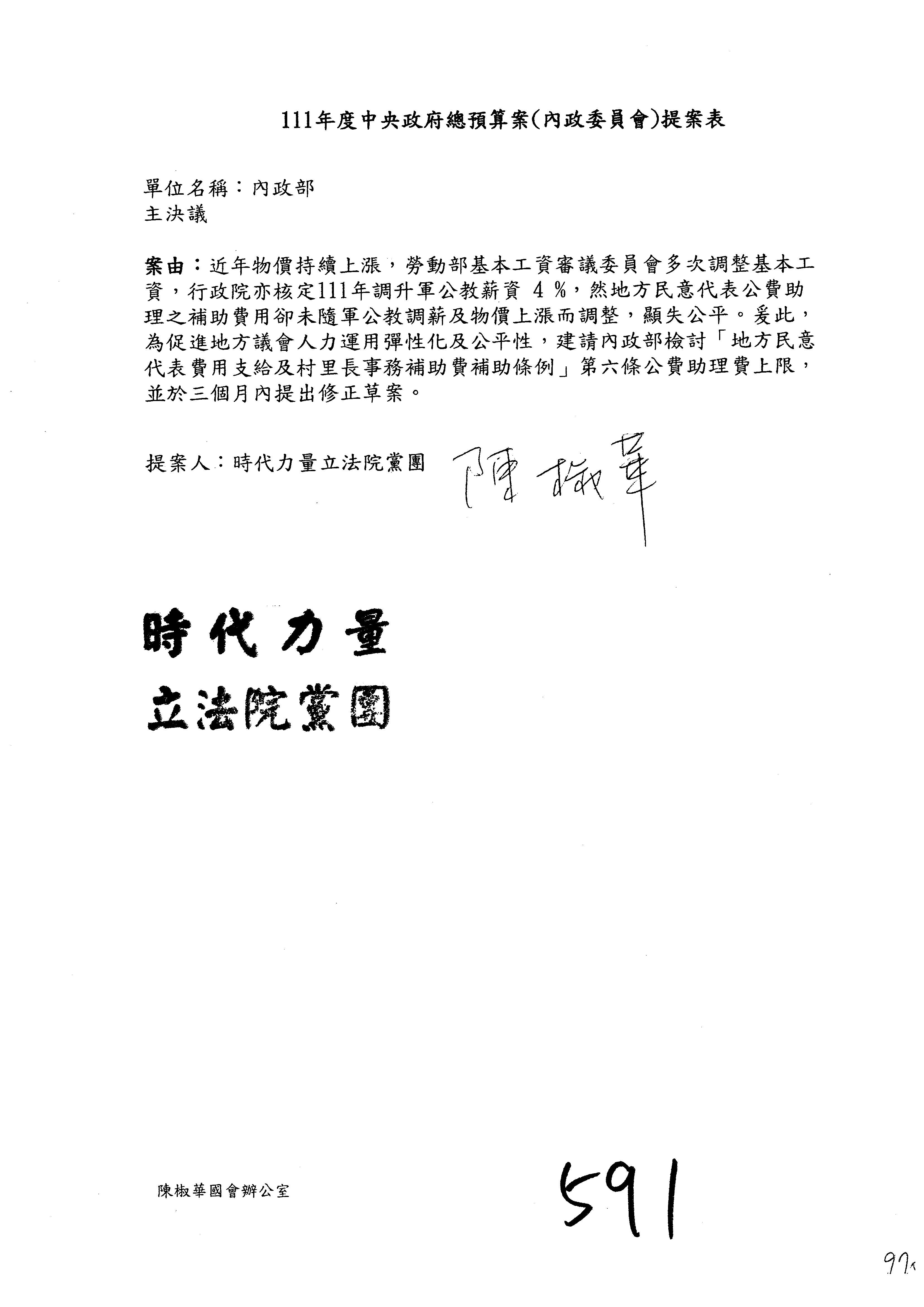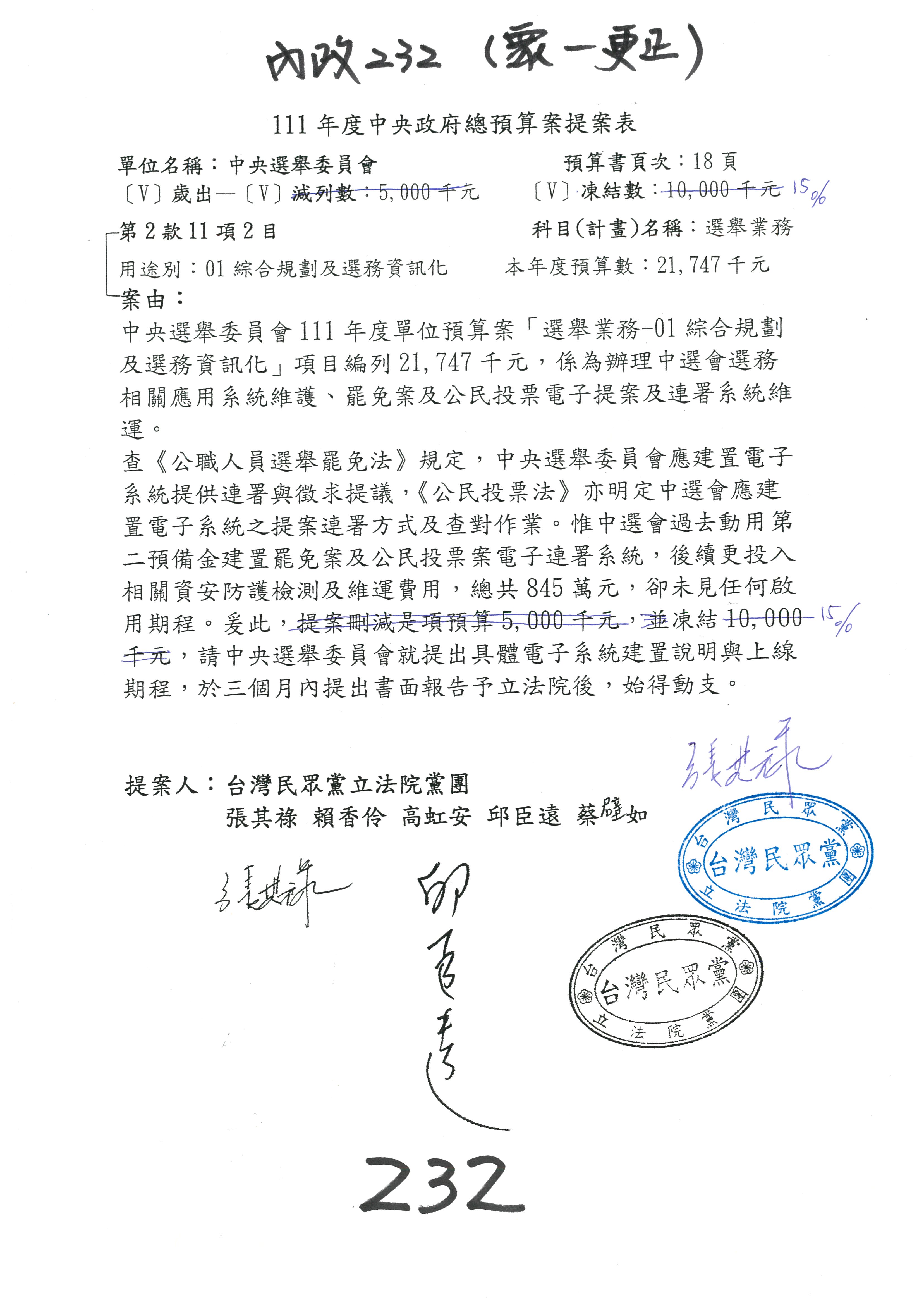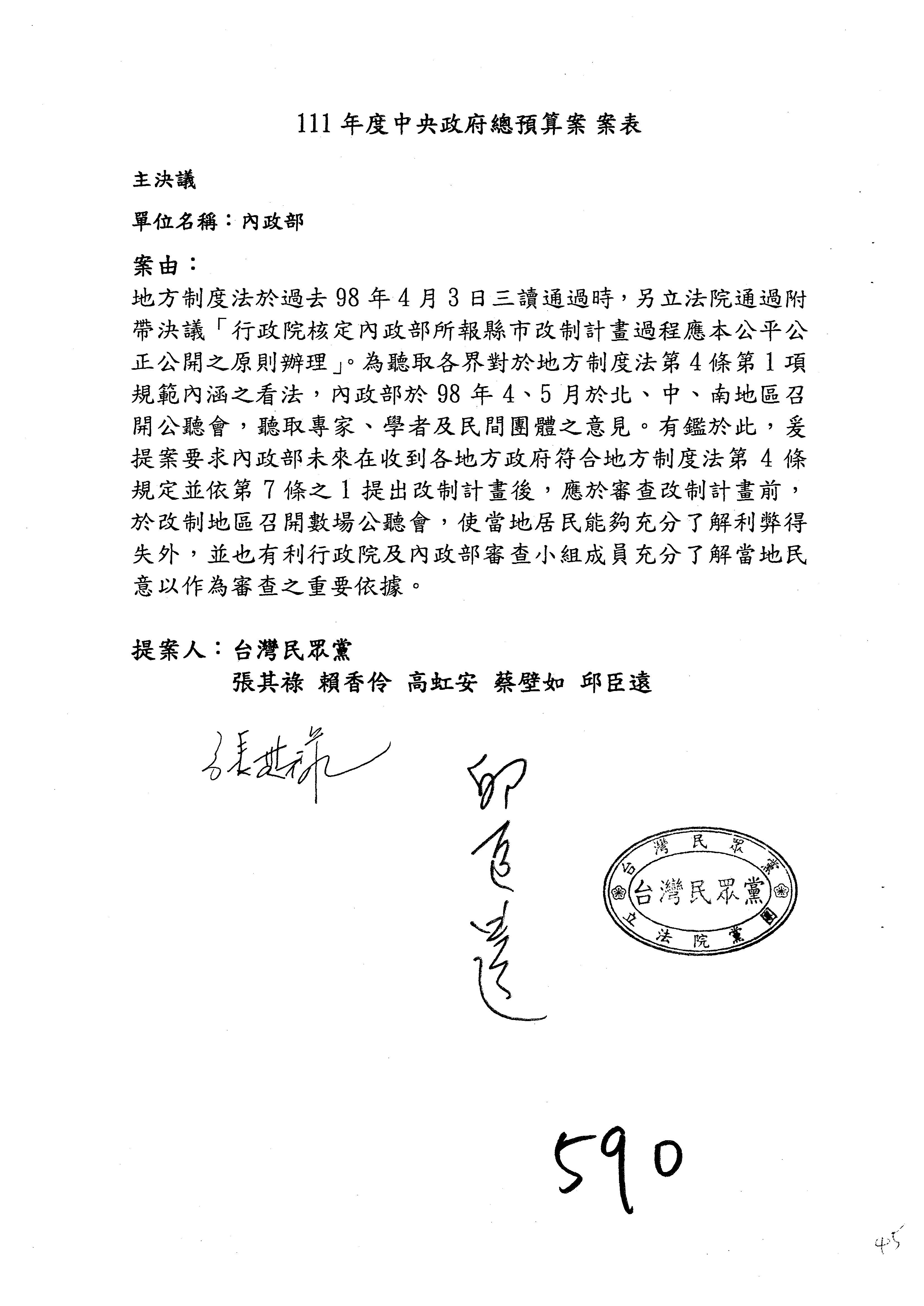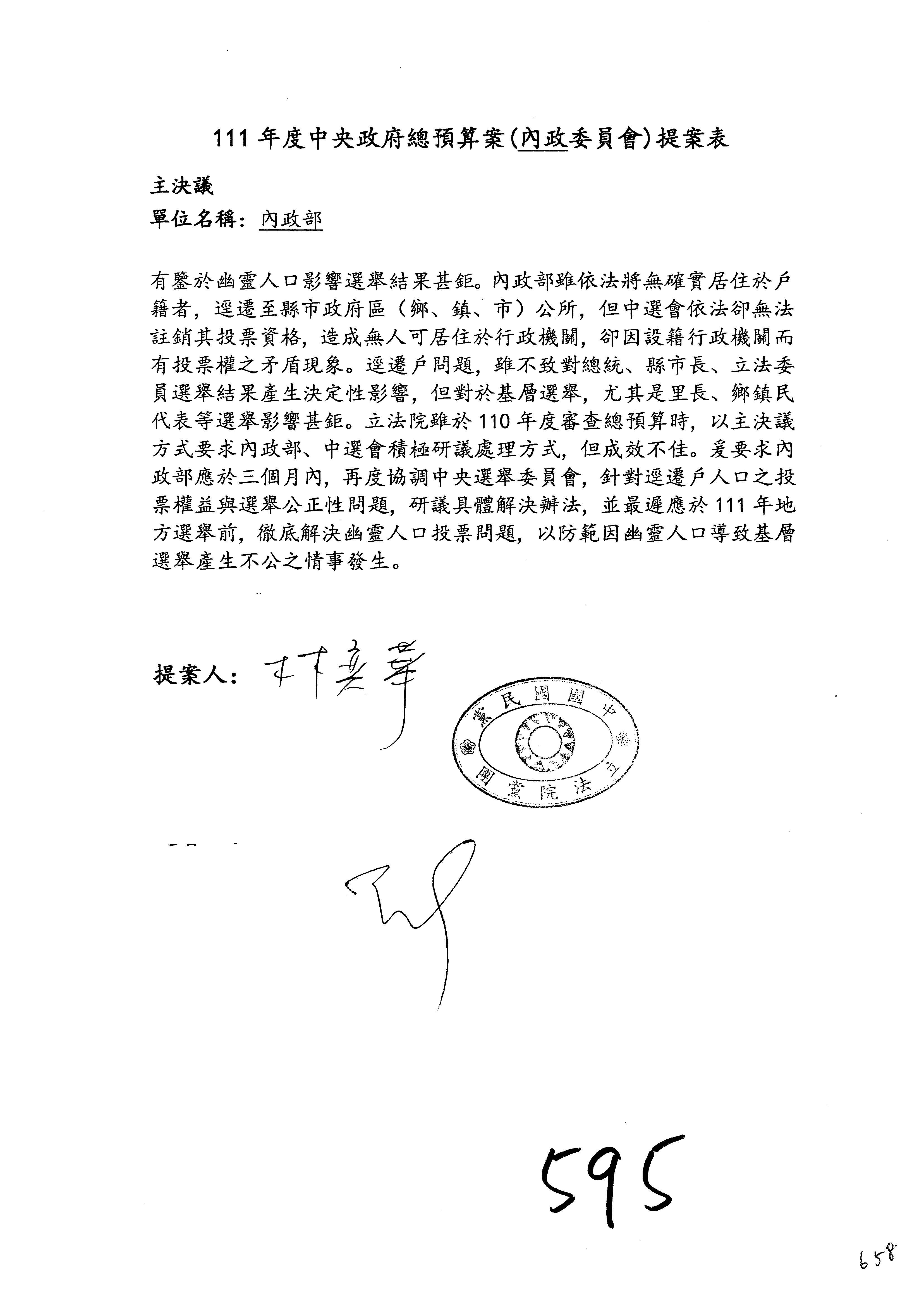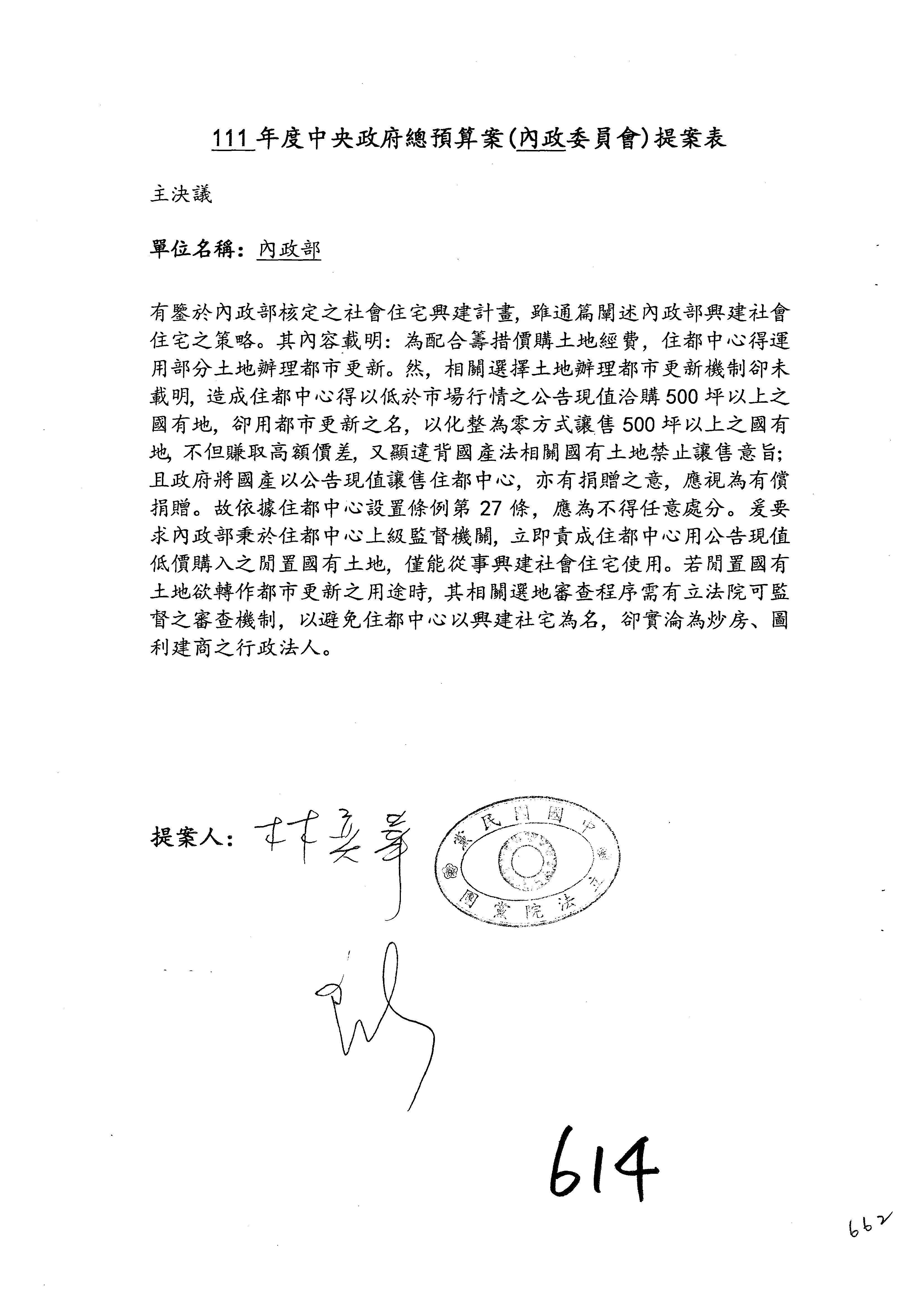 在內政部分,我們還是認為雖然這次地制法沒有直接進行修法,但我們也從臨時會的過程中,看到地制法有非常多的問題,包括未來地方制度不管是改制或者升格,這些過程不只是重視一個字的修法,必須還是要有充分民意的溝通,甚至要發揮更多由下而上的機制,才能夠更好。所以這次民眾黨在公務預算的提案裡面,也有把地制法需要經過非常充分的民意溝通跟由下而上的機制進行提案,我們也希望等一下能夠得到支持。另外,在公民電子投票連署系統部分,事實上我們的New eID已經延宕非常久,而且在各式各樣的投票中,我們都認為不論是不在籍投票或者是電子投票的方式,在我國並不是完全做不到,但在各會期中卻一再延宕,我們要求儘速上路,這也是民眾黨在內政委員會相關的提案,也希望能得到支持。