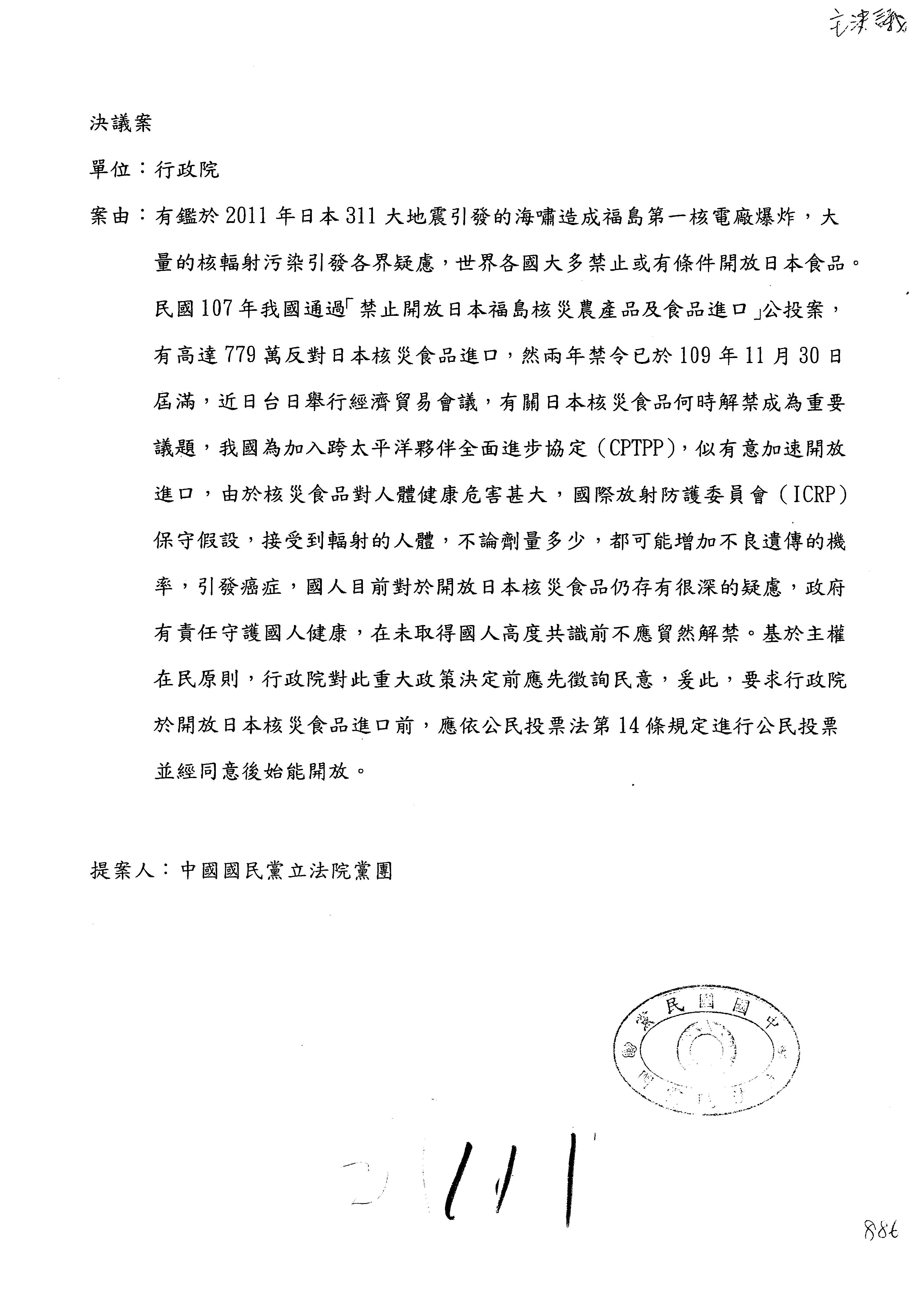 第三點、我提一個主決議,因為看到行政院要開放日本核食進來,我們國民黨籍的市議員才在前幾天吃日本千葉的沙西米,它是在禁區裡面的食品,他已經申報了,向臺北市衛生局報告,結果衛福部食藥署的把關根本不嚴格,他們的把關能力你相信嗎?我不相信,所以提出三大訴求:第一個、我們要求政府派員去日本政府各縣市採樣回來檢驗它的輻射值有沒有超標,再來講要不要開放;第二點、跟人民、在野黨對話;第三點、跟日本對話,要求它讓我們採檢,謝謝。