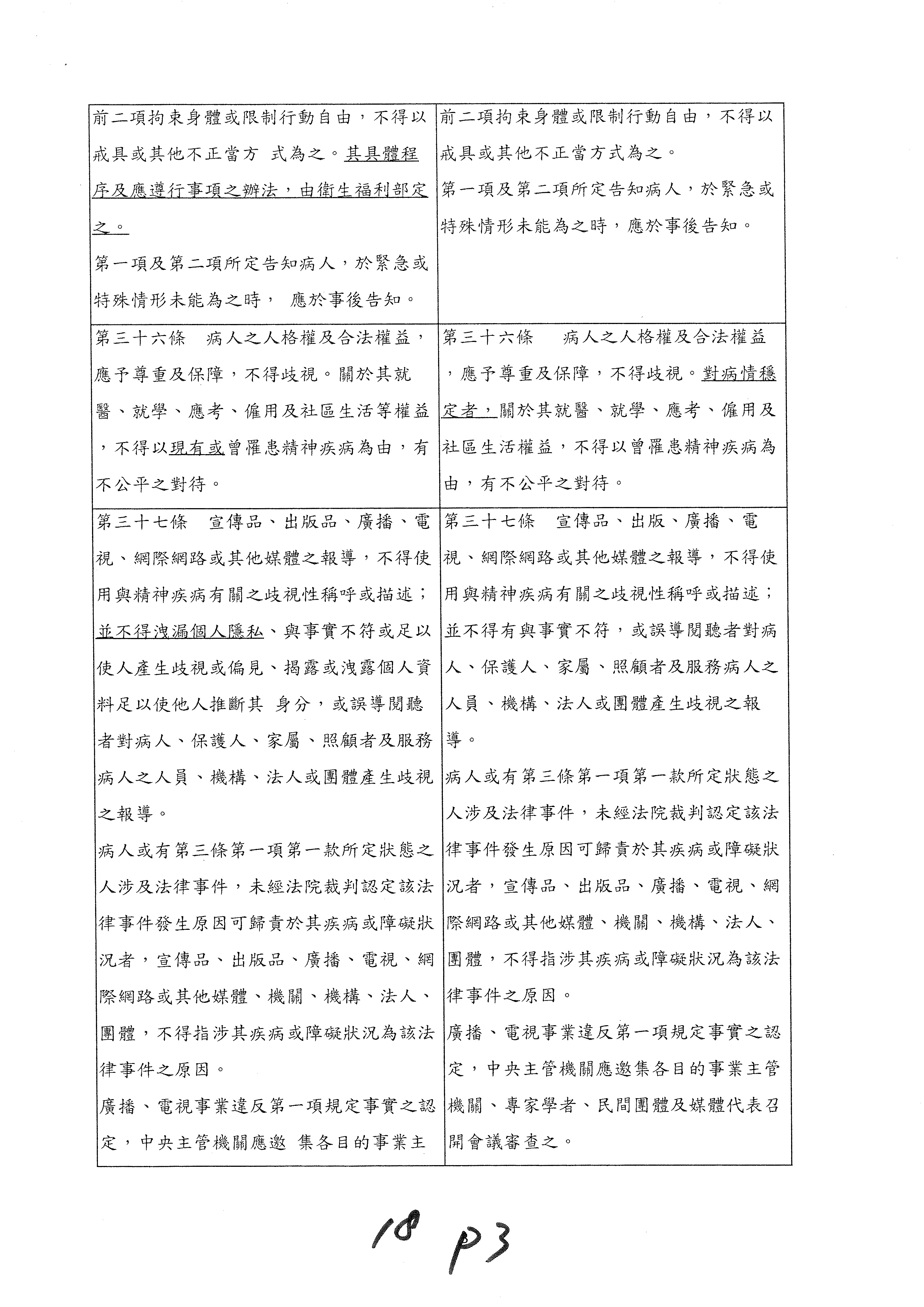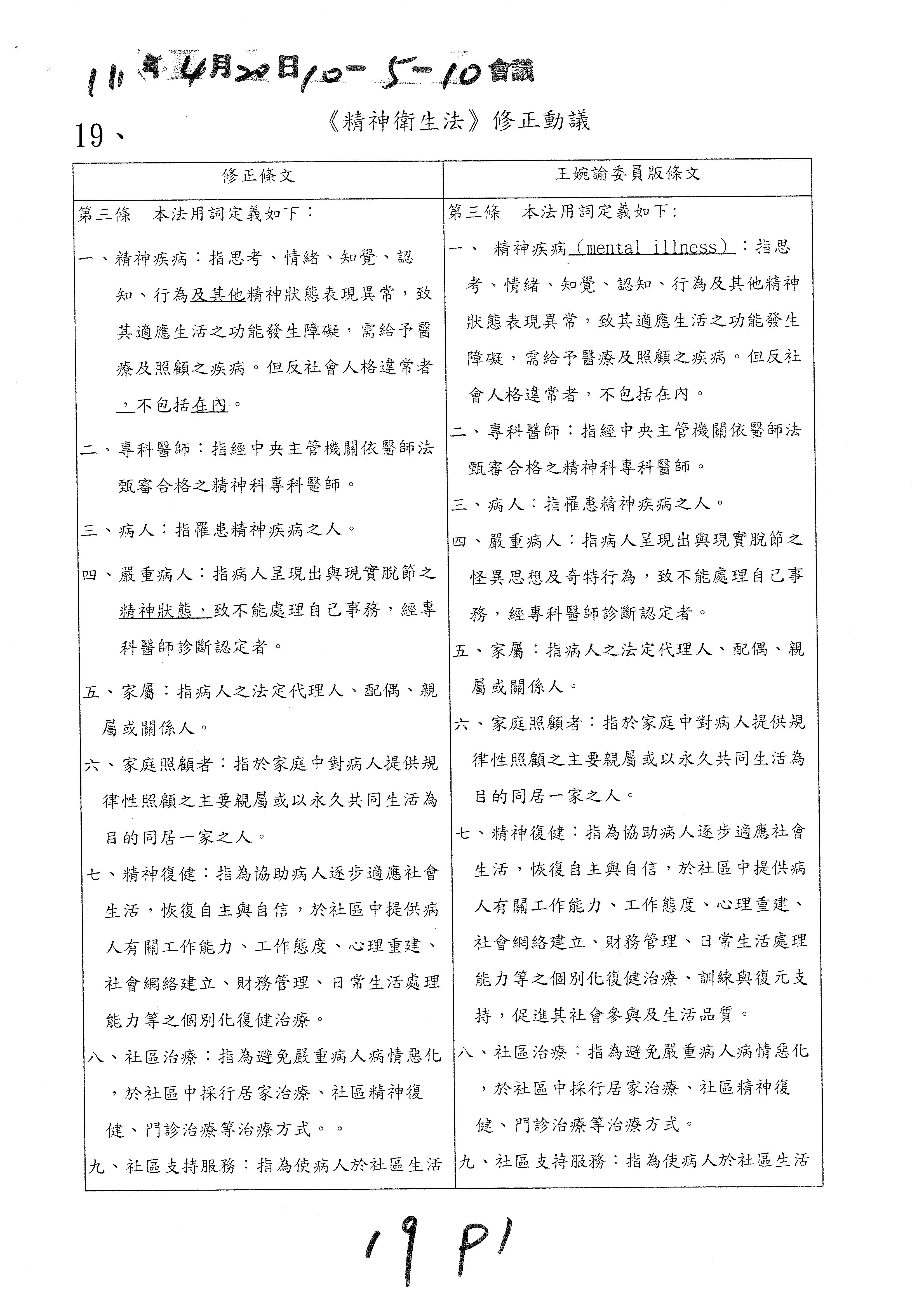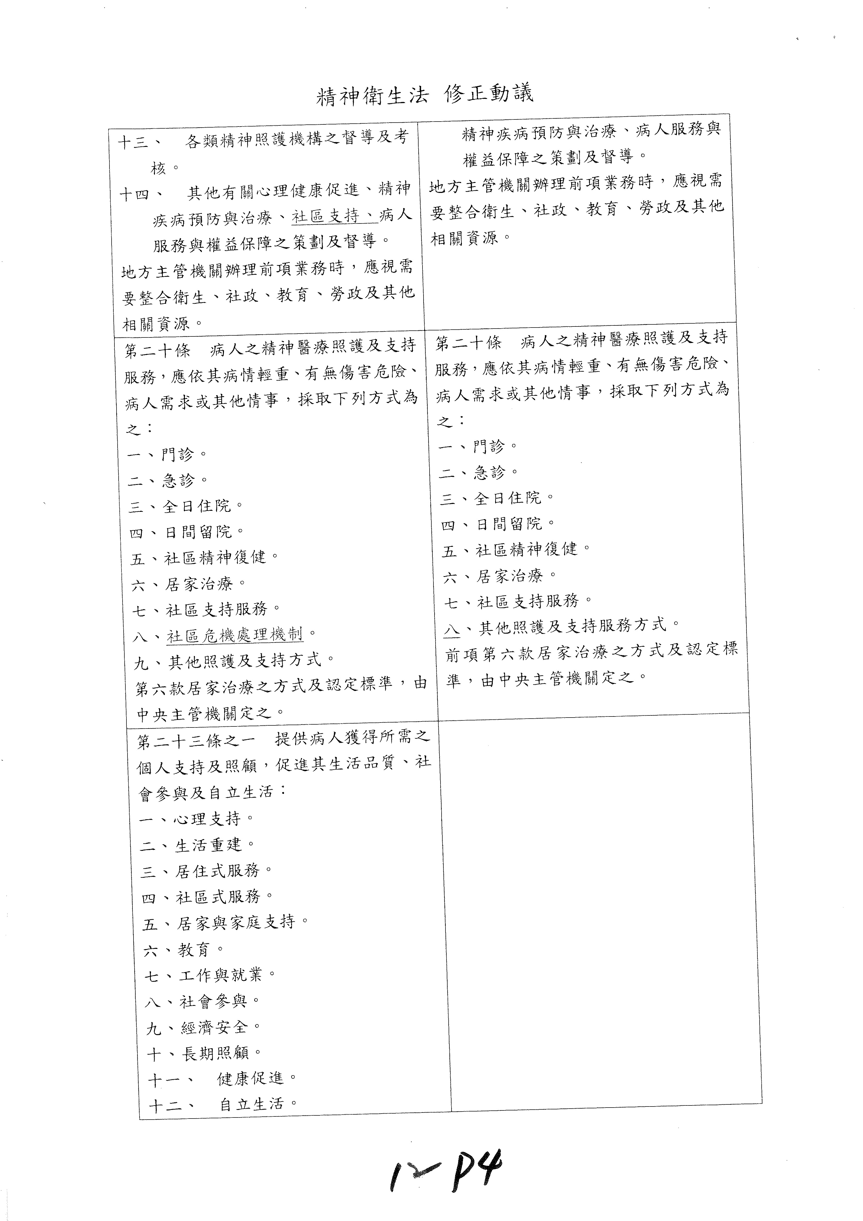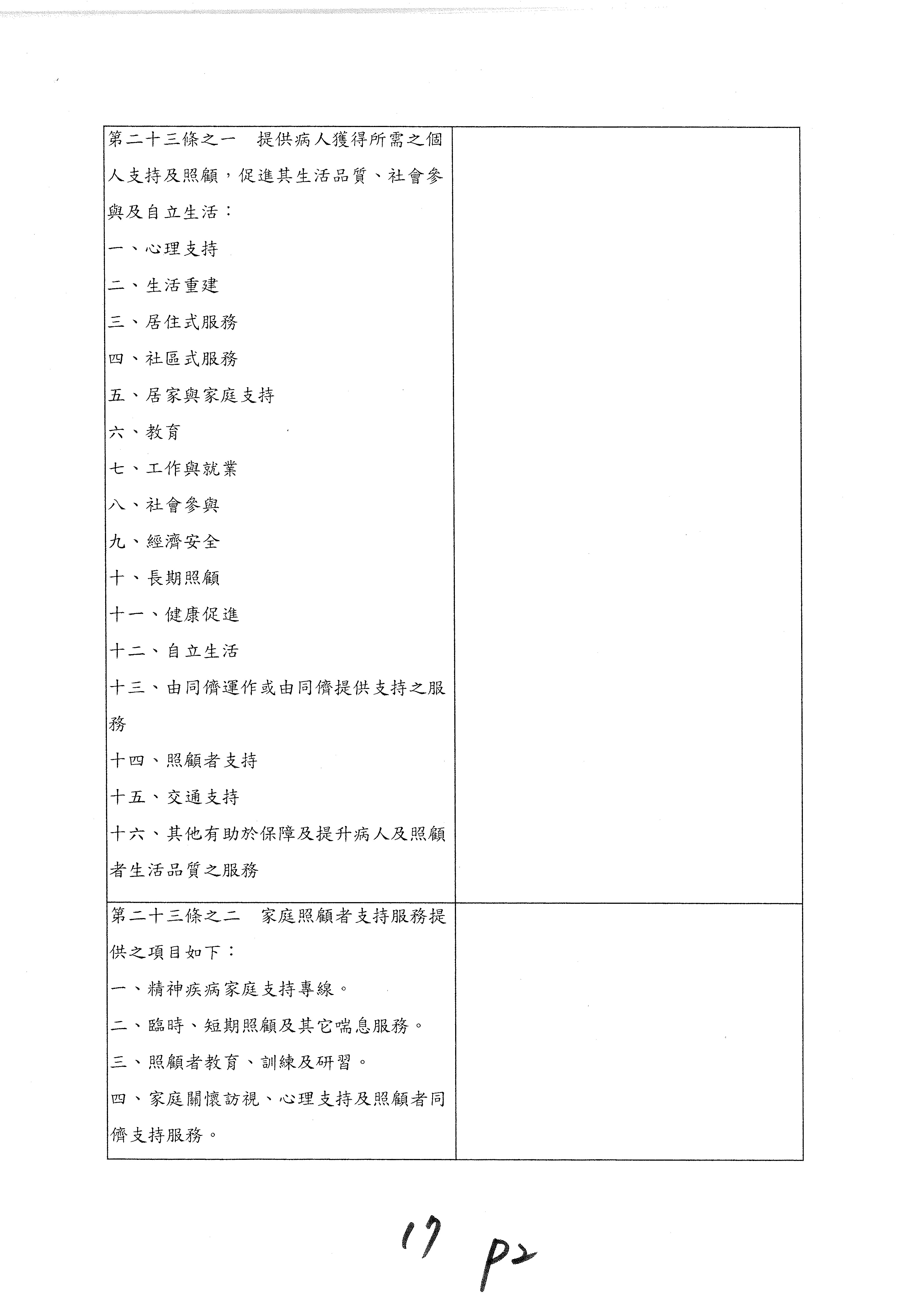 王委員婉諭:p1第一條是大方向,就是跟衛福部的版本接近,我現在的條次是第二十三條之一,就是病人應該提供到的照顧內容,當然有一個是其他,第二十三條之二就是家庭照顧者或病人家屬之類,我覺得項目可以討論,但是比較是針對旁邊的人來做處理,當然這些東西都只是指標性的款項而已,其實細節我認同吳玉琴委員的說法,應該要更細緻來討論,的確,對精神障礙者的協助上有很多不是過去身權法或長照法納入的範圍,我也是贊成吳玉琴委員的版本。
