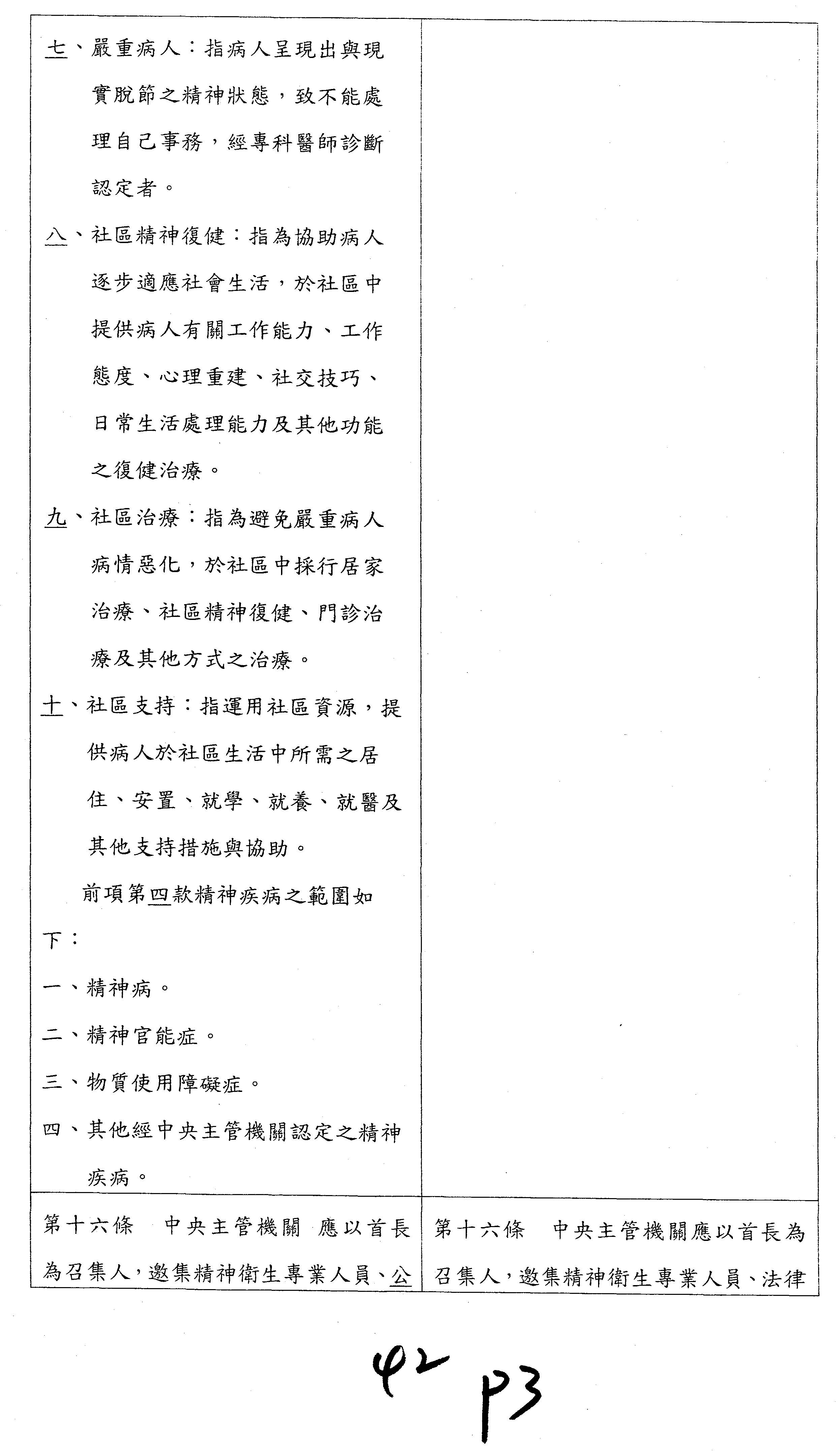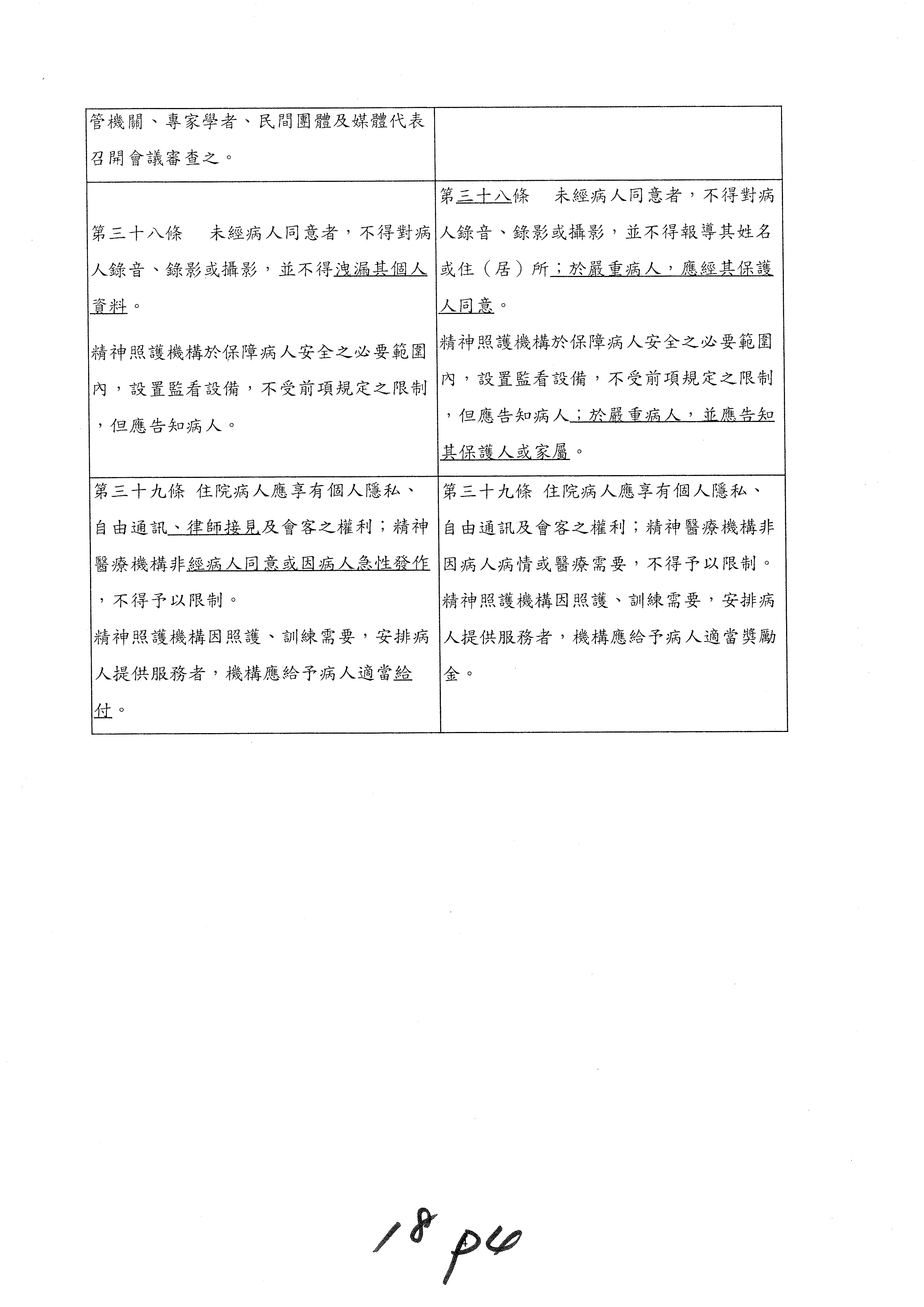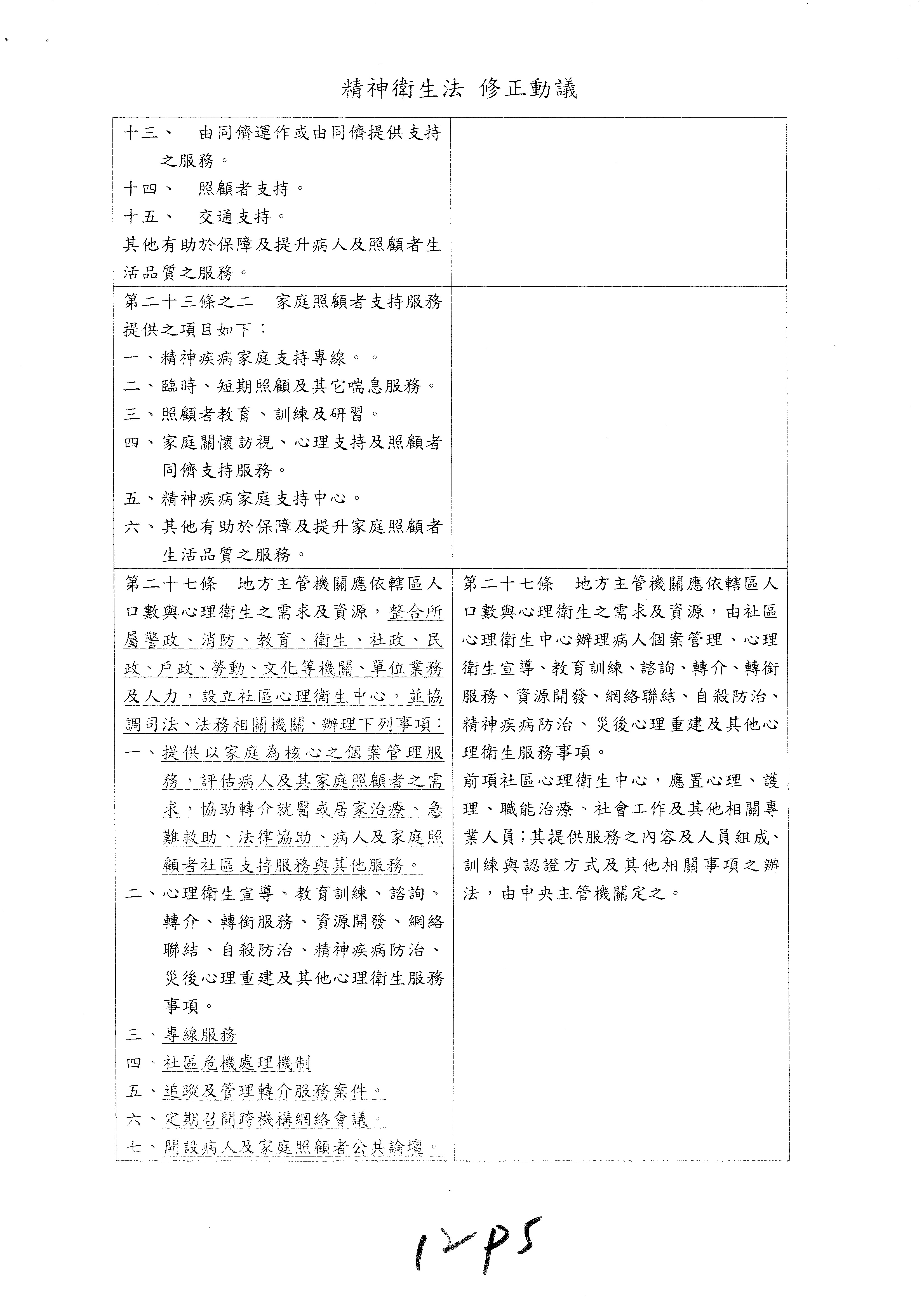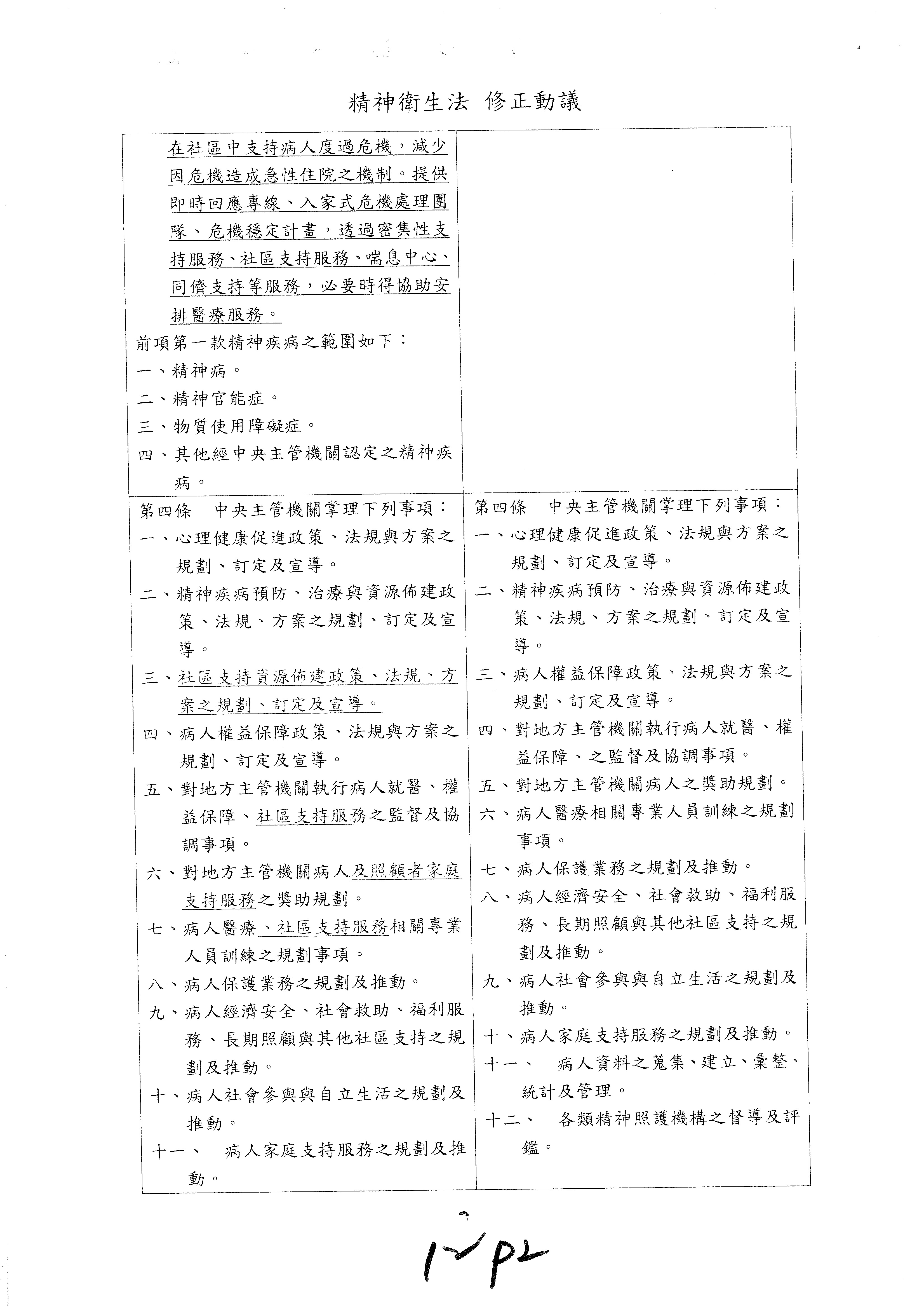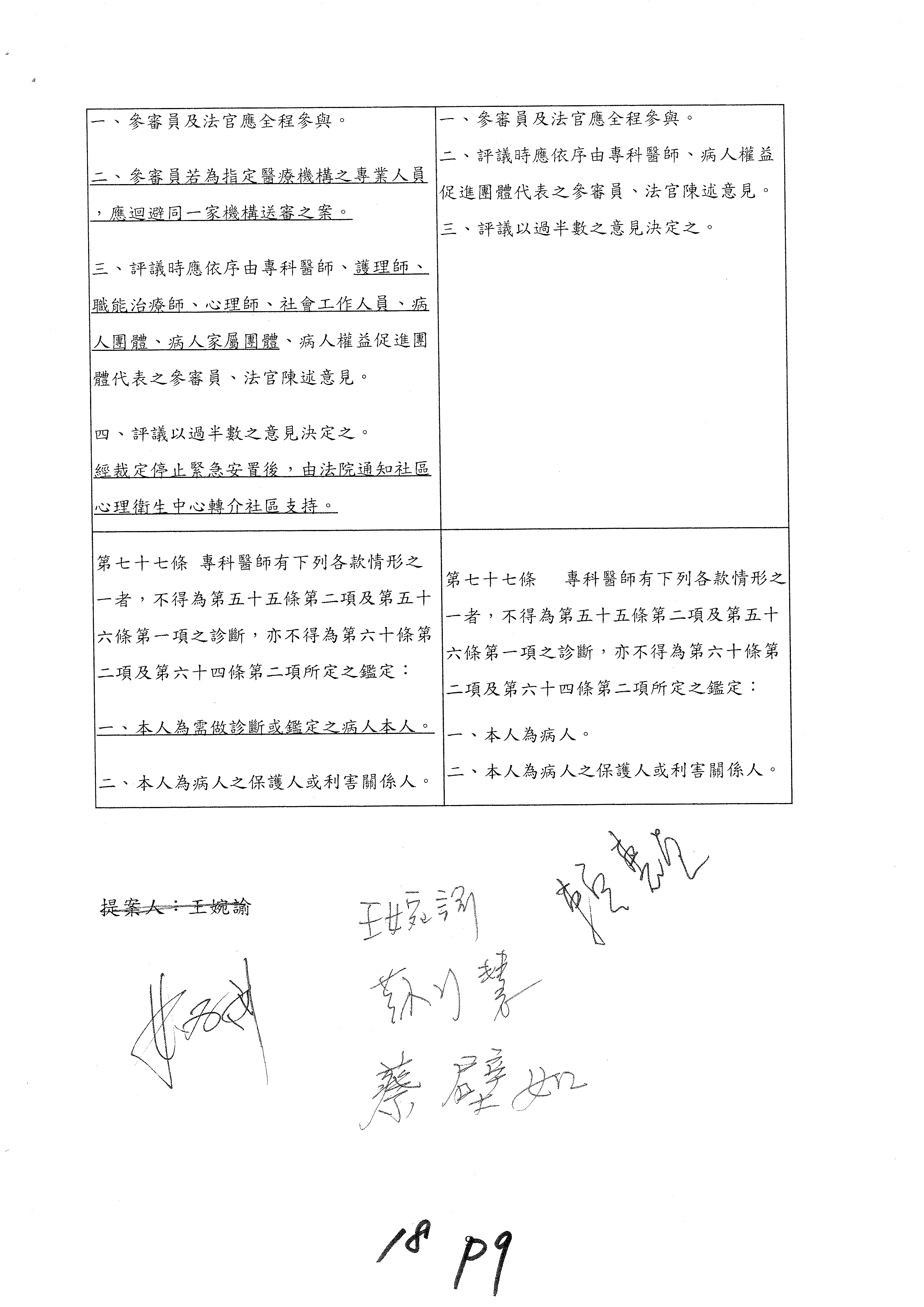 王委員婉諭:p1第一條是大方向,就是跟衛福部的版本接近,我現在的條次是第二十三條之一,就是病人應該提供到的照顧內容,當然有一個是其他,第二十三條之二就是家庭照顧者或病人家屬之類,我覺得項目可以討論,但是比較是針對旁邊的人來做處理,當然這些東西都只是指標性的款項而已,其實細節我認同吳玉琴委員的說法,應該要更細緻來討論,的確,對精神障礙者的協助上有很多不是過去身權法或長照法納入的範圍,我也是贊成吳玉琴委員的版本。