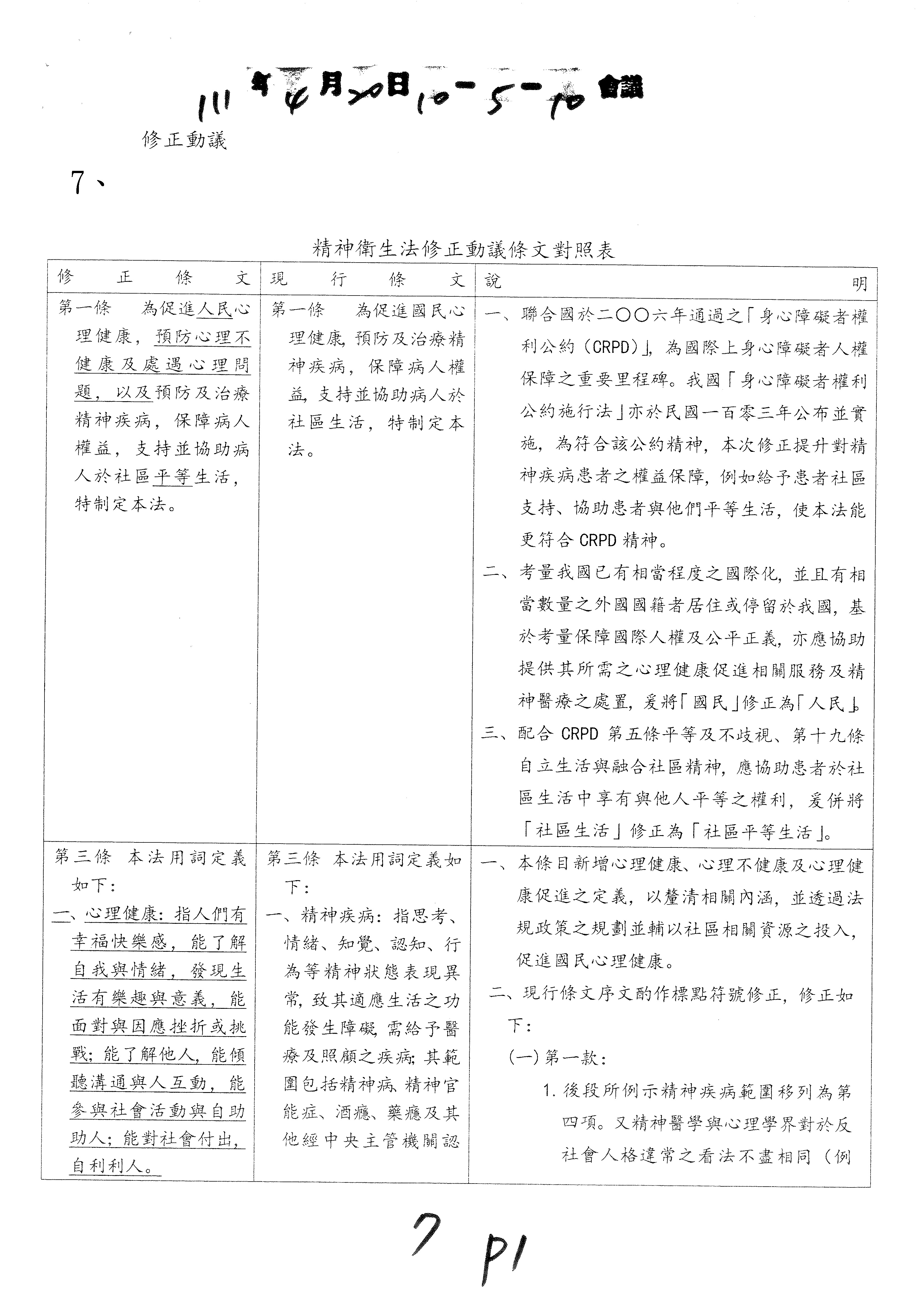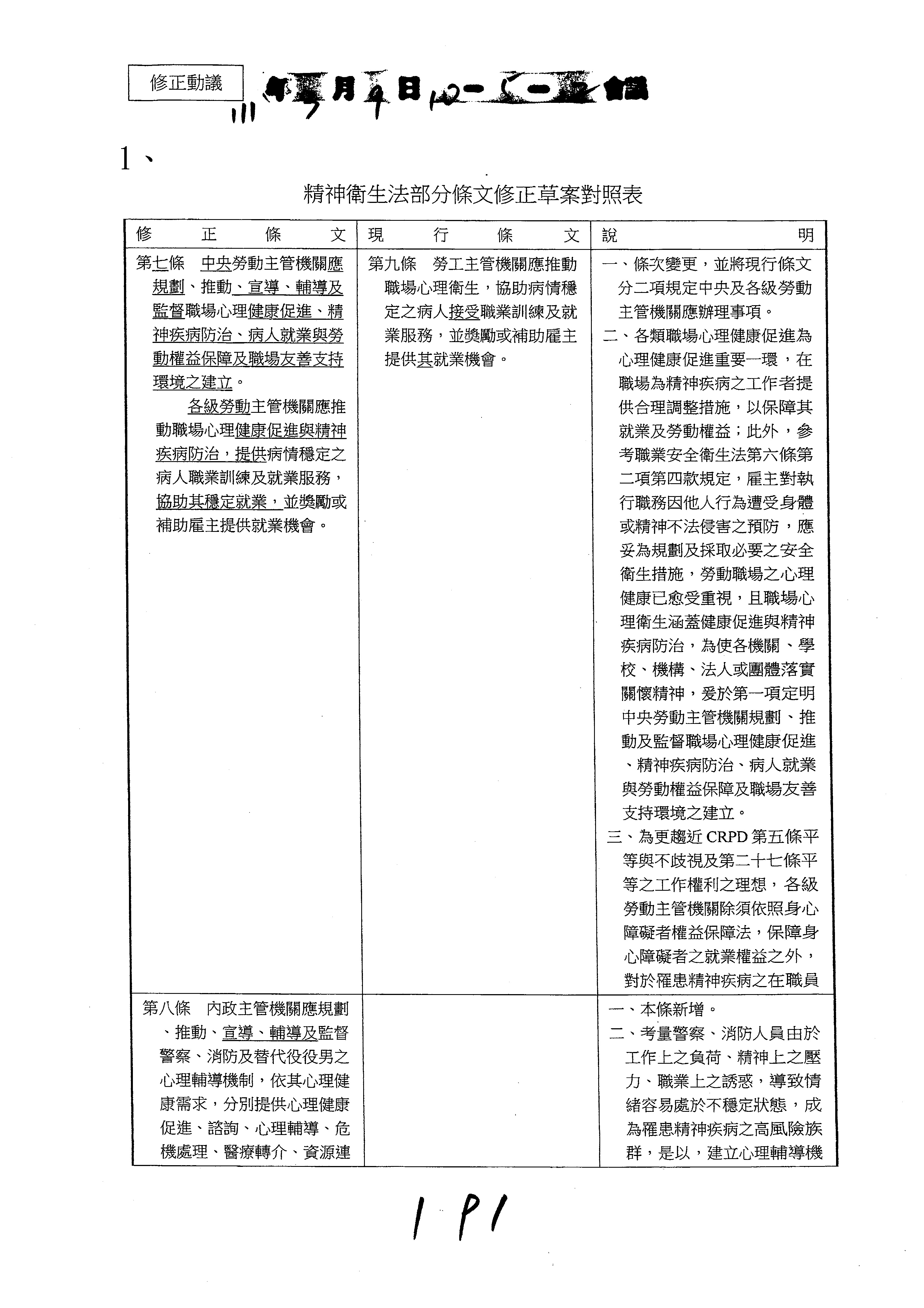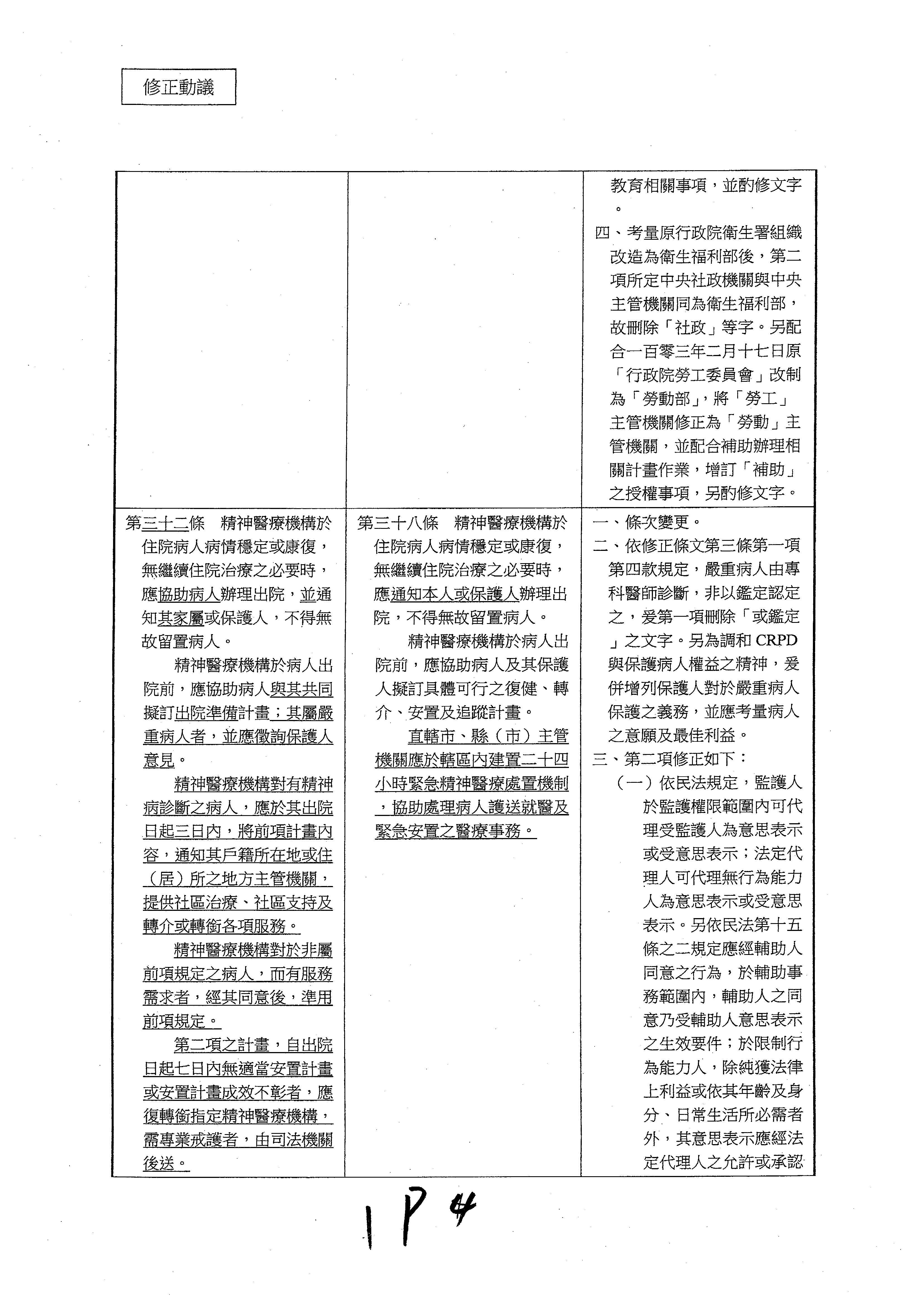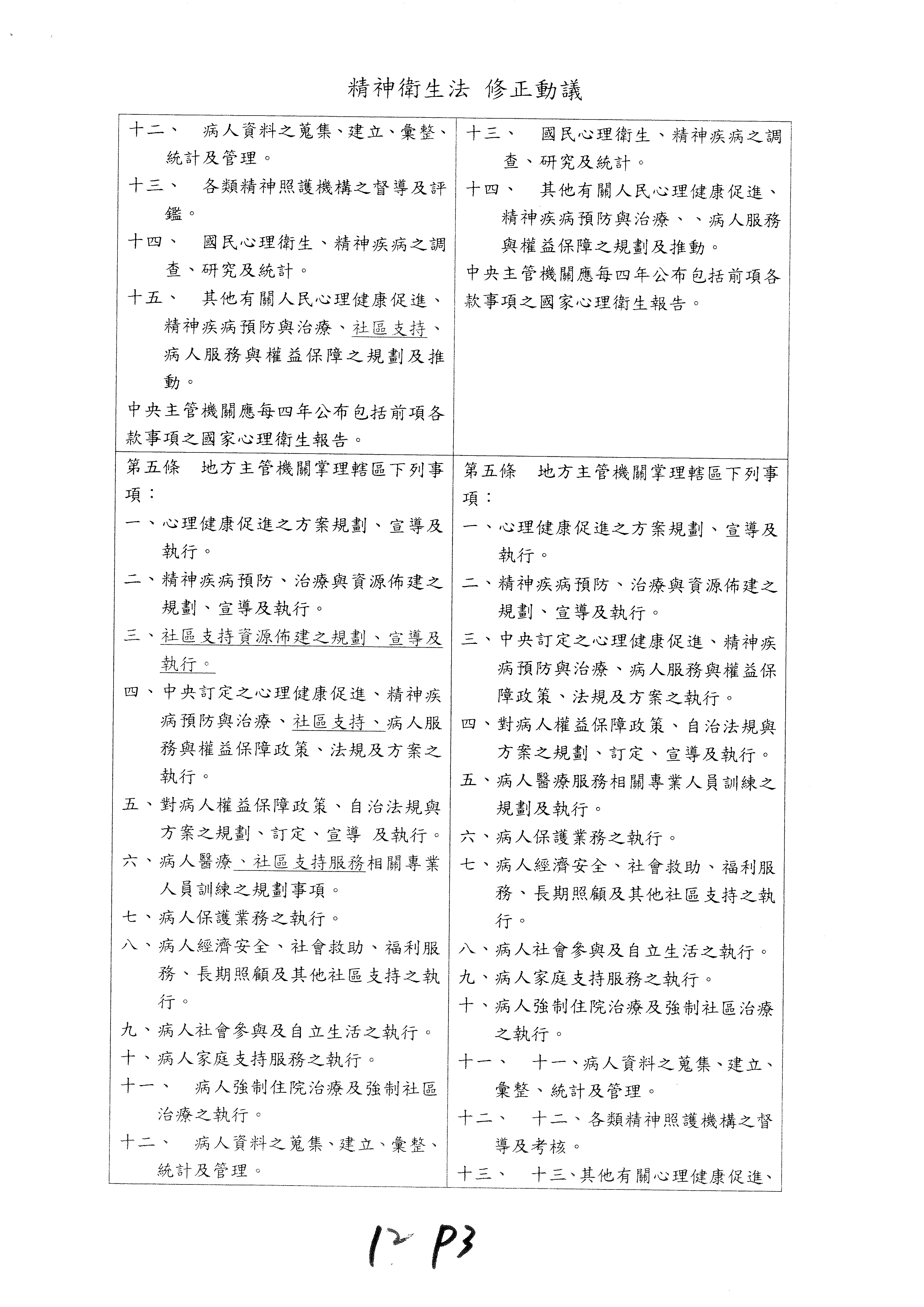 王委員婉諭:p1第一條是大方向,就是跟衛福部的版本接近,我現在的條次是第二十三條之一,就是病人應該提供到的照顧內容,當然有一個是其他,第二十三條之二就是家庭照顧者或病人家屬之類,我覺得項目可以討論,但是比較是針對旁邊的人來做處理,當然這些東西都只是指標性的款項而已,其實細節我認同吳玉琴委員的說法,應該要更細緻來討論,的確,對精神障礙者的協助上有很多不是過去身權法或長照法納入的範圍,我也是贊成吳玉琴委員的版本。
