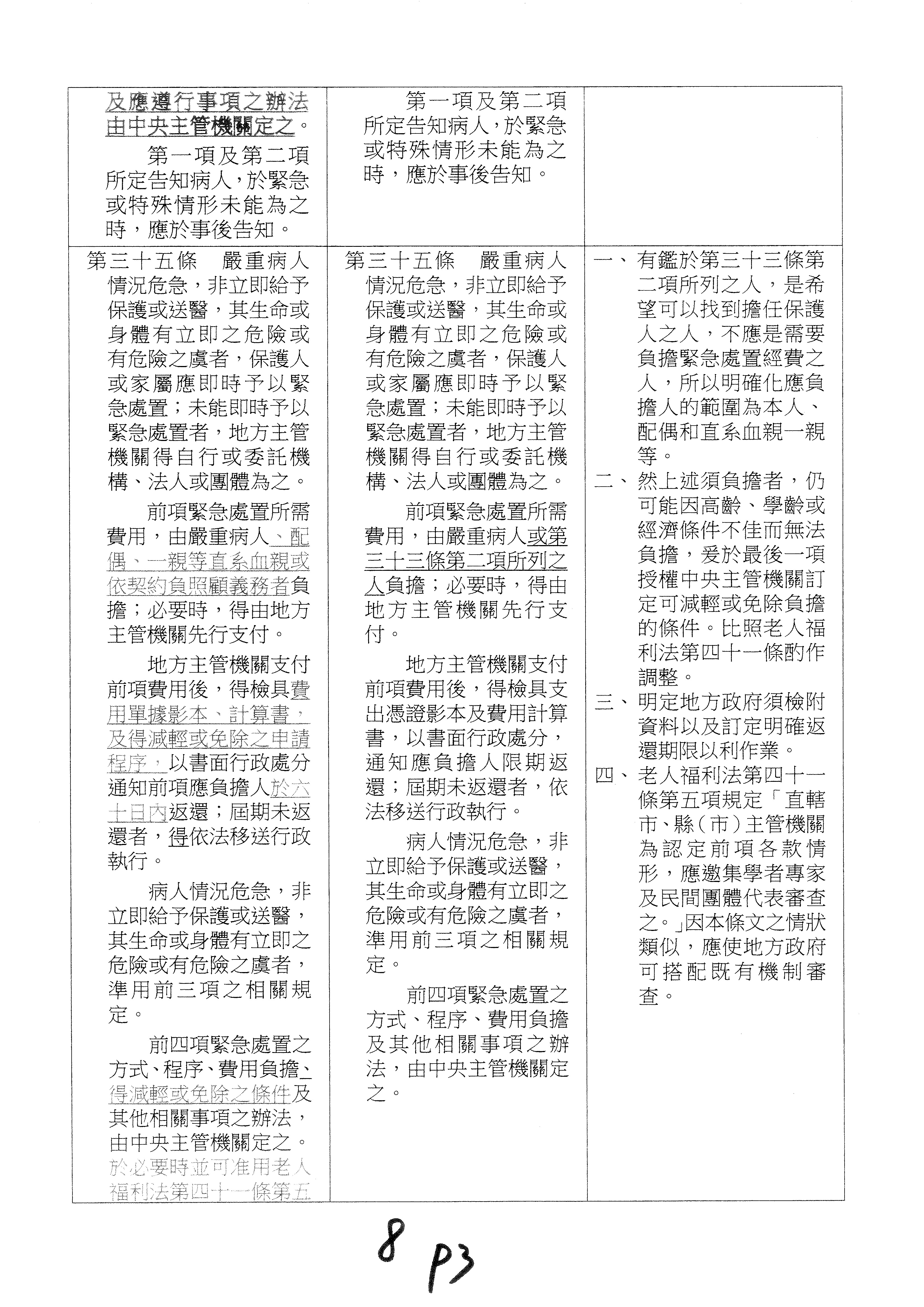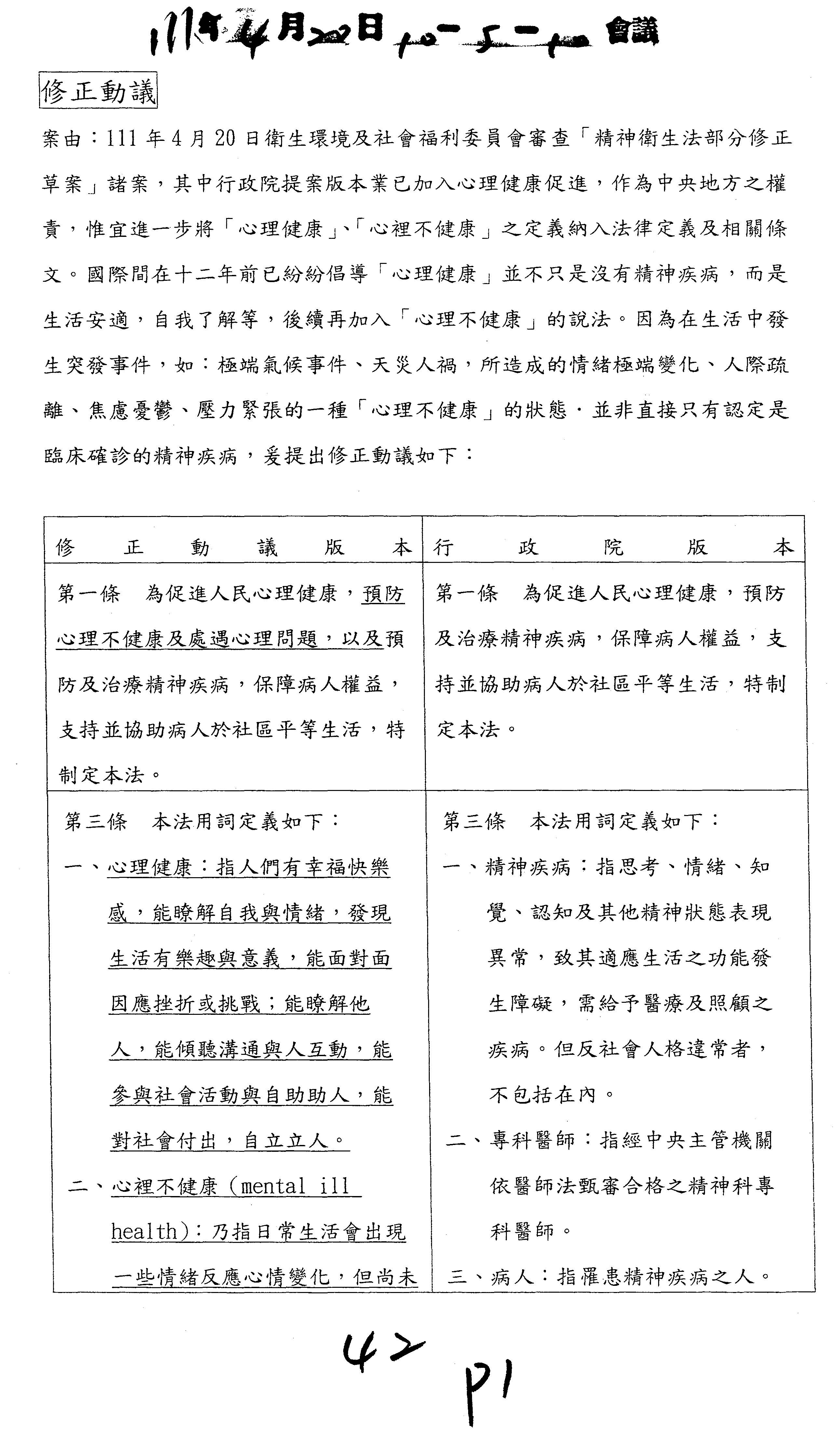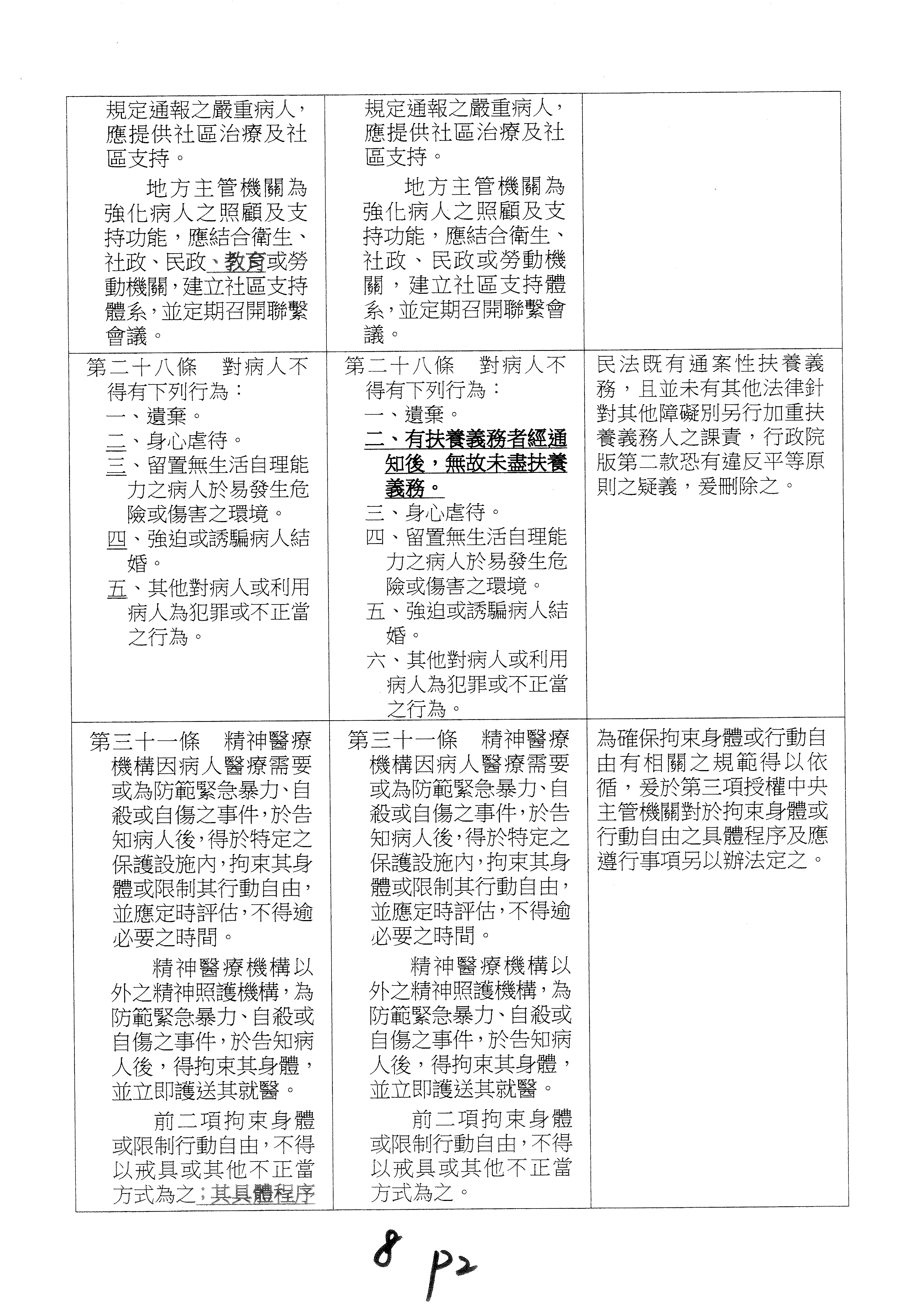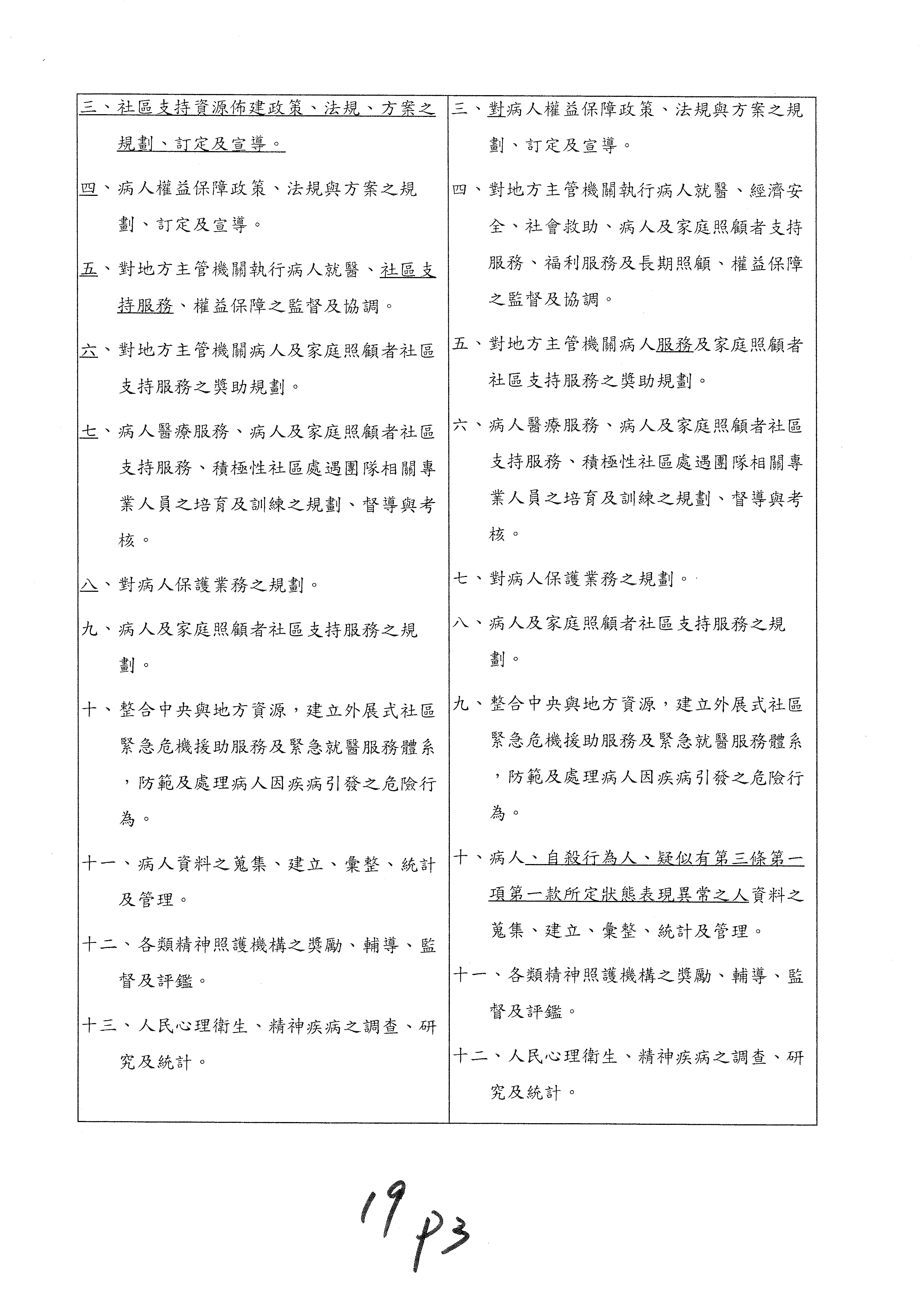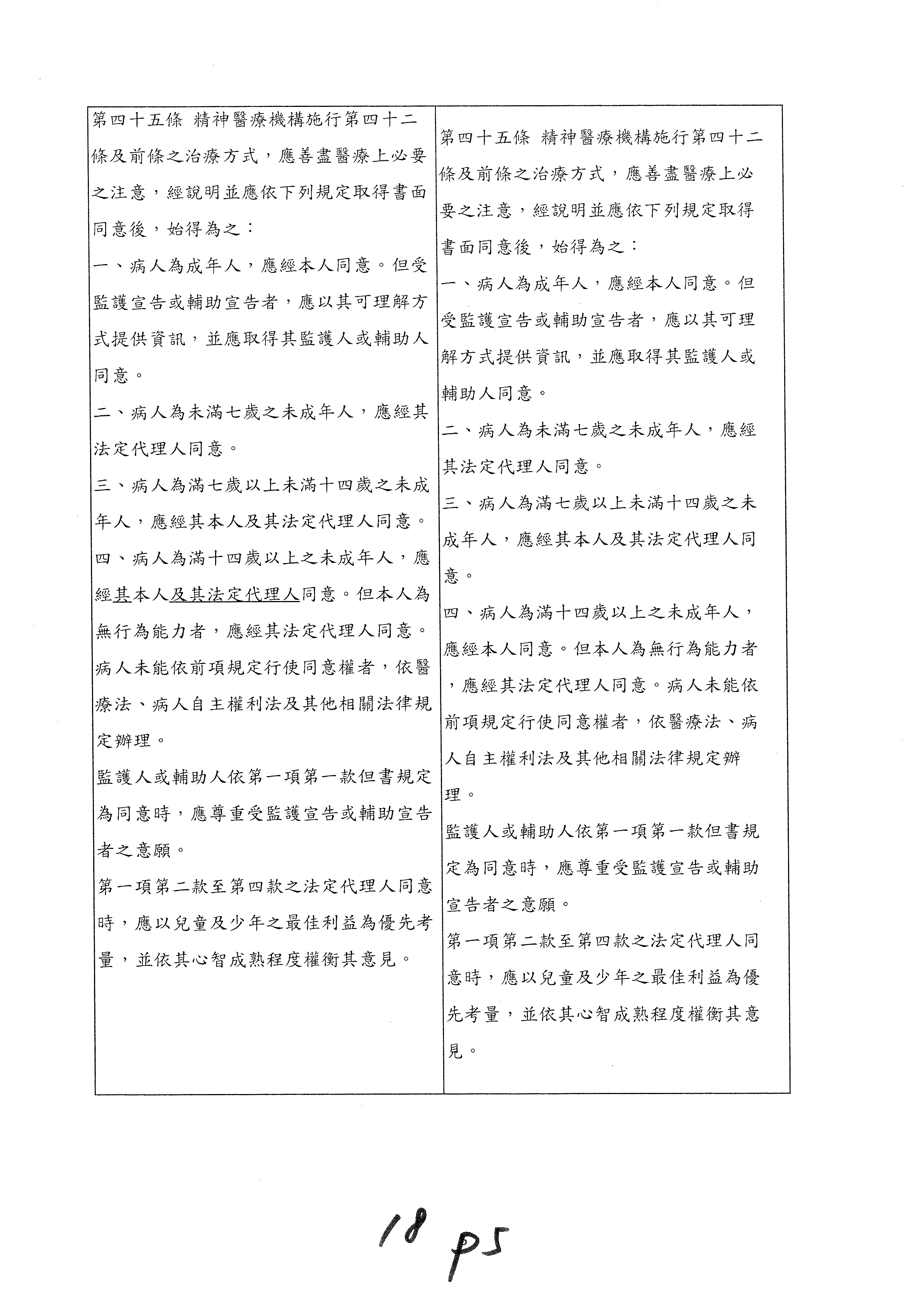 王委員婉諭:p1第一條是大方向,就是跟衛福部的版本接近,我現在的條次是第二十三條之一,就是病人應該提供到的照顧內容,當然有一個是其他,第二十三條之二就是家庭照顧者或病人家屬之類,我覺得項目可以討論,但是比較是針對旁邊的人來做處理,當然這些東西都只是指標性的款項而已,其實細節我認同吳玉琴委員的說法,應該要更細緻來討論,的確,對精神障礙者的協助上有很多不是過去身權法或長照法納入的範圍,我也是贊成吳玉琴委員的版本。