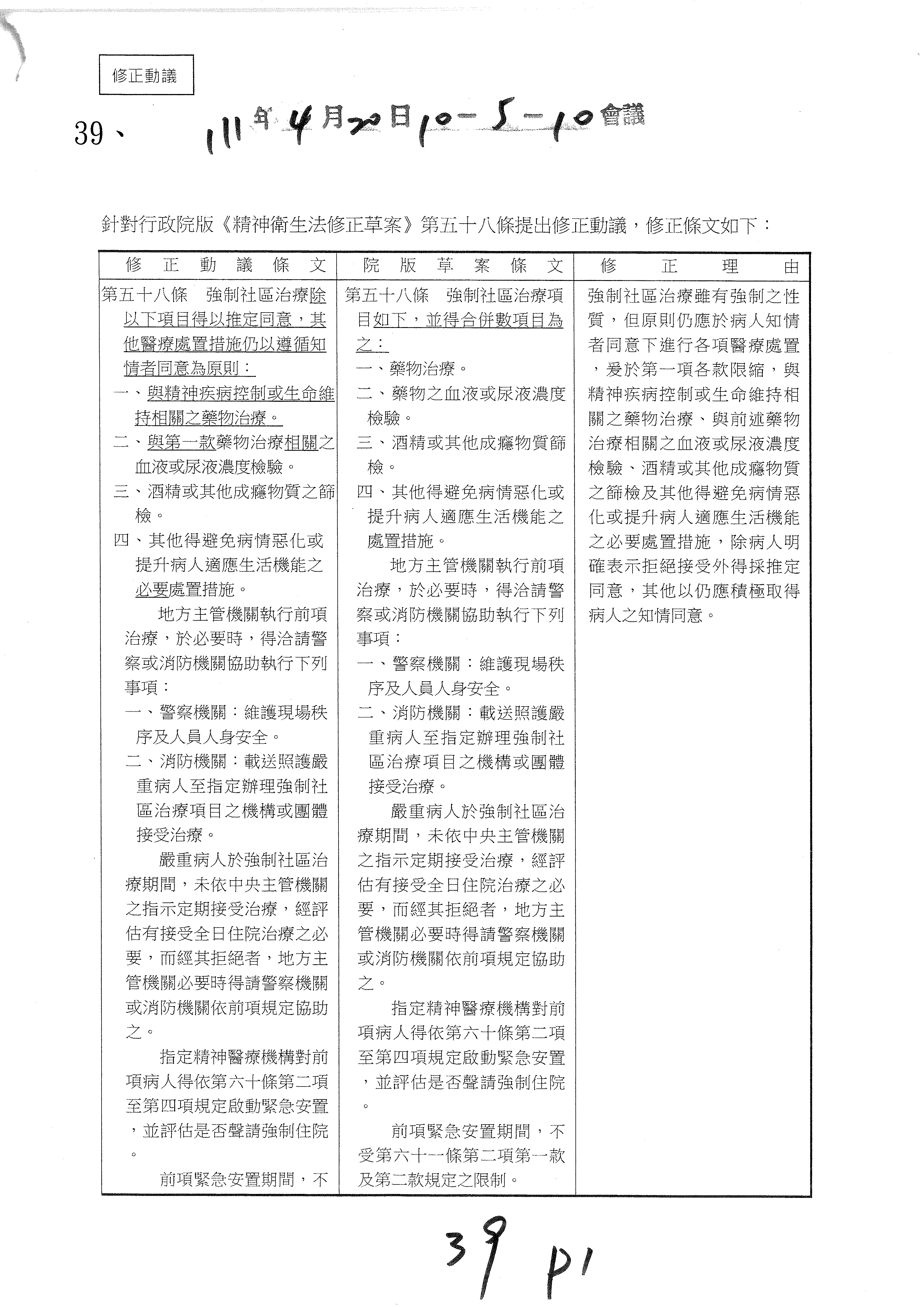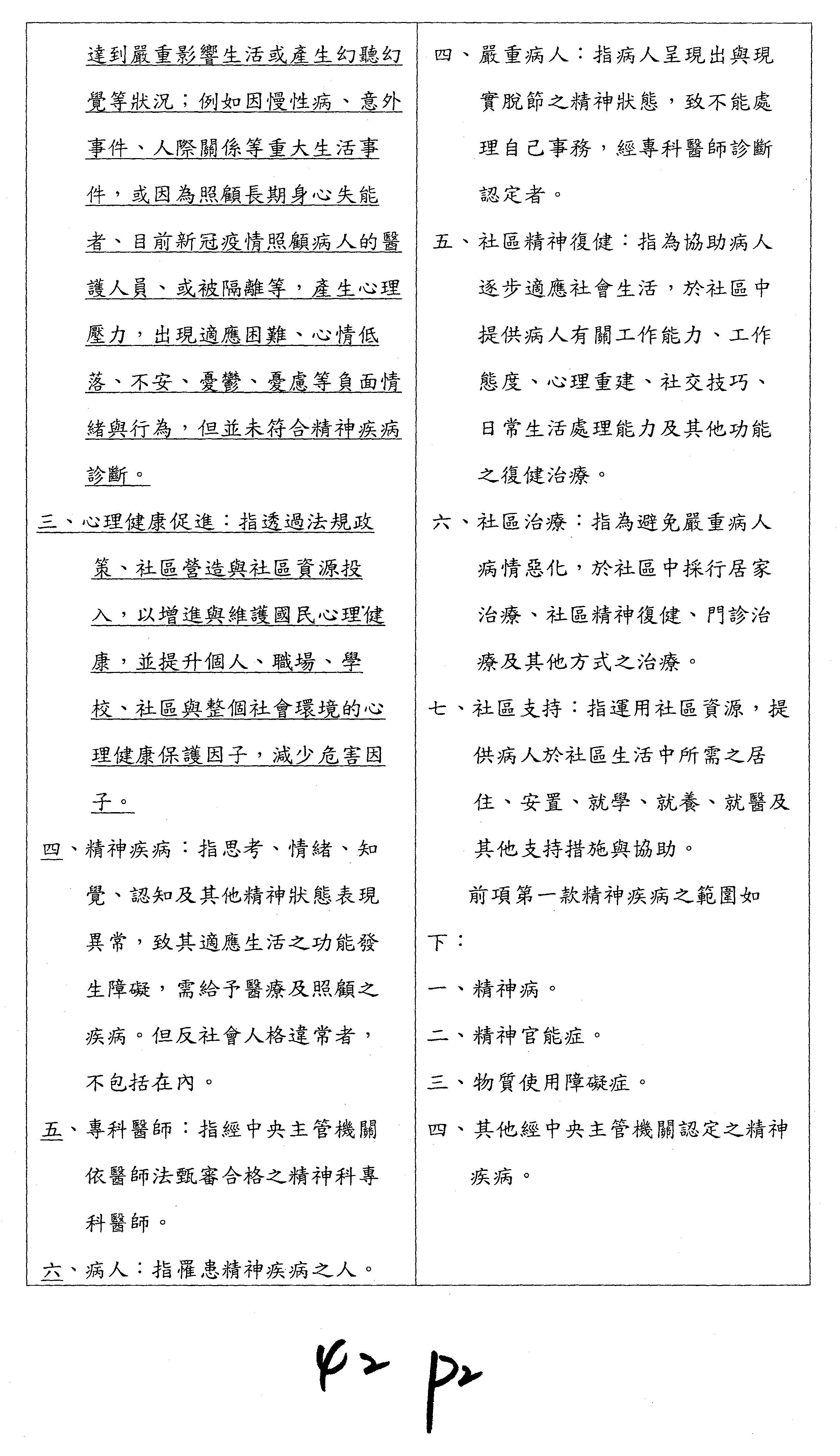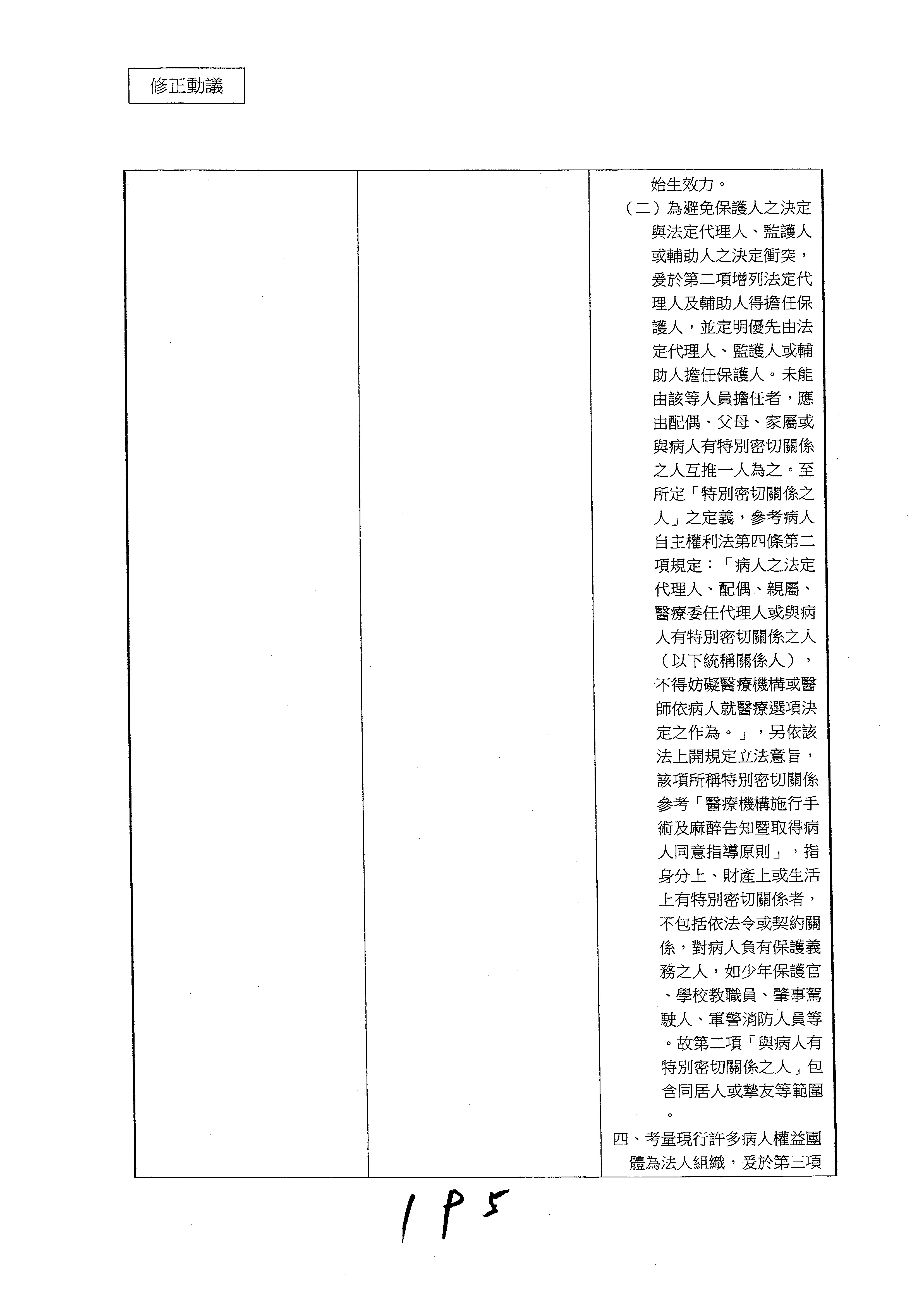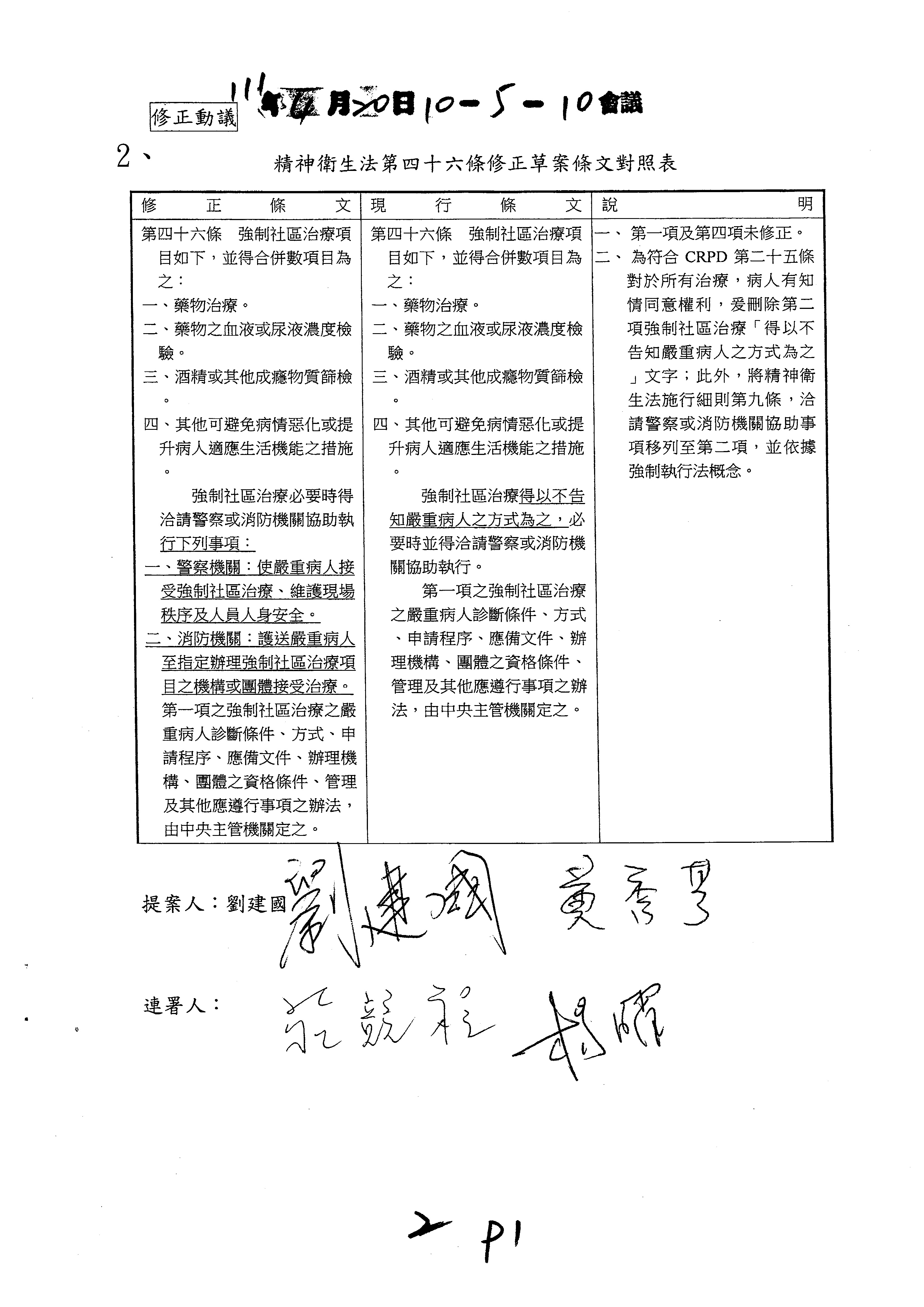 王委員婉諭:p1第一條是大方向,就是跟衛福部的版本接近,我現在的條次是第二十三條之一,就是病人應該提供到的照顧內容,當然有一個是其他,第二十三條之二就是家庭照顧者或病人家屬之類,我覺得項目可以討論,但是比較是針對旁邊的人來做處理,當然這些東西都只是指標性的款項而已,其實細節我認同吳玉琴委員的說法,應該要更細緻來討論,的確,對精神障礙者的協助上有很多不是過去身權法或長照法納入的範圍,我也是贊成吳玉琴委員的版本。