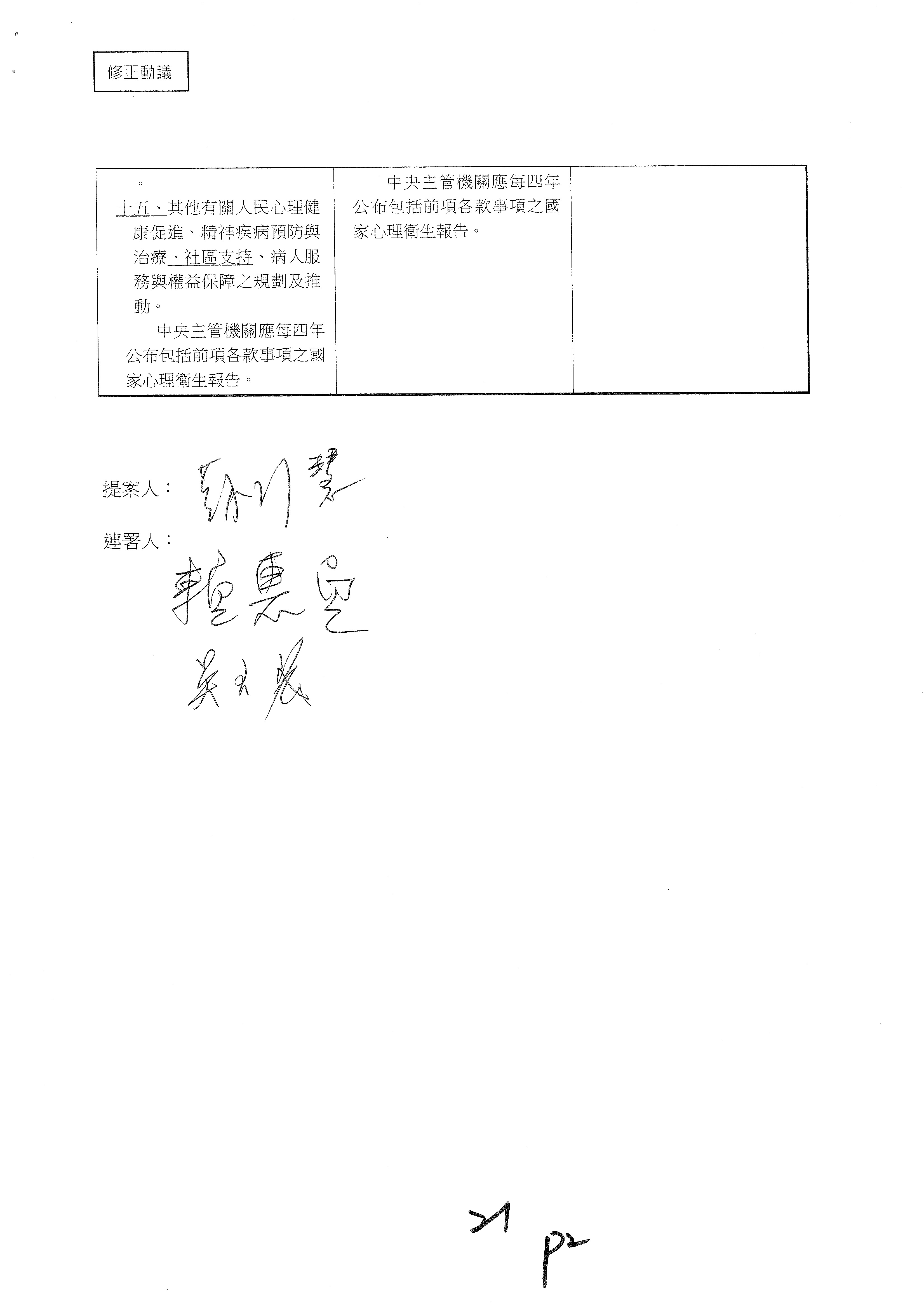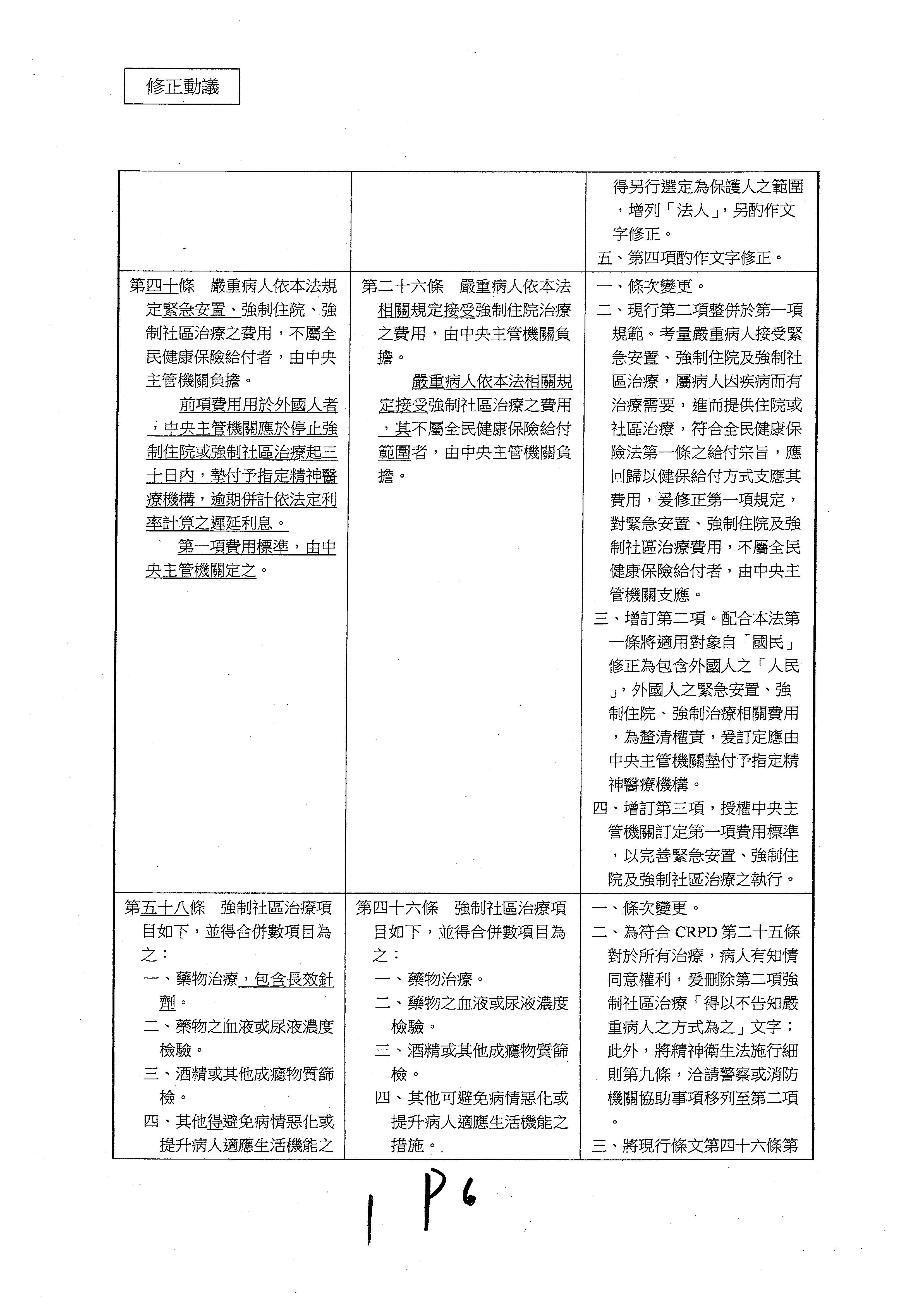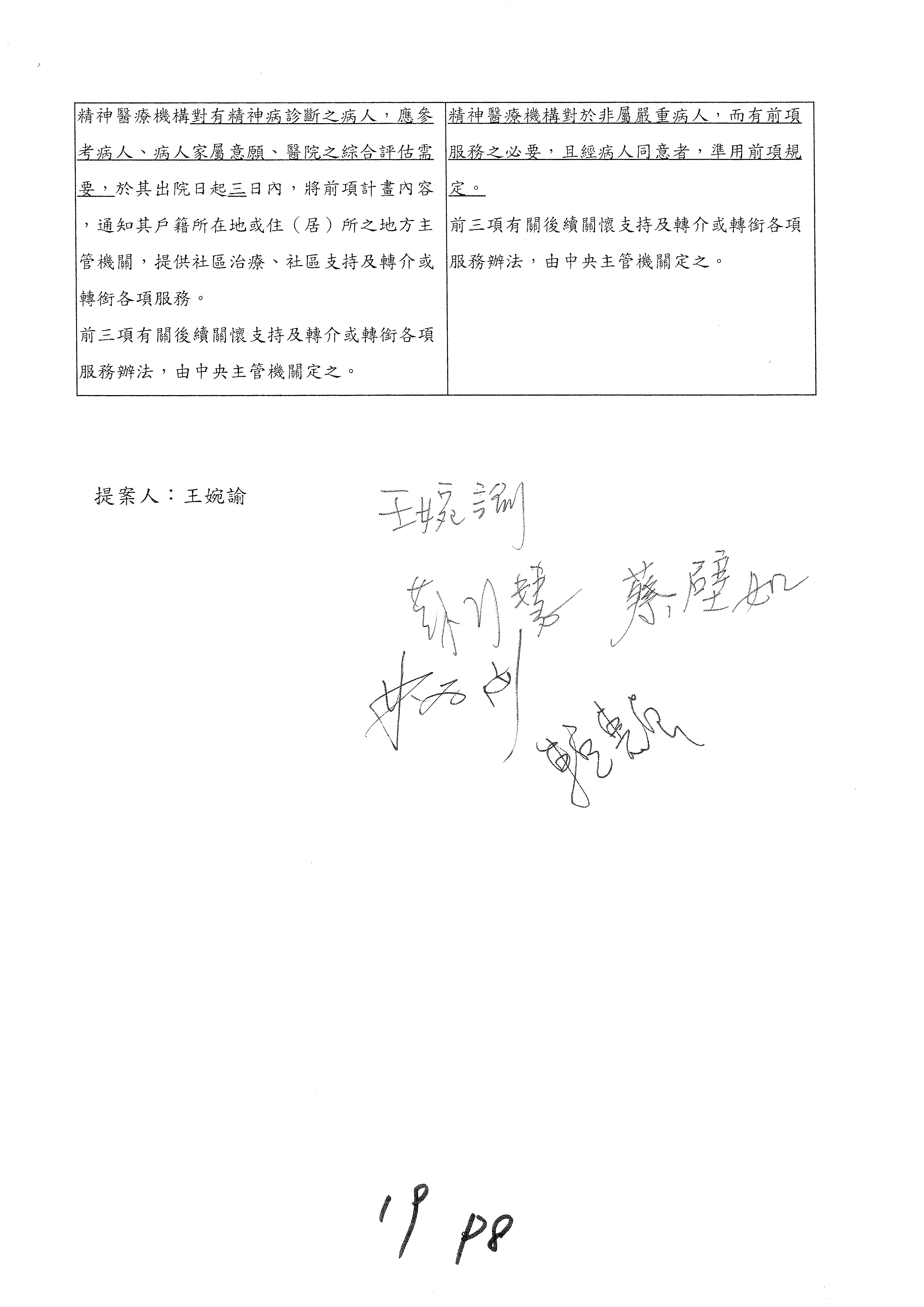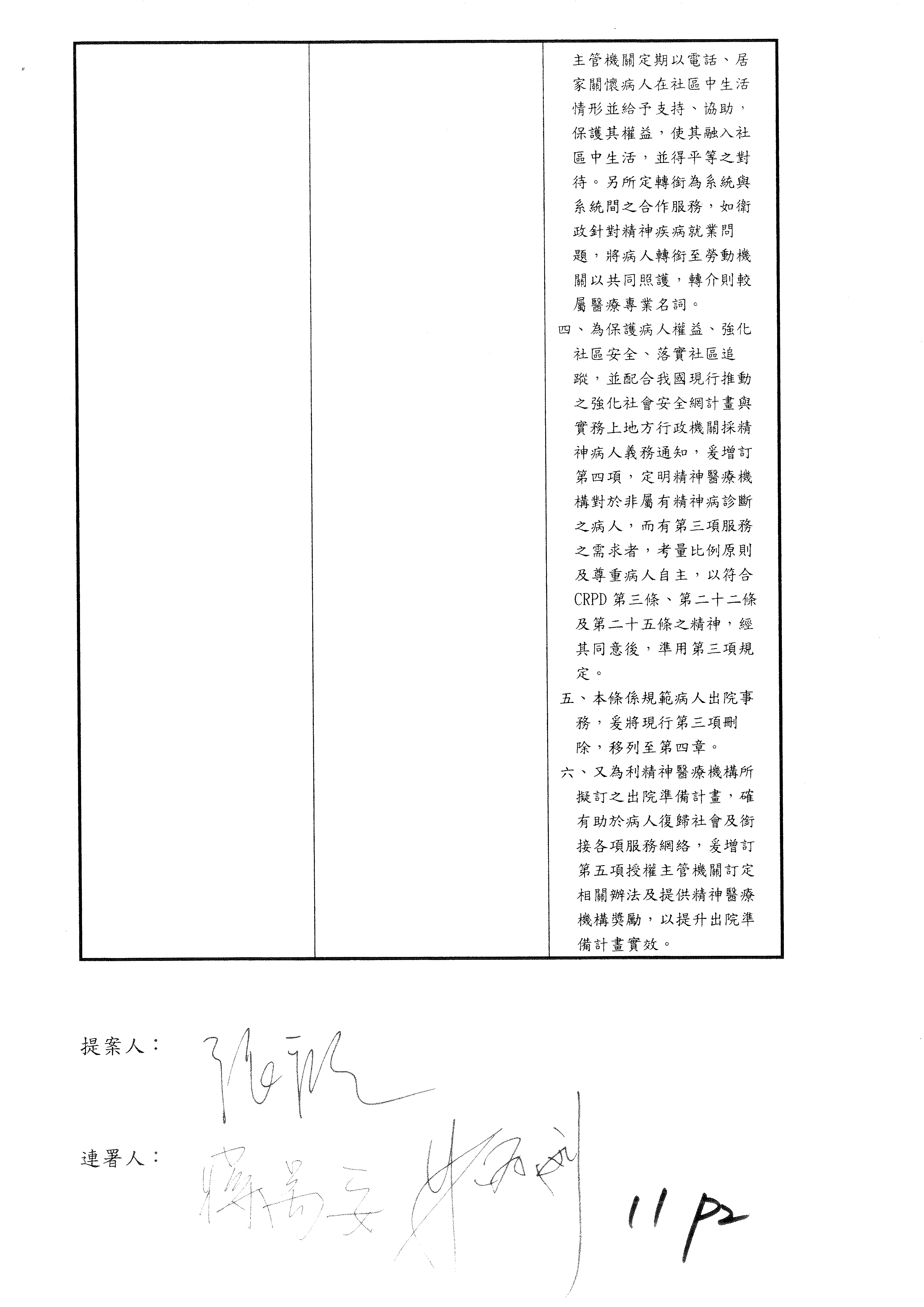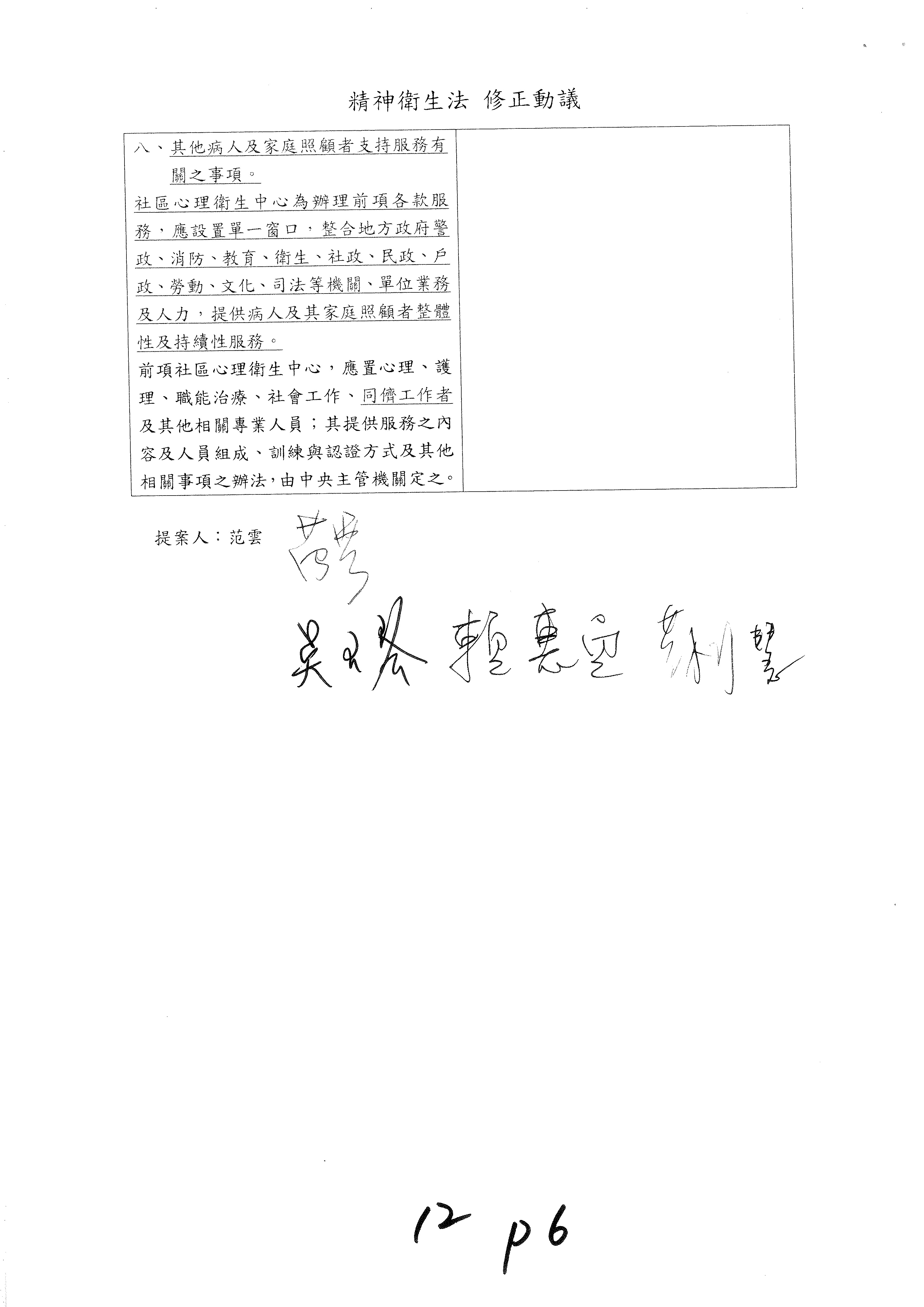范委員雲:我想我們大家的方向都是一致的,差別只是比如我聽到王婉諭委員和我們是希望透過修法就讓政府做得更多,衛福部的立場是現在有些東西做不到,其實我們就是在這個過程中協商。我自己的版本針對第二十三條,大家可以看修正動議12P4的部分,除了第二十三條條文應該是病人及家庭照顧者之外,我是增加了第二十三條之一,主要就是希望把社區支持明訂更詳細,包含提供病人獲得所需之個人支持及照顧,促進其生活品質、社會參與及自立生活:一、心理支持。二、生活重建。三、居住式服務。四、社區式服務。五、居家與家庭支持等等共十六項。我想重點就是因為它要符合CRPD的國際公約以及病人需要的真正支持,這部分我們希望把它明訂更詳細,林為洲和吳玉琴委員也有建議加入部分內容,我們大家的方向是一致的,以上,謝謝。