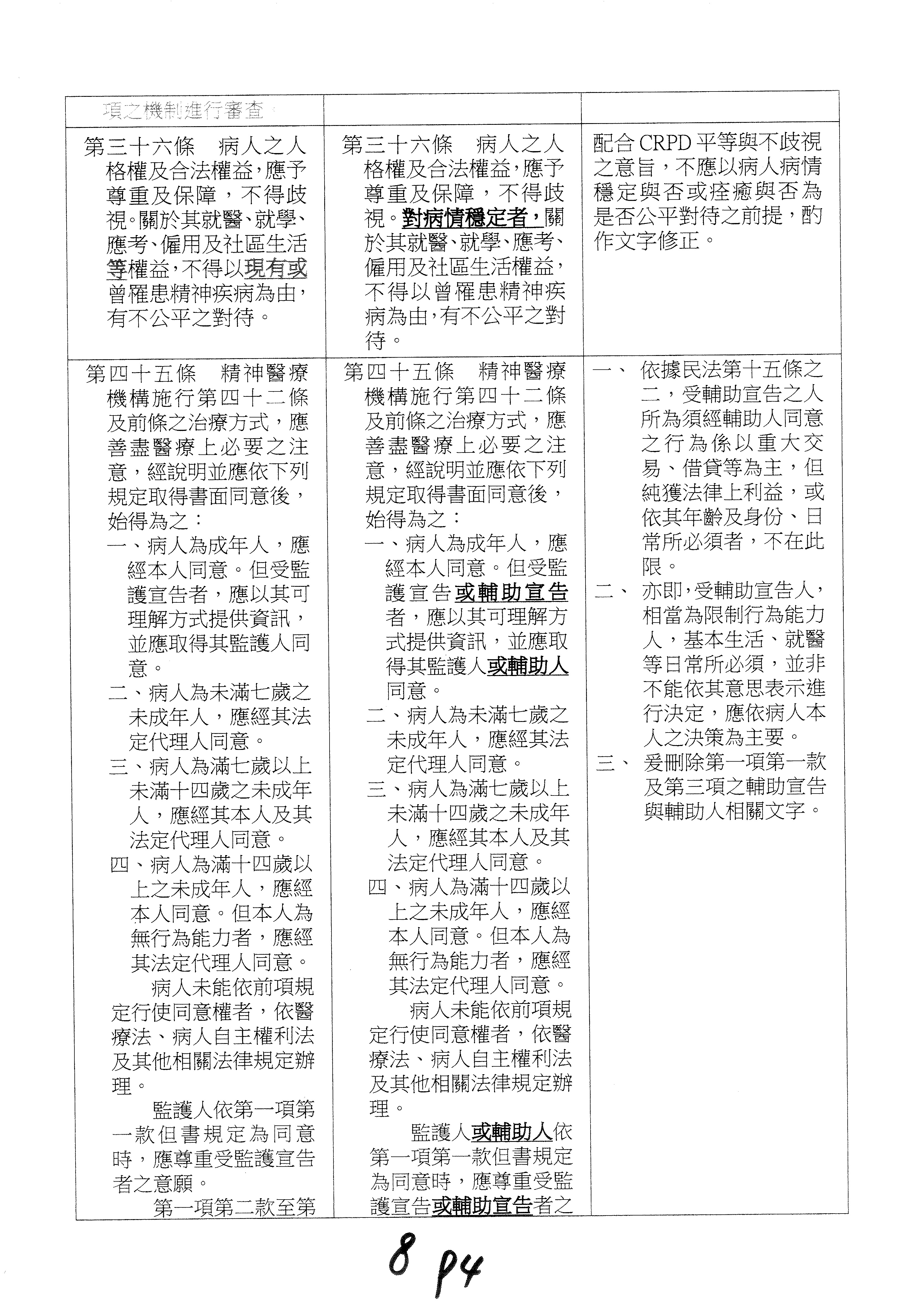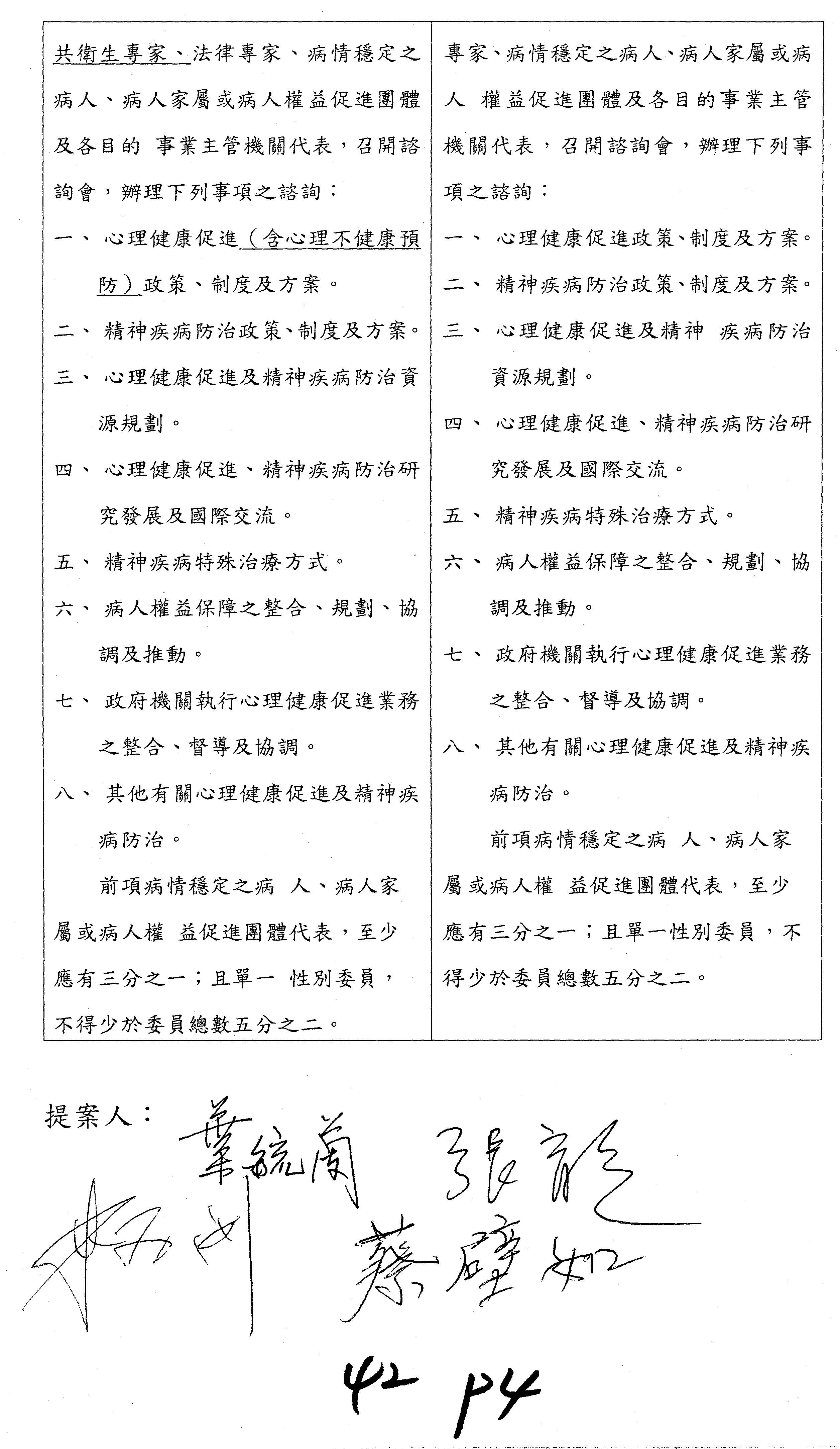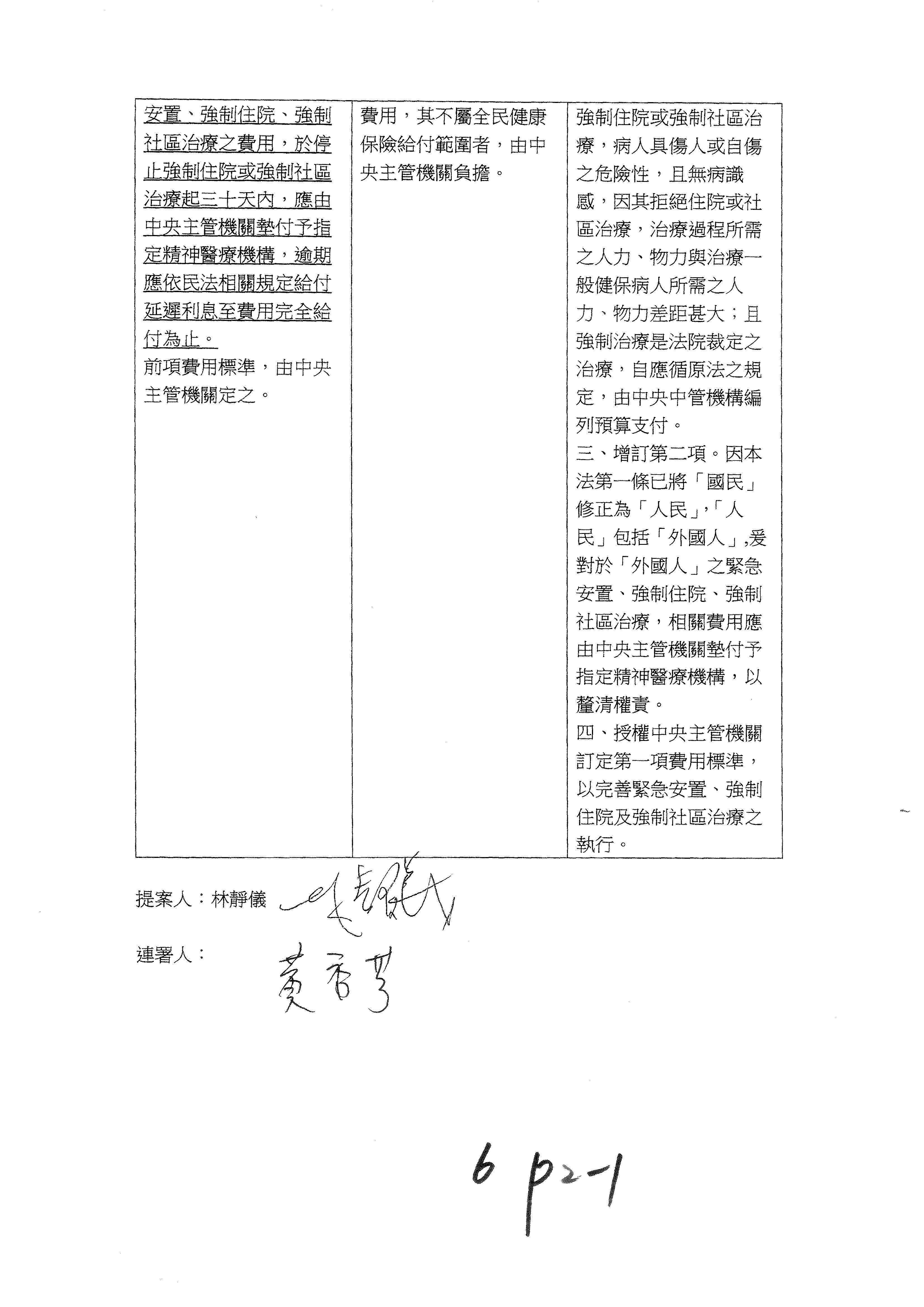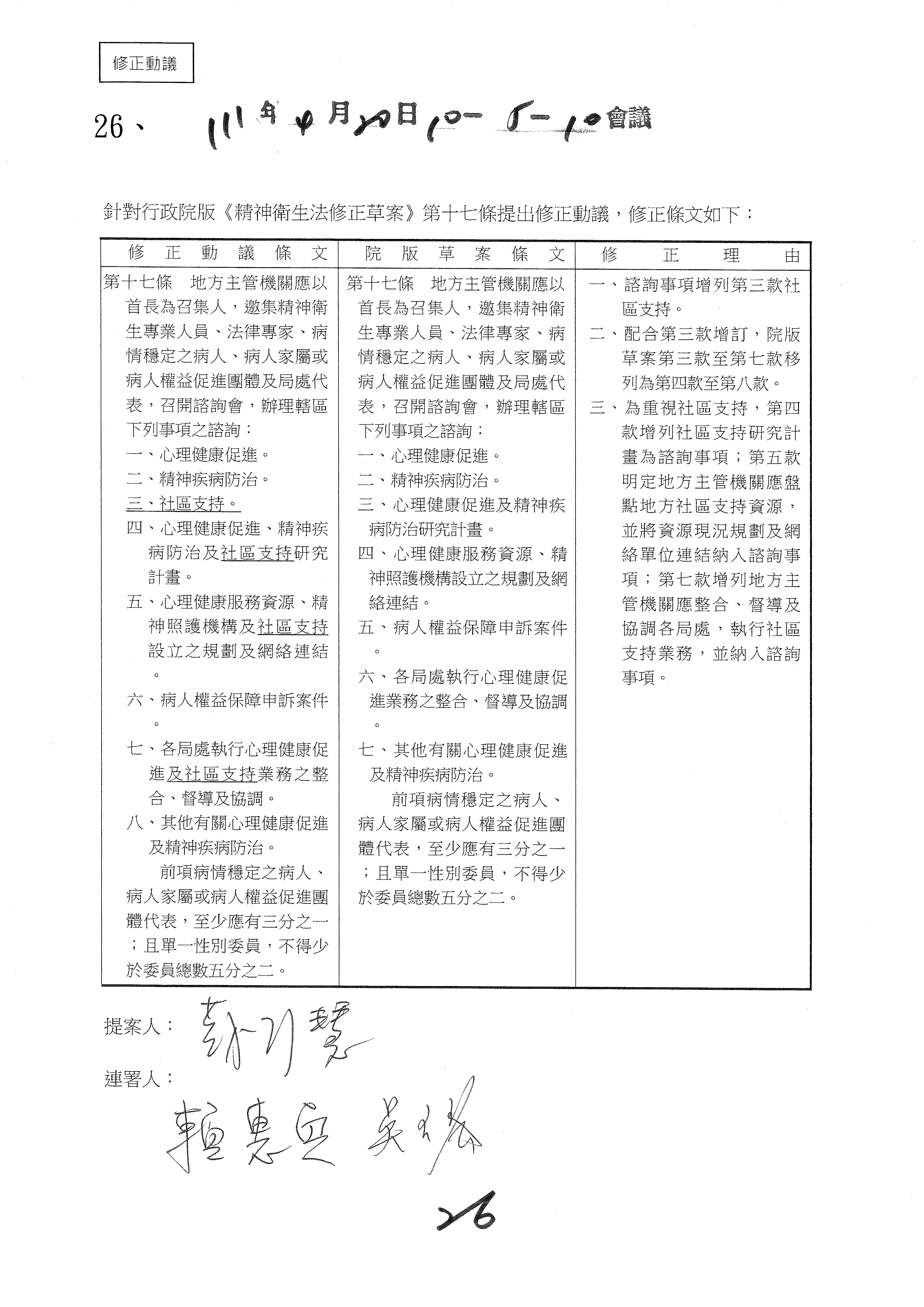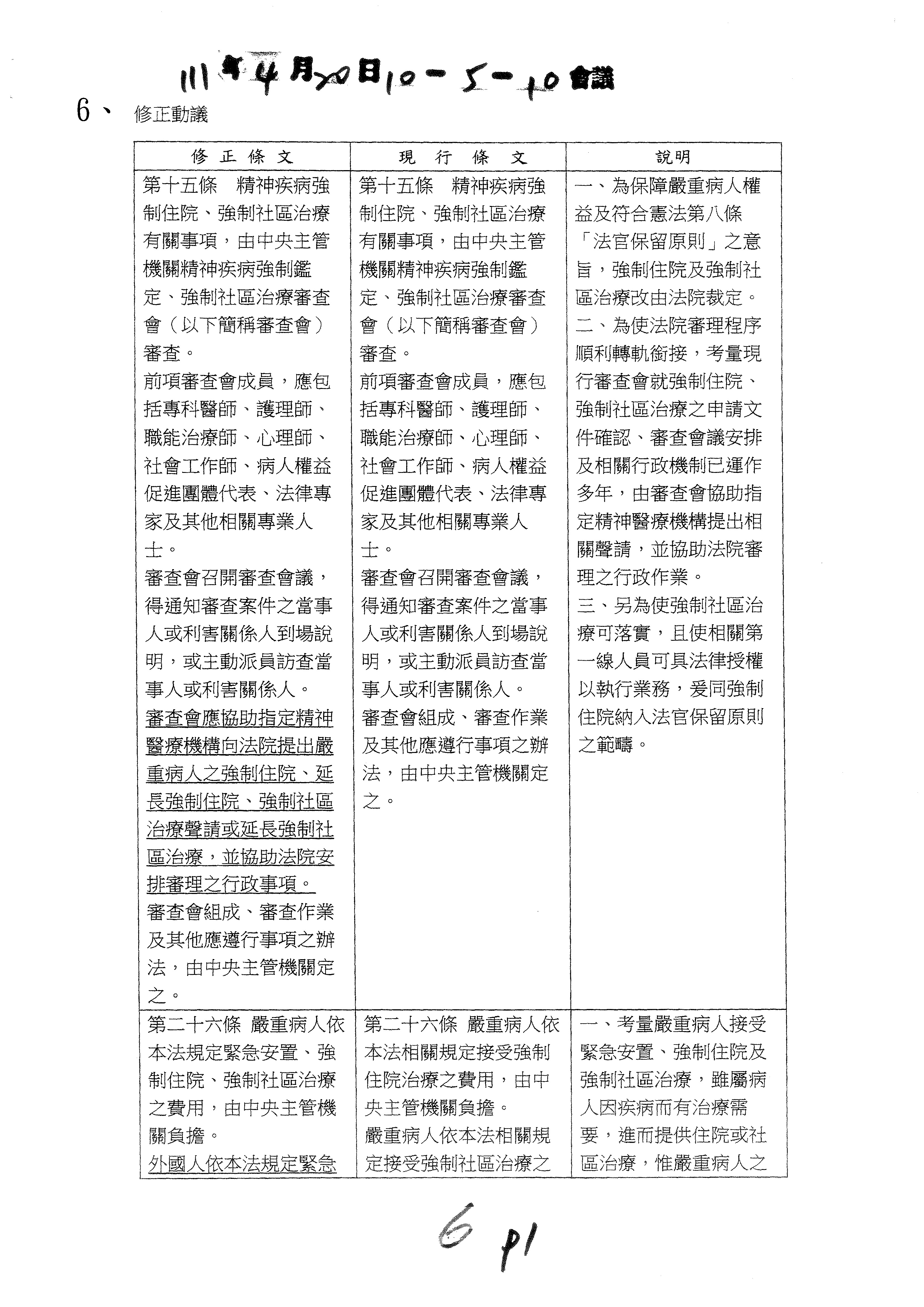 范委員雲:我想我們大家的方向都是一致的,差別只是比如我聽到王婉諭委員和我們是希望透過修法就讓政府做得更多,衛福部的立場是現在有些東西做不到,其實我們就是在這個過程中協商。我自己的版本針對第二十三條,大家可以看修正動議12P4的部分,除了第二十三條條文應該是病人及家庭照顧者之外,我是增加了第二十三條之一,主要就是希望把社區支持明訂更詳細,包含提供病人獲得所需之個人支持及照顧,促進其生活品質、社會參與及自立生活:一、心理支持。二、生活重建。三、居住式服務。四、社區式服務。五、居家與家庭支持等等共十六項。我想重點就是因為它要符合CRPD的國際公約以及病人需要的真正支持,這部分我們希望把它明訂更詳細,林為洲和吳玉琴委員也有建議加入部分內容,我們大家的方向是一致的,以上,謝謝。