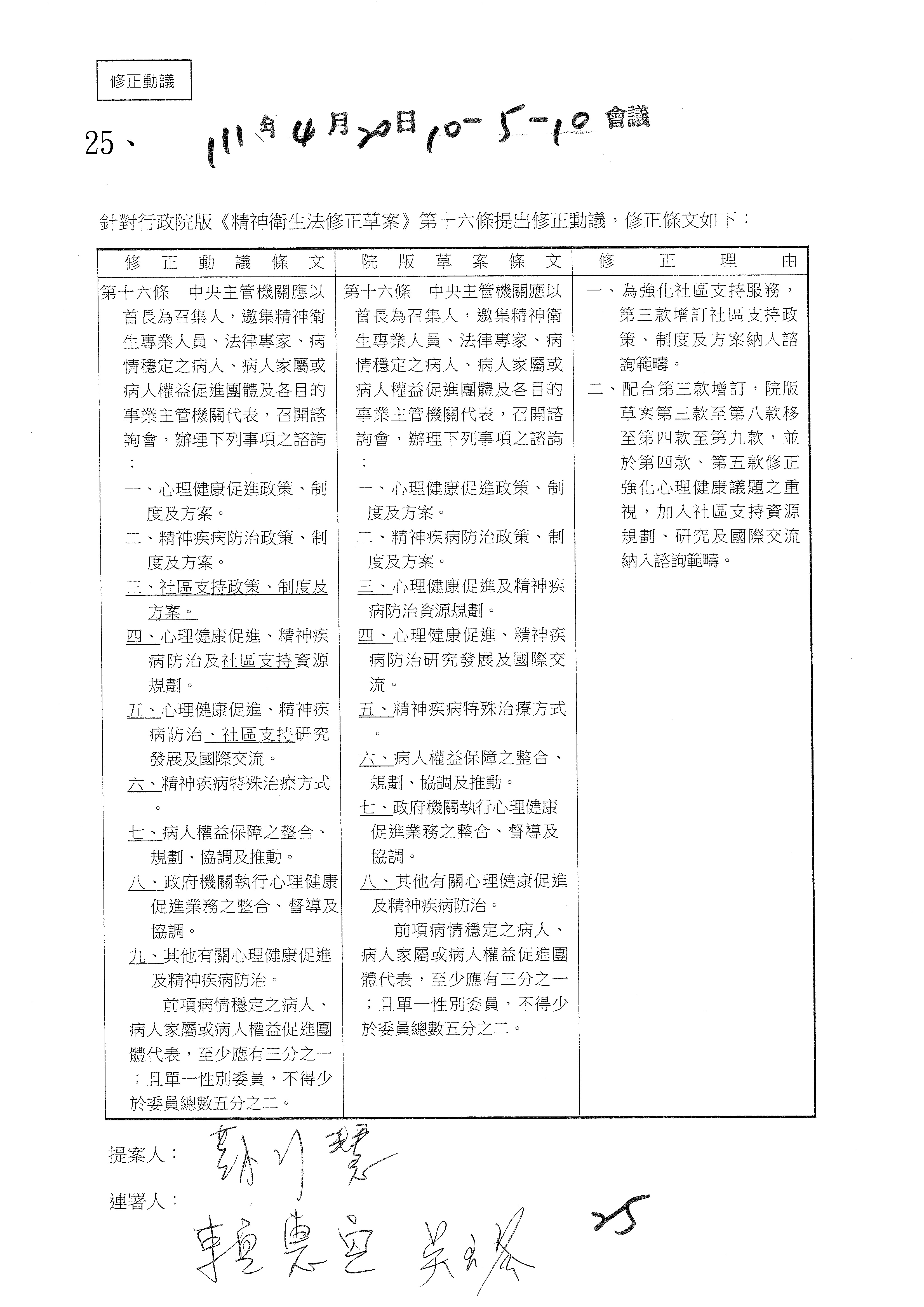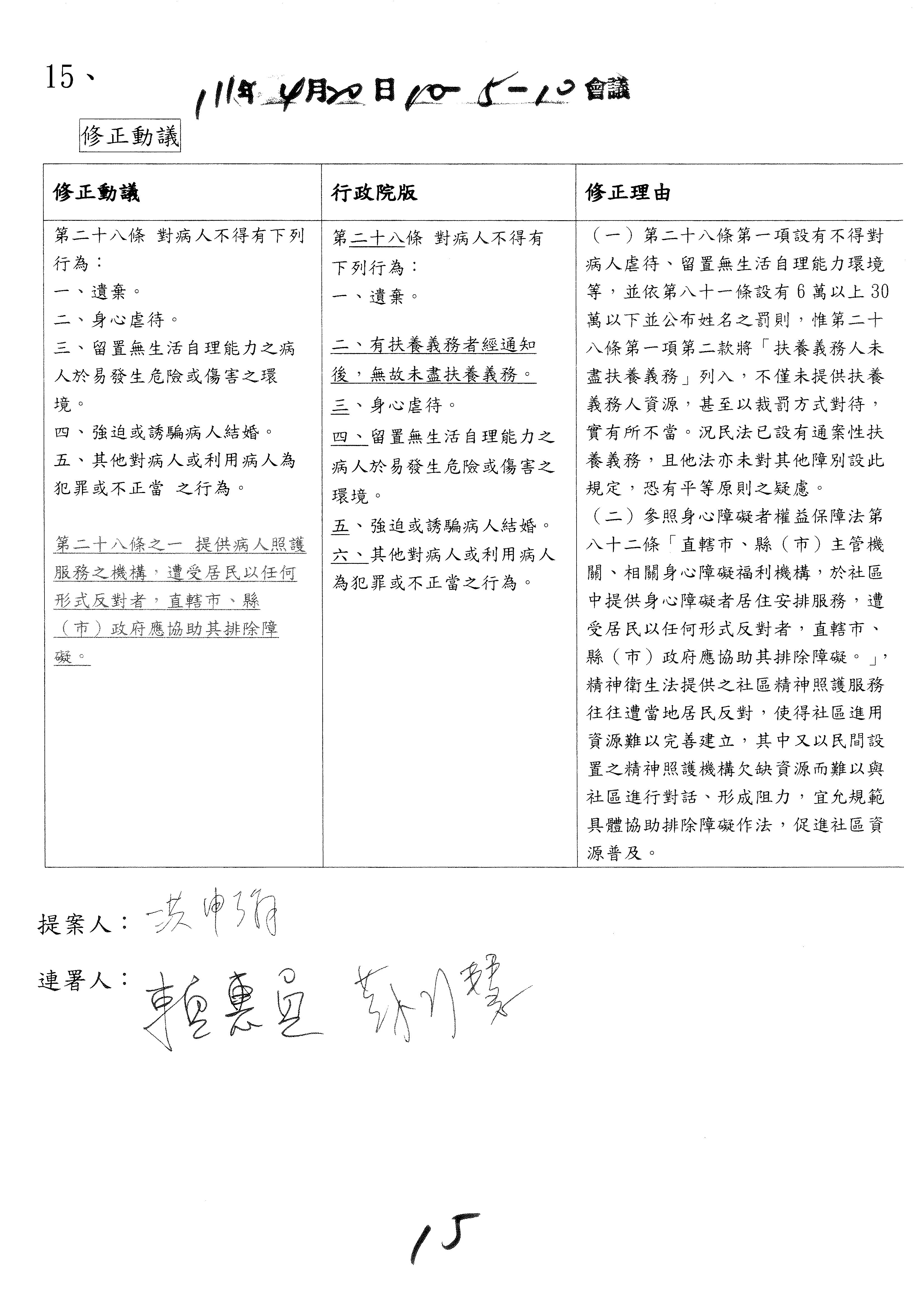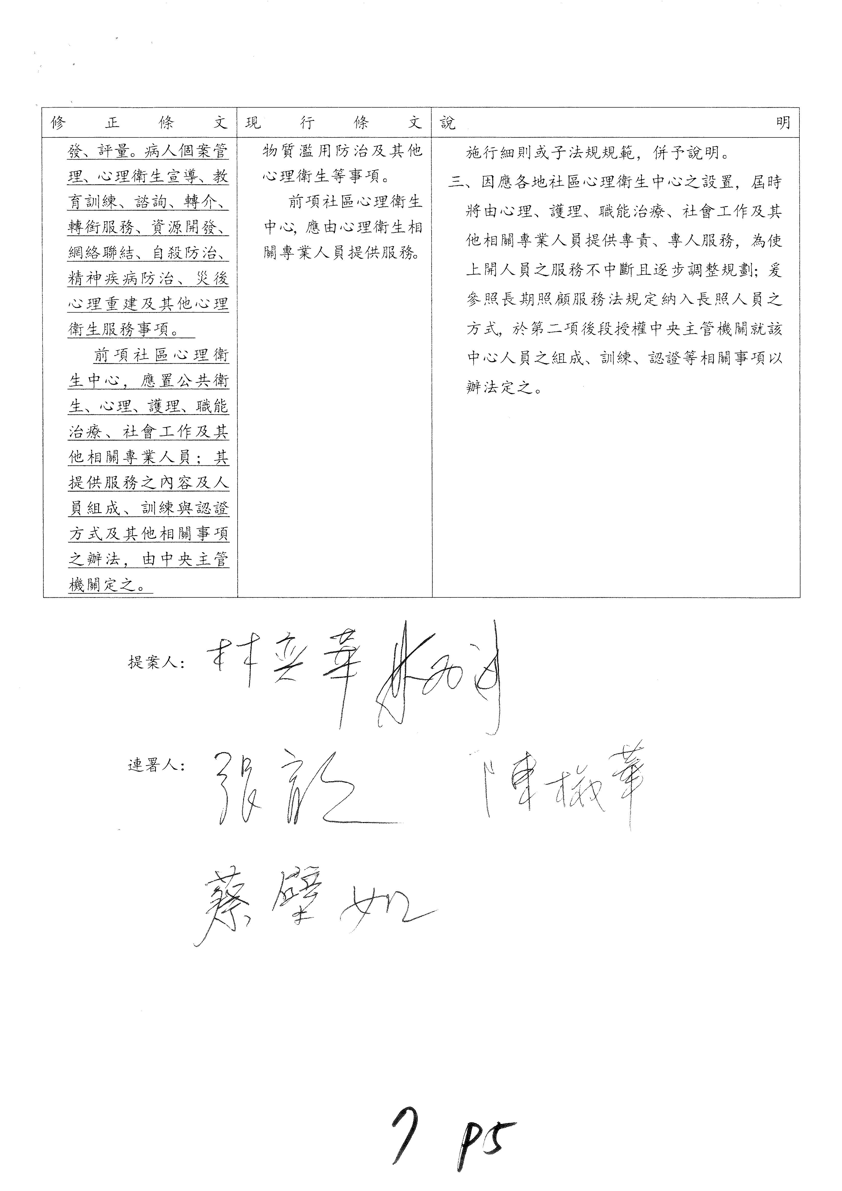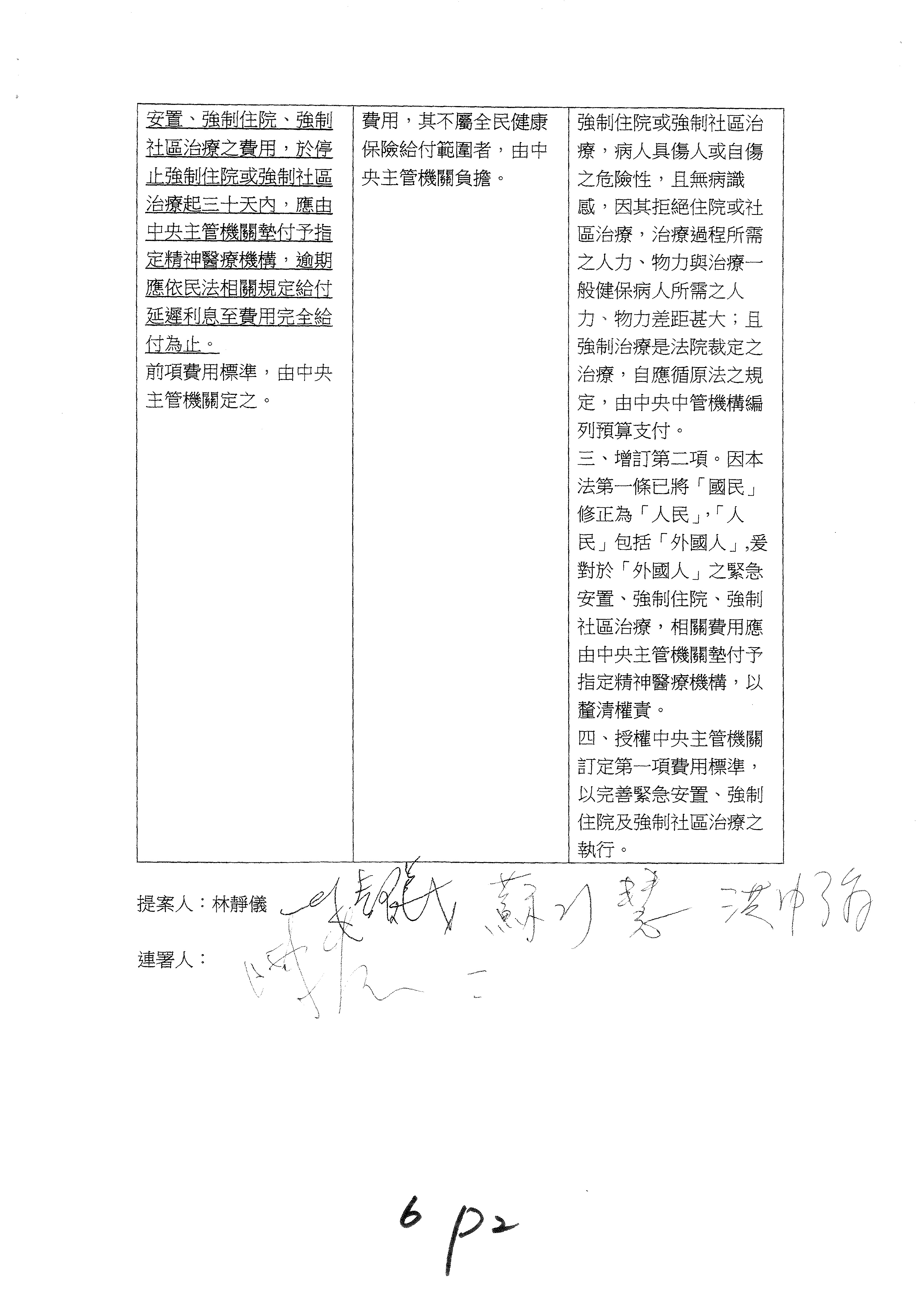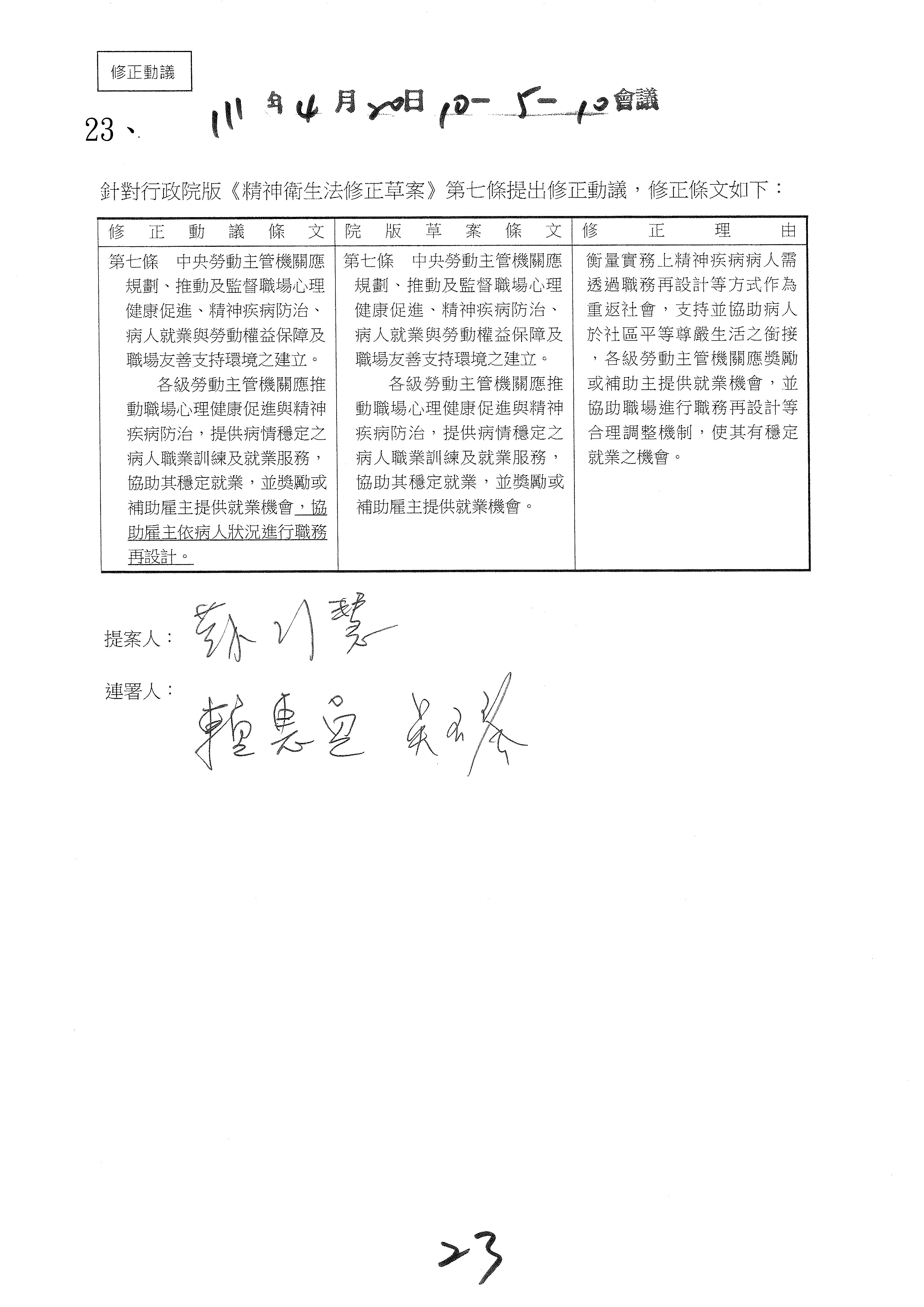 范委員雲:我想我們大家的方向都是一致的,差別只是比如我聽到王婉諭委員和我們是希望透過修法就讓政府做得更多,衛福部的立場是現在有些東西做不到,其實我們就是在這個過程中協商。我自己的版本針對第二十三條,大家可以看修正動議12P4的部分,除了第二十三條條文應該是病人及家庭照顧者之外,我是增加了第二十三條之一,主要就是希望把社區支持明訂更詳細,包含提供病人獲得所需之個人支持及照顧,促進其生活品質、社會參與及自立生活:一、心理支持。二、生活重建。三、居住式服務。四、社區式服務。五、居家與家庭支持等等共十六項。我想重點就是因為它要符合CRPD的國際公約以及病人需要的真正支持,這部分我們希望把它明訂更詳細,林為洲和吳玉琴委員也有建議加入部分內容,我們大家的方向是一致的,以上,謝謝。