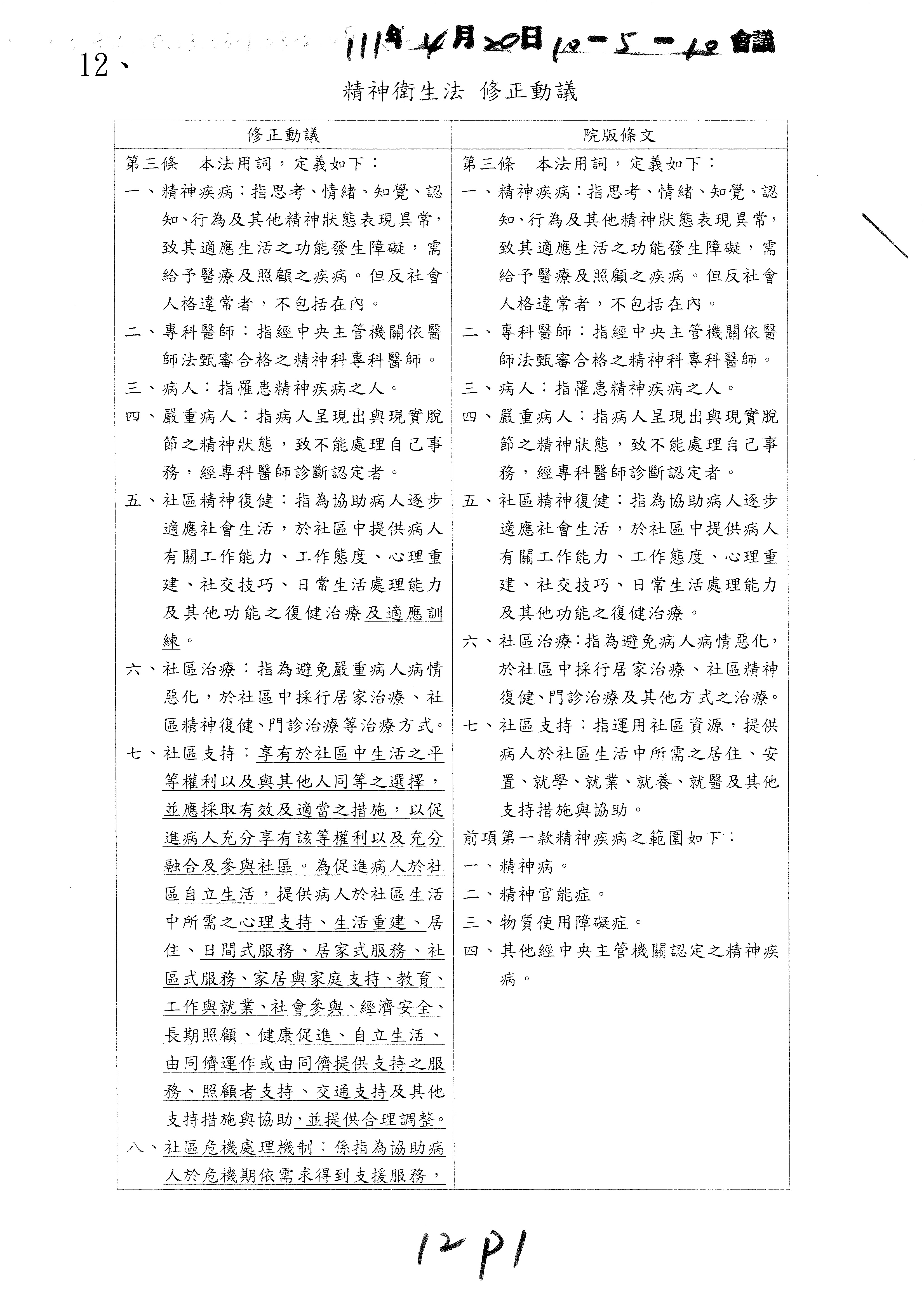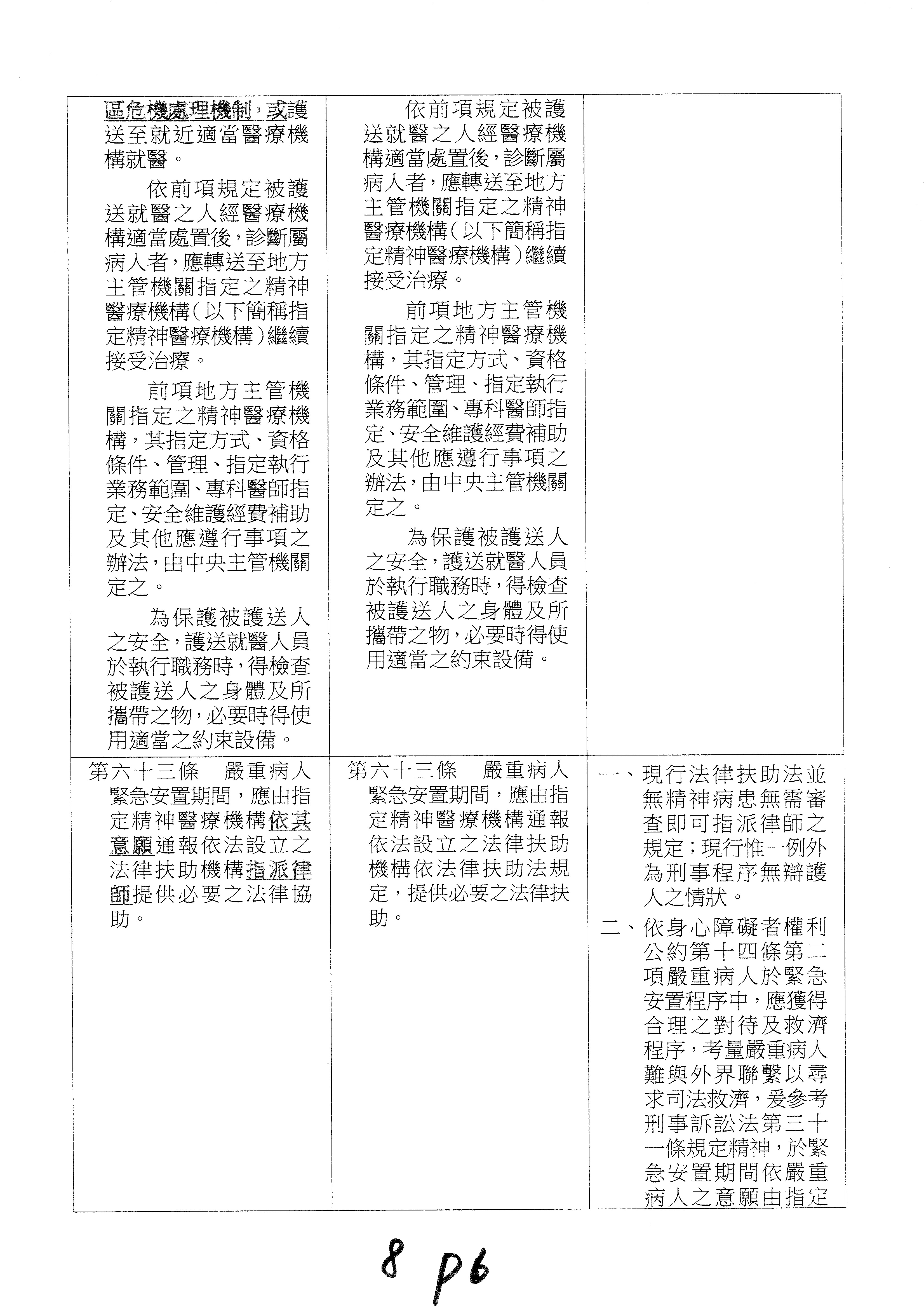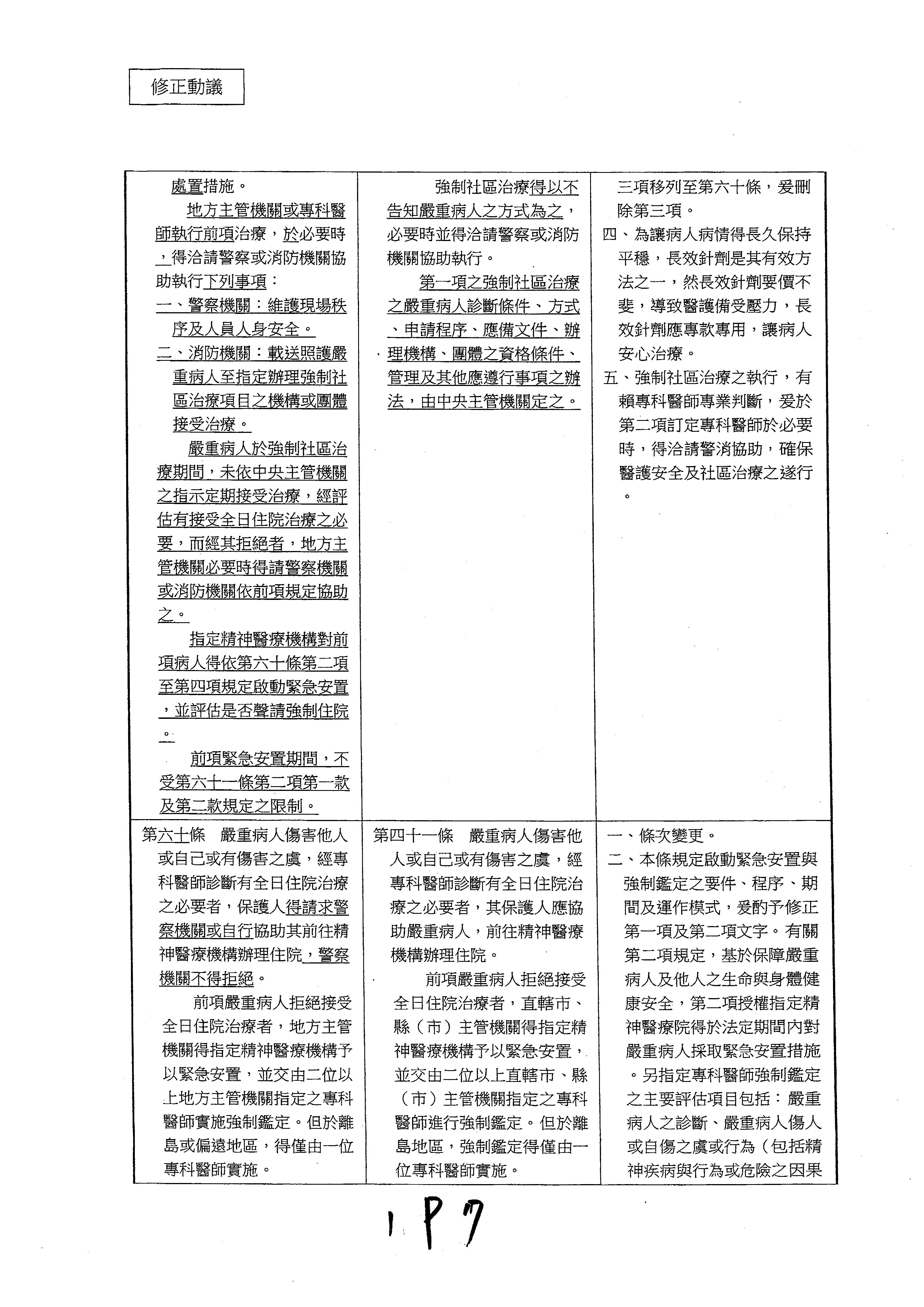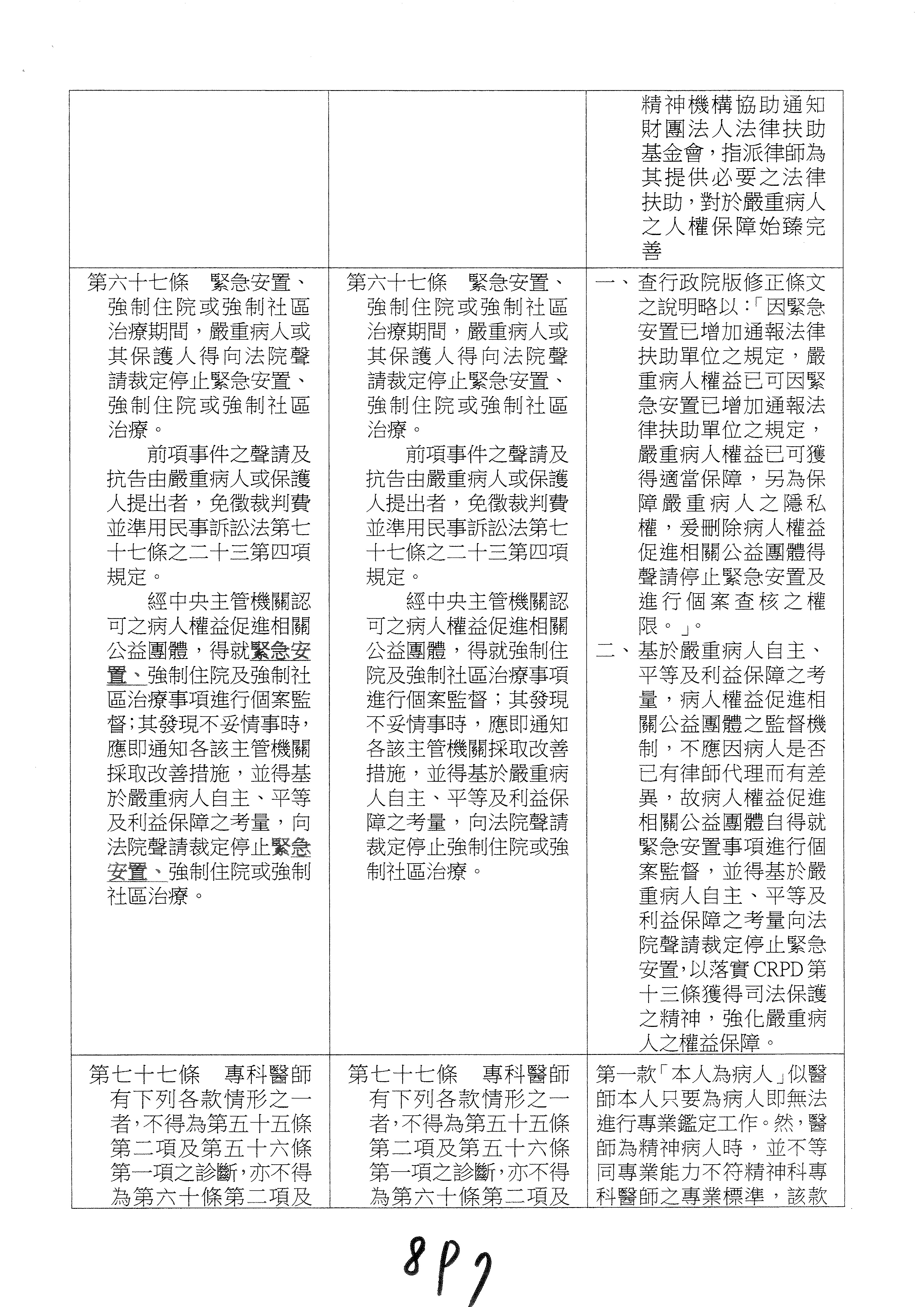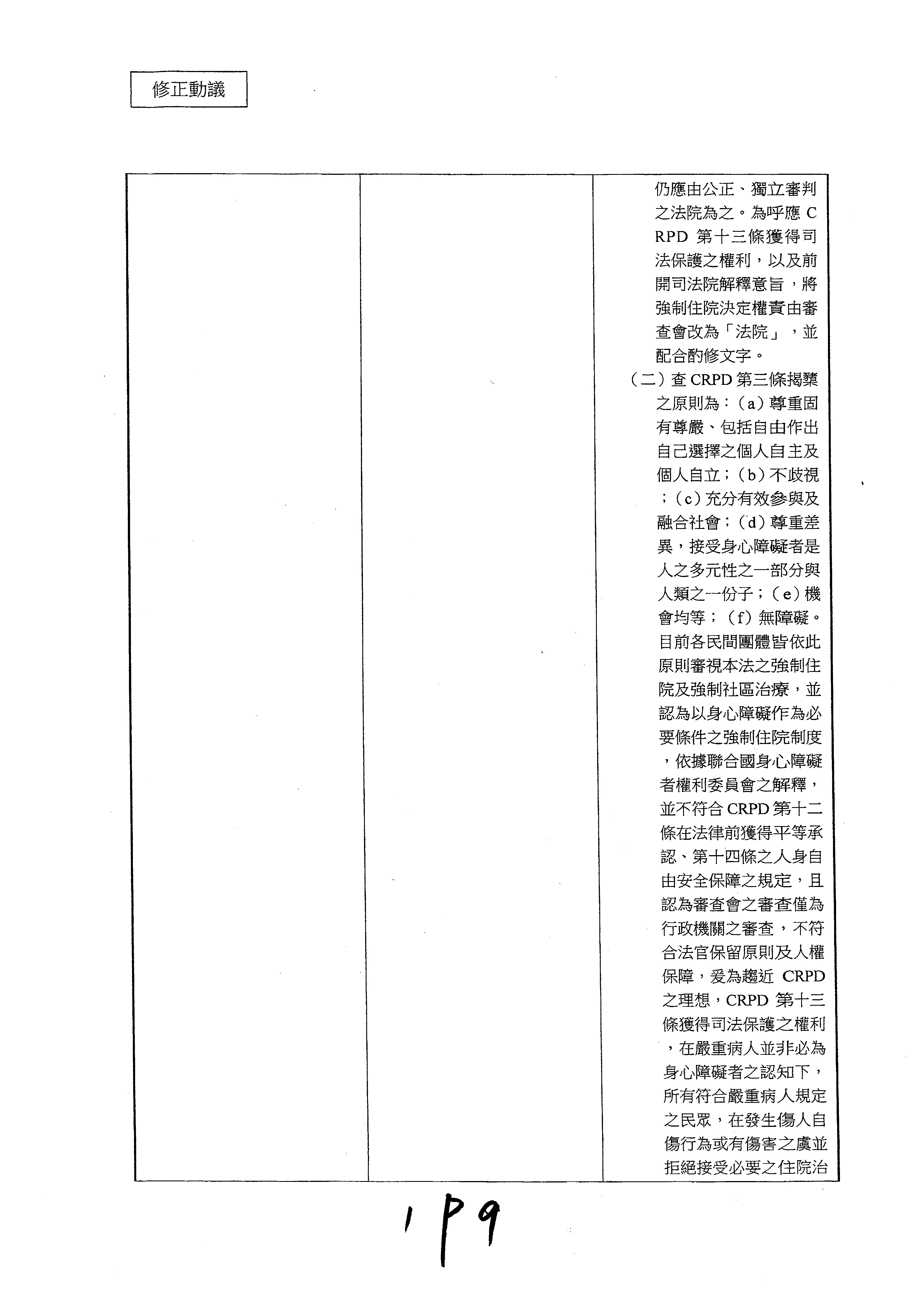 范委員雲:我想我們大家的方向都是一致的,差別只是比如我聽到王婉諭委員和我們是希望透過修法就讓政府做得更多,衛福部的立場是現在有些東西做不到,其實我們就是在這個過程中協商。我自己的版本針對第二十三條,大家可以看修正動議12P4的部分,除了第二十三條條文應該是病人及家庭照顧者之外,我是增加了第二十三條之一,主要就是希望把社區支持明訂更詳細,包含提供病人獲得所需之個人支持及照顧,促進其生活品質、社會參與及自立生活:一、心理支持。二、生活重建。三、居住式服務。四、社區式服務。五、居家與家庭支持等等共十六項。我想重點就是因為它要符合CRPD的國際公約以及病人需要的真正支持,這部分我們希望把它明訂更詳細,林為洲和吳玉琴委員也有建議加入部分內容,我們大家的方向是一致的,以上,謝謝。