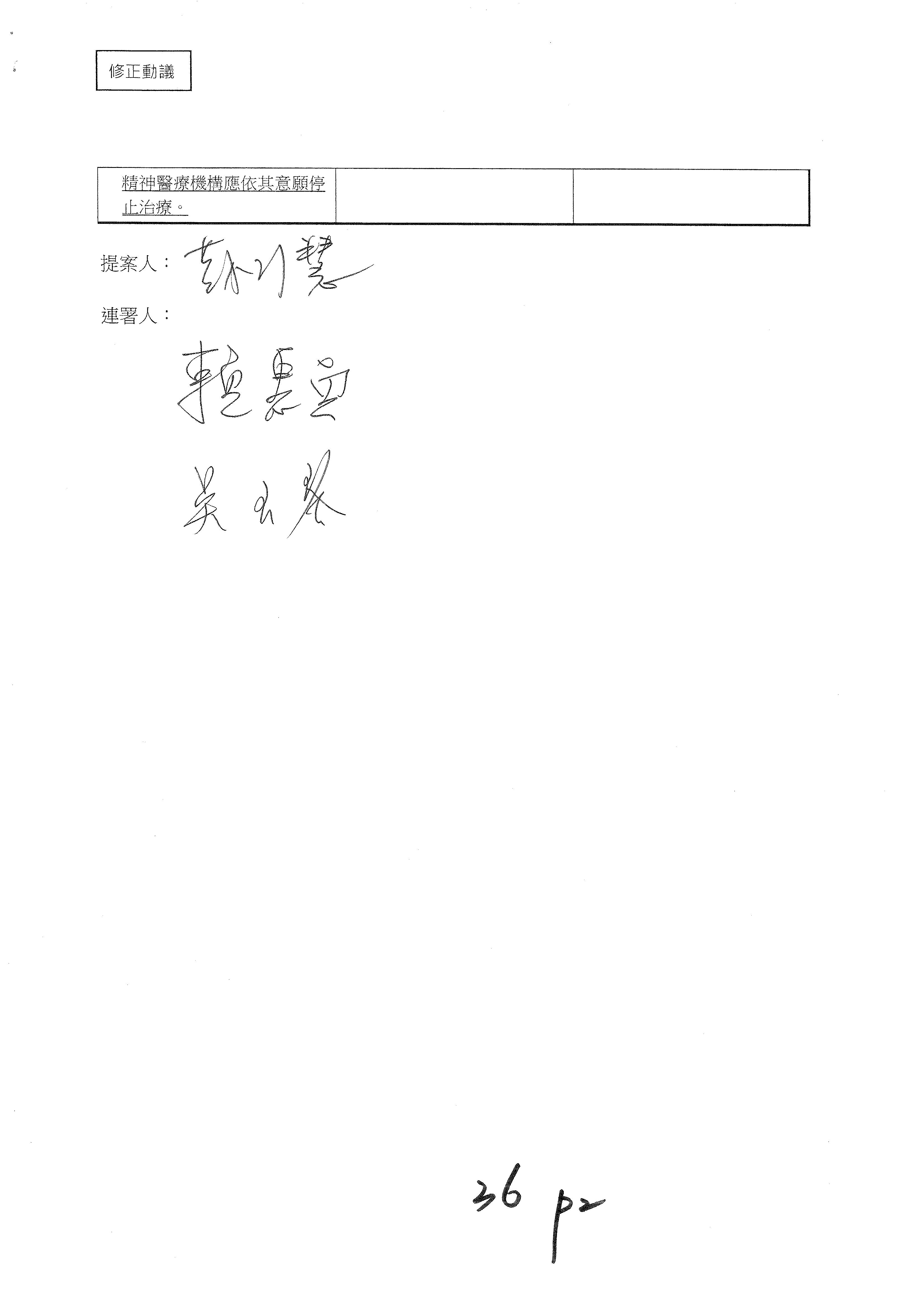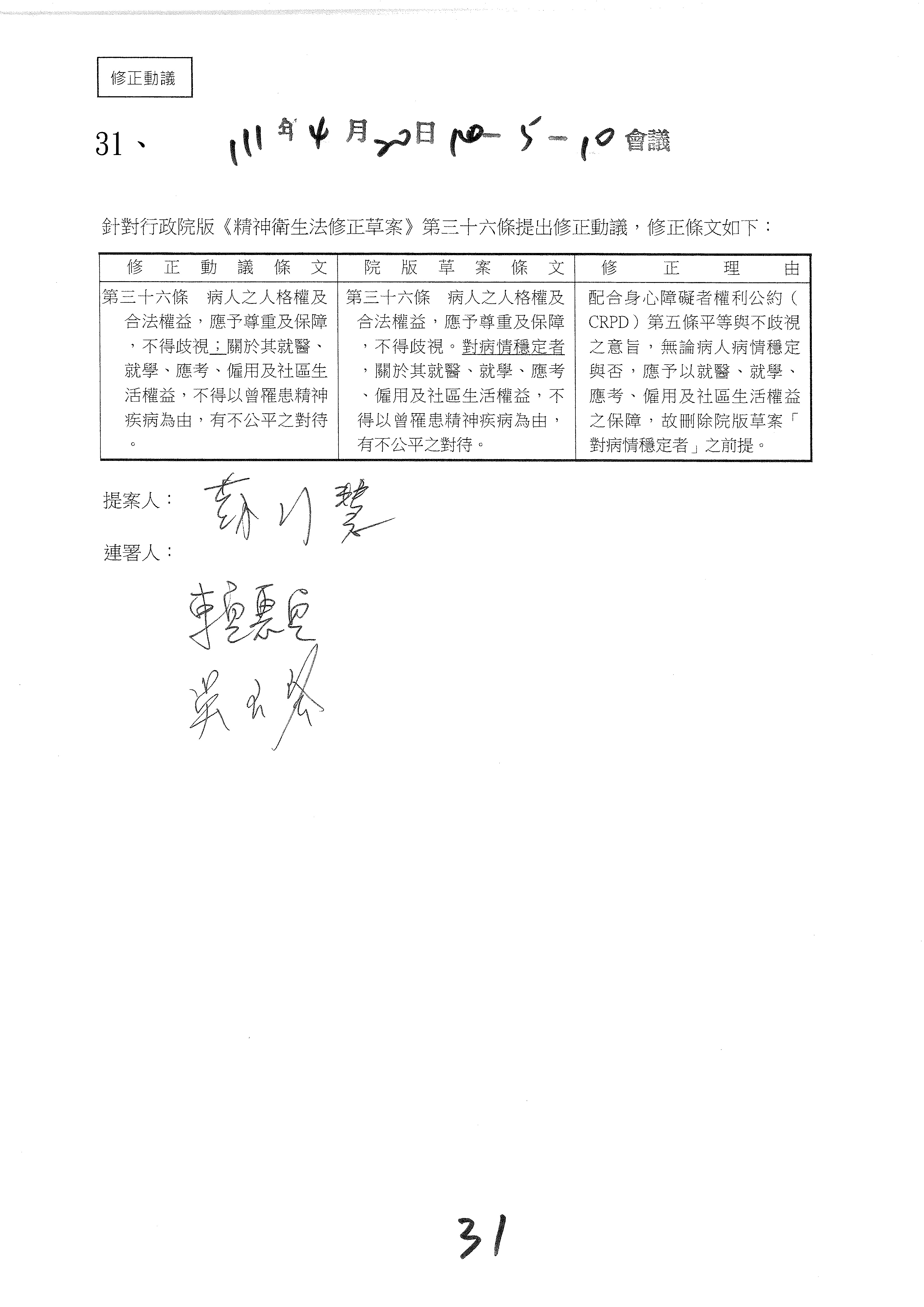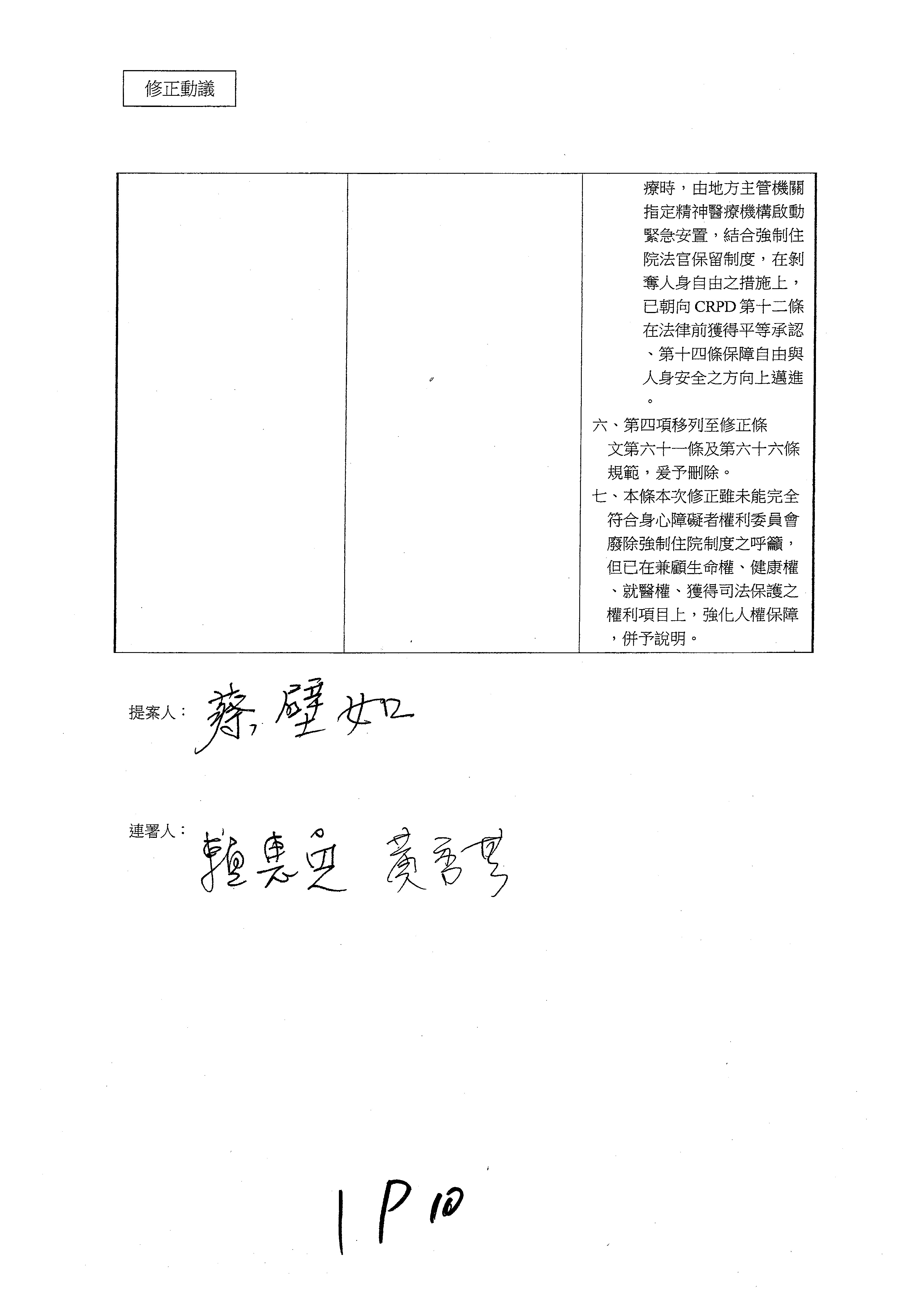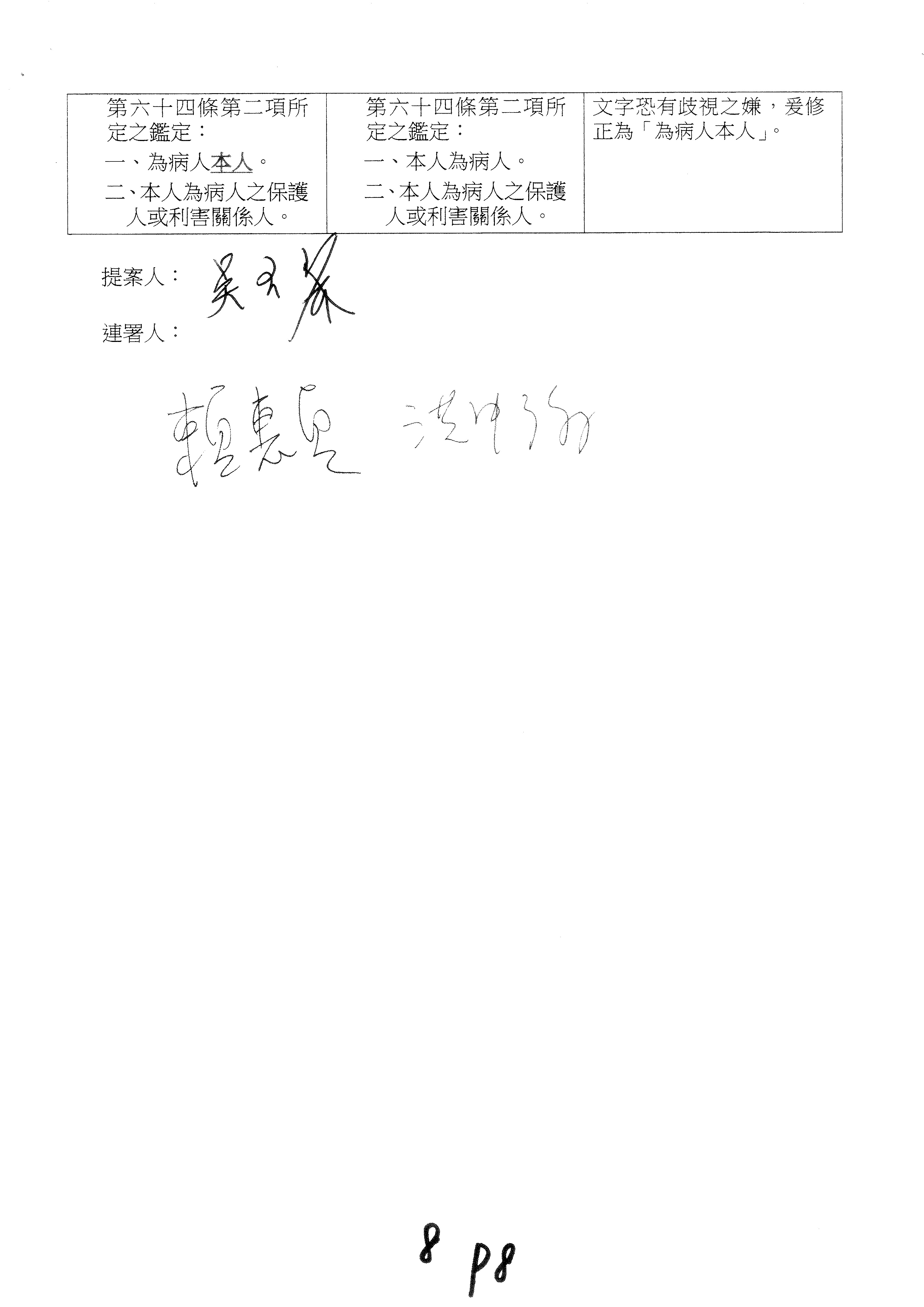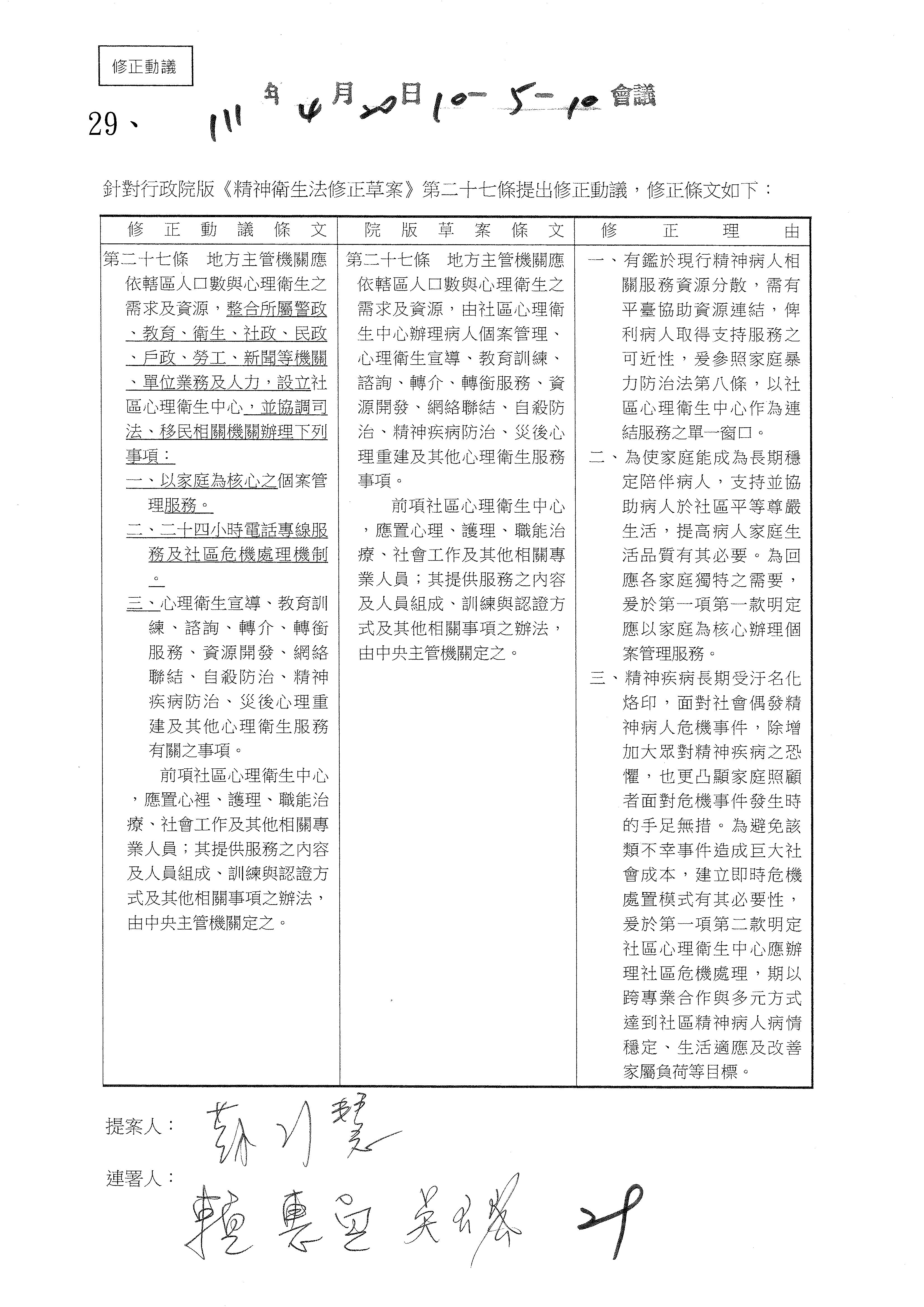 范委員雲:我想我們大家的方向都是一致的,差別只是比如我聽到王婉諭委員和我們是希望透過修法就讓政府做得更多,衛福部的立場是現在有些東西做不到,其實我們就是在這個過程中協商。我自己的版本針對第二十三條,大家可以看修正動議12P4的部分,除了第二十三條條文應該是病人及家庭照顧者之外,我是增加了第二十三條之一,主要就是希望把社區支持明訂更詳細,包含提供病人獲得所需之個人支持及照顧,促進其生活品質、社會參與及自立生活:一、心理支持。二、生活重建。三、居住式服務。四、社區式服務。五、居家與家庭支持等等共十六項。我想重點就是因為它要符合CRPD的國際公約以及病人需要的真正支持,這部分我們希望把它明訂更詳細,林為洲和吳玉琴委員也有建議加入部分內容,我們大家的方向是一致的,以上,謝謝。