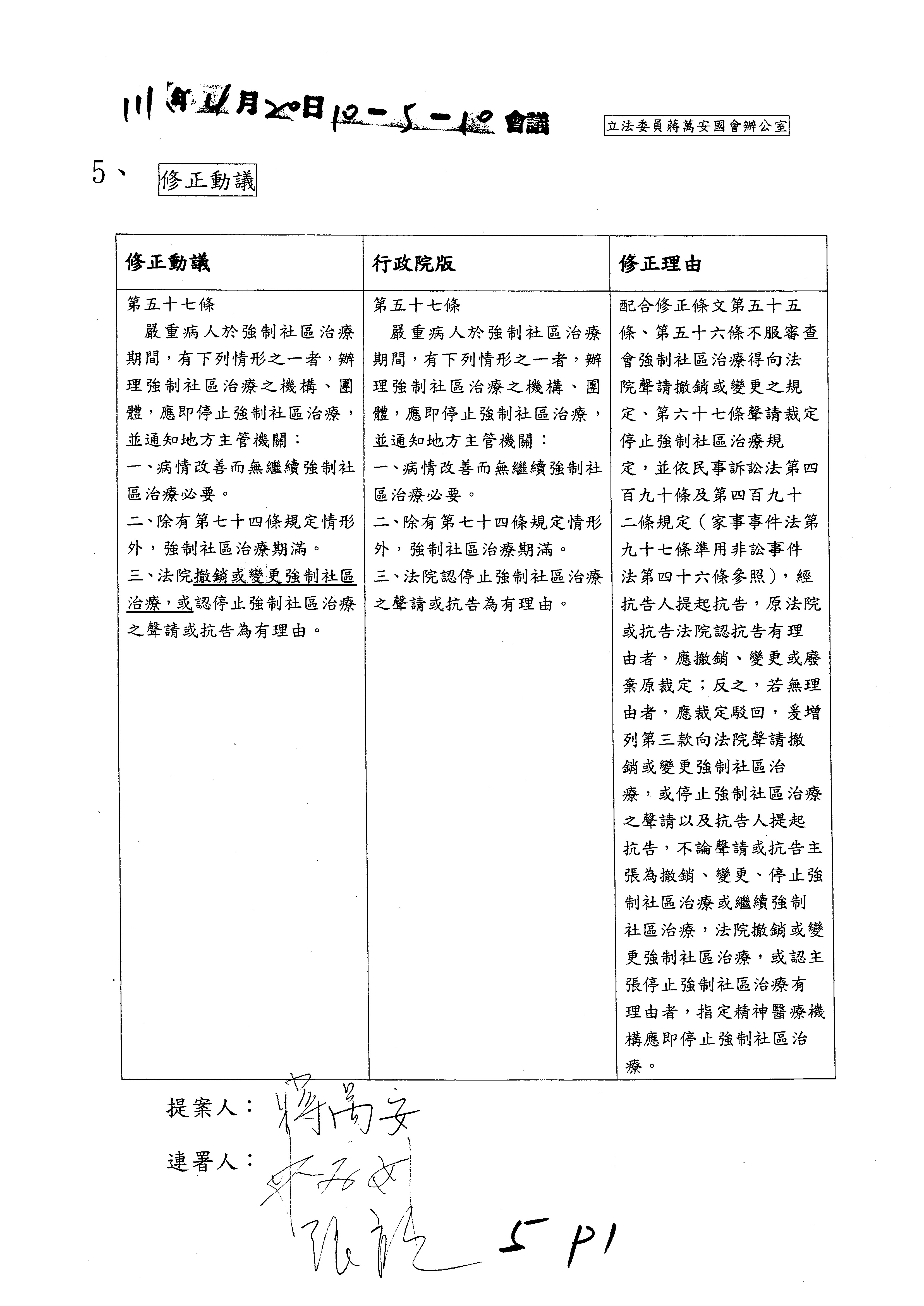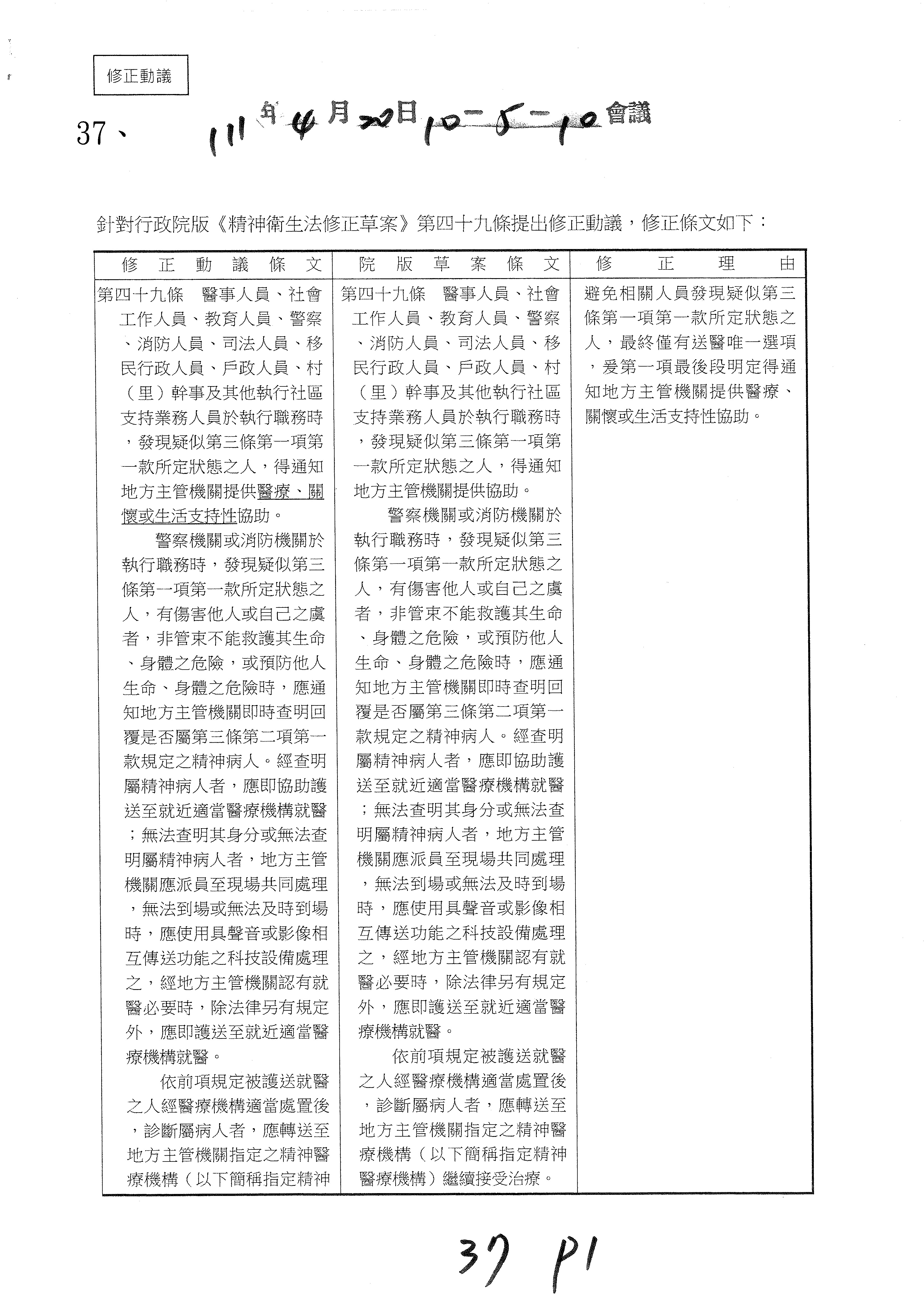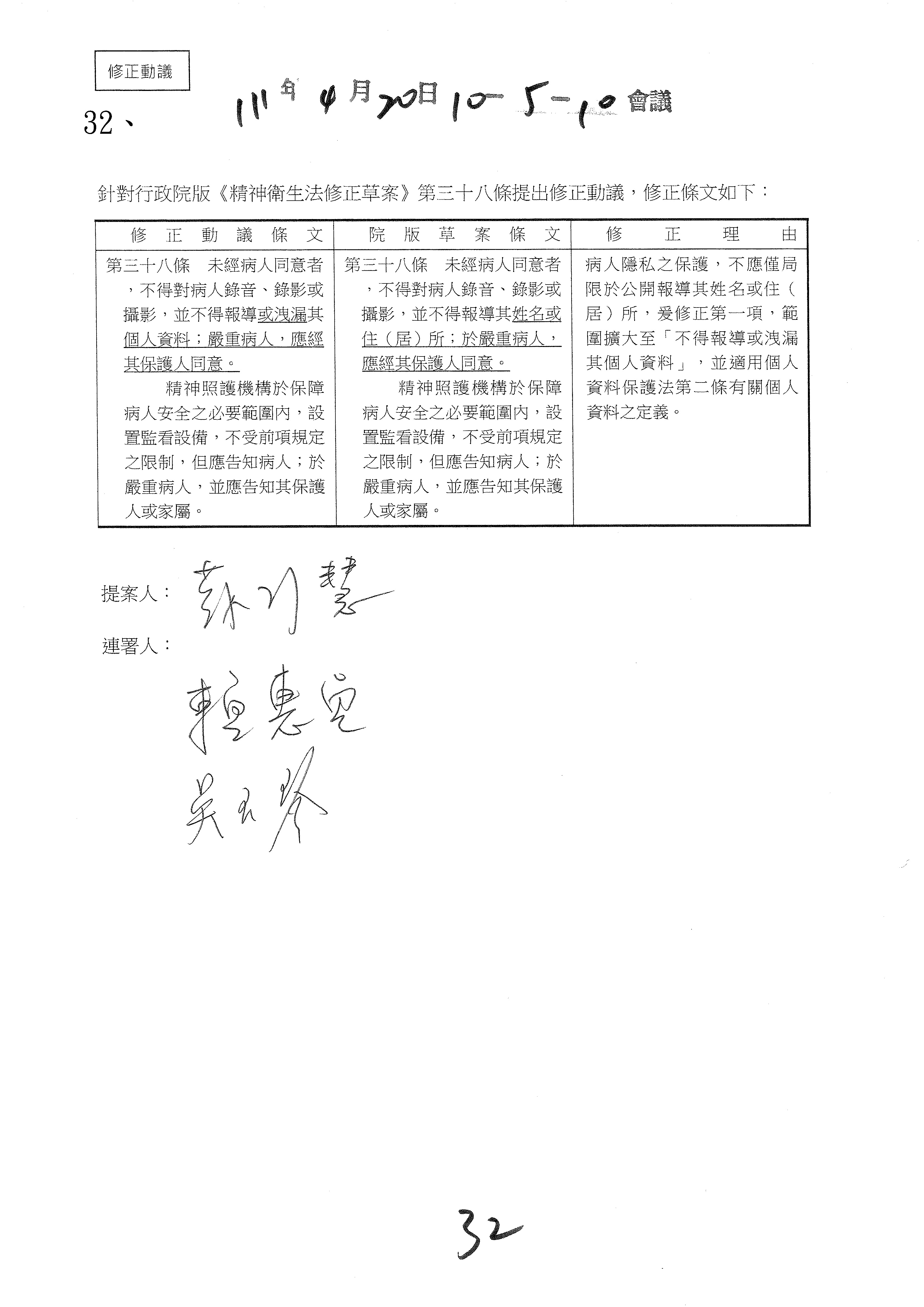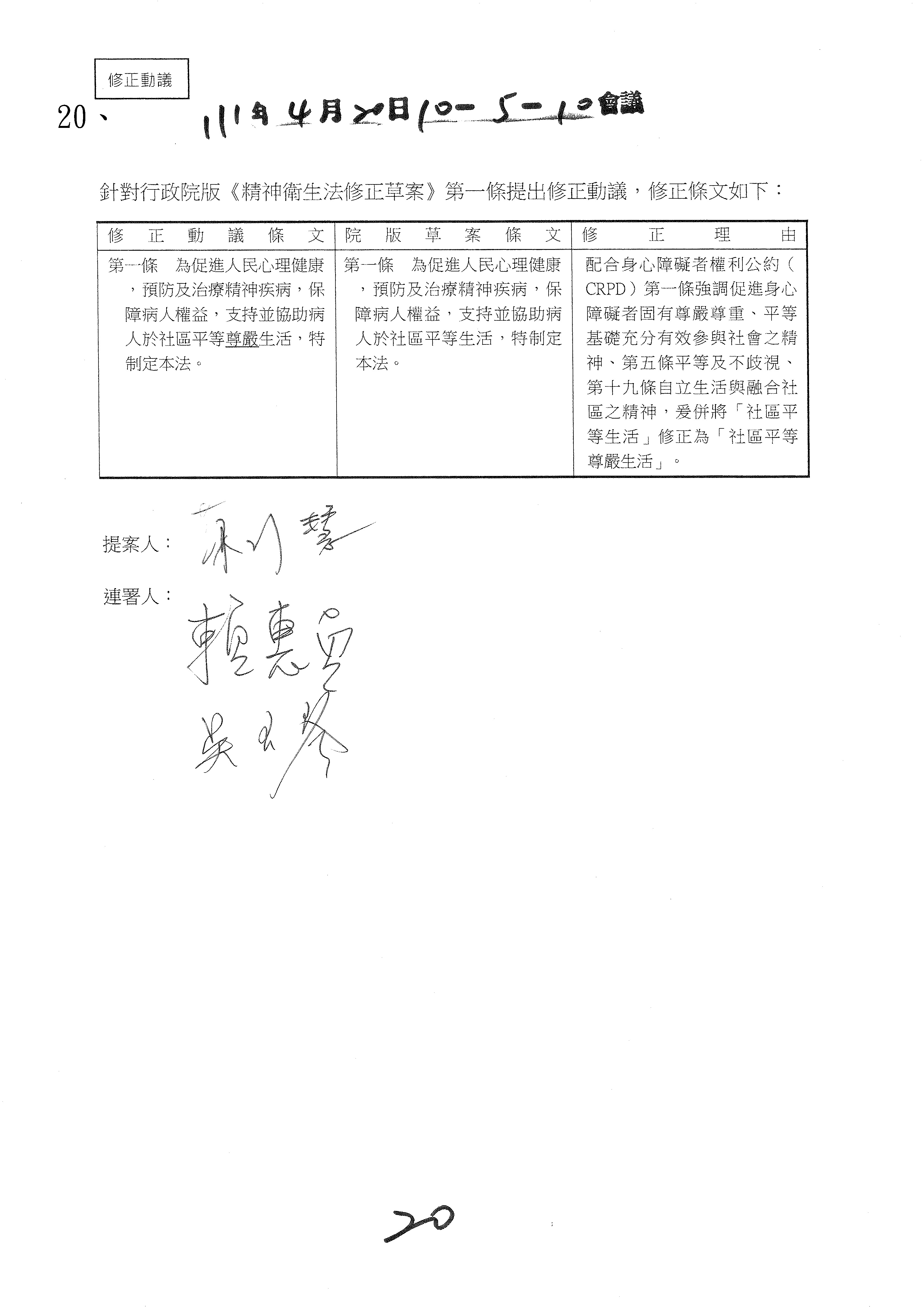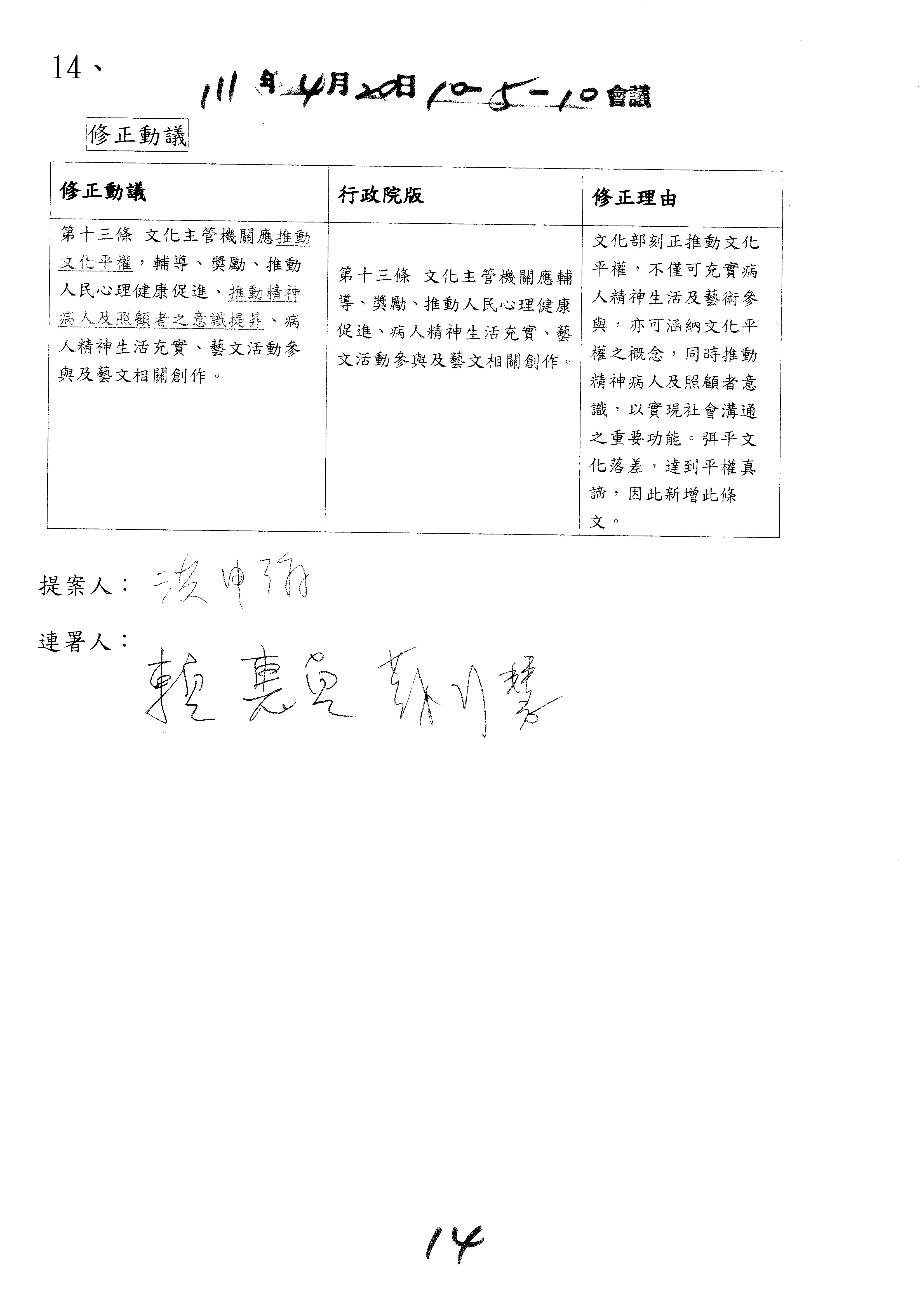 范委員雲:我想我們大家的方向都是一致的,差別只是比如我聽到王婉諭委員和我們是希望透過修法就讓政府做得更多,衛福部的立場是現在有些東西做不到,其實我們就是在這個過程中協商。我自己的版本針對第二十三條,大家可以看修正動議12P4的部分,除了第二十三條條文應該是病人及家庭照顧者之外,我是增加了第二十三條之一,主要就是希望把社區支持明訂更詳細,包含提供病人獲得所需之個人支持及照顧,促進其生活品質、社會參與及自立生活:一、心理支持。二、生活重建。三、居住式服務。四、社區式服務。五、居家與家庭支持等等共十六項。我想重點就是因為它要符合CRPD的國際公約以及病人需要的真正支持,這部分我們希望把它明訂更詳細,林為洲和吳玉琴委員也有建議加入部分內容,我們大家的方向是一致的,以上,謝謝。