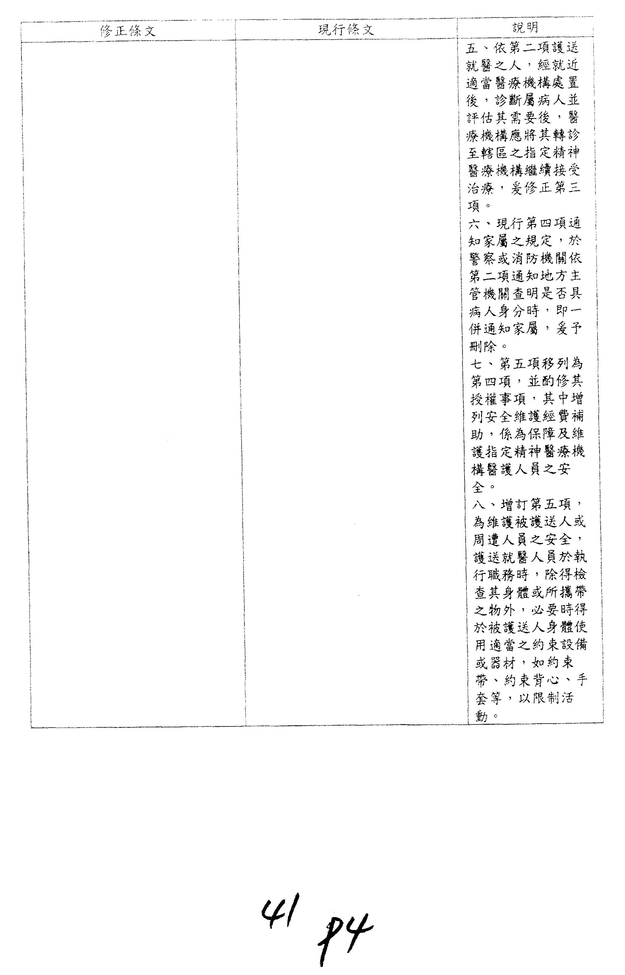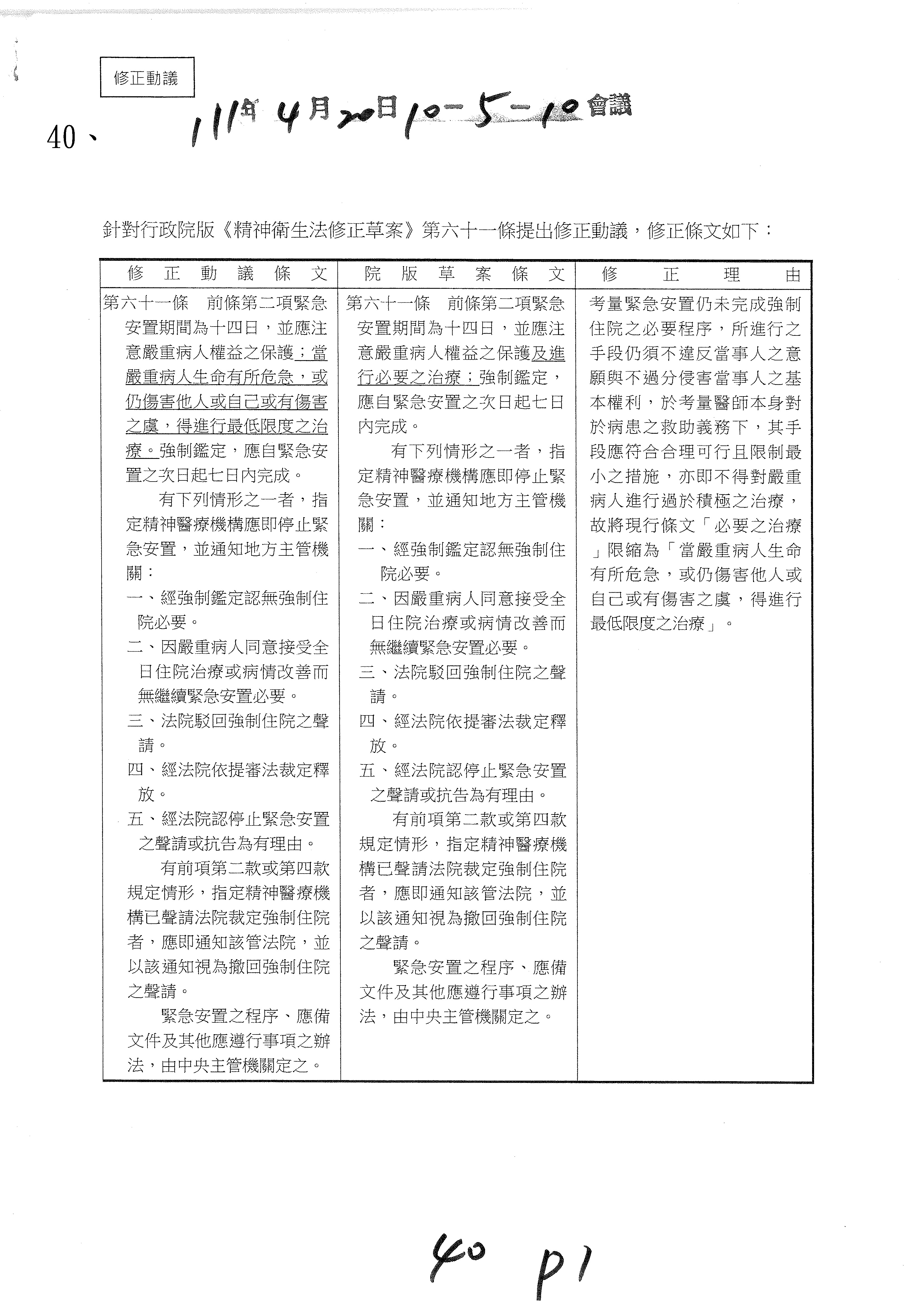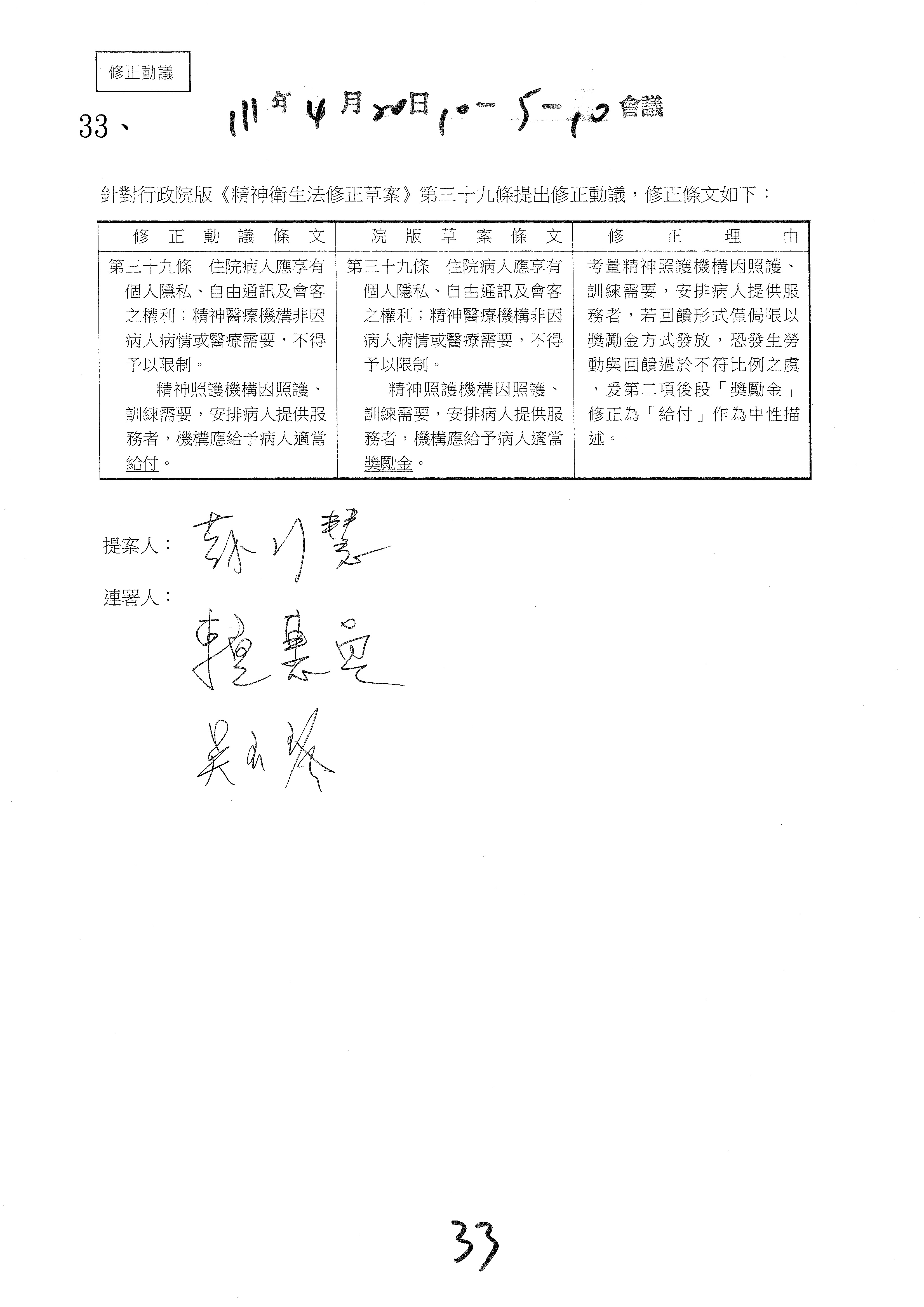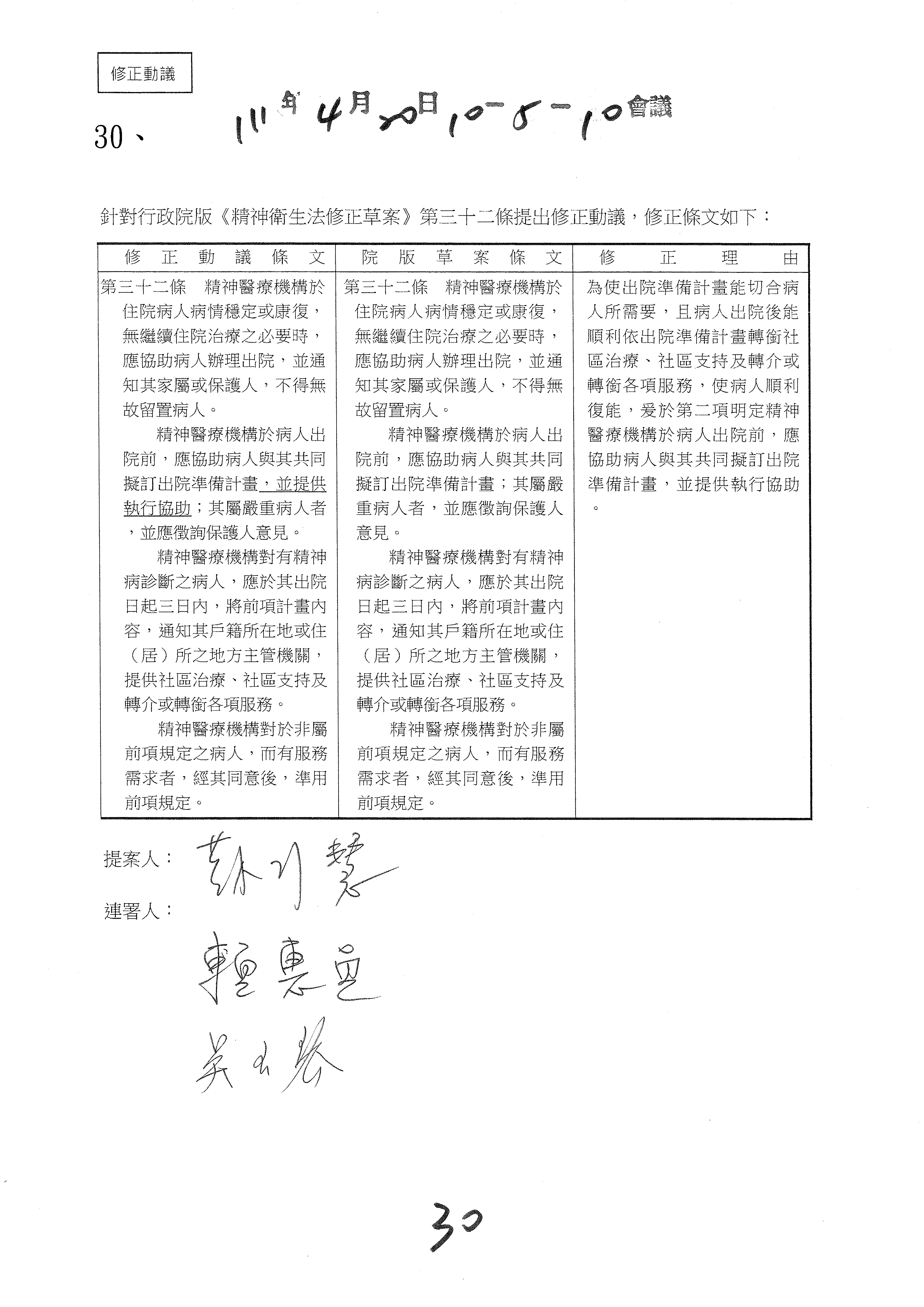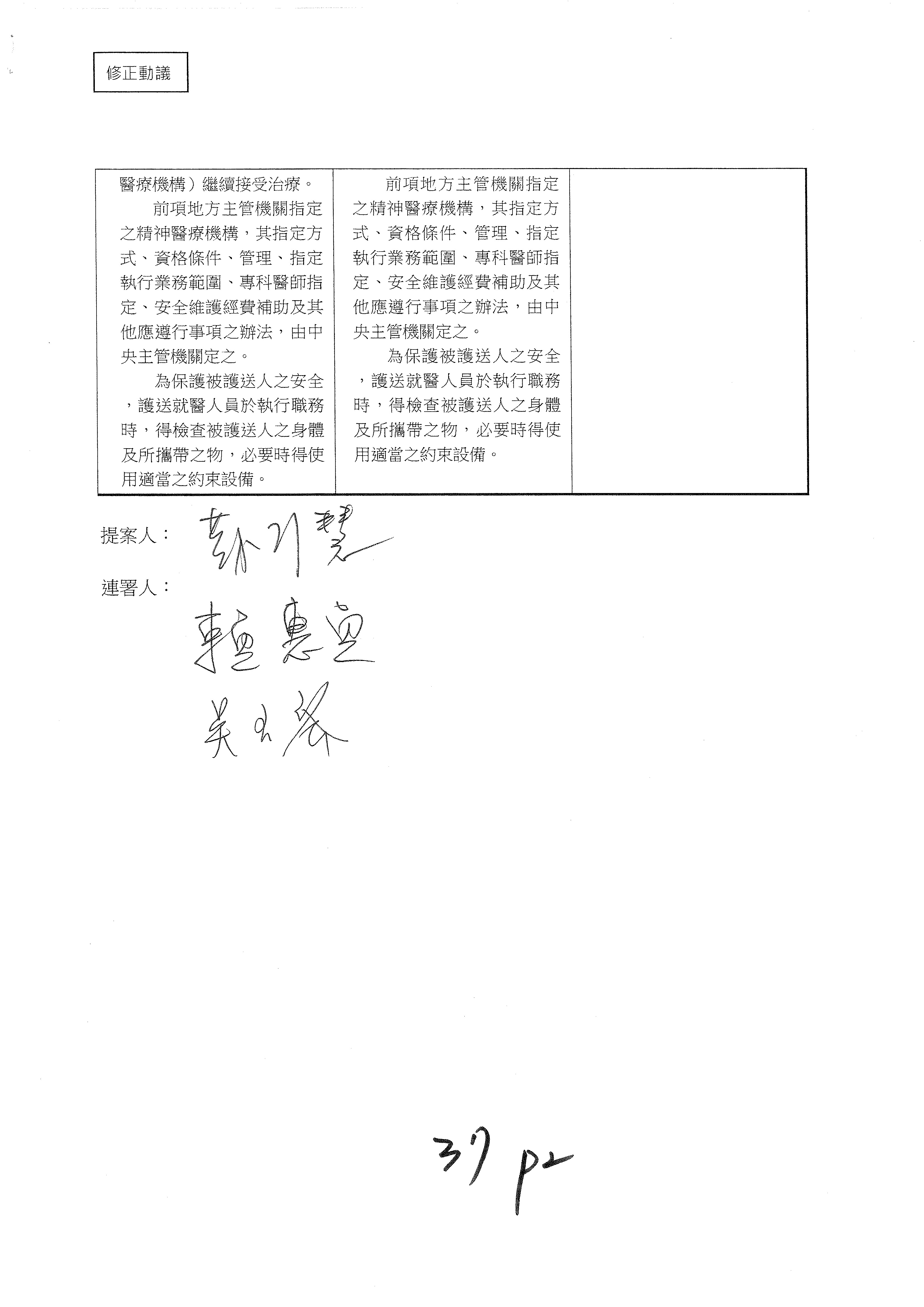 范委員雲:我想我們大家的方向都是一致的,差別只是比如我聽到王婉諭委員和我們是希望透過修法就讓政府做得更多,衛福部的立場是現在有些東西做不到,其實我們就是在這個過程中協商。我自己的版本針對第二十三條,大家可以看修正動議12P4的部分,除了第二十三條條文應該是病人及家庭照顧者之外,我是增加了第二十三條之一,主要就是希望把社區支持明訂更詳細,包含提供病人獲得所需之個人支持及照顧,促進其生活品質、社會參與及自立生活:一、心理支持。二、生活重建。三、居住式服務。四、社區式服務。五、居家與家庭支持等等共十六項。我想重點就是因為它要符合CRPD的國際公約以及病人需要的真正支持,這部分我們希望把它明訂更詳細,林為洲和吳玉琴委員也有建議加入部分內容,我們大家的方向是一致的,以上,謝謝。