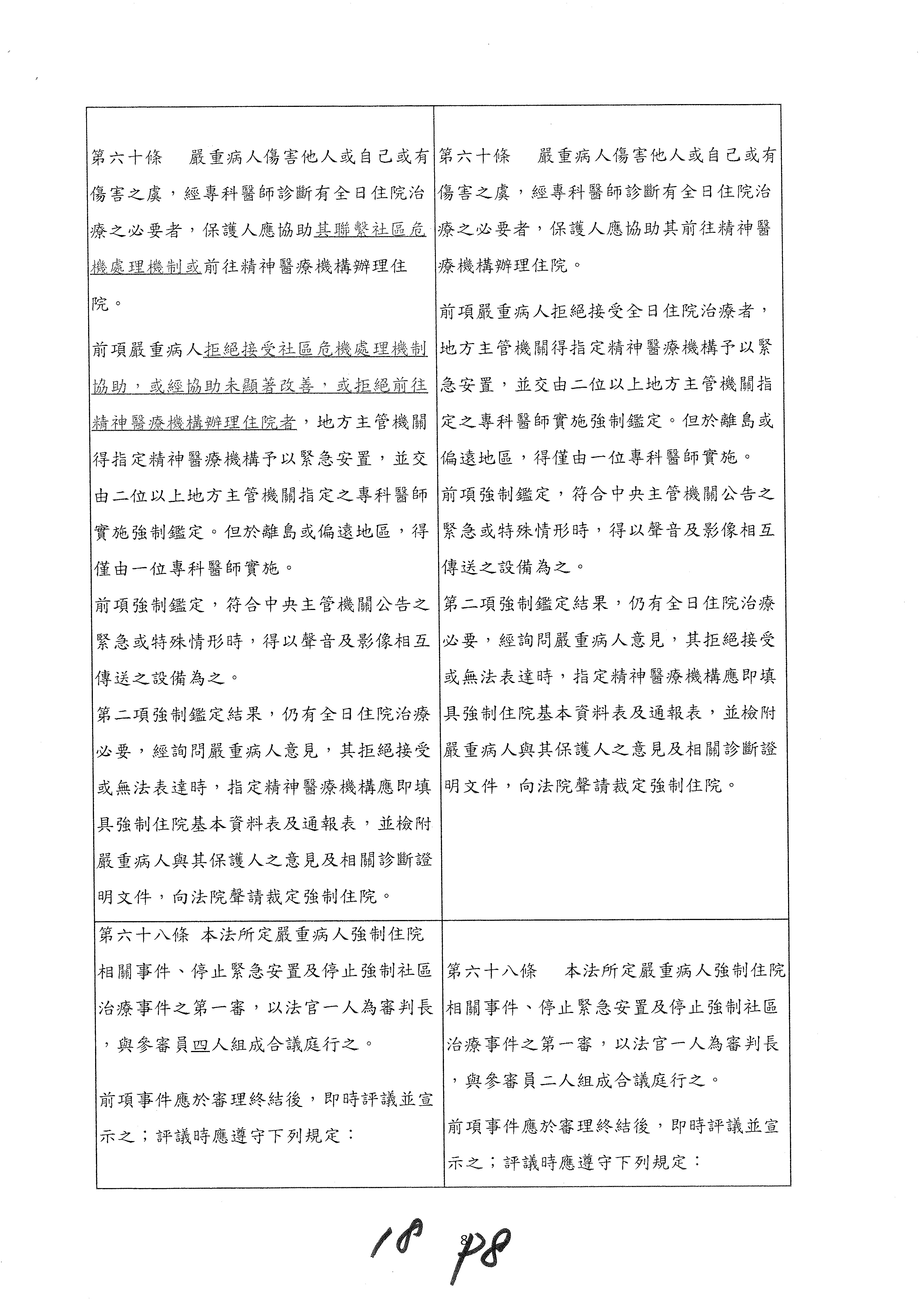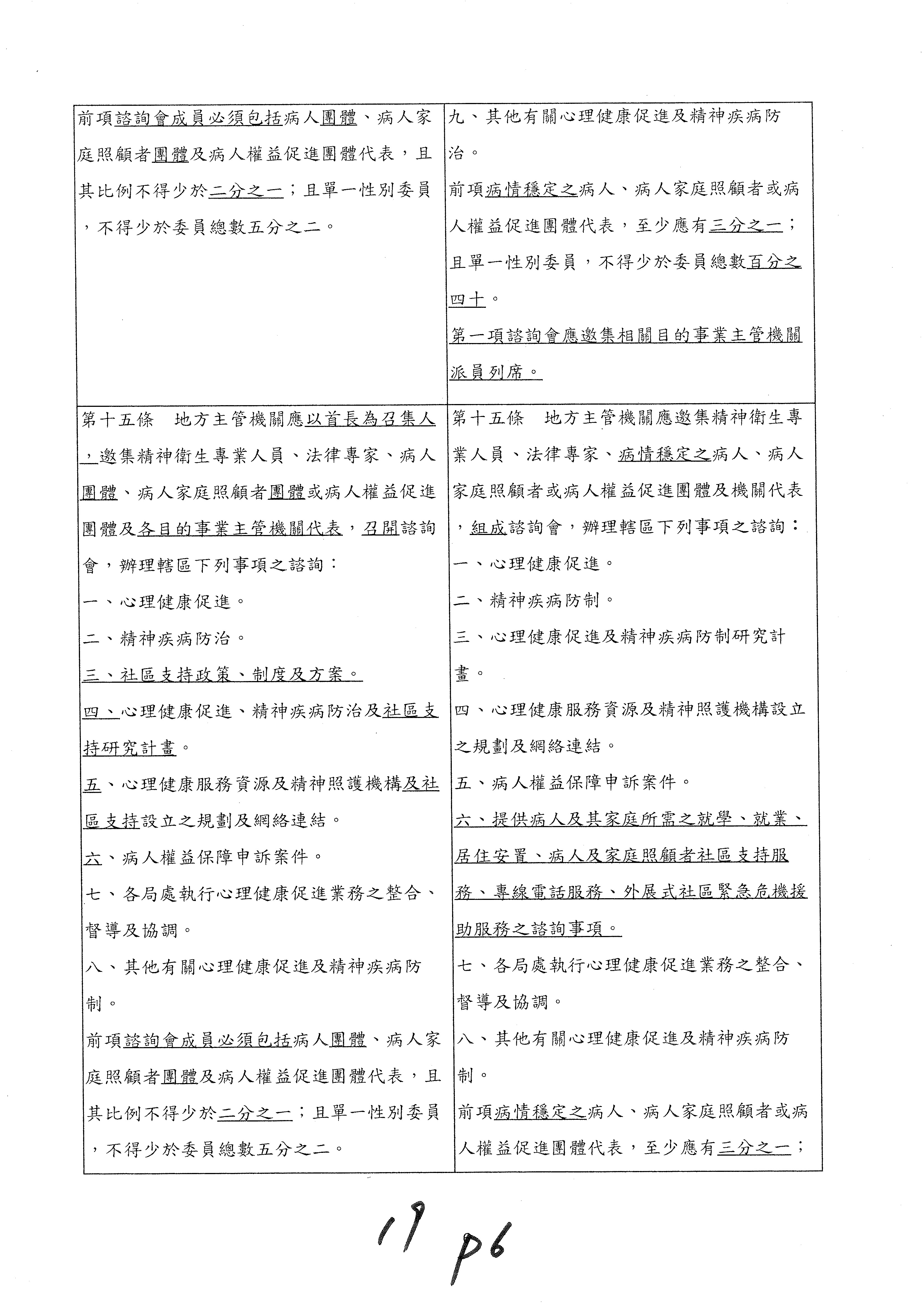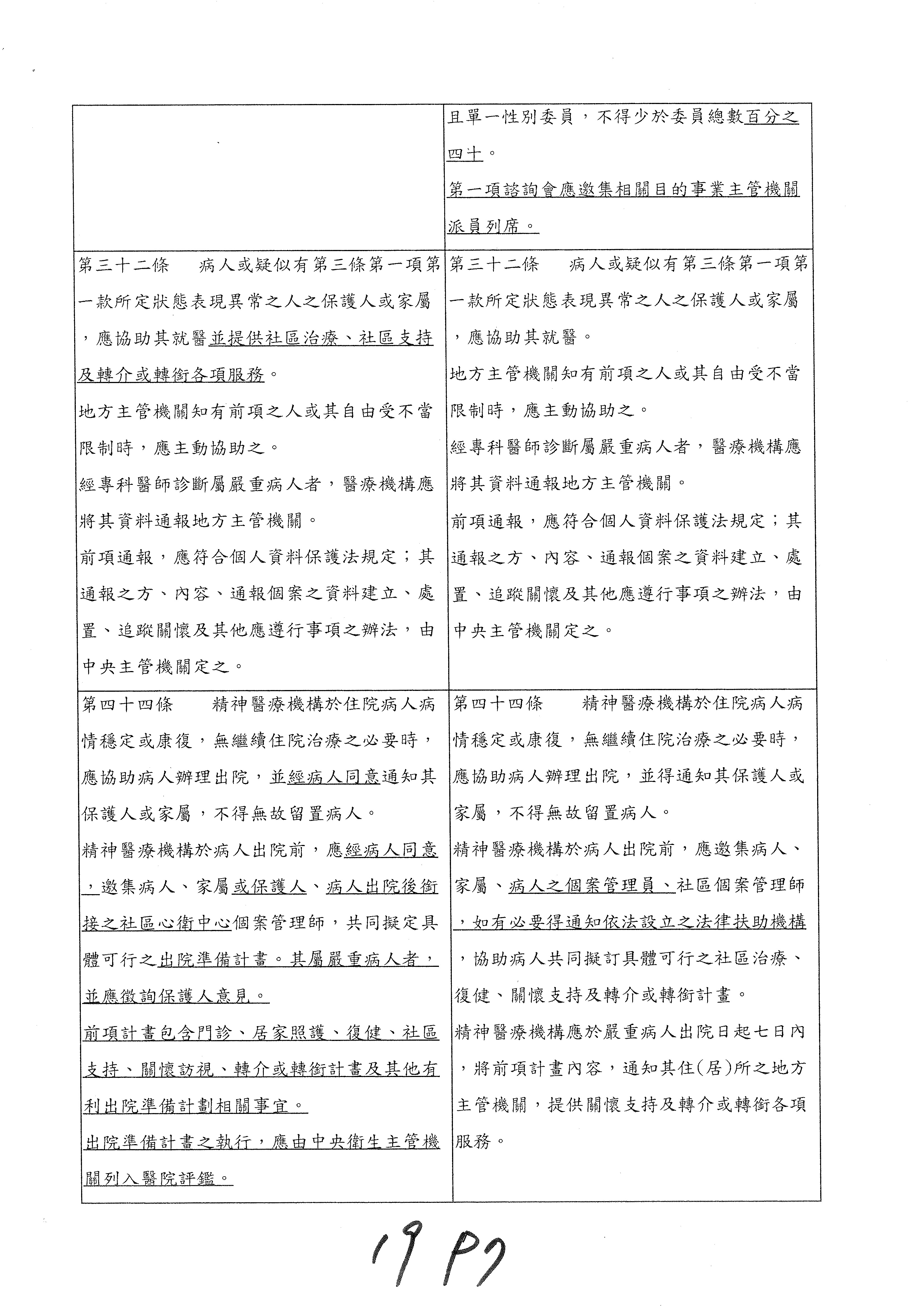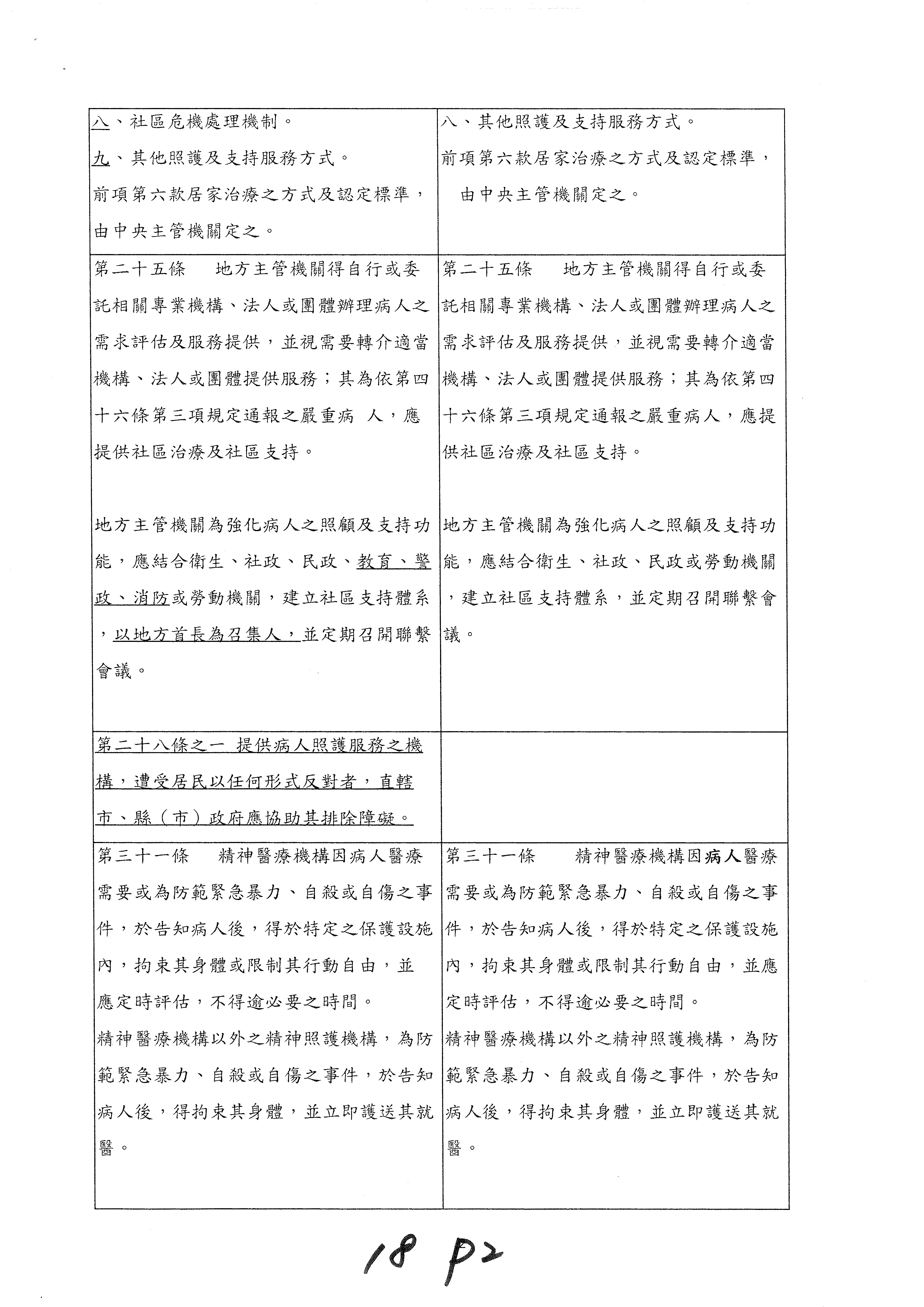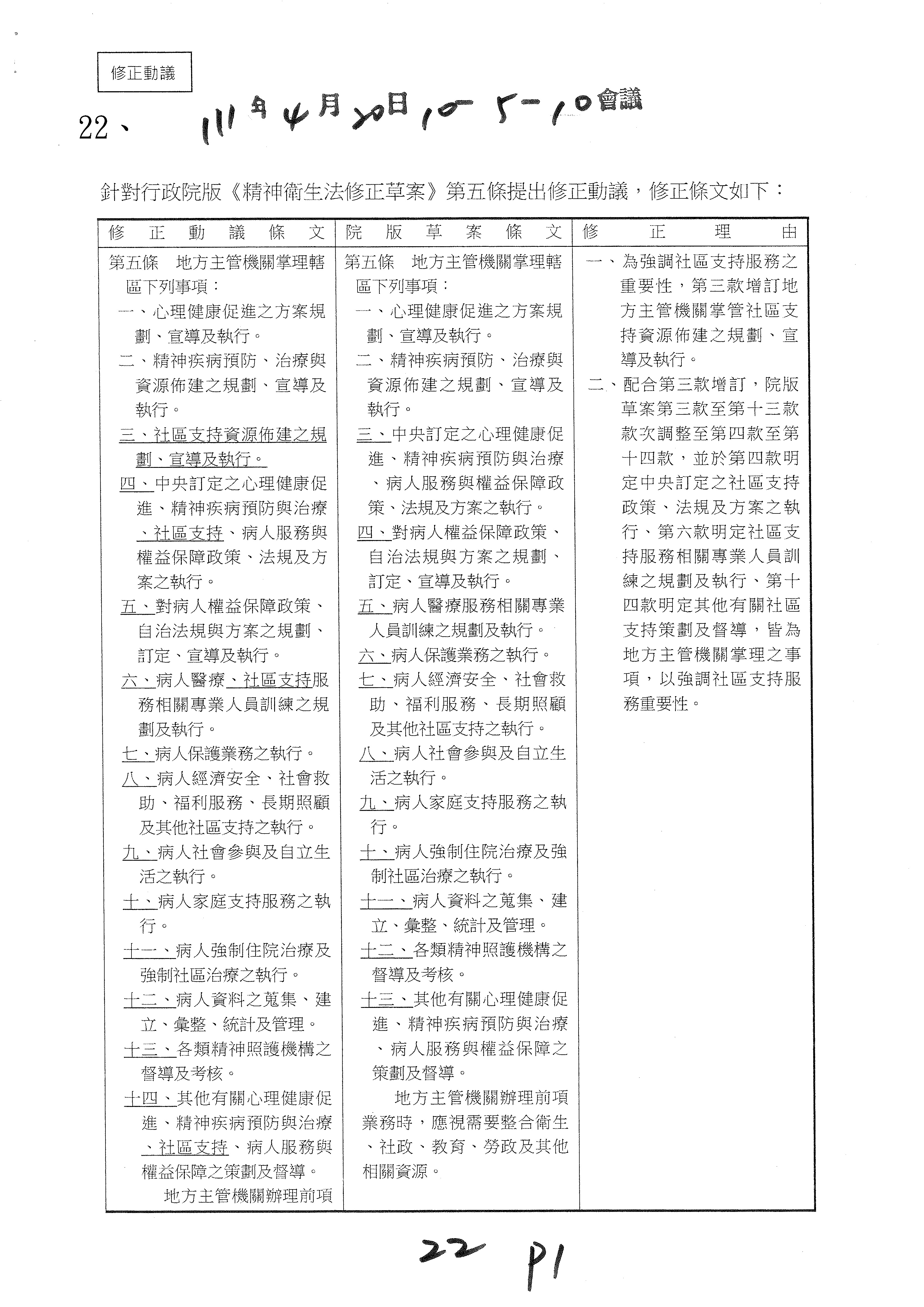 諶司長立中:第二十二條的內容是針對精神復健機構的設立及管理,我們是配合原來的第二十一條第一項各款移列修正,包括修正第三條第八款到第十款,統一定義,修整成現在的第二十二條,跟原來的行政院版本稍微有一點修正。這邊主要是針對精神復健機構的設立及管理。