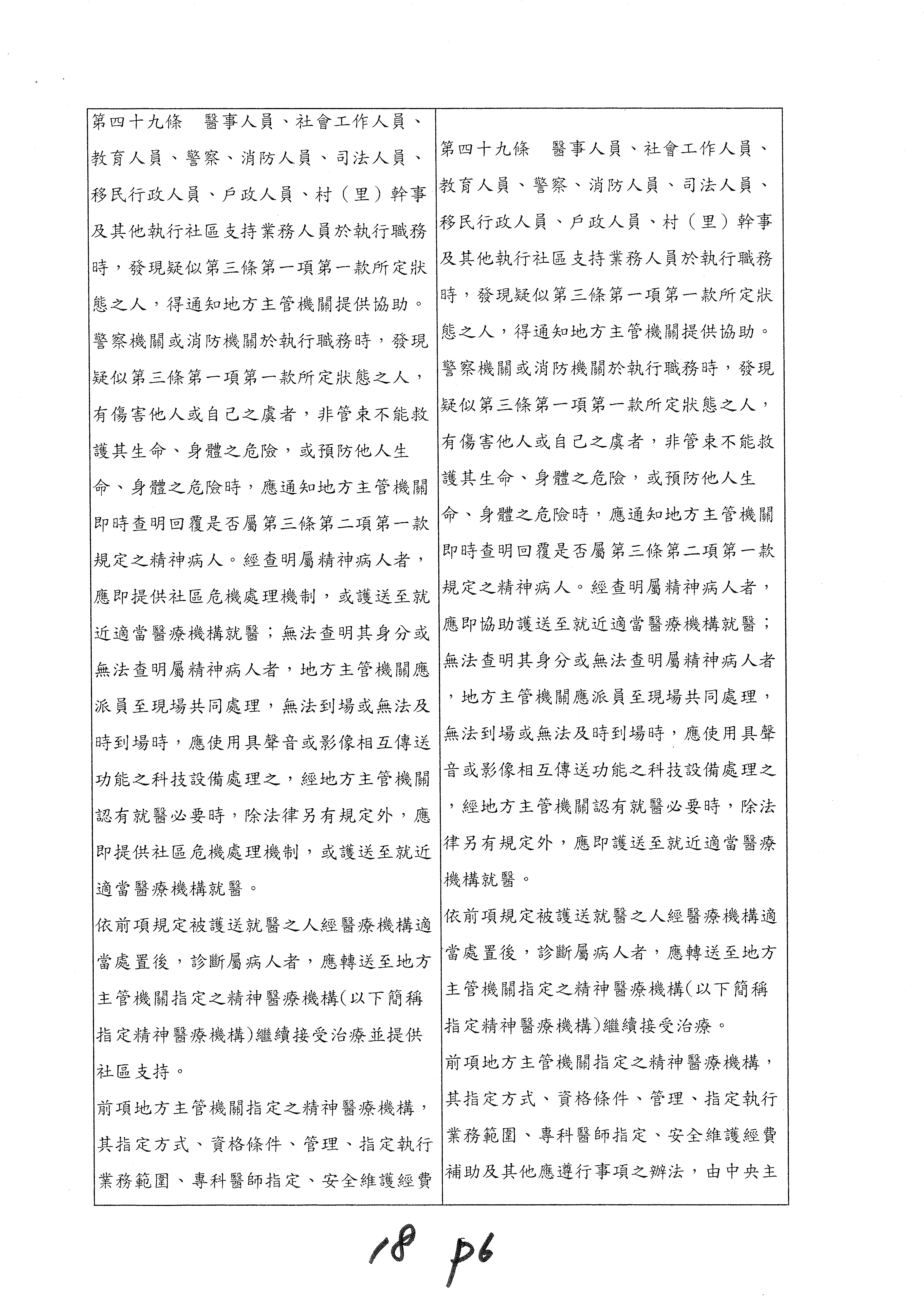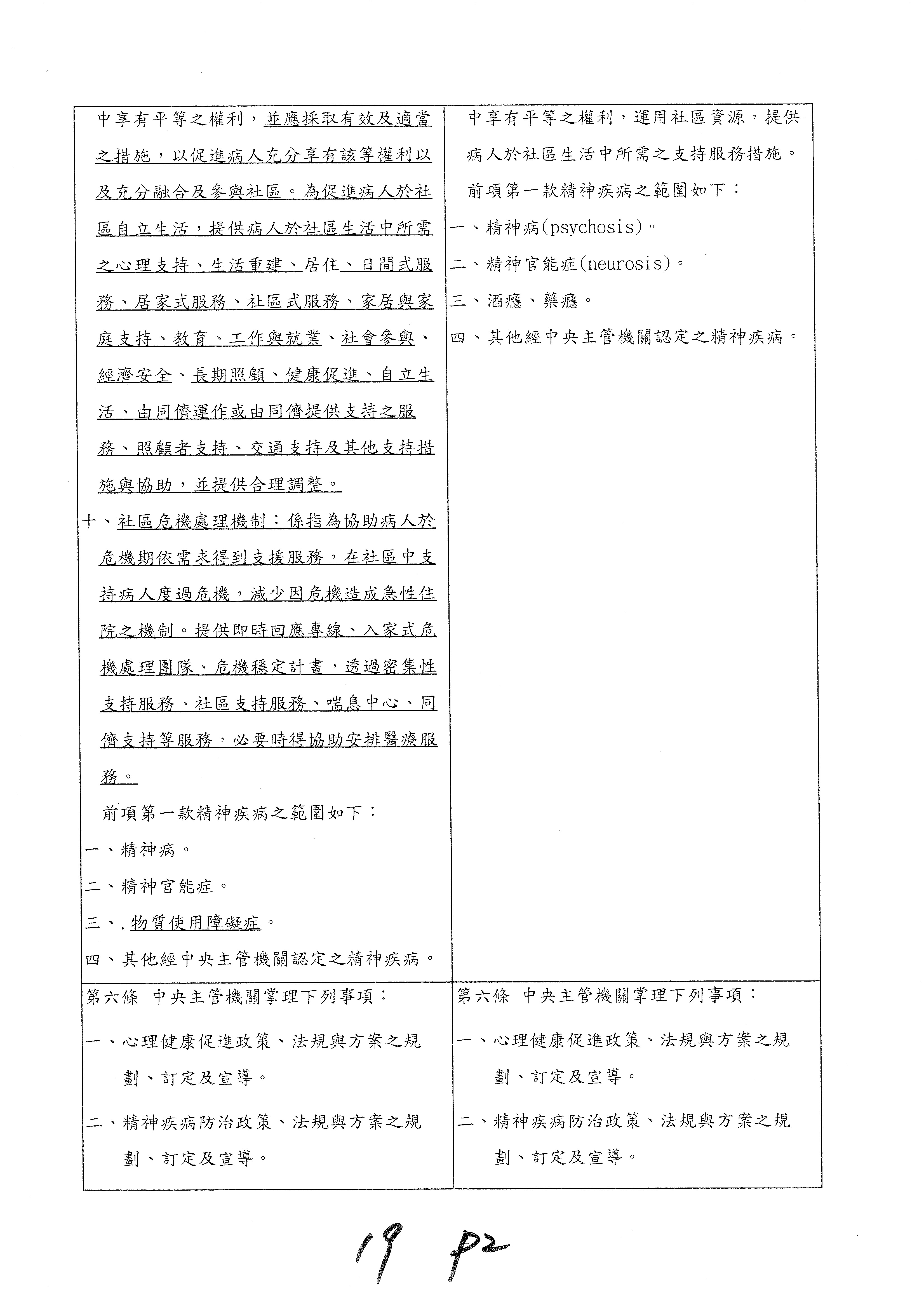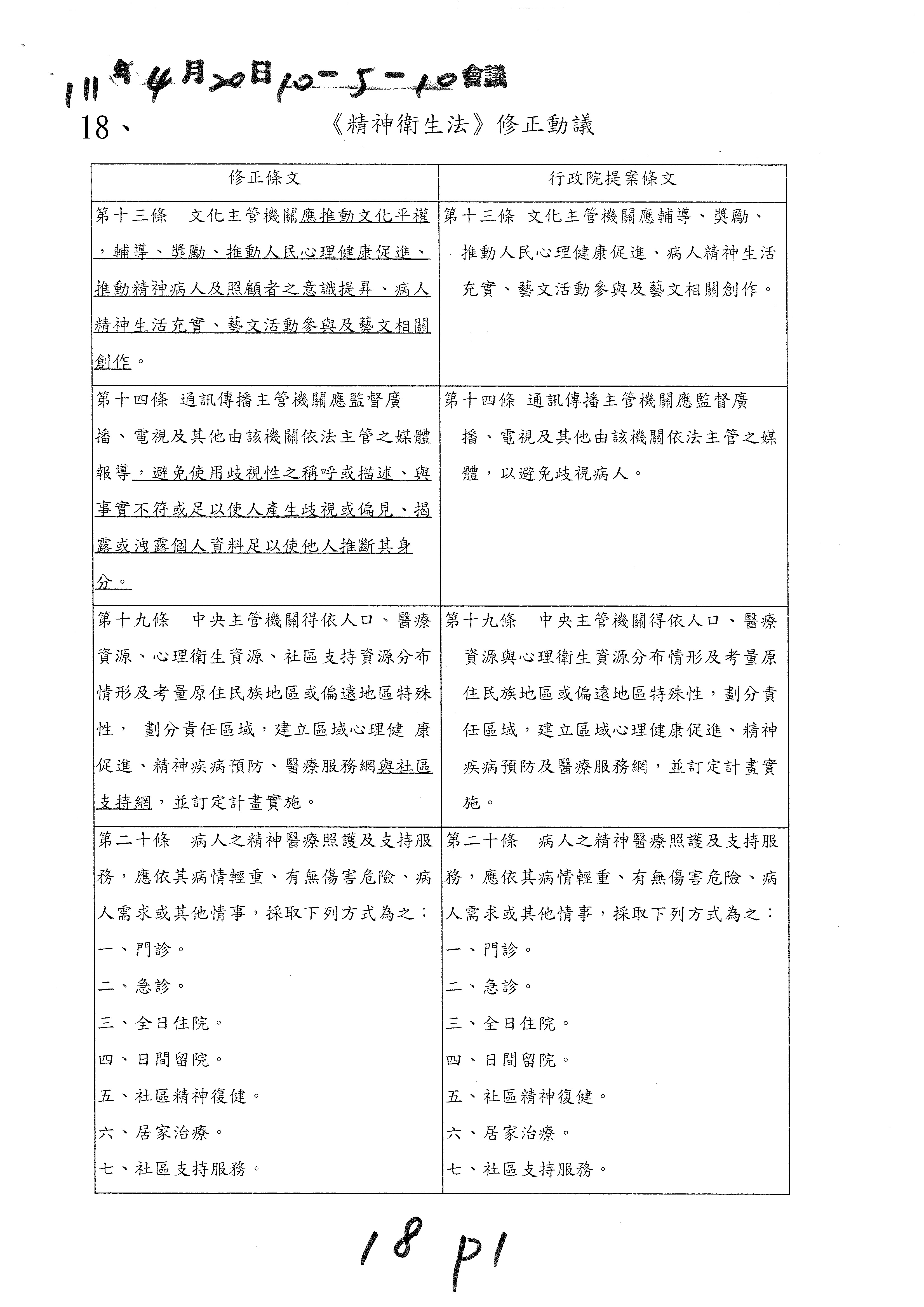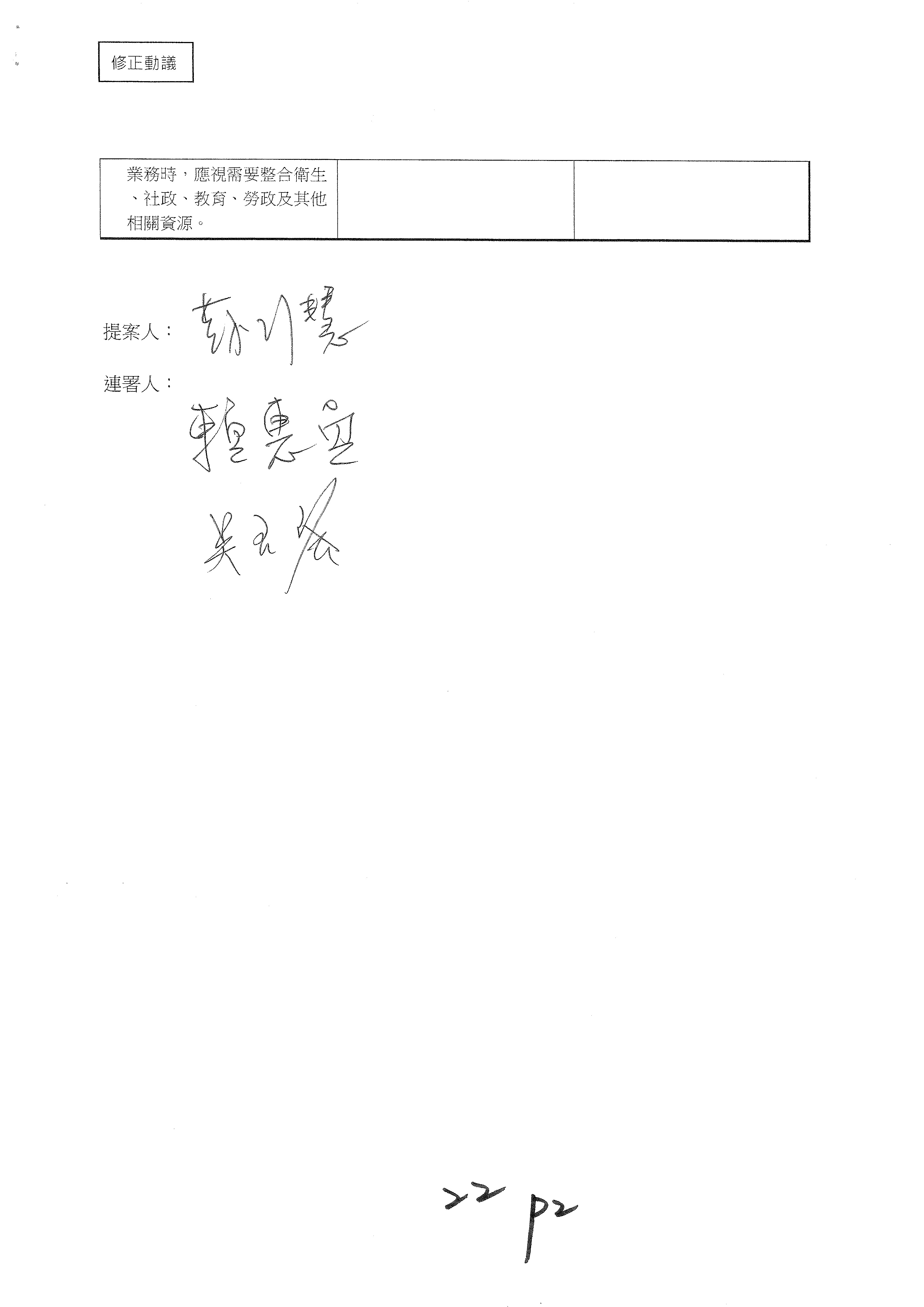 諶司長立中:第二十二條的內容是針對精神復健機構的設立及管理,我們是配合原來的第二十一條第一項各款移列修正,包括修正第三條第八款到第十款,統一定義,修整成現在的第二十二條,跟原來的行政院版本稍微有一點修正。這邊主要是針對精神復健機構的設立及管理。