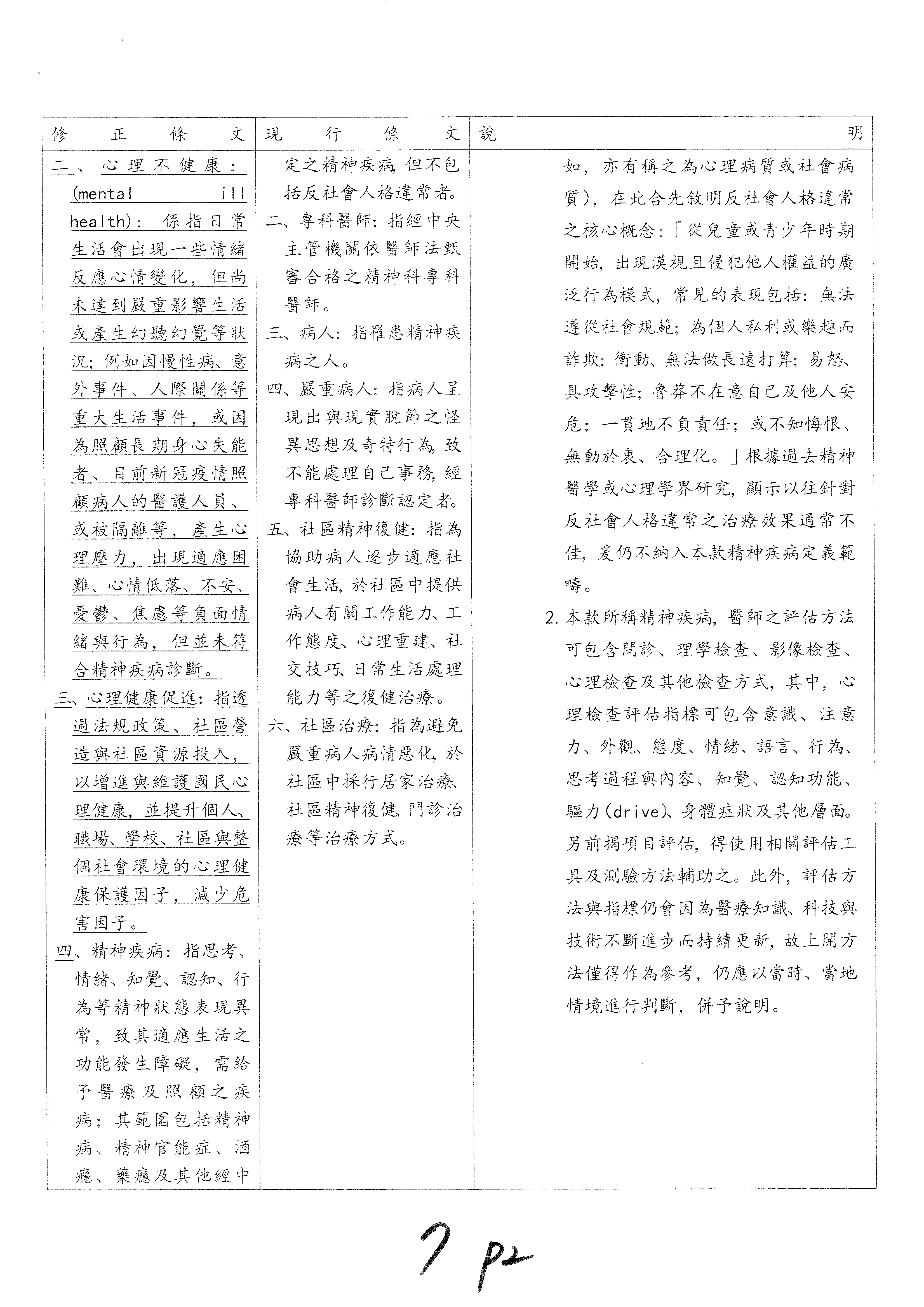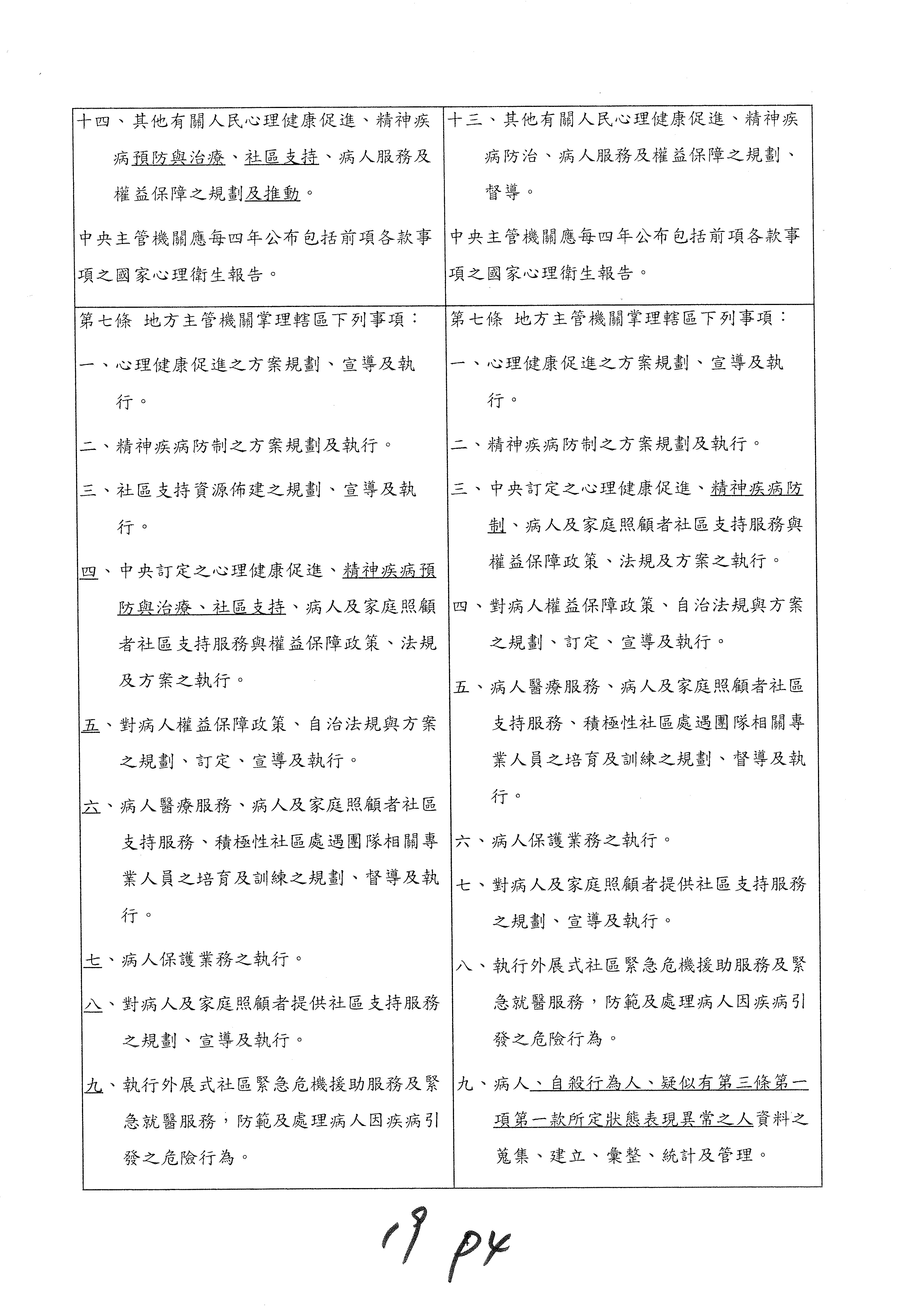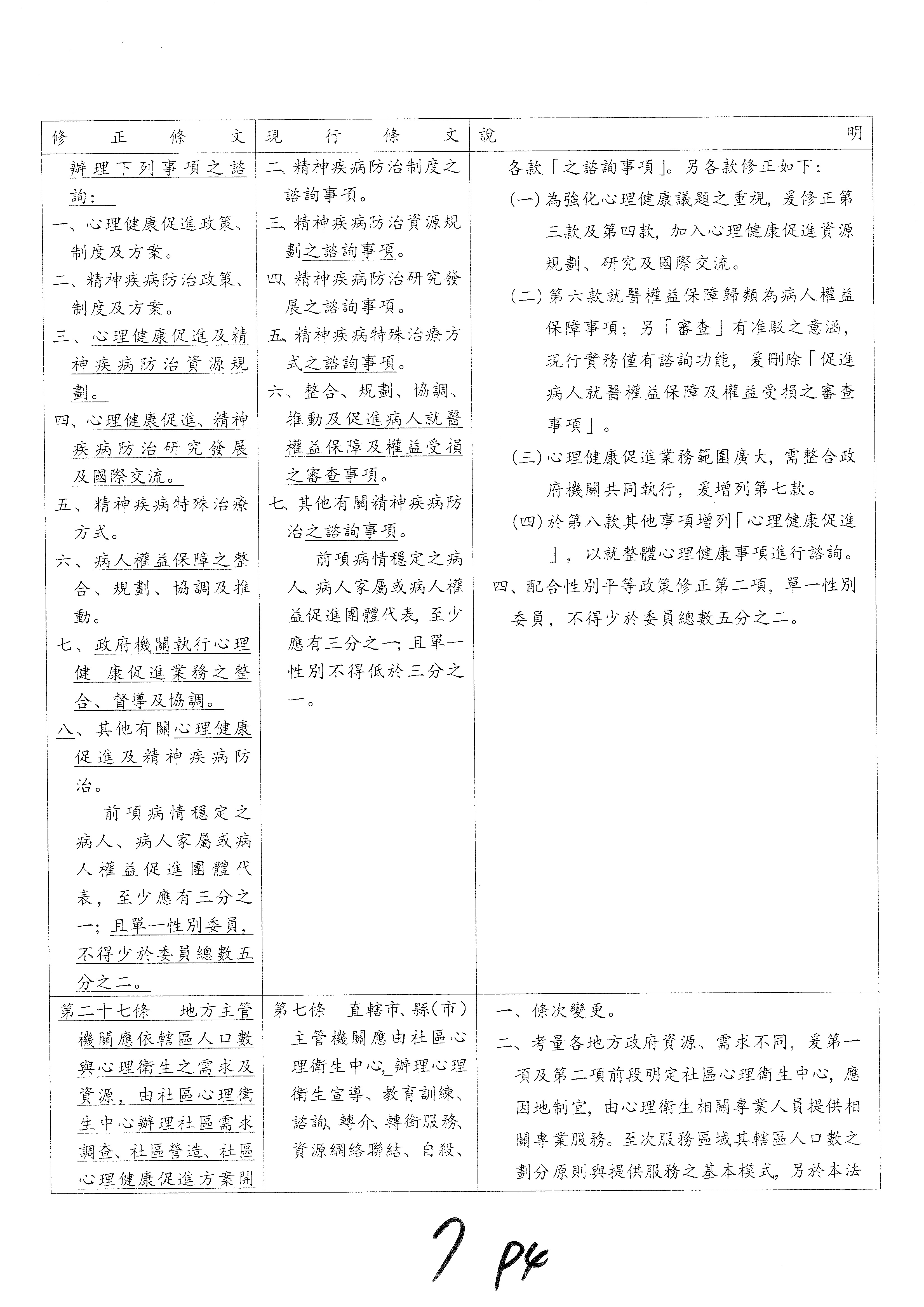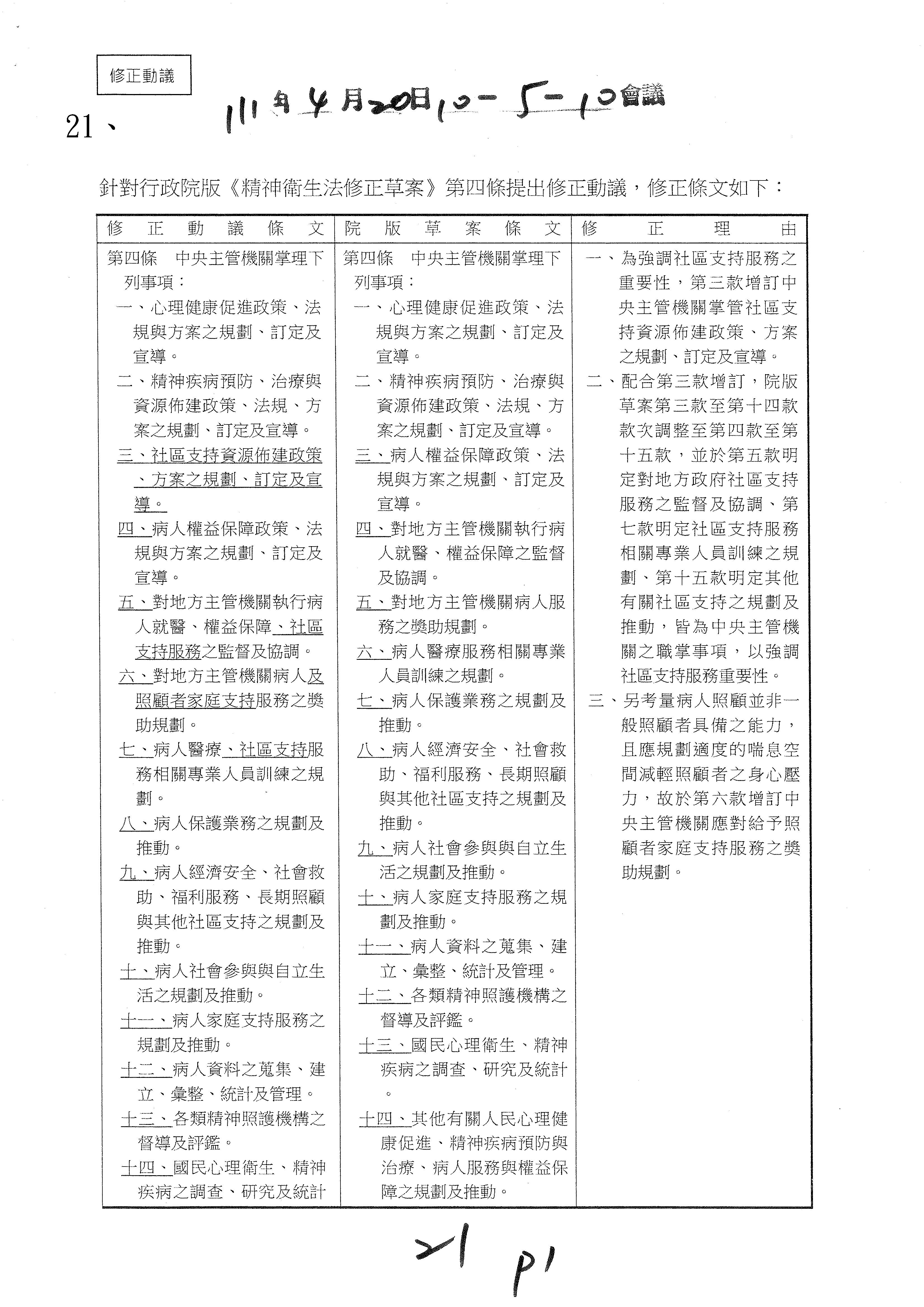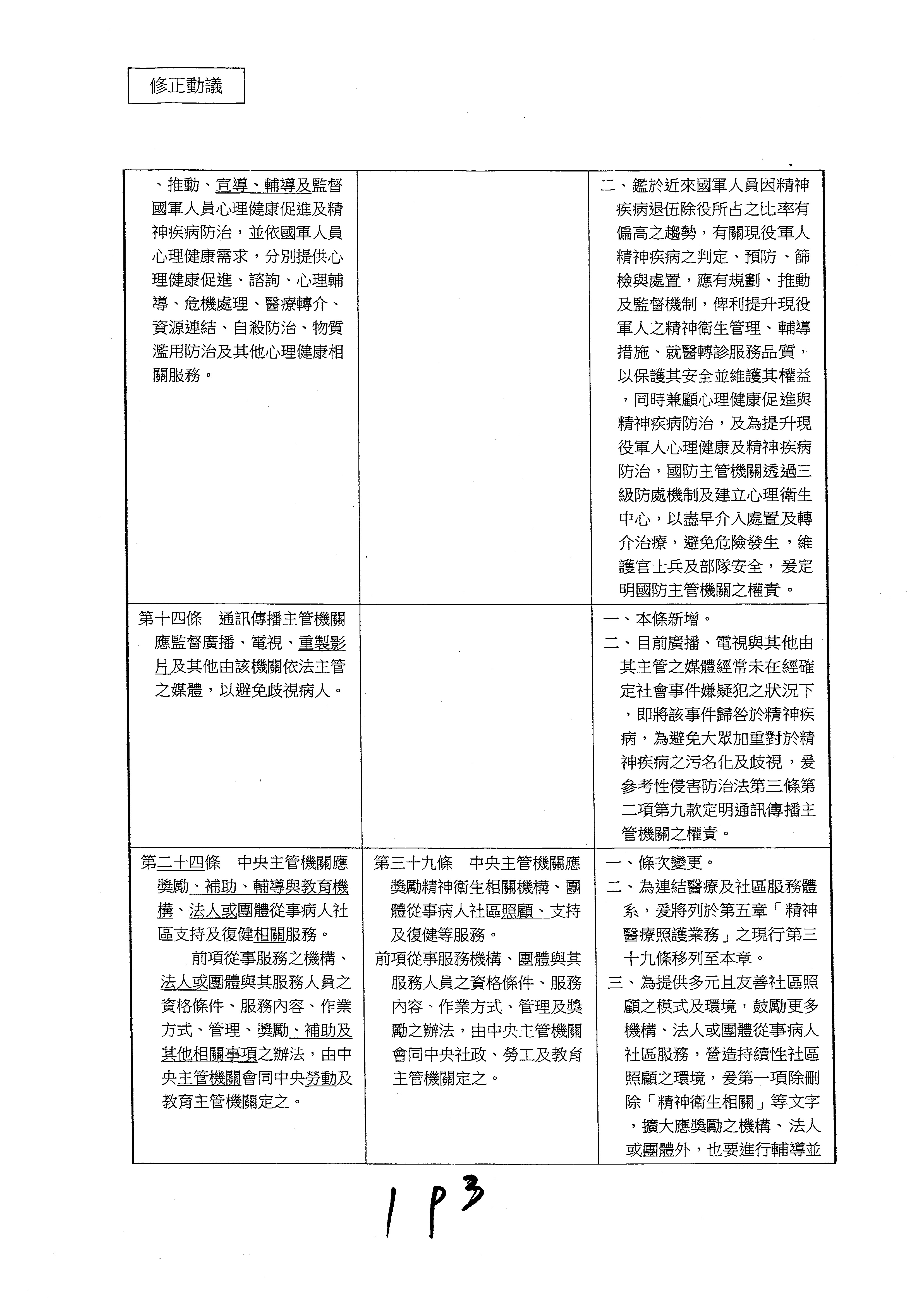 諶司長立中:第二十二條的內容是針對精神復健機構的設立及管理,我們是配合原來的第二十一條第一項各款移列修正,包括修正第三條第八款到第十款,統一定義,修整成現在的第二十二條,跟原來的行政院版本稍微有一點修正。這邊主要是針對精神復健機構的設立及管理。