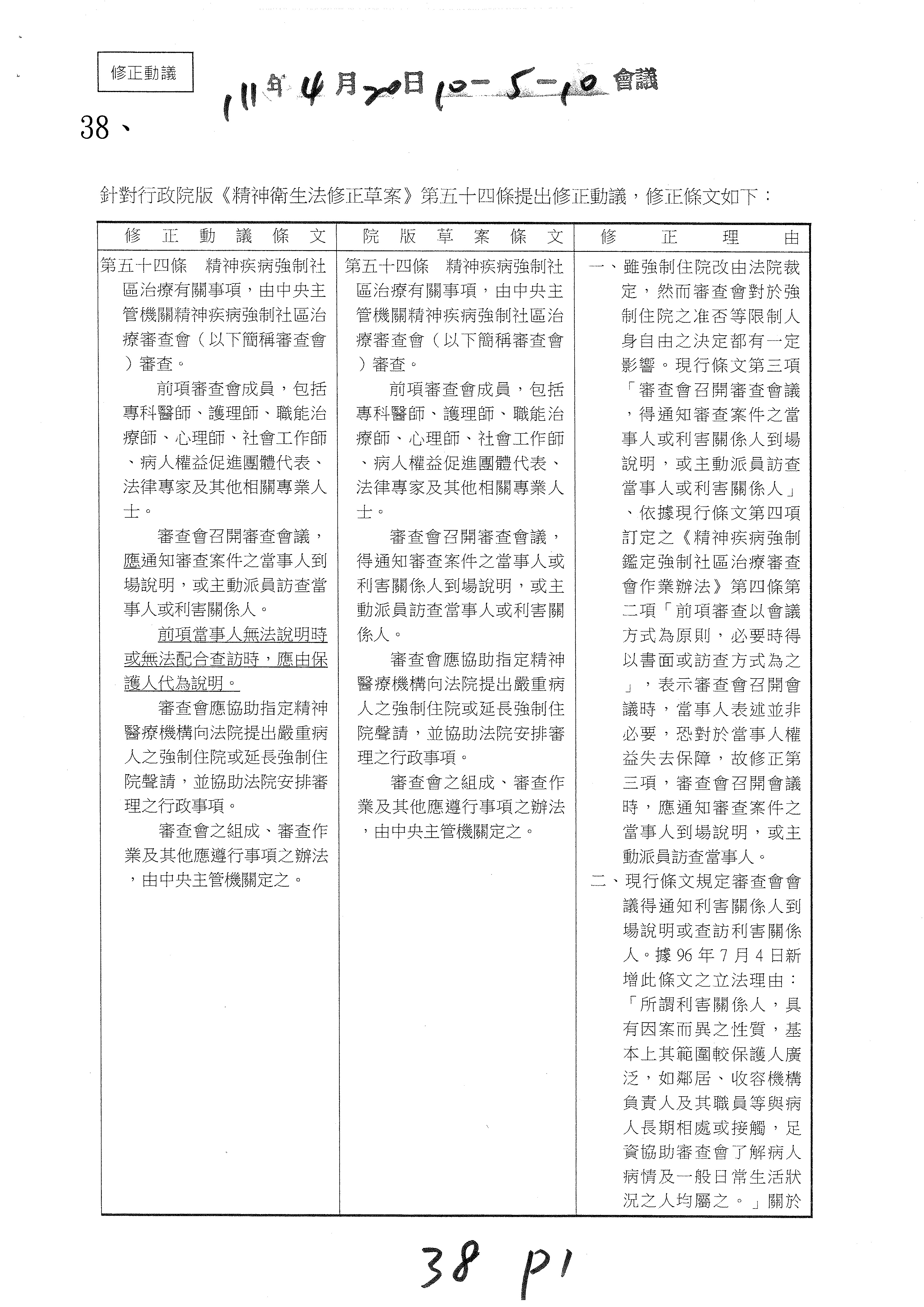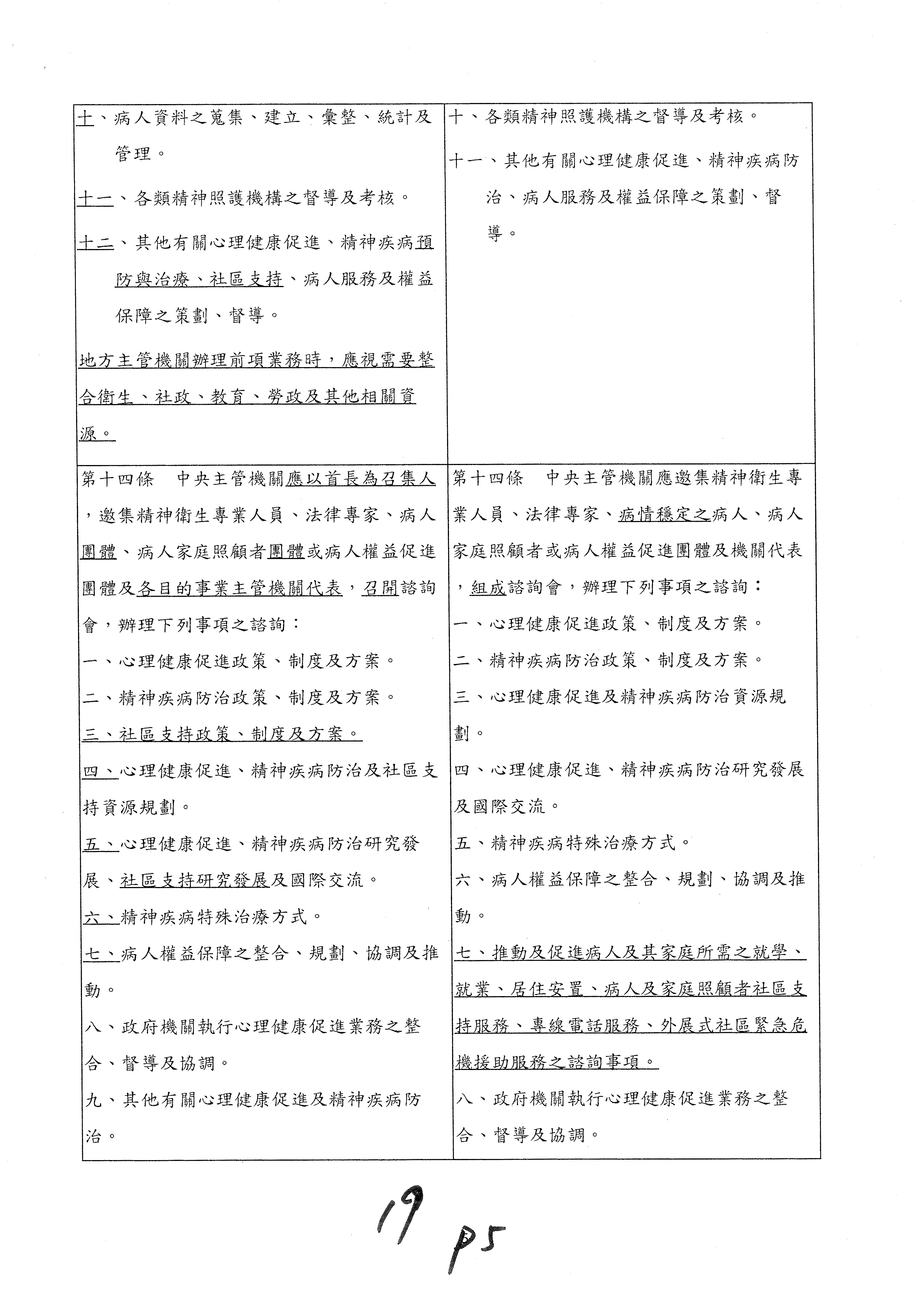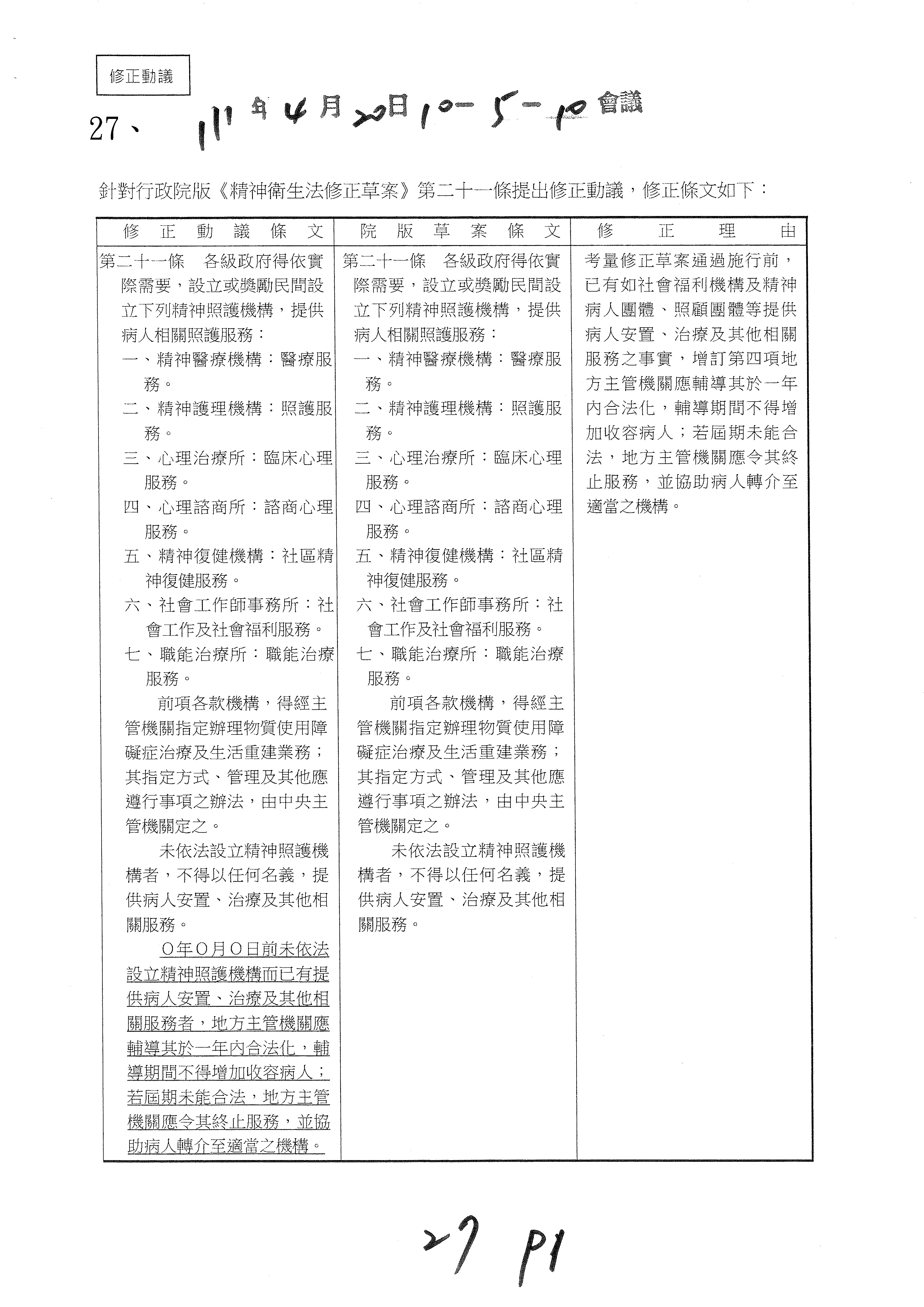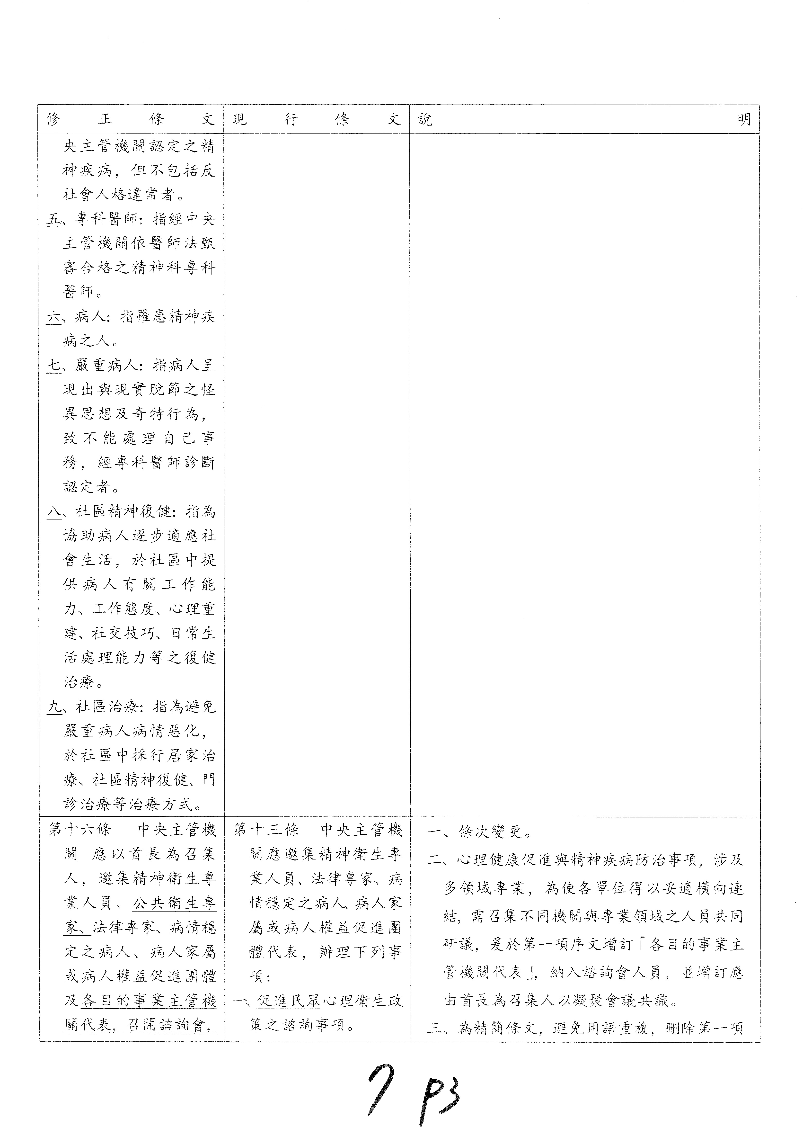 諶司長立中:第二十二條的內容是針對精神復健機構的設立及管理,我們是配合原來的第二十一條第一項各款移列修正,包括修正第三條第八款到第十款,統一定義,修整成現在的第二十二條,跟原來的行政院版本稍微有一點修正。這邊主要是針對精神復健機構的設立及管理。