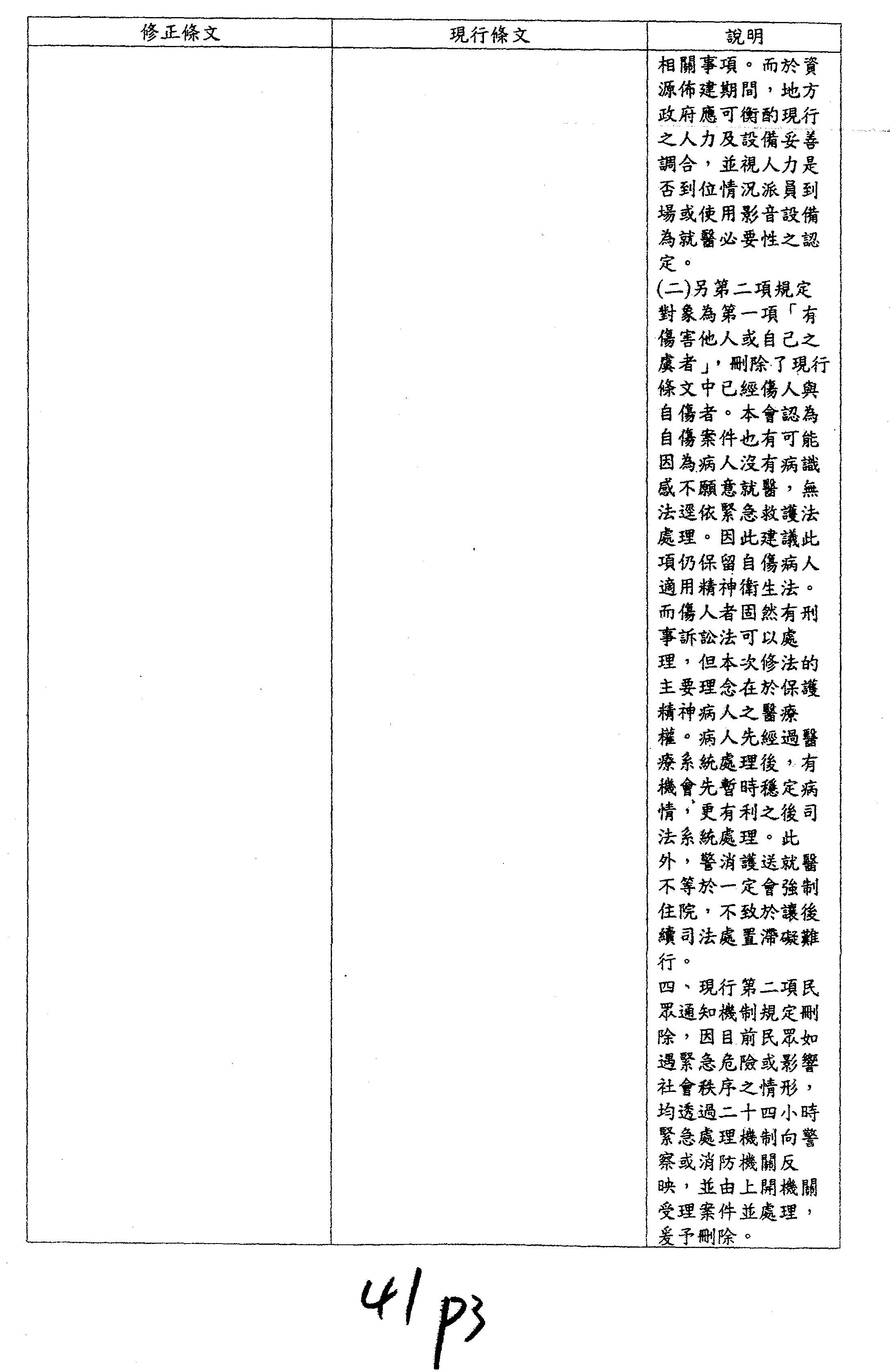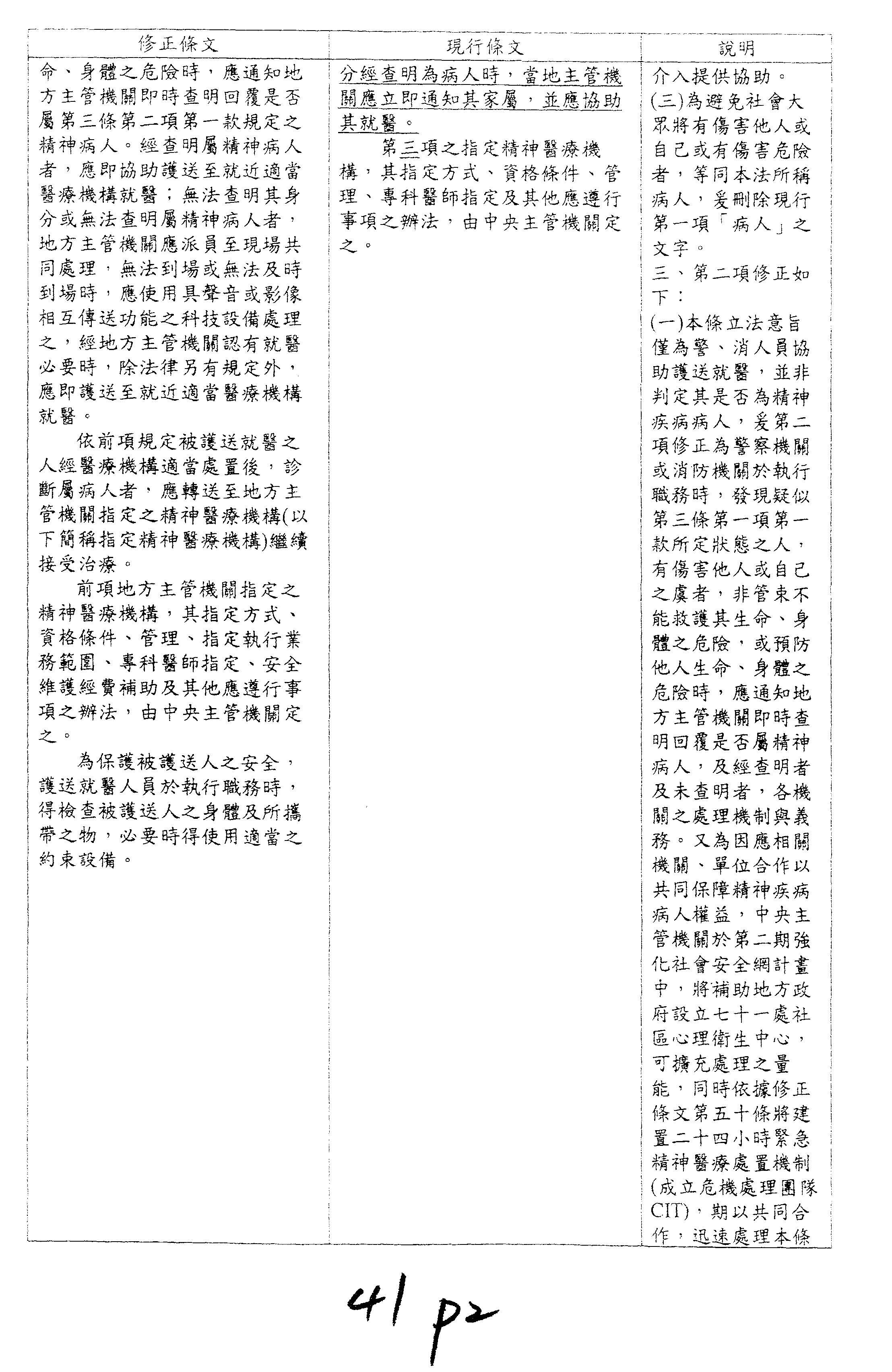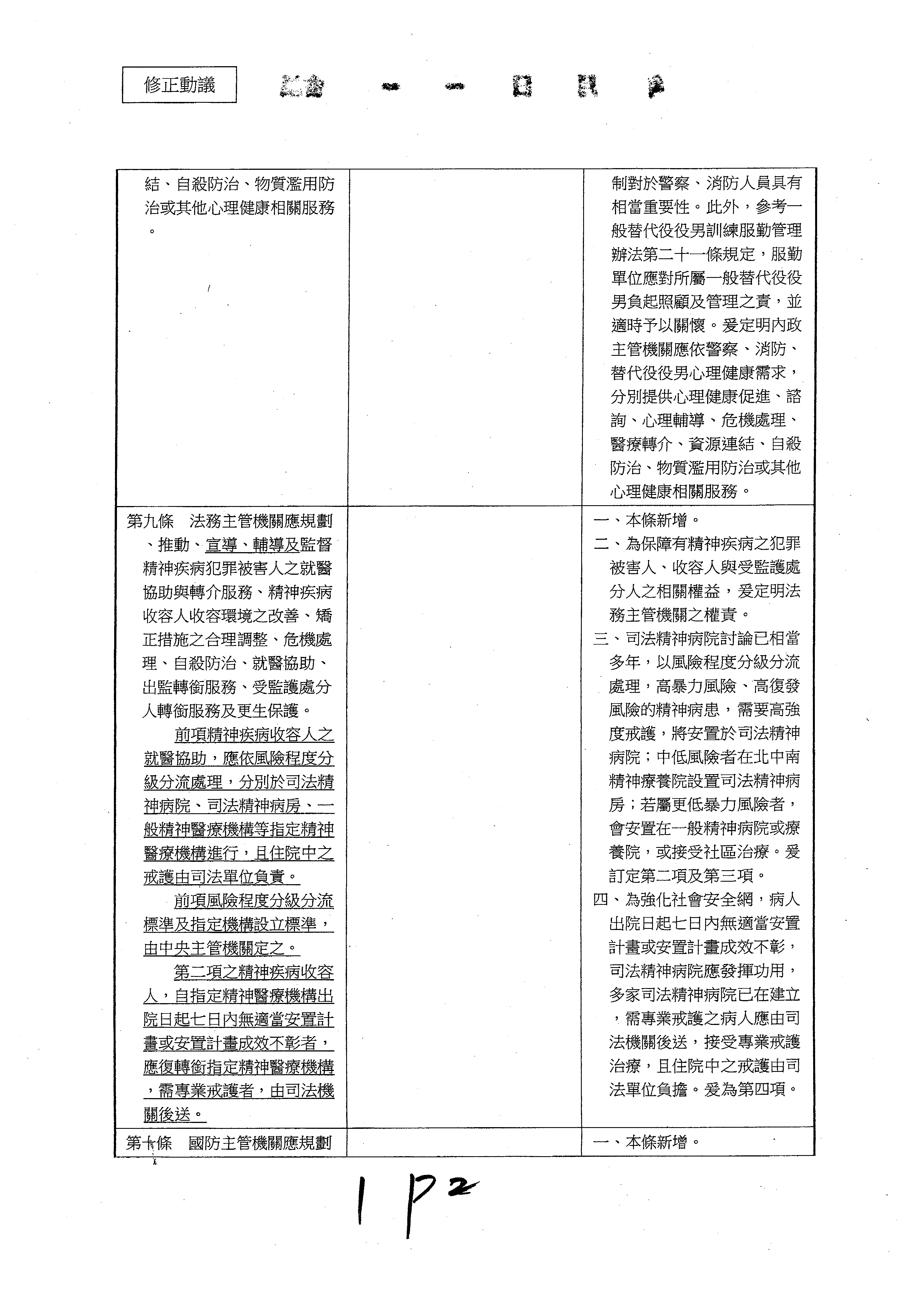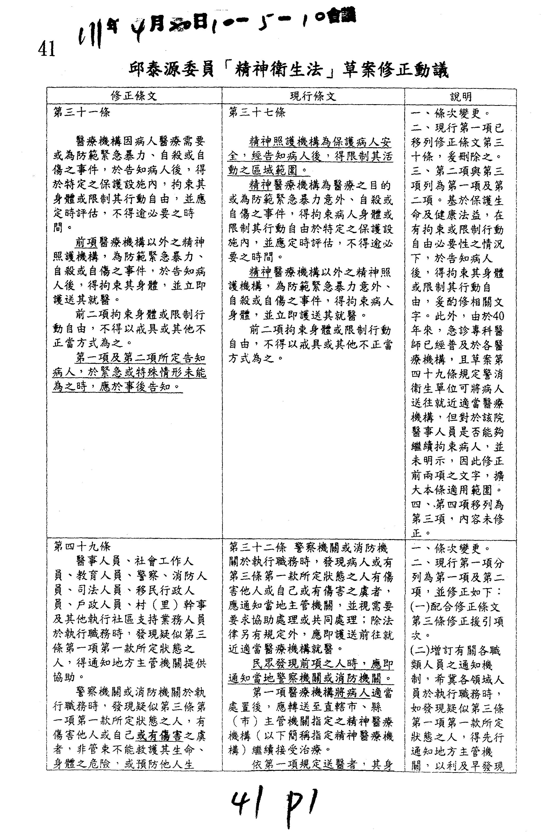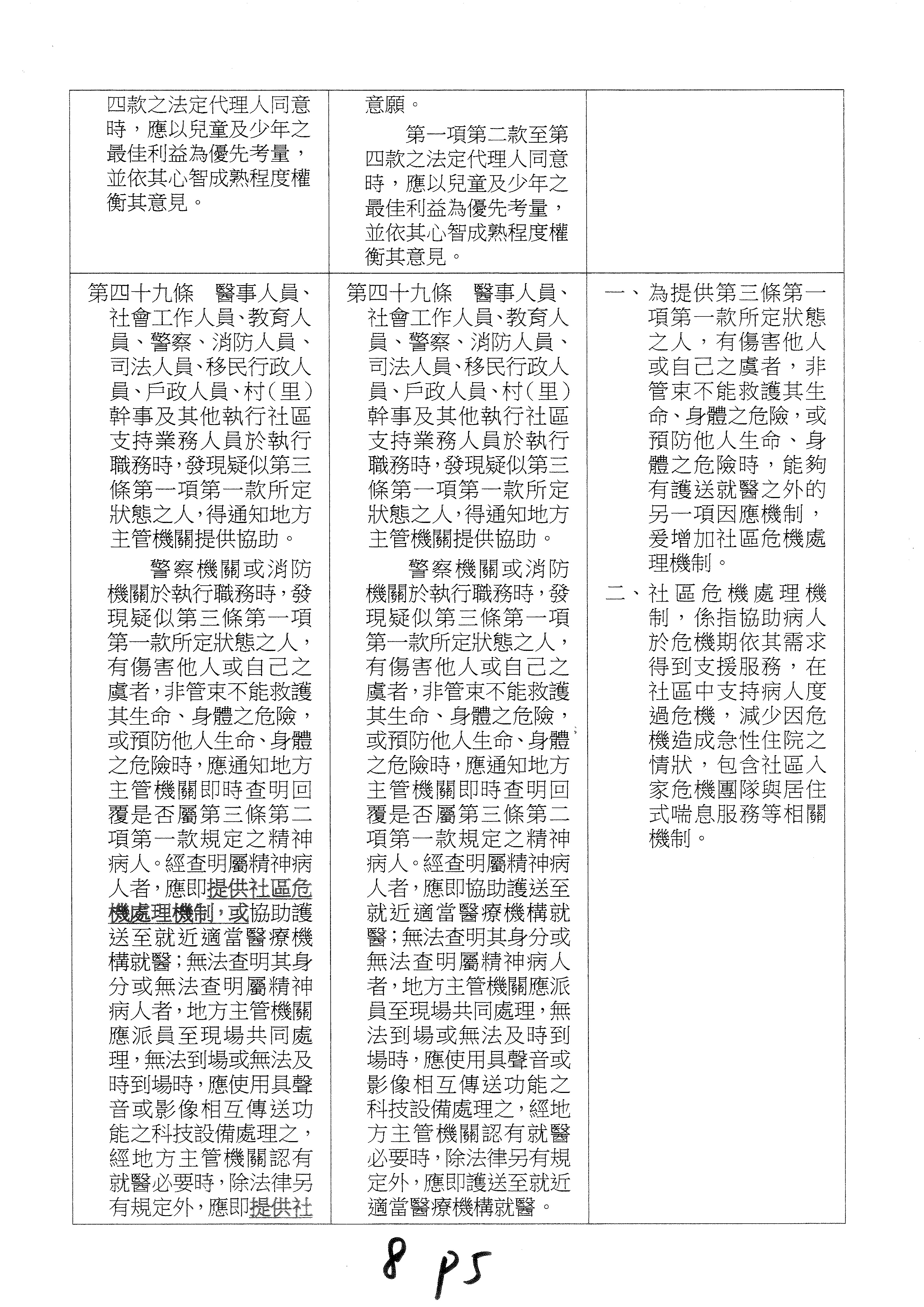 諶司長立中:第二十二條的內容是針對精神復健機構的設立及管理,我們是配合原來的第二十一條第一項各款移列修正,包括修正第三條第八款到第十款,統一定義,修整成現在的第二十二條,跟原來的行政院版本稍微有一點修正。這邊主要是針對精神復健機構的設立及管理。