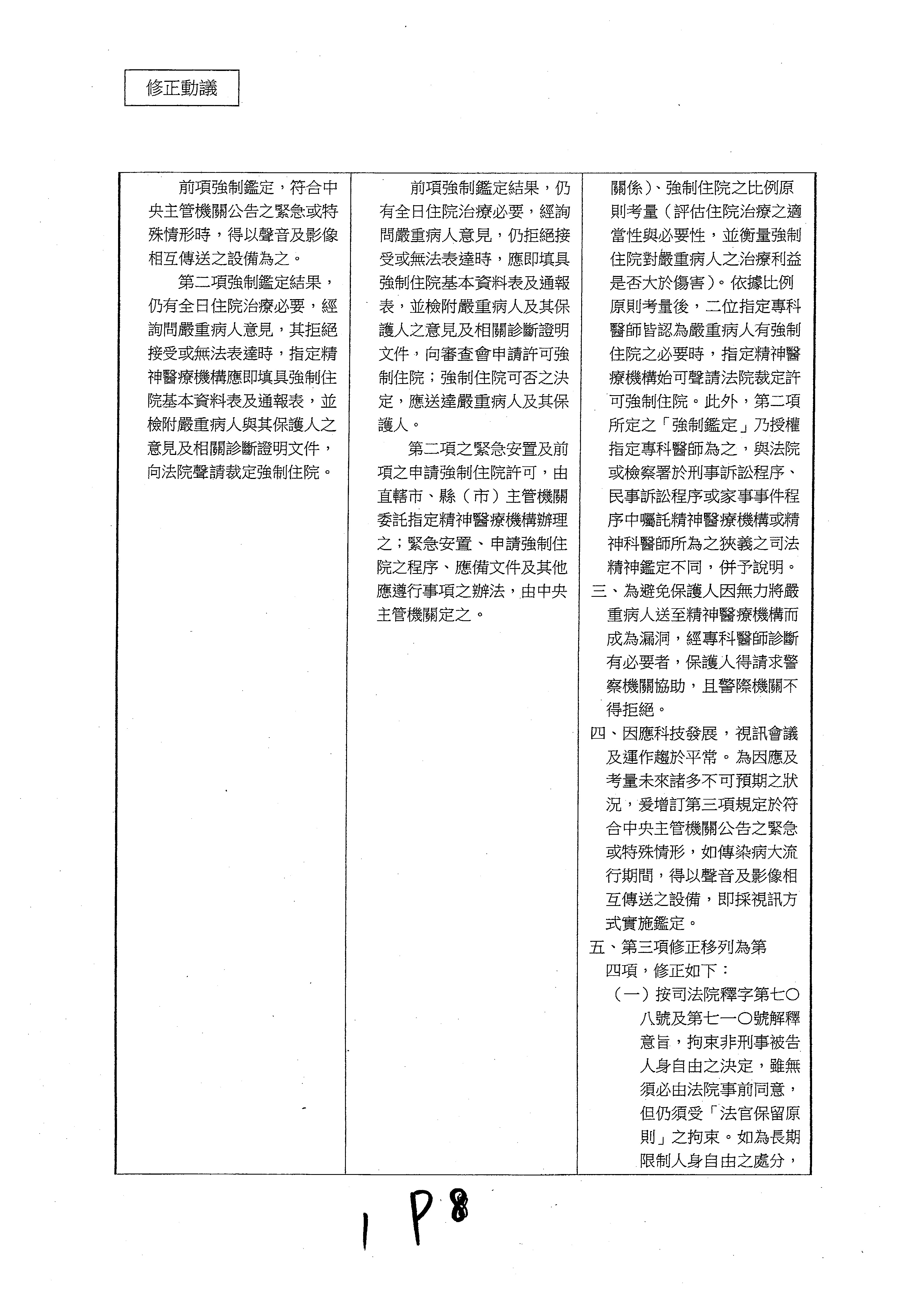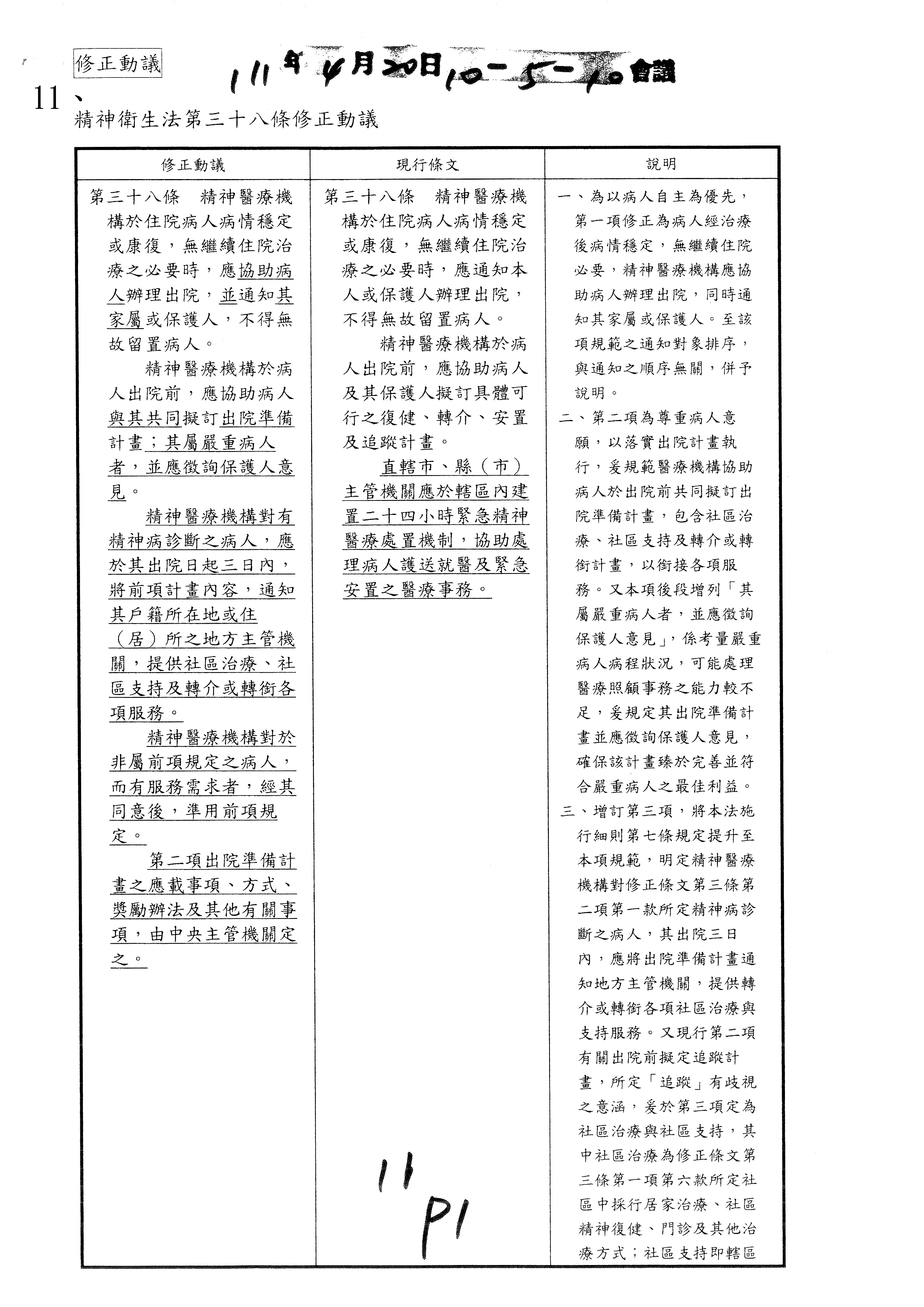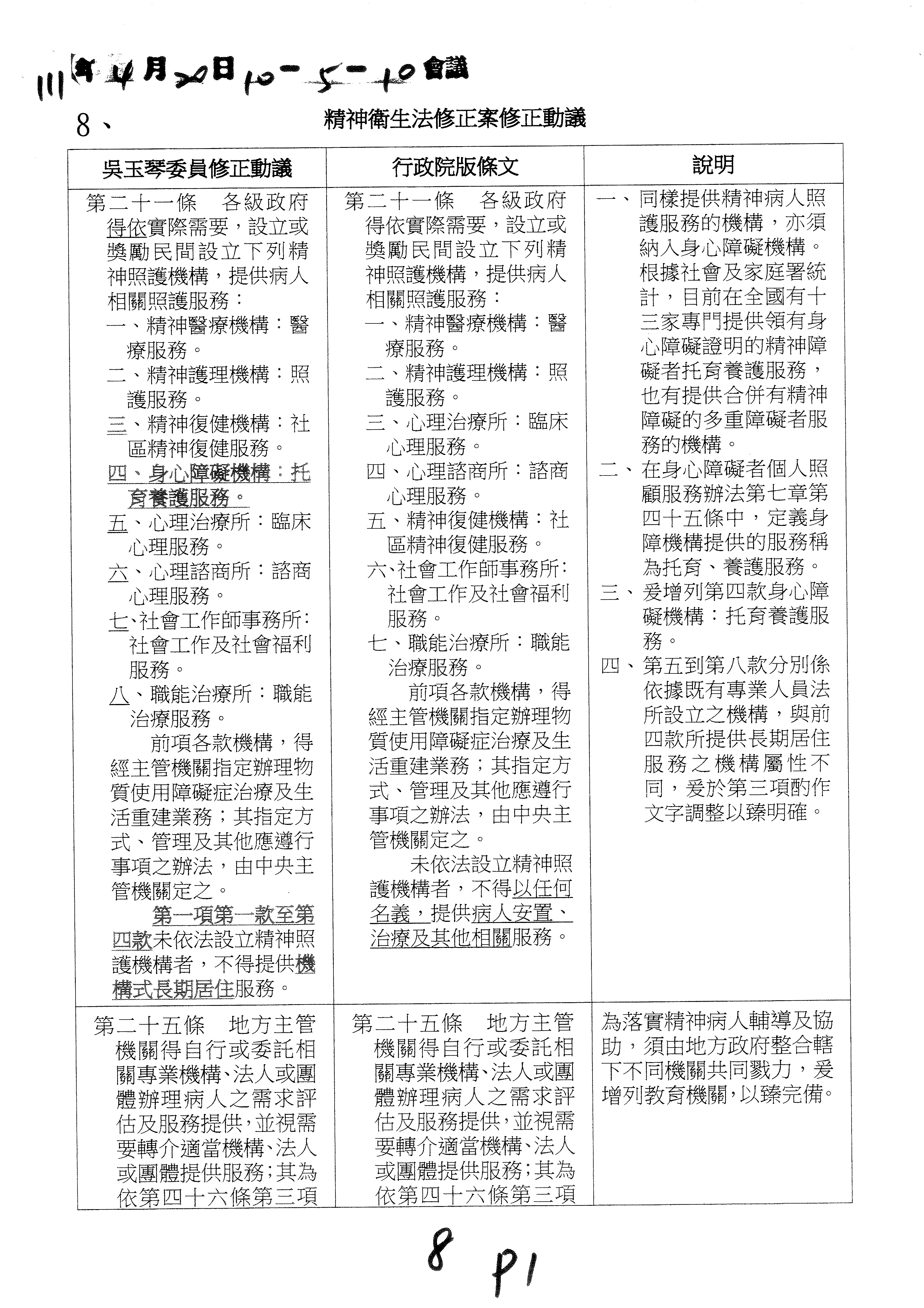 王委員婉諭:我對內容沒有意見,但是第二十一條的寫法到底是精神復健機構,還是要依照吳玉琴委員的修正動議第一到第八款,其實這就會連動到第二十二條。
