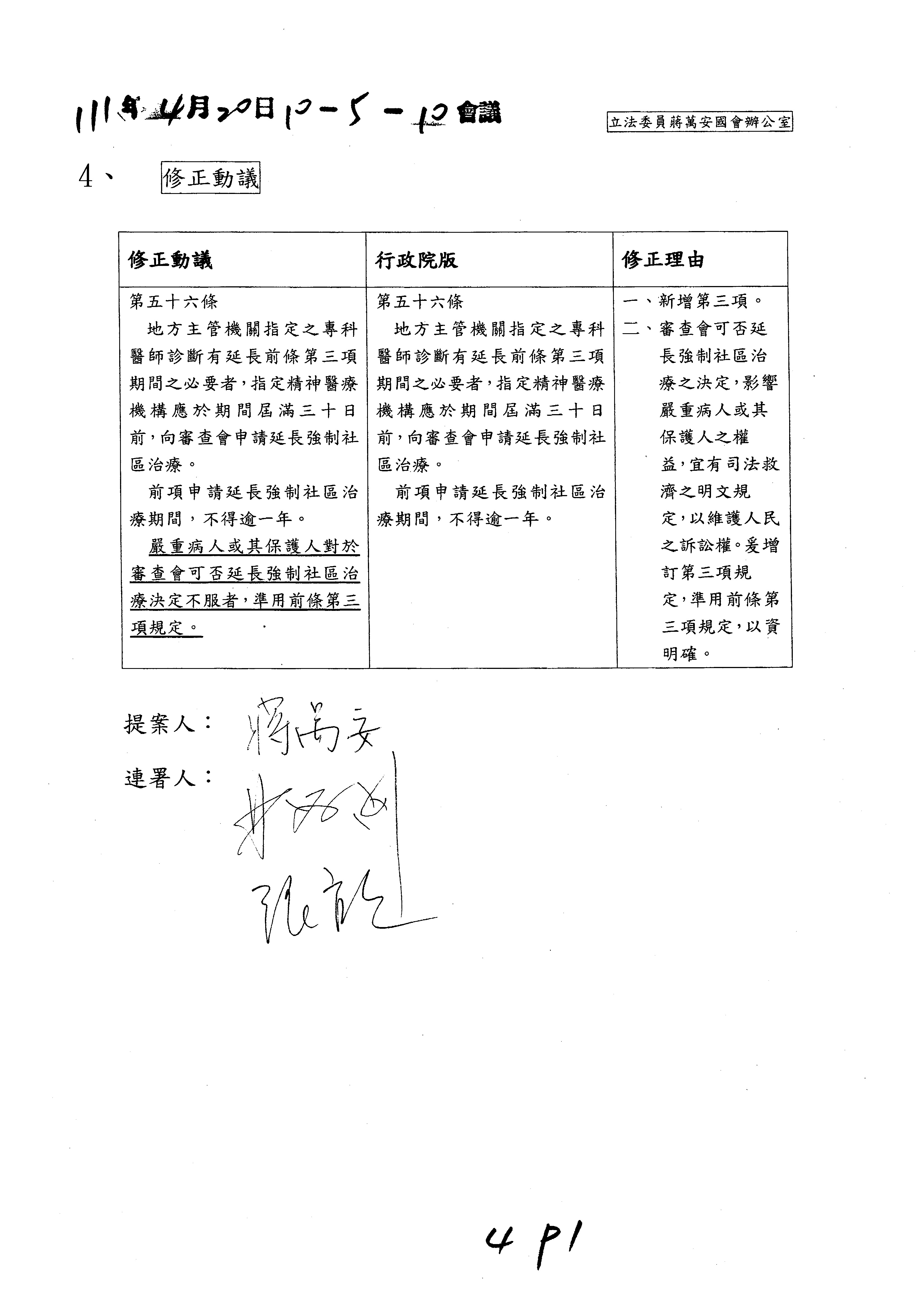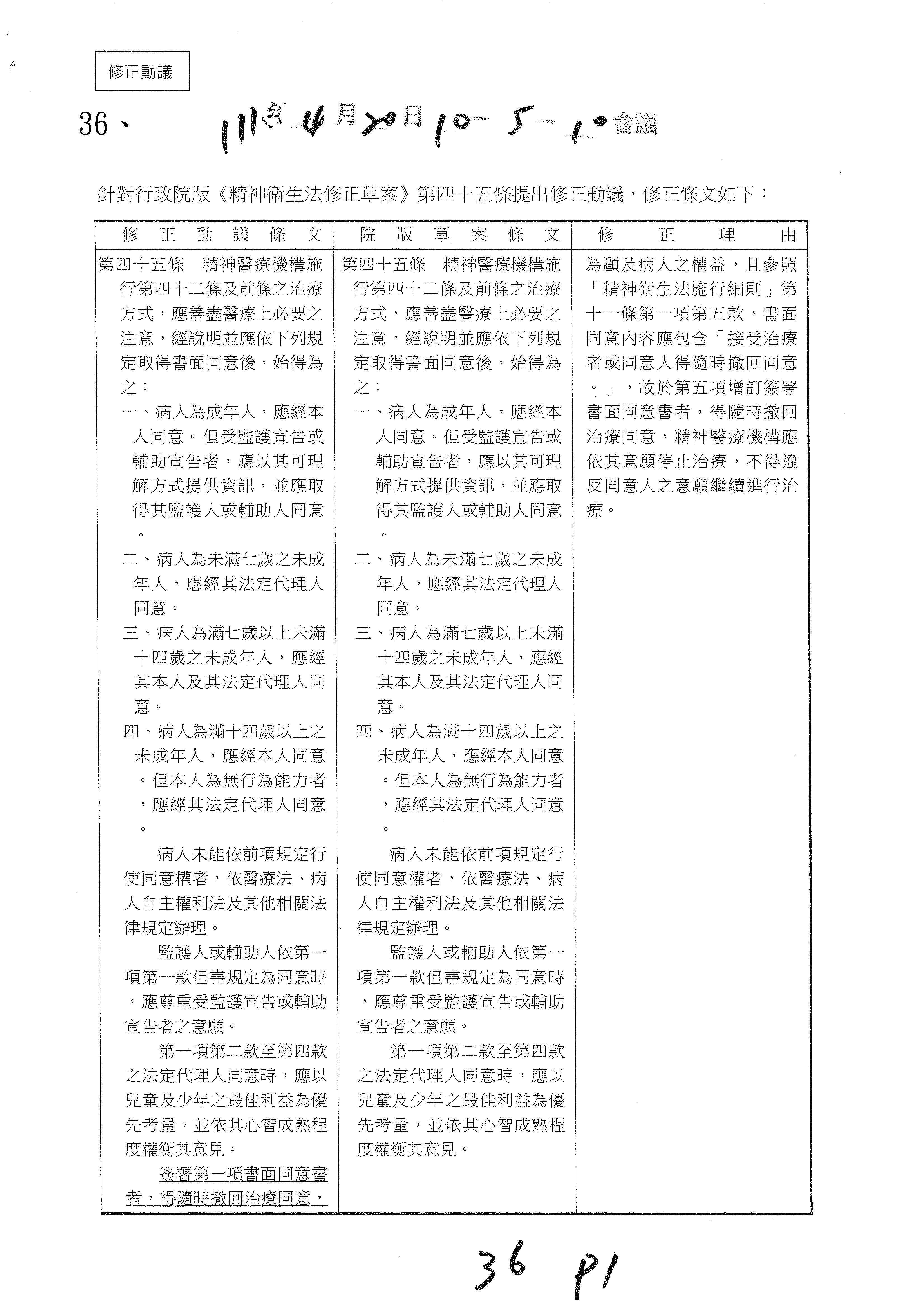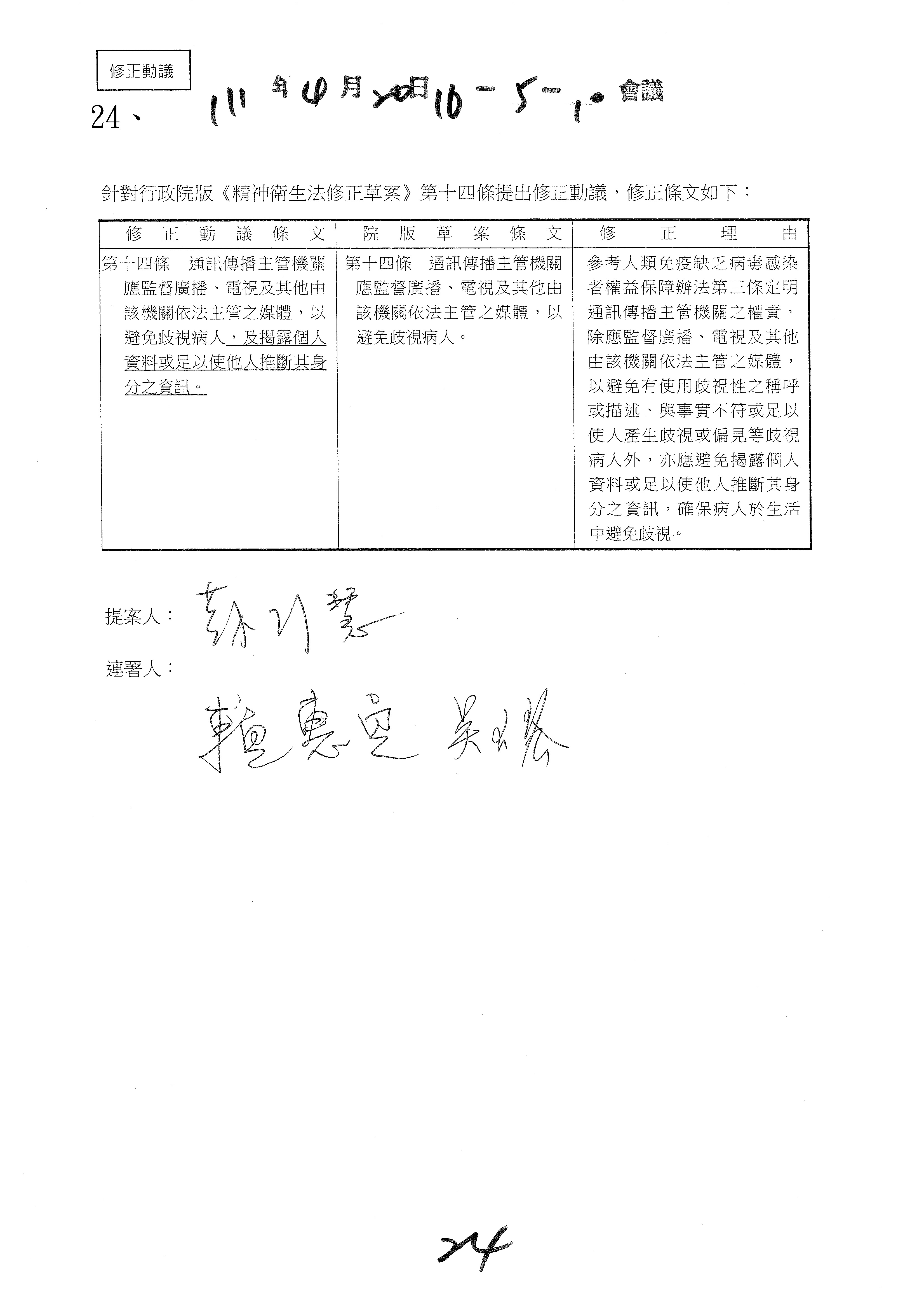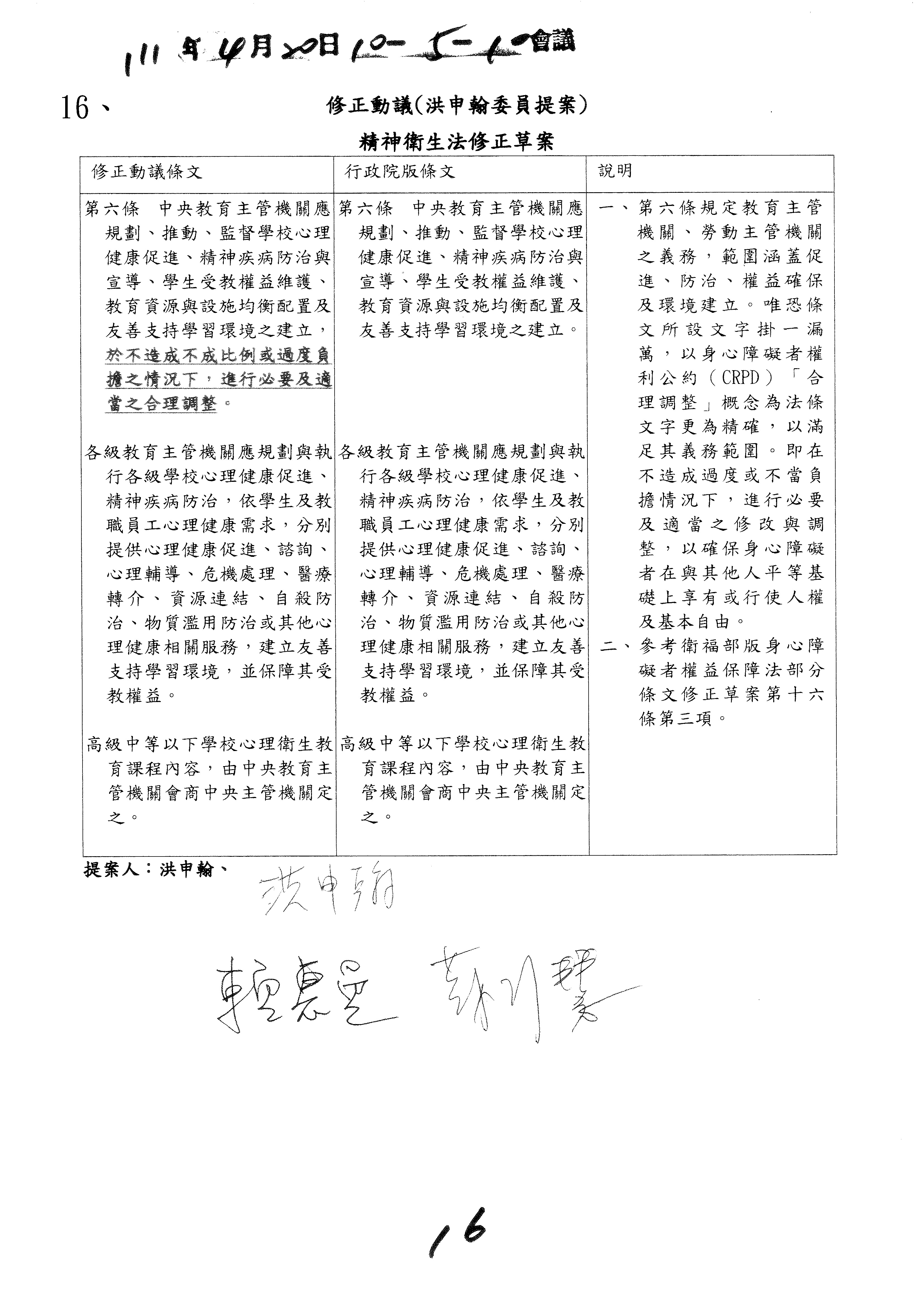 主席:時間差不多了,我們再宣告一下,剛剛吳玉琴委員增訂第十六條之一及王婉諭委員第十八條之一的修法版本,請衛福部彙整,擬具條文,明天再送本席及委員會,宣讀後列入第二十四條。那是第二十四條,對不對?