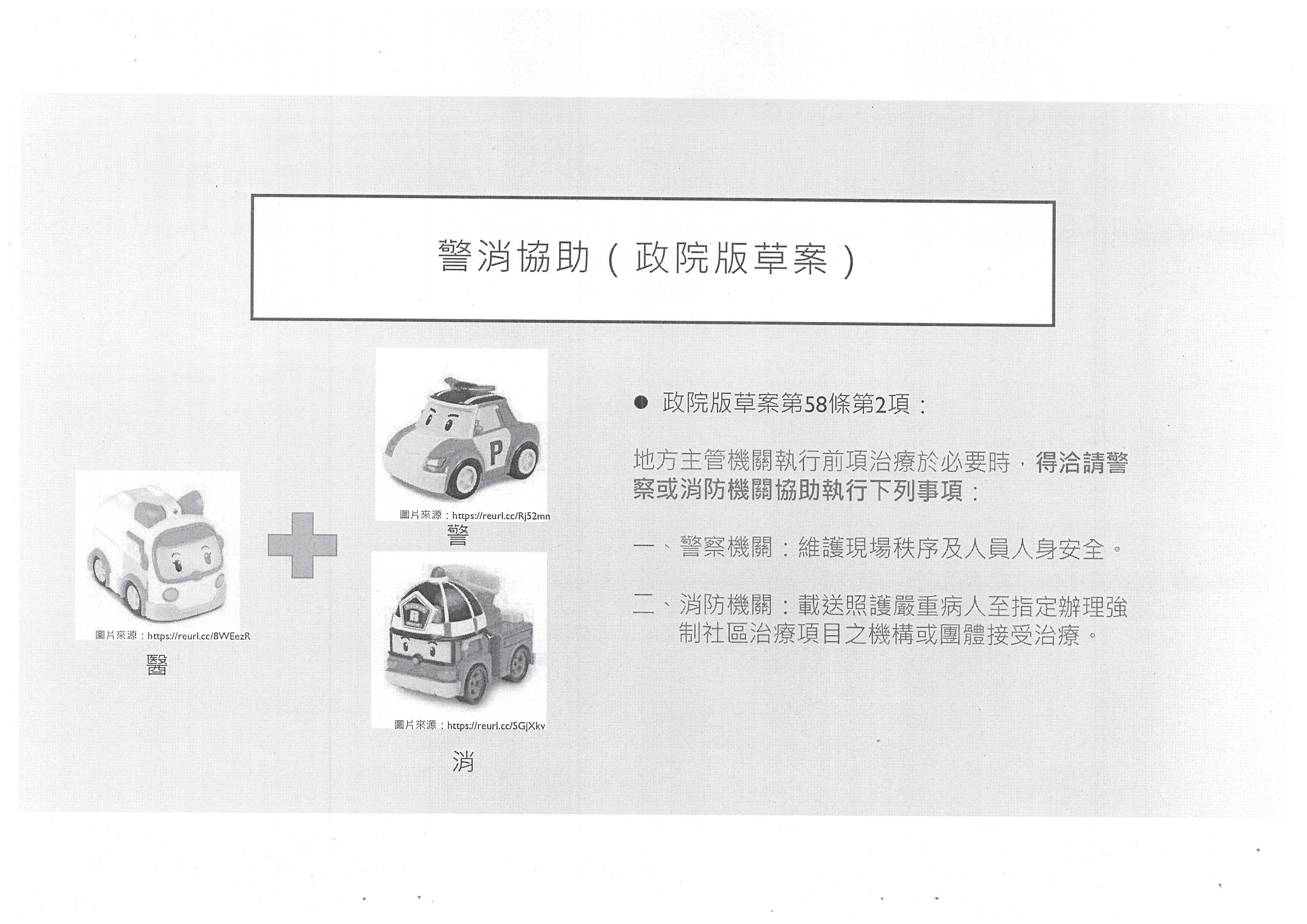 這部法通過之後,在新資源布建的部分,除了社政和相關單位已經布建之外,我們覺得還不足的地方,一定會在衛政上補足,例如在社區居住及自立生活的支持等等,或許是我們還要再更著墨的地方,我們就會在這幾點上積極地布建,對於家庭的支持,我們這次也都有納進來了。剛剛也提到是不是要設立專線,因為現在的心理衛生中心,我們預計布建71處、關懷訪視員1,000位,我們會覺得真正的衛教,其實是他進到家庭之後,跟他的家人在互動的過程當中,應該就可以提供協助。而每個心衛中心設立的目的,就是要照顧在社區裡面這些精神疾病的病人,所以它本來也可以做這樣的提供。我們全國性的電話也都有成立了,如果民間團體要提供這樣的服務,可以透過補助的方式來給予支持啦!所以才提到要不要提出一個授權辦法等等的方式,是不是請委員再考量?還是針對哪一個部分,我們來做一個授權辦法,或許也是可以來衡量的。