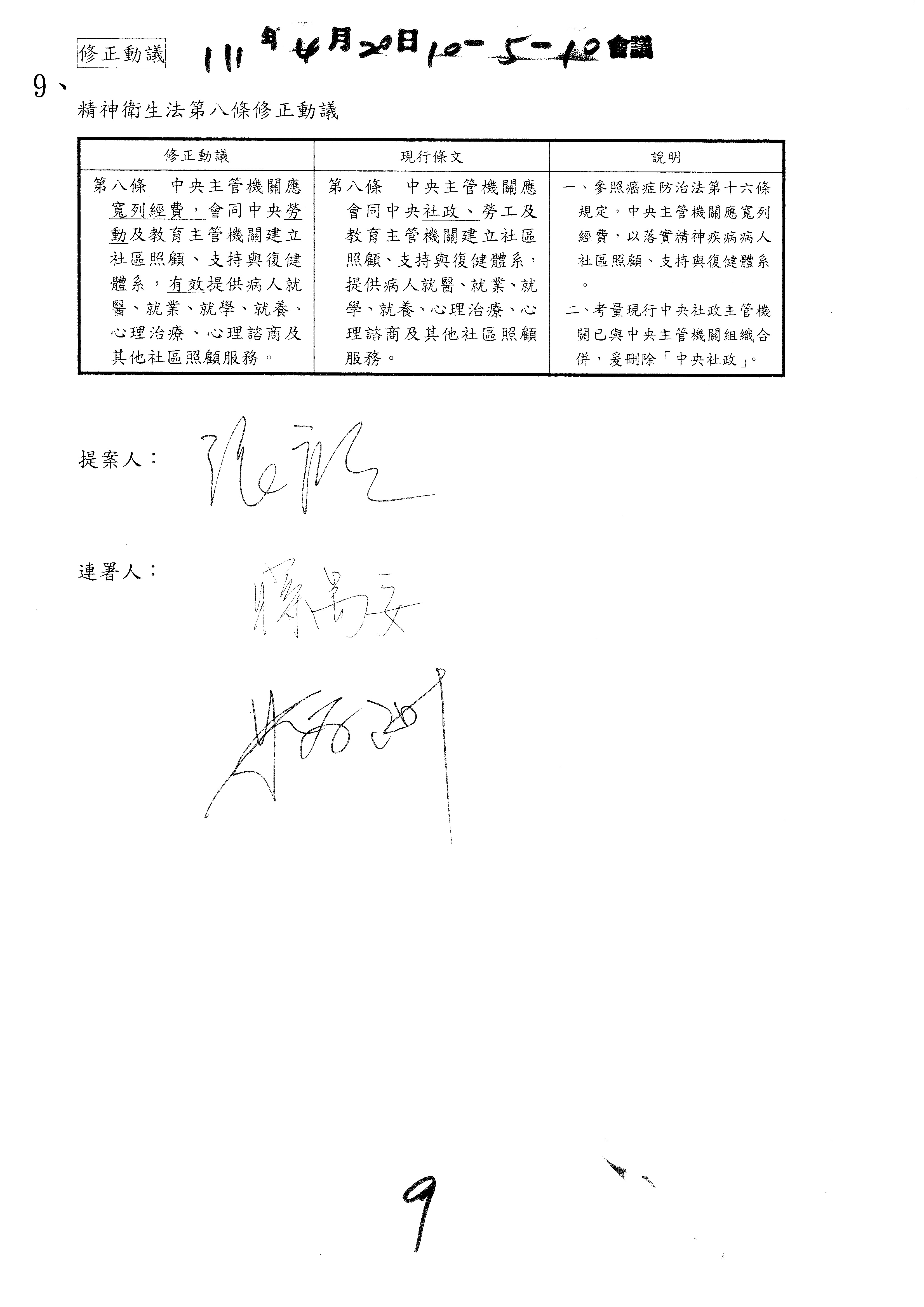 立法院第10屆第5會期社會福利及衛生環境委員會第9次全體委員會議議事錄