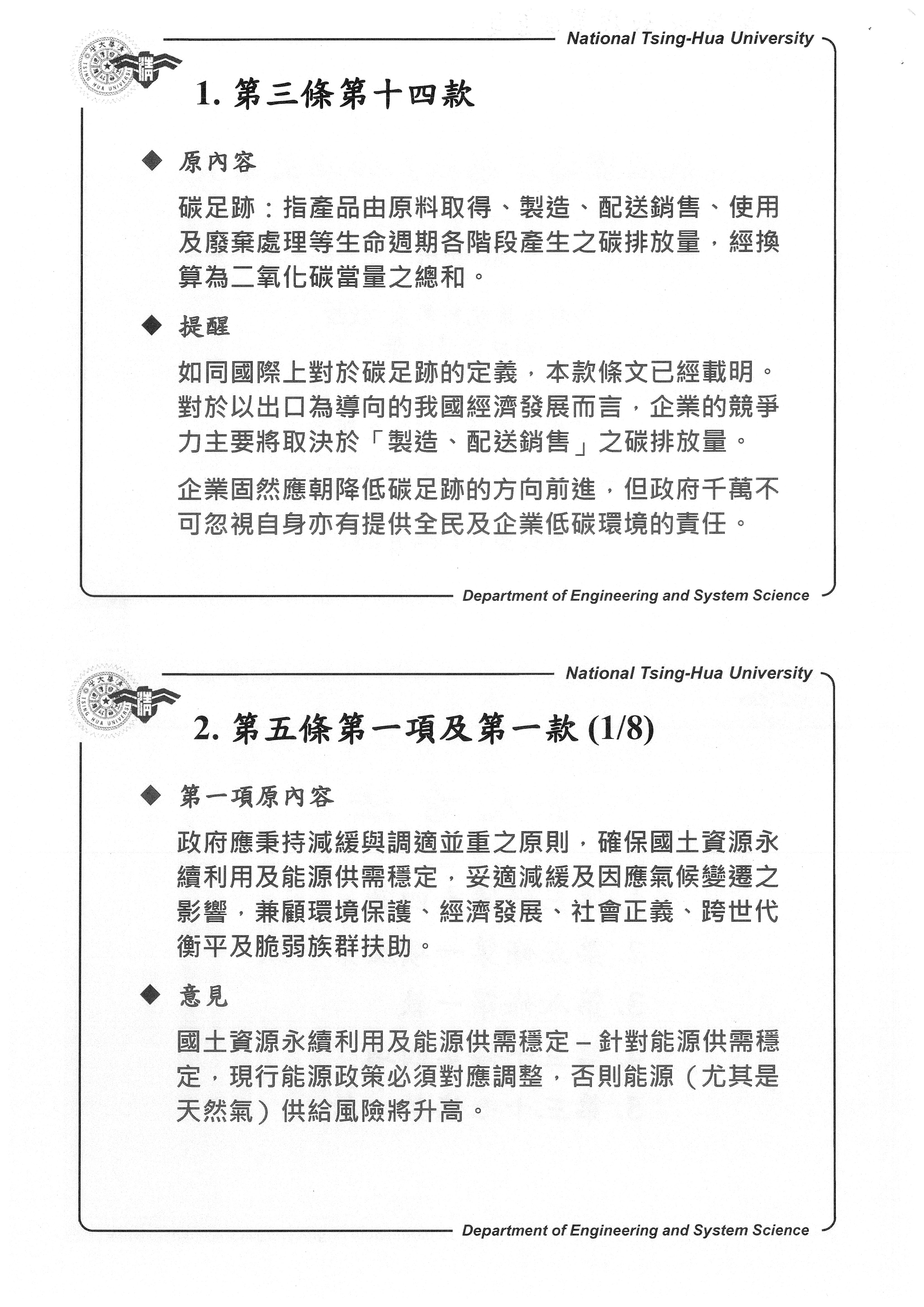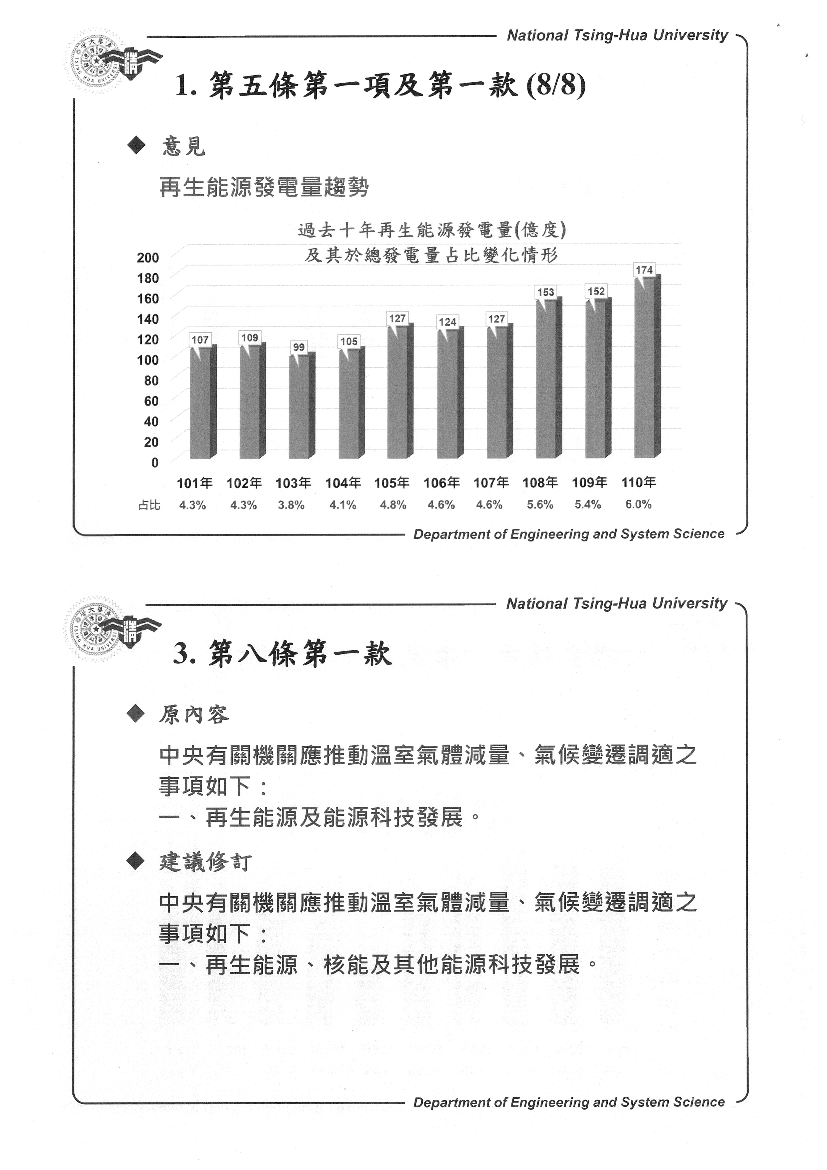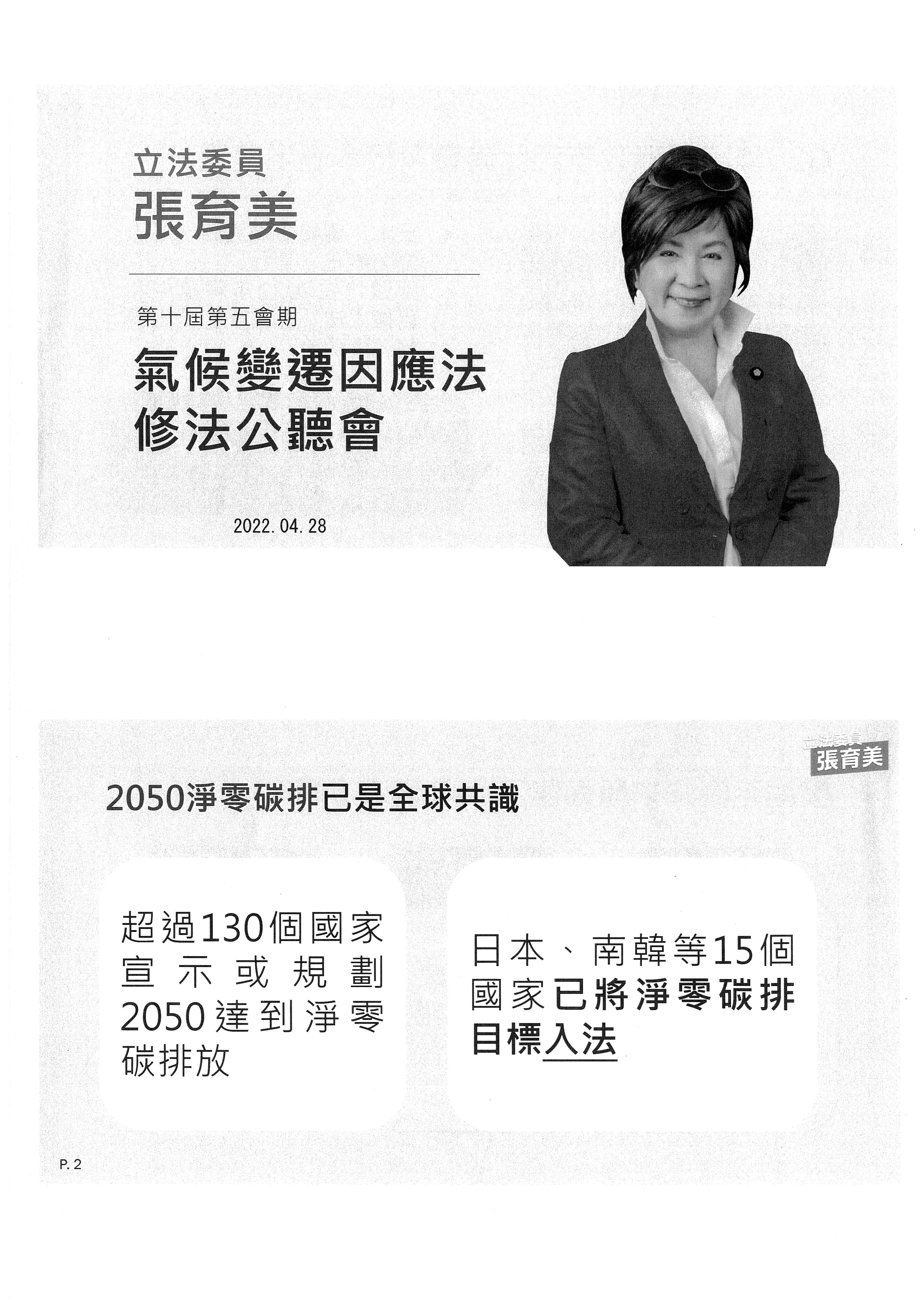 邱副處長秋瑩:主席、各位委員、各位學者先進,大家好。今天貴委員會舉行「氣候變遷因應法」公聽會,本會承邀列席,至感榮幸。謹就本次公聽會討論提綱,與國發會相關部分說明如下,敬請各位委員、先進不吝指教。