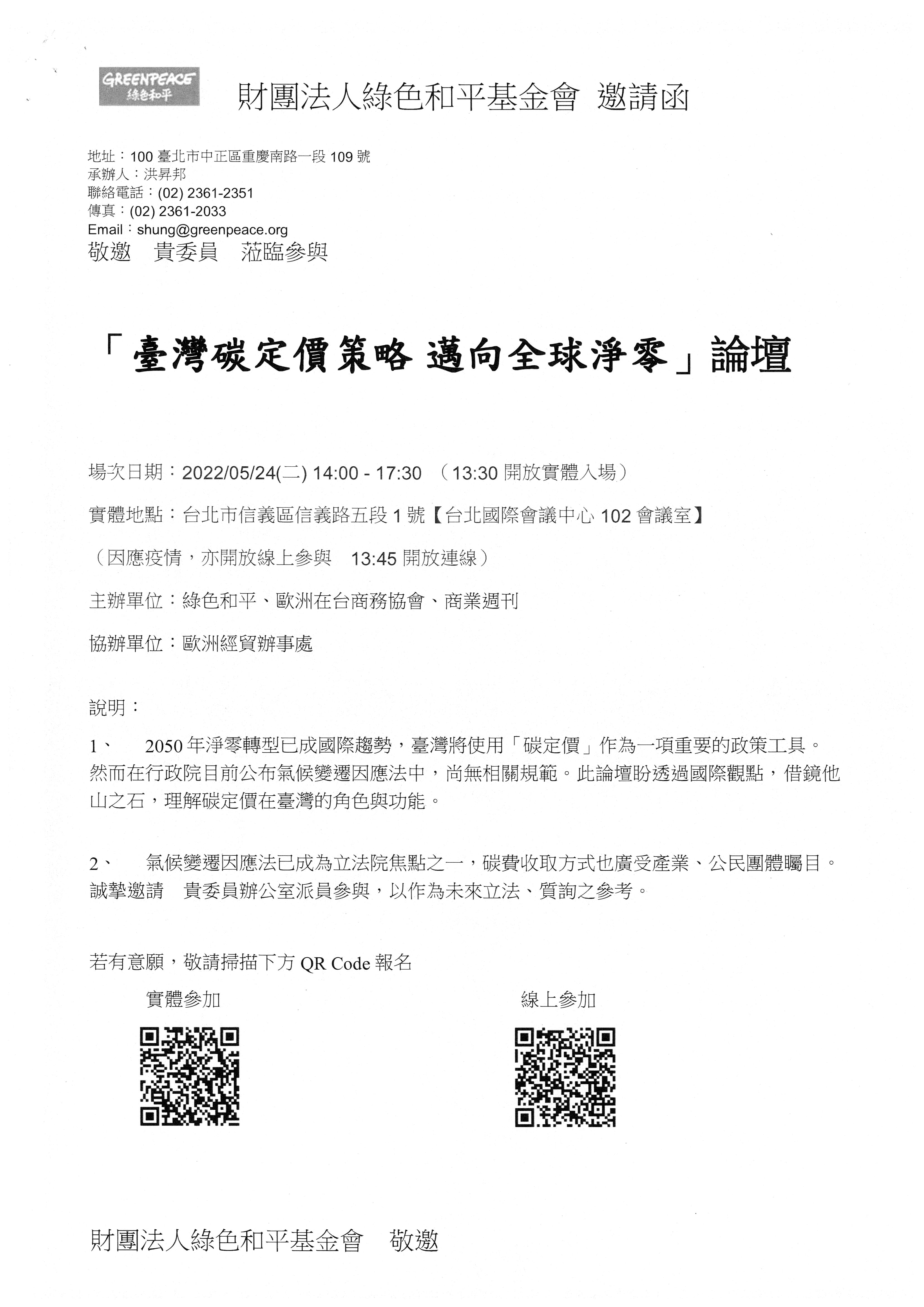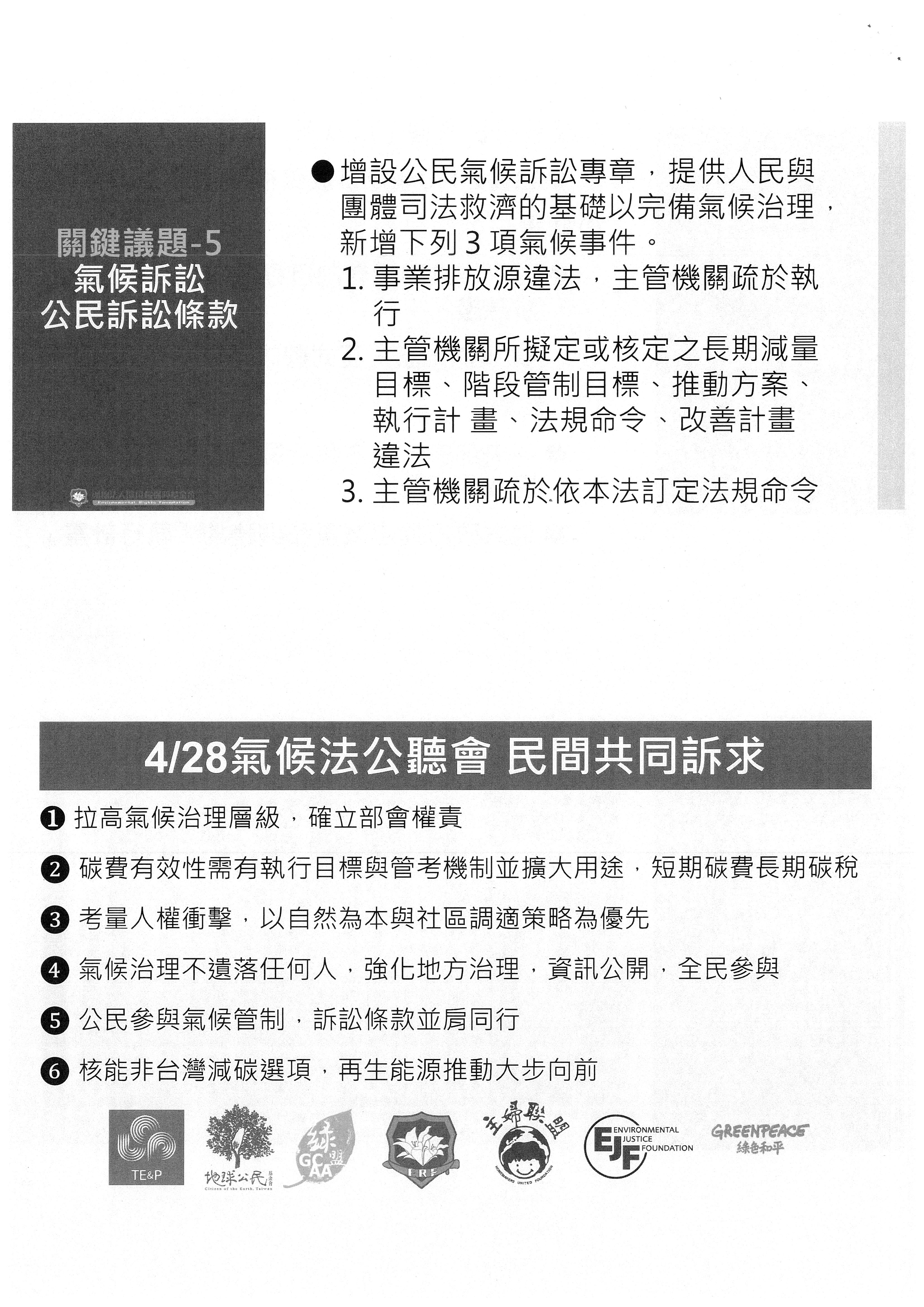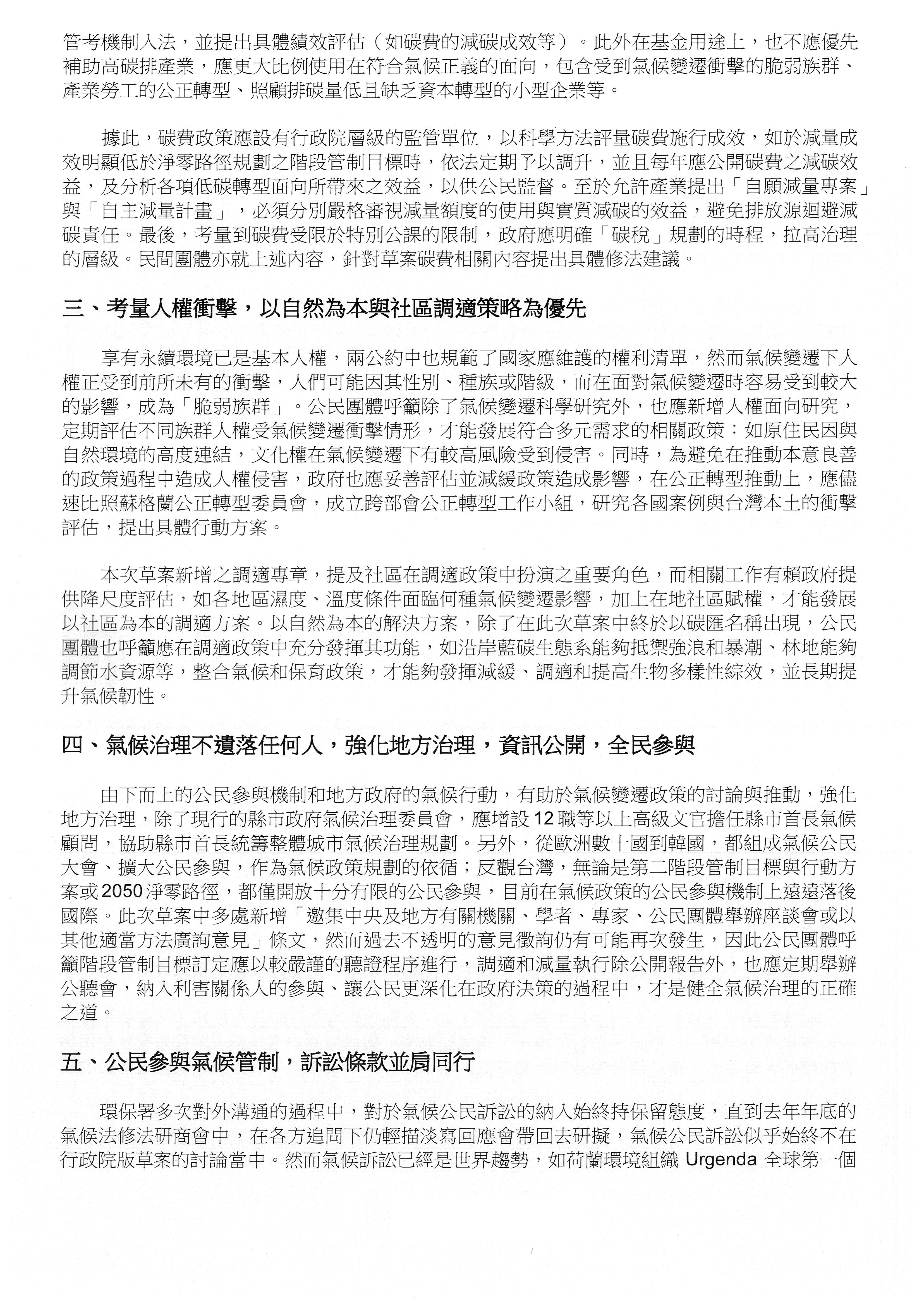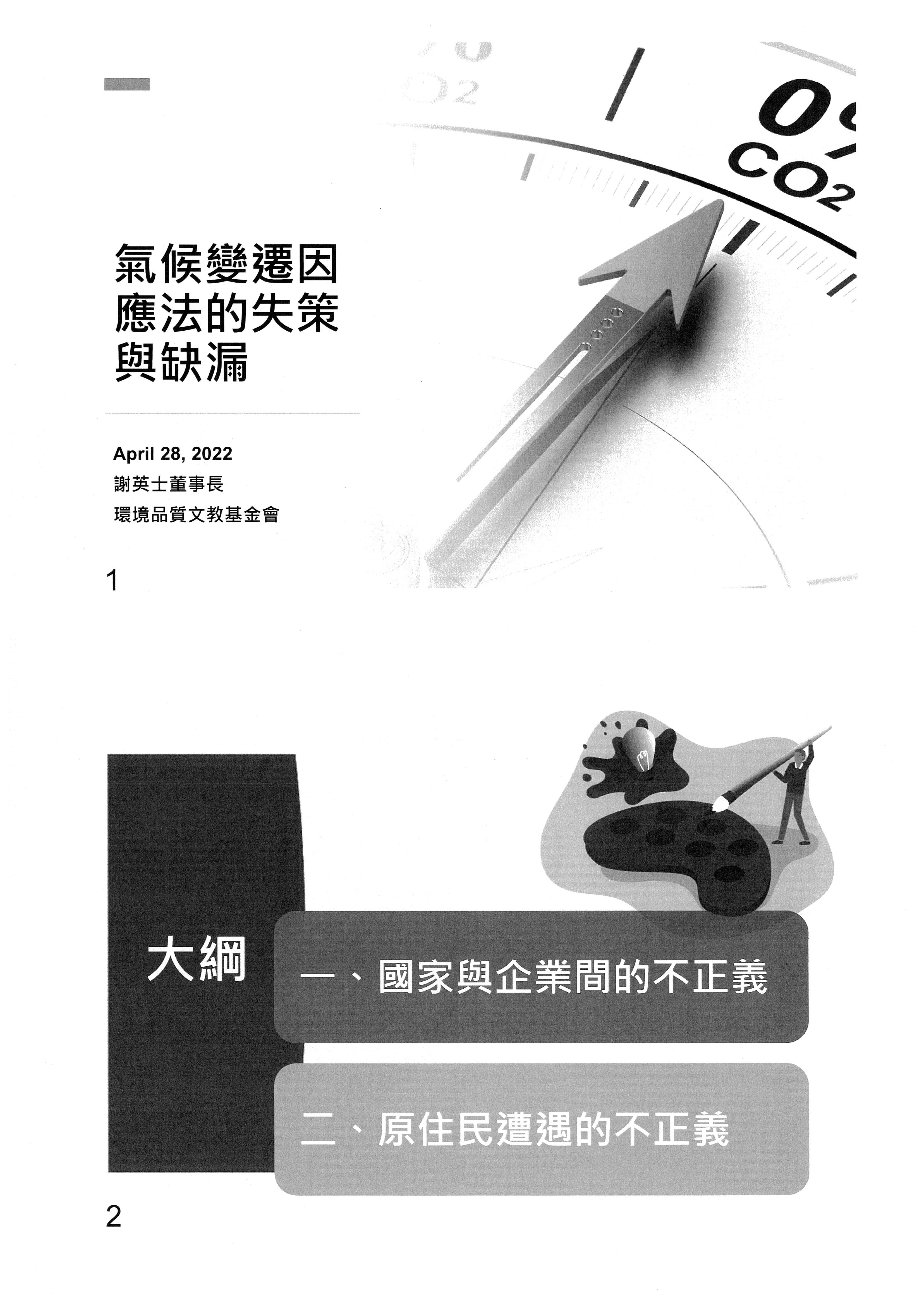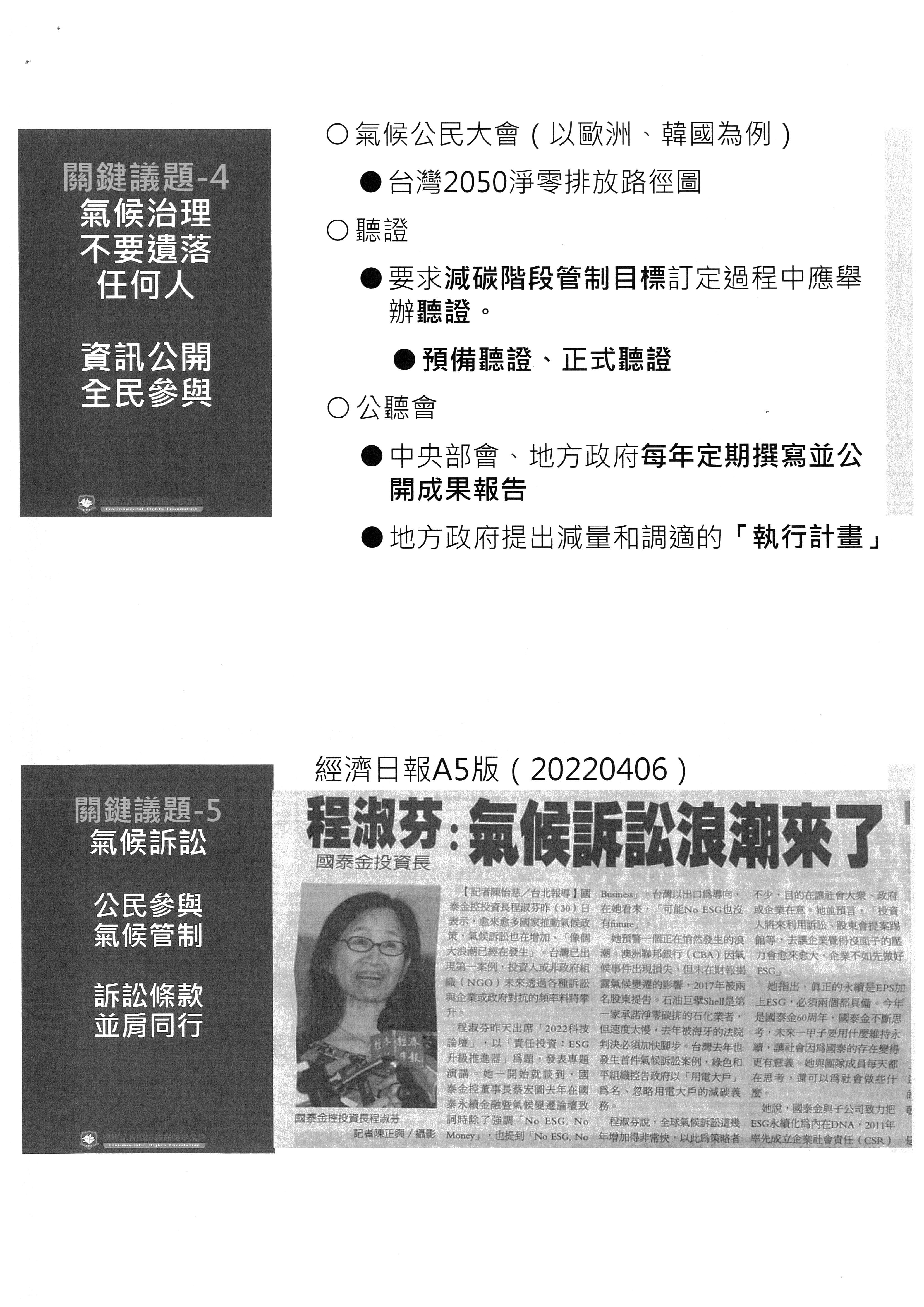 最後一點,有關於氣候訴訟的議題,我們從2020年跟環保署溝通到現在,一直說氣候訴訟的公民參與非常重要,而且我們有相關的草案放在裡面,我們看到最新的回應,公民訴訟條款的部分,因為羅秉成政委跟我們說這個法律是所謂的政策性立法,但說實話這是一個管制性立法,它有收碳費和所謂的效能標準,為什麼不能訂定公民訴訟條款?相對於空污法或環評法都有公民訴訟條款,為什麼這裡卻不行?第二個,蔡鴻德副署長也有回應,因為前面的資訊公開和公民參與已經做得很足了,不需要有公民訴訟條款,我不知道為什麼這件事情做不到,就是把公民訴訟條款放進去,提供人民有這個機會去督促政府機構做更好的氣候治理目標。簡單舉一個例子,像荷蘭的Urgenda案例就是督促政府做更進一步的前進。所以我還是很期待、懇切地說,公民訴訟不是一個洪水猛獸。謝謝。