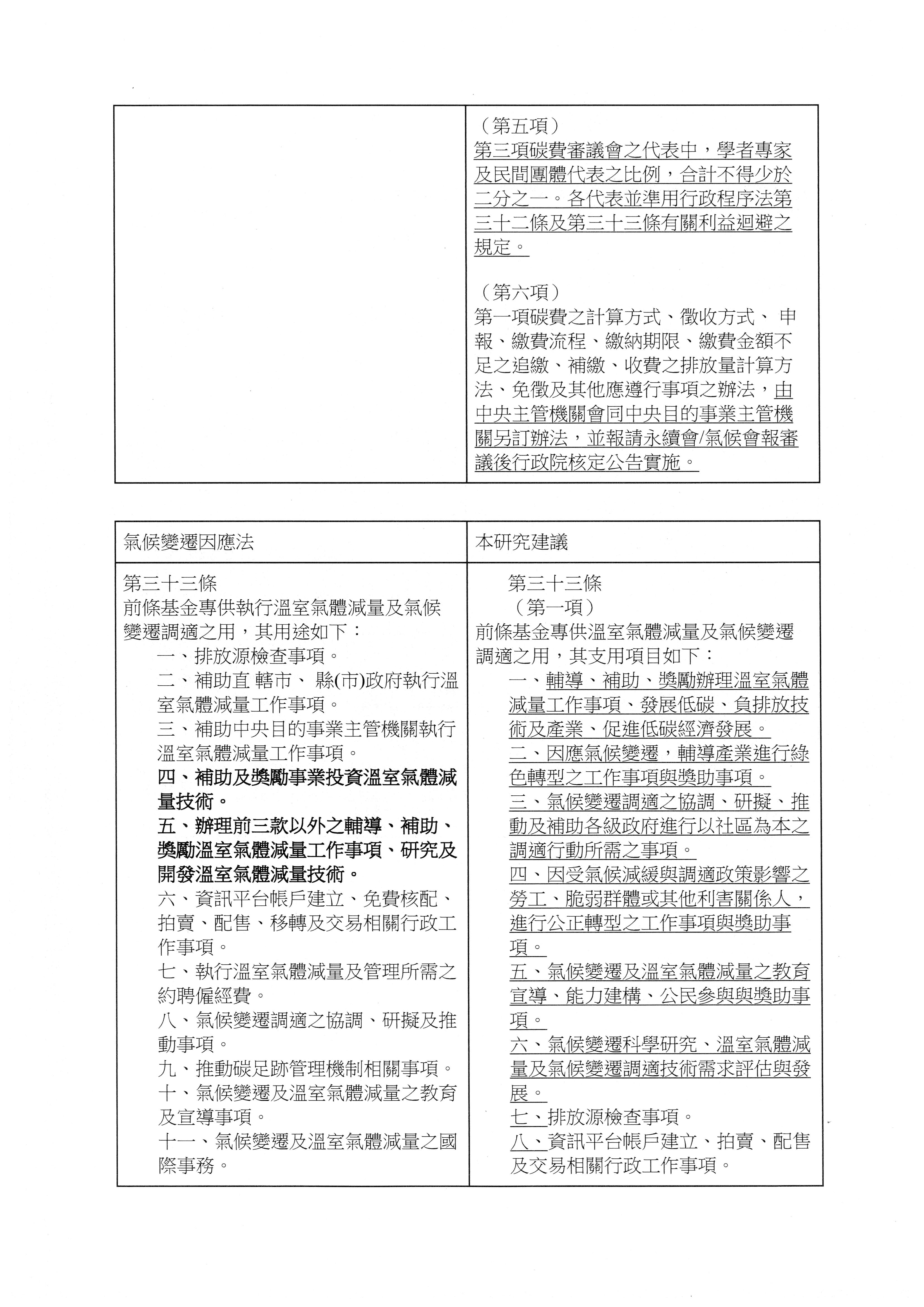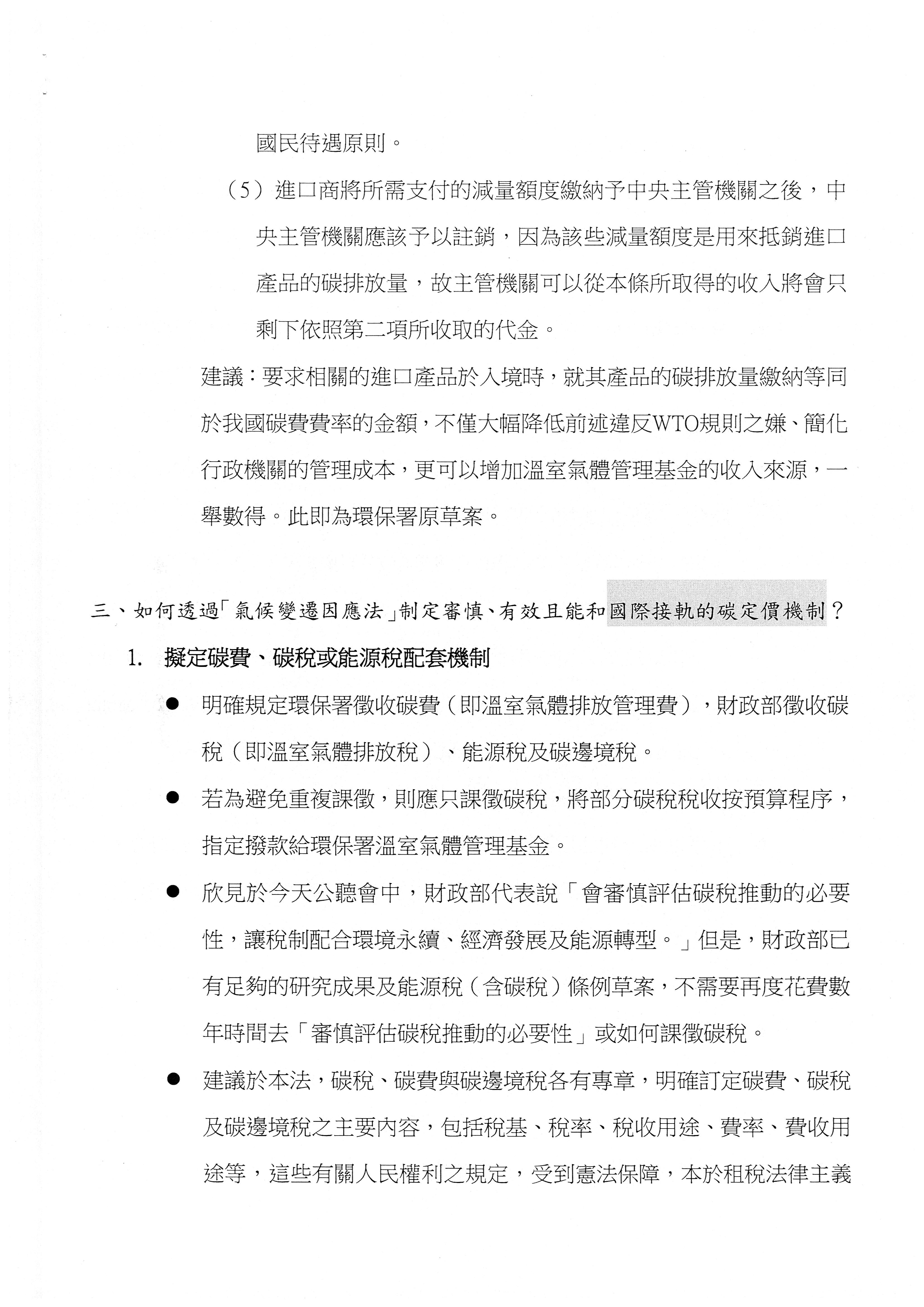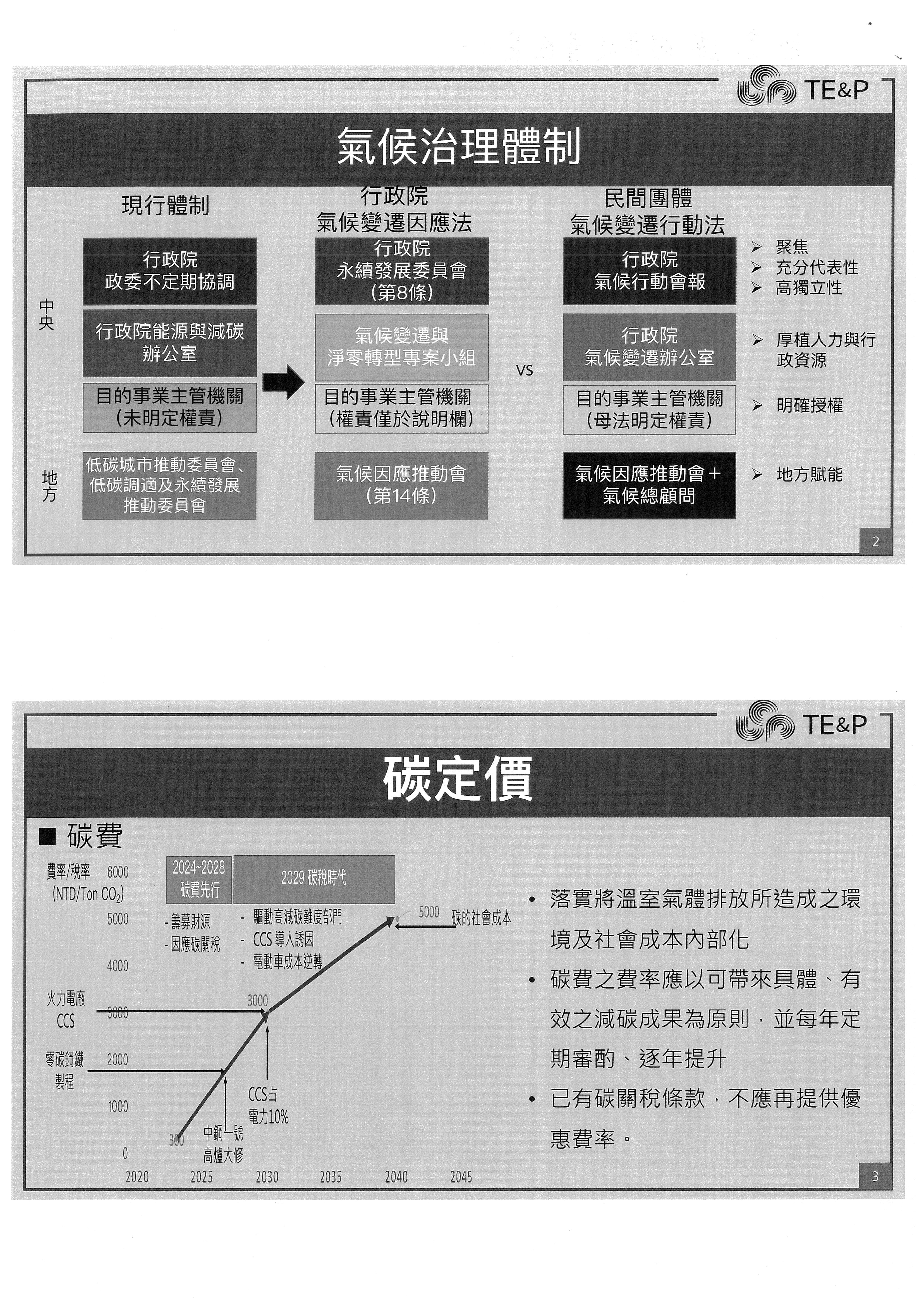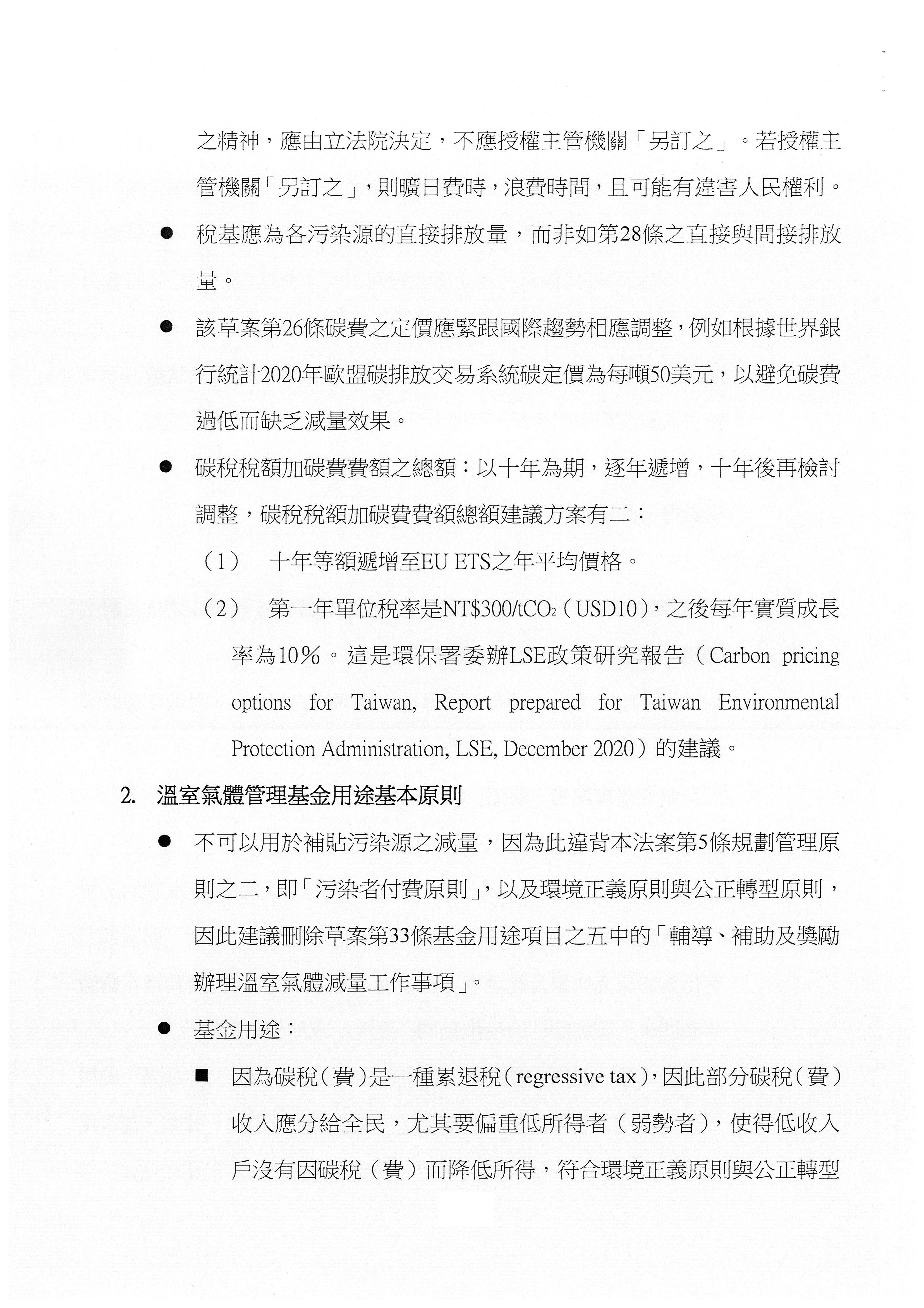 在碳定價的機制方面,我建議要擬定碳稅、碳費及能源稅,這都應該在本法之中各有專章,而且要針對直接排放作為稅基,如果為了避免重複課徵,就是財政部一直說的理由,為什麼這裡面沒有碳稅?如果要避免重複課徵,我的建議是只課徵碳稅、不課碳費,碳費原來徵收所要成立的溫減基金,可以由碳稅的收入裡面編預算,每年固定編預算放在基金裡面,對於溫減基金的用途也要符合上述的基本原則。