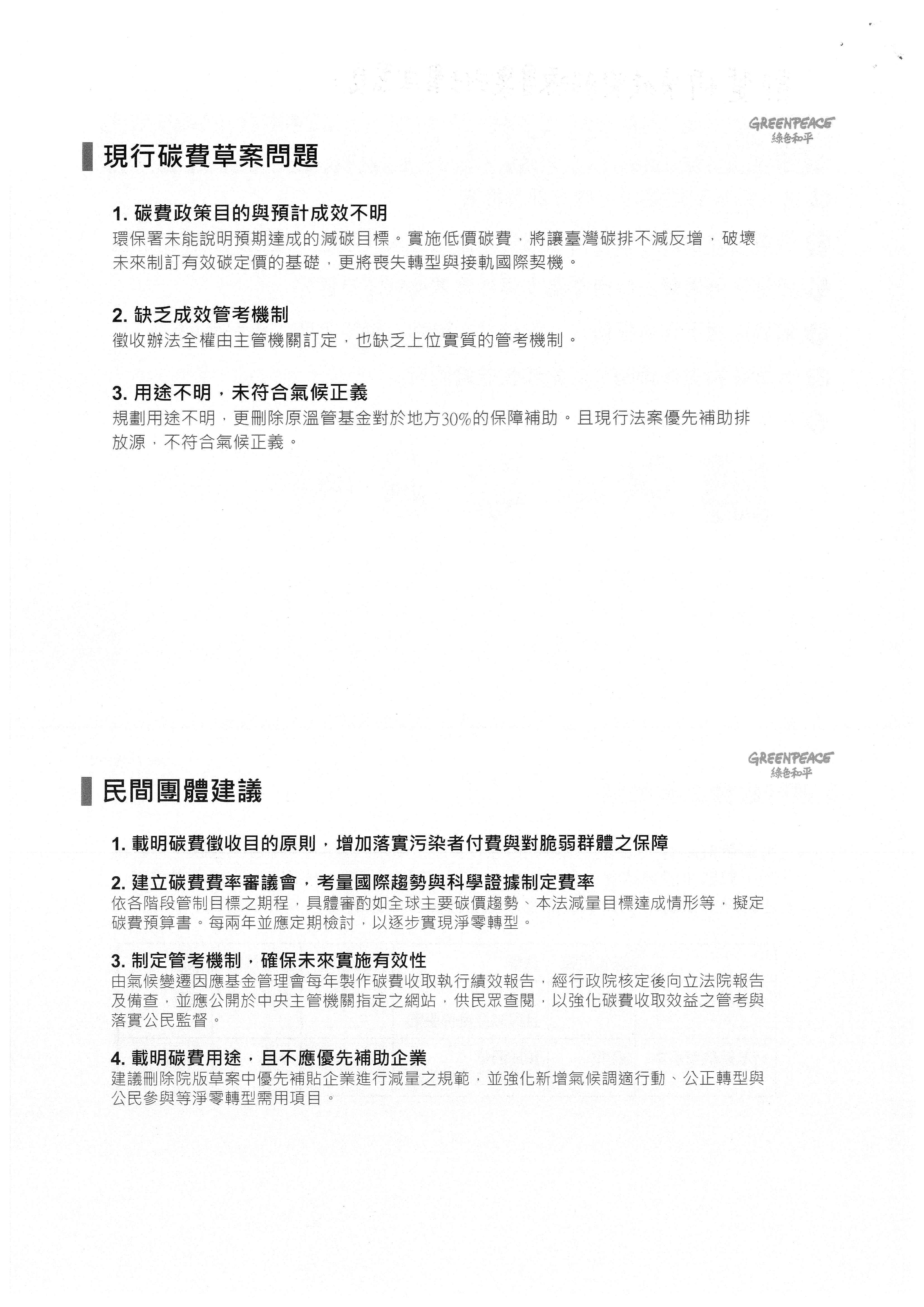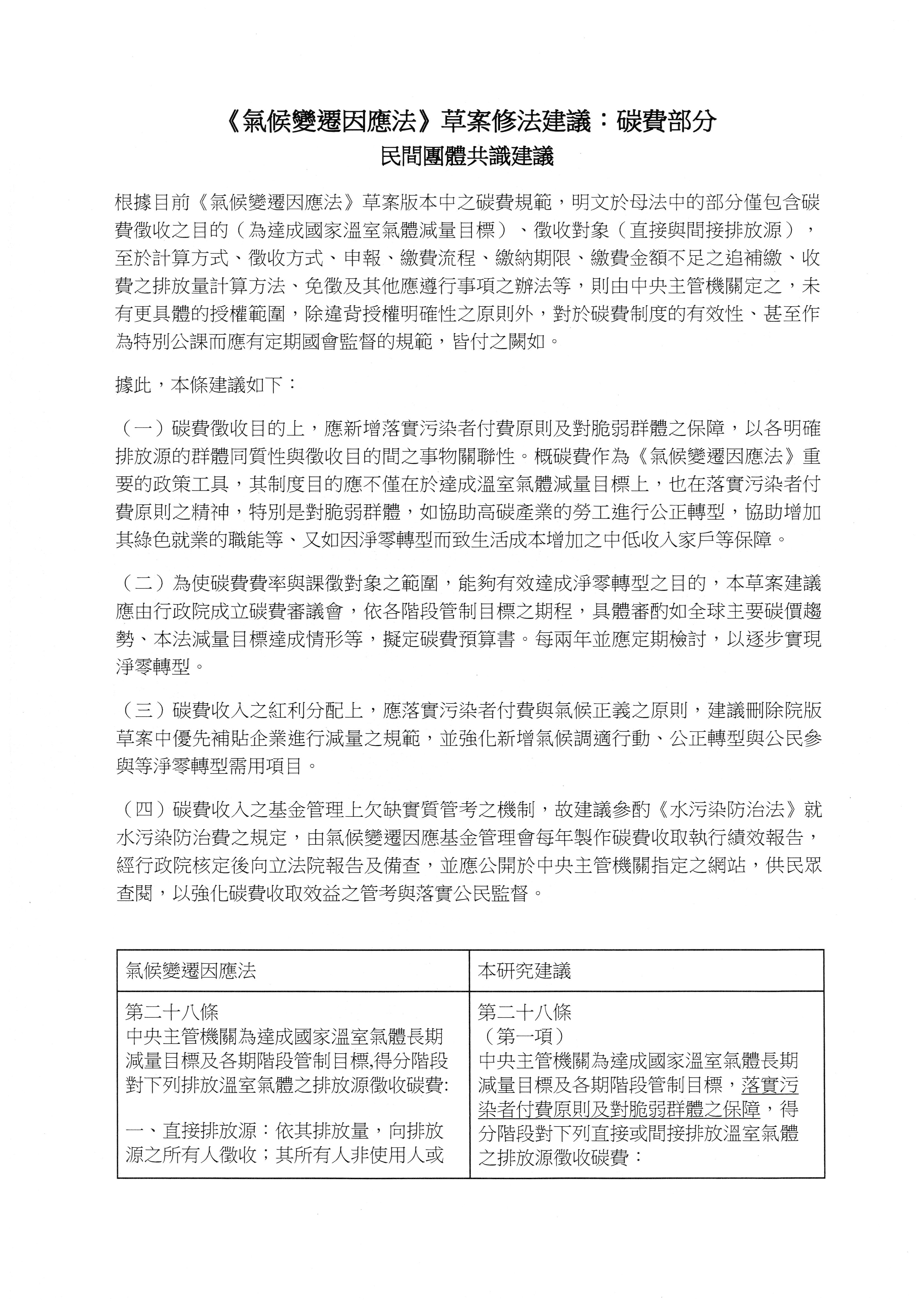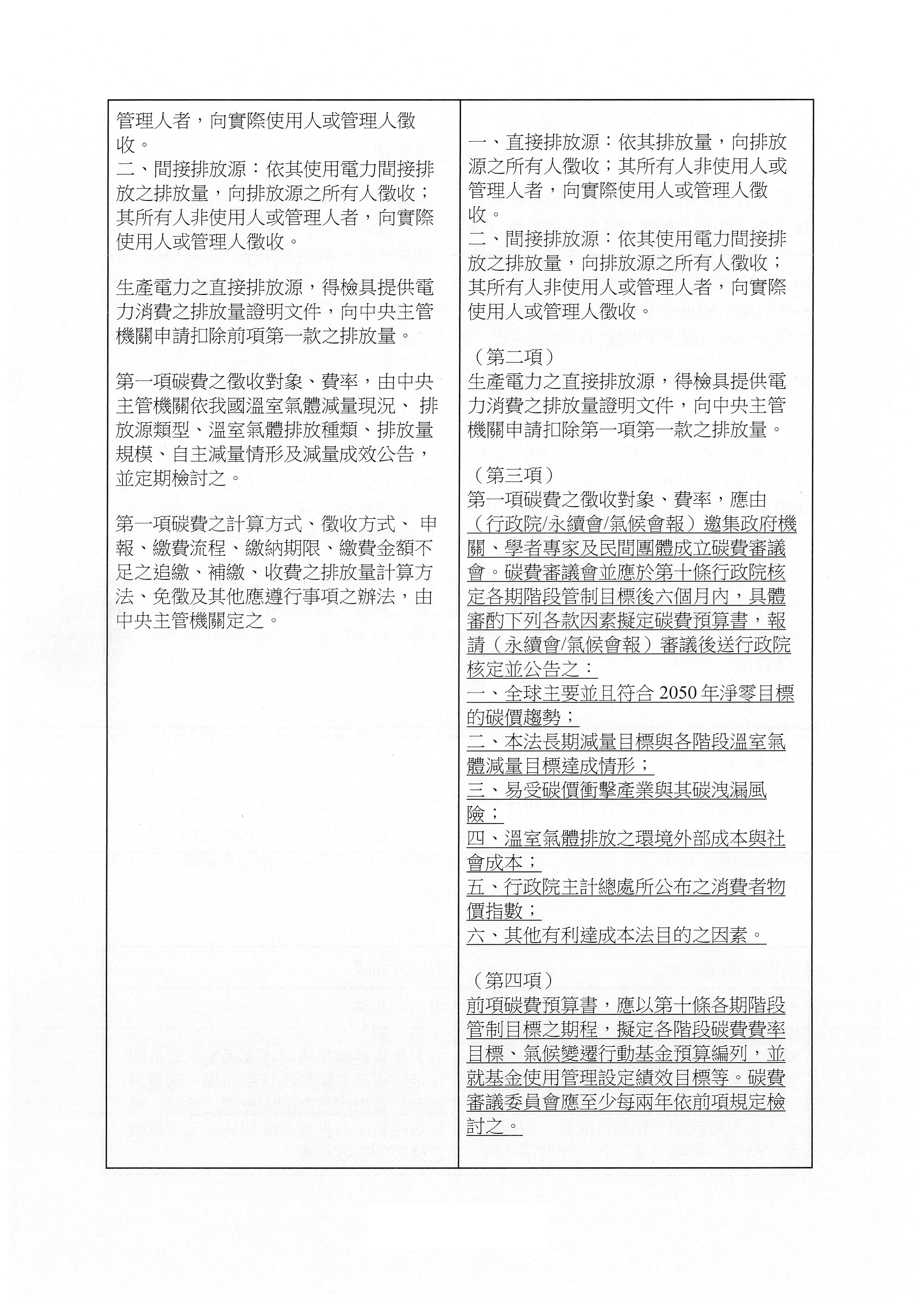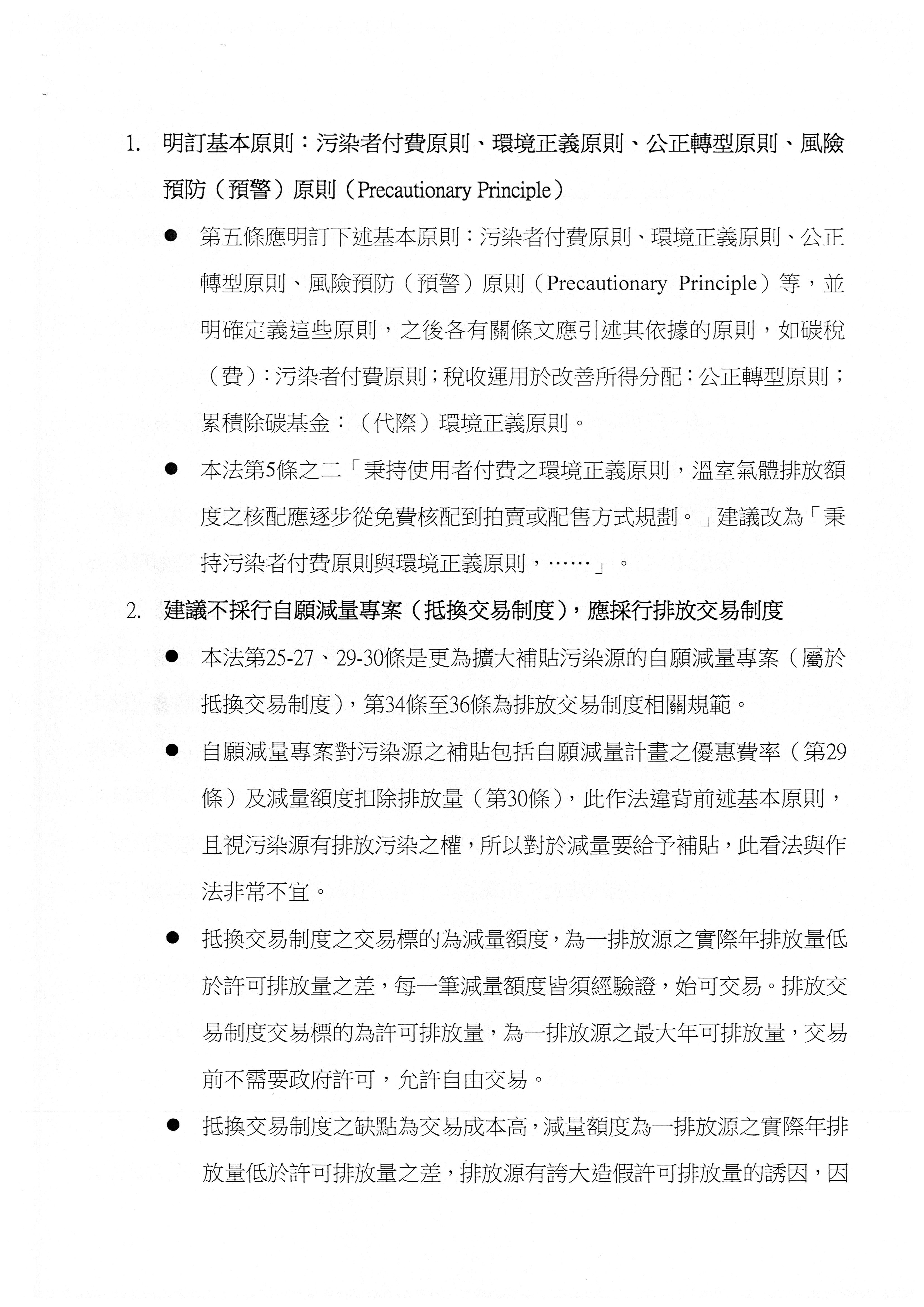 在碳定價的機制方面,我建議要擬定碳稅、碳費及能源稅,這都應該在本法之中各有專章,而且要針對直接排放作為稅基,如果為了避免重複課徵,就是財政部一直說的理由,為什麼這裡面沒有碳稅?如果要避免重複課徵,我的建議是只課徵碳稅、不課碳費,碳費原來徵收所要成立的溫減基金,可以由碳稅的收入裡面編預算,每年固定編預算放在基金裡面,對於溫減基金的用途也要符合上述的基本原則。