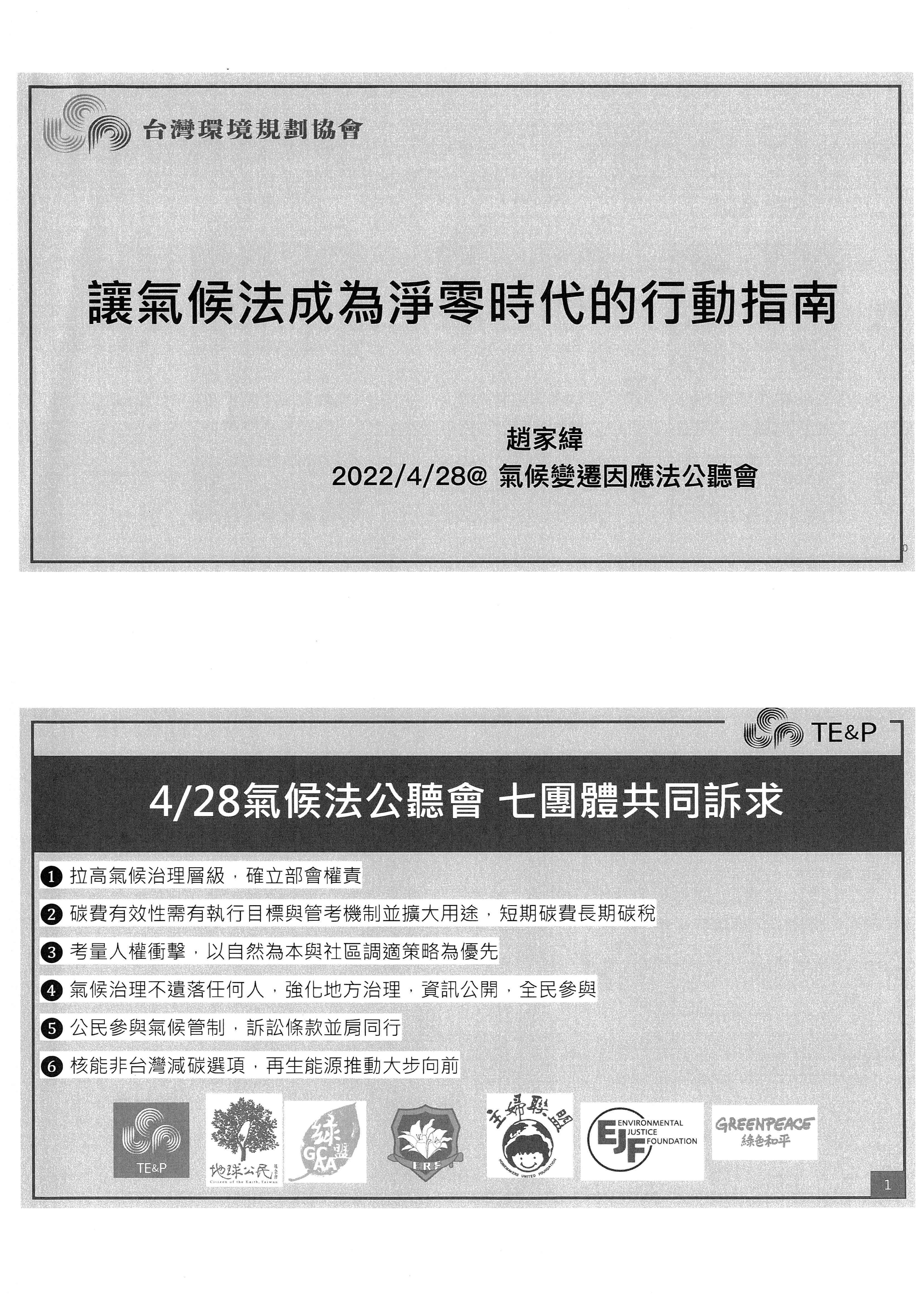 趙家緯理事長:各位好。我們在這邊談氣候法還是要回到法條本身的一些修正建議,還是強調我們七個團體的共同訴求,整體來講還是要提醒大家一件事,在這次的法案裡面,對於公正轉型的討論其實是滿重要的,在今年度COP27的主要題目裡面,其中一項就是公正轉型,過去一、兩年我們在這方面的討論,發現國內各部會對這個議題相當陌生,我覺得各個部會都應該立即補課,以及在這個法裡面要有些相關條文去做正面的因應,我覺得這是一個重要的基礎。