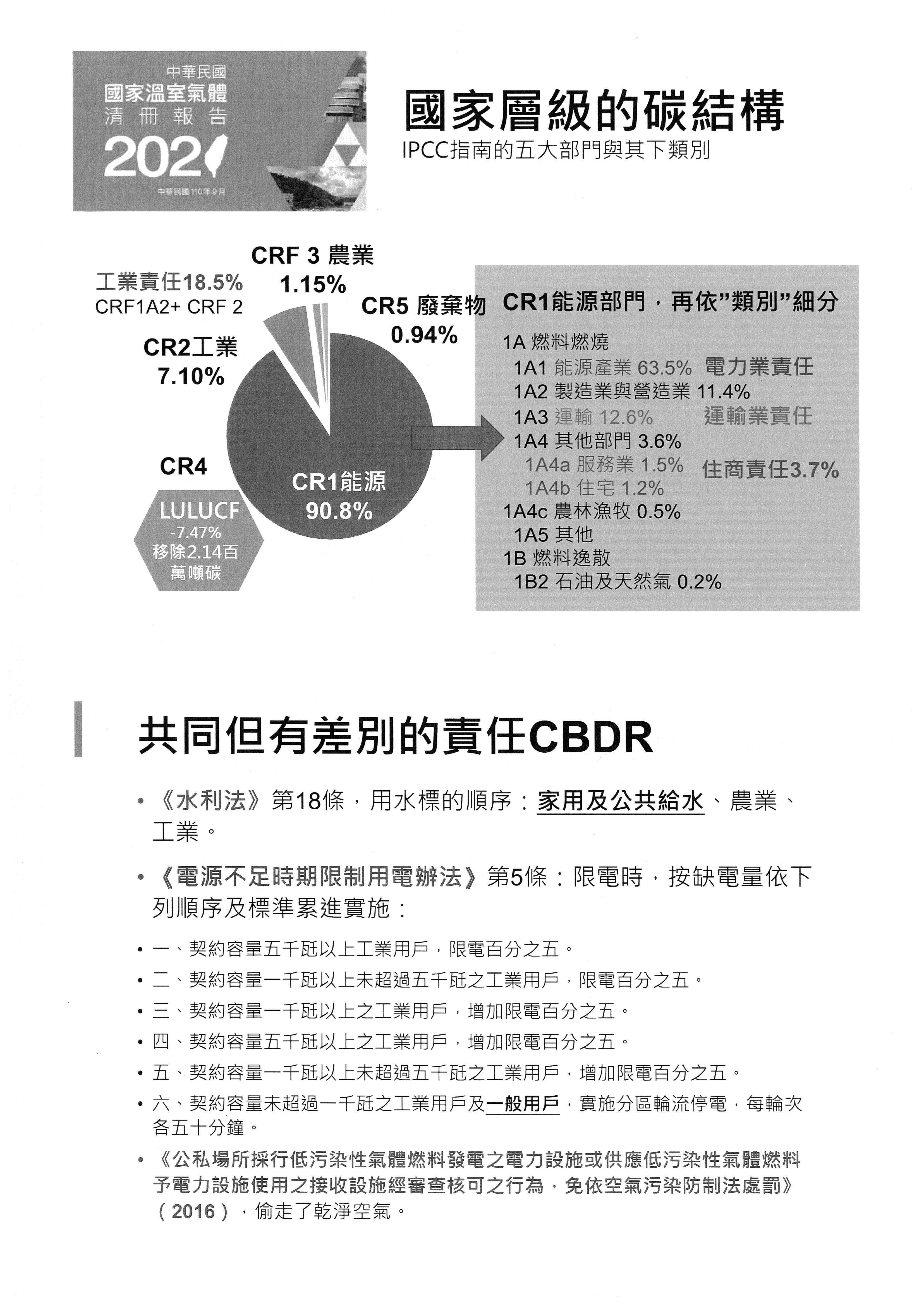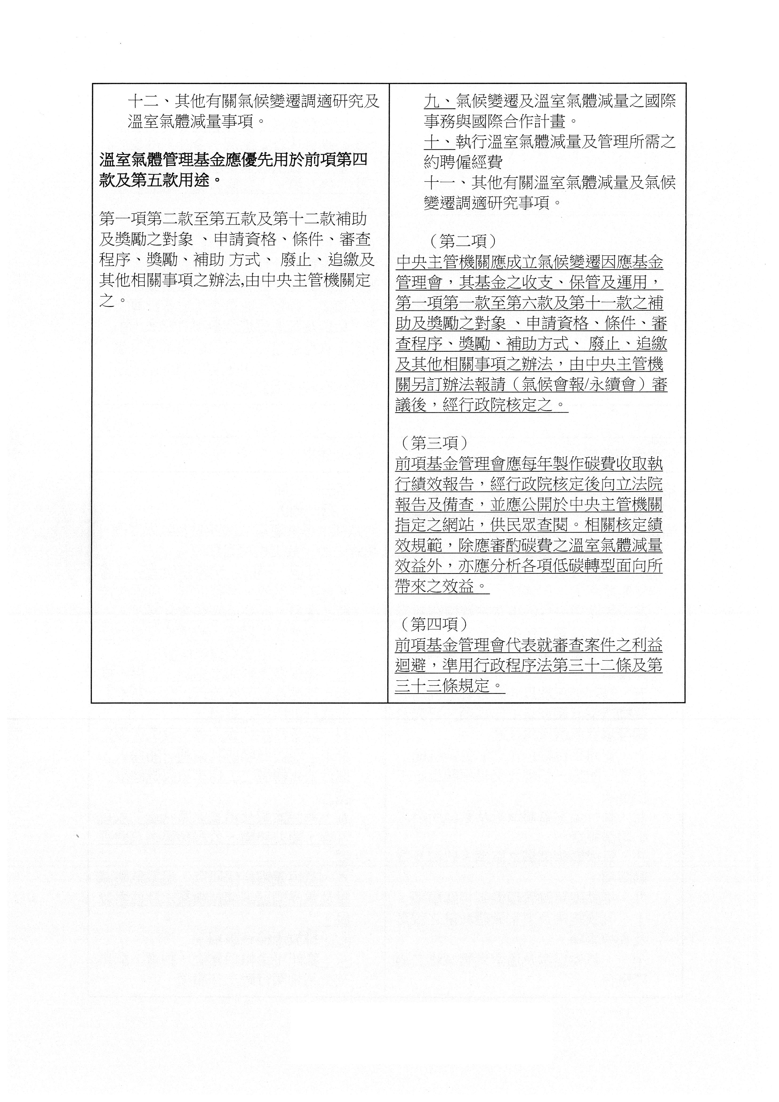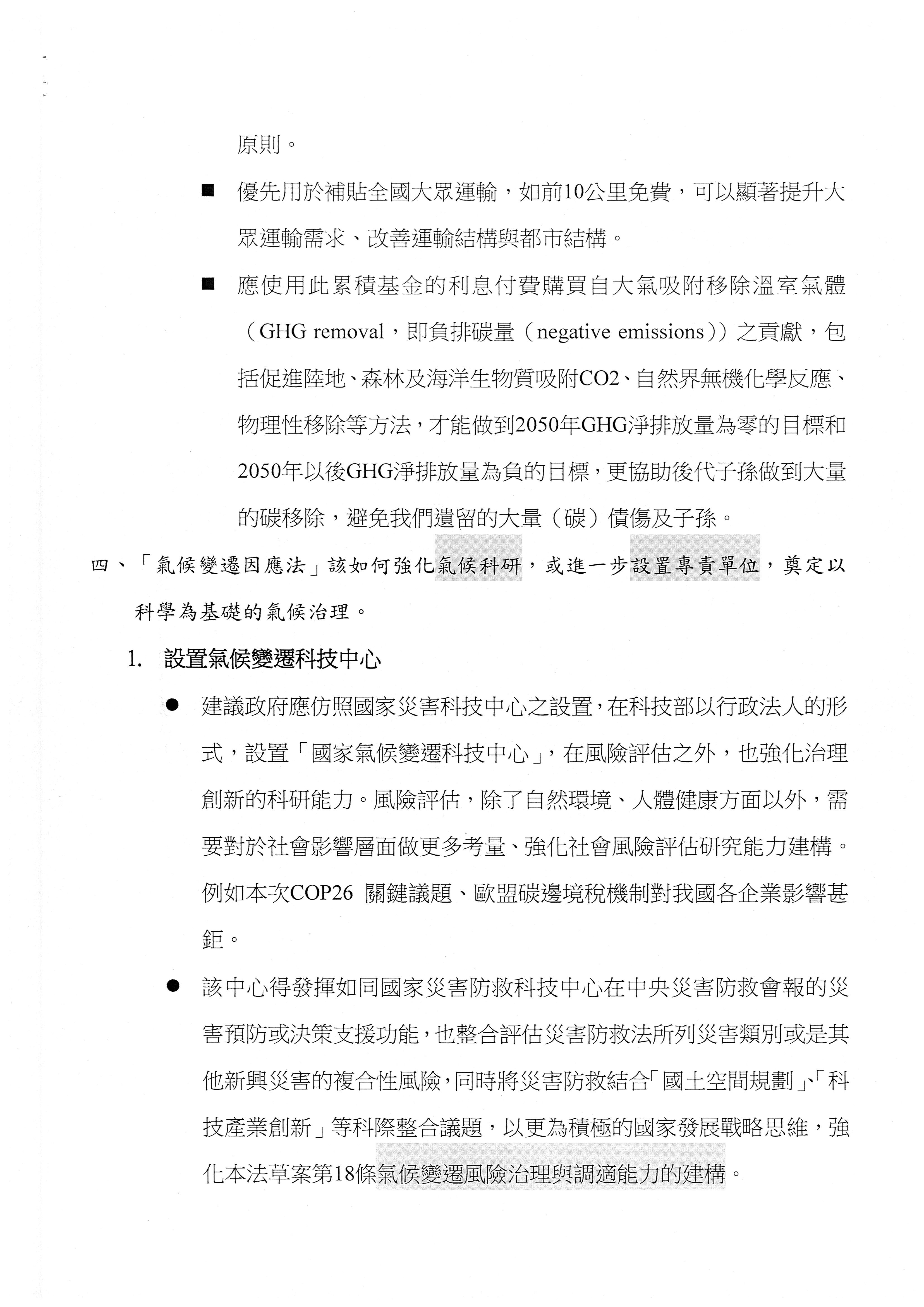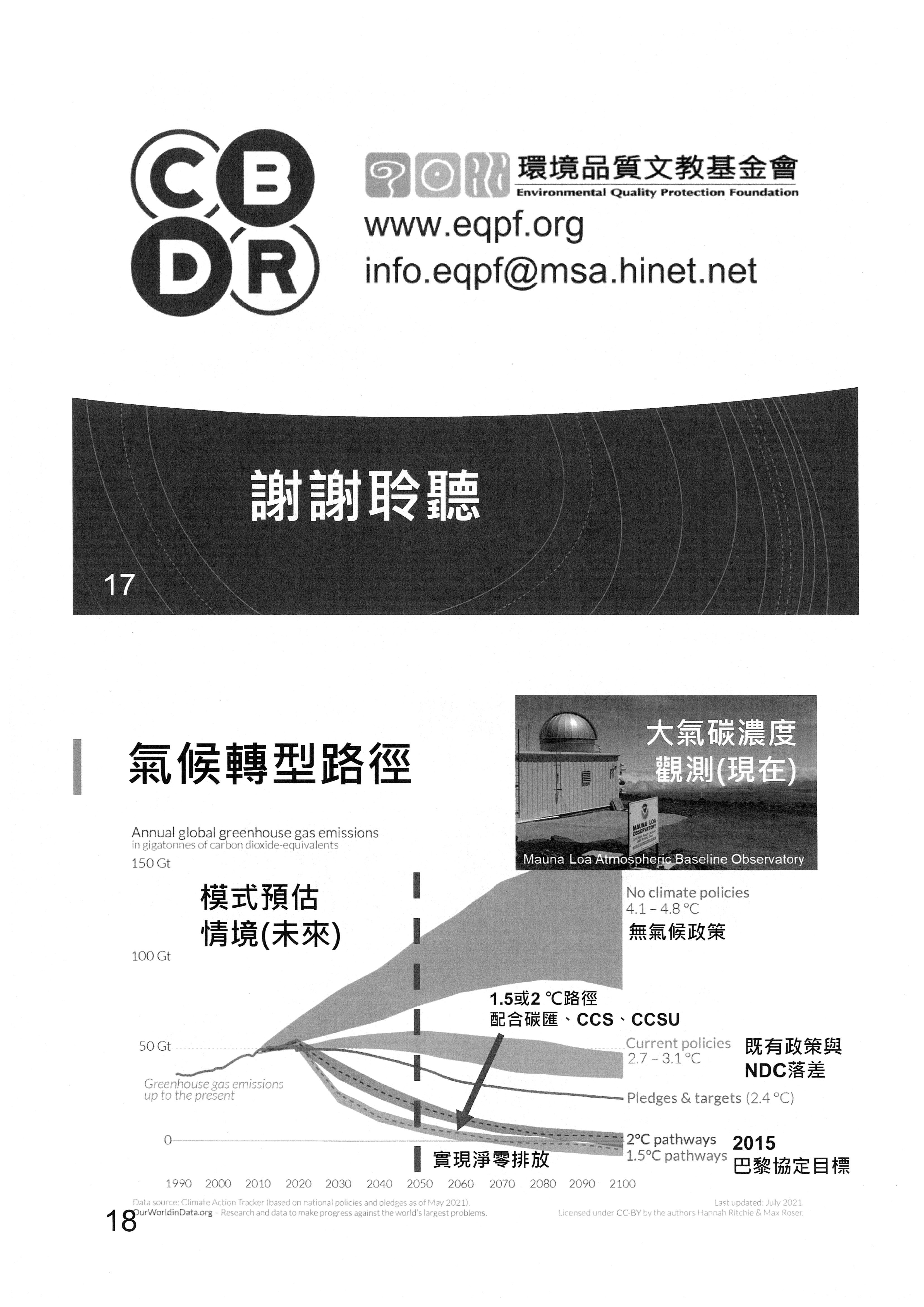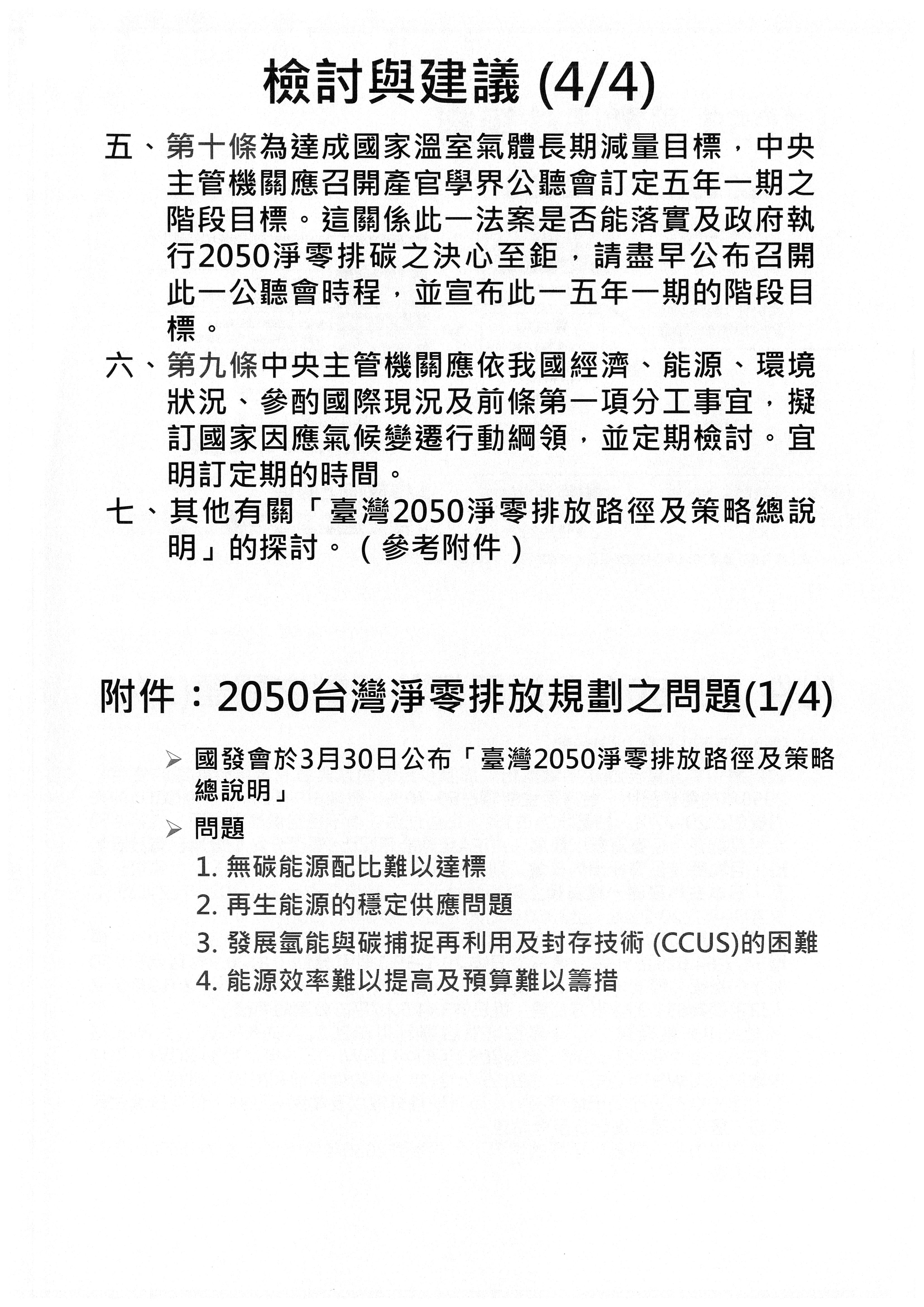 另外,這裡有一點很重要,就是溫減基金的用途,不可以用在補貼污染源,就是要符合污染者付費原則,另外也要用來移除溫室氣體,這一點是非常重要,我們現在如果不移除溫室氣體就是債留子孫,因為2050年之後是要淨負排放,那是非常重要的。我的報告到這裡,謝謝。
