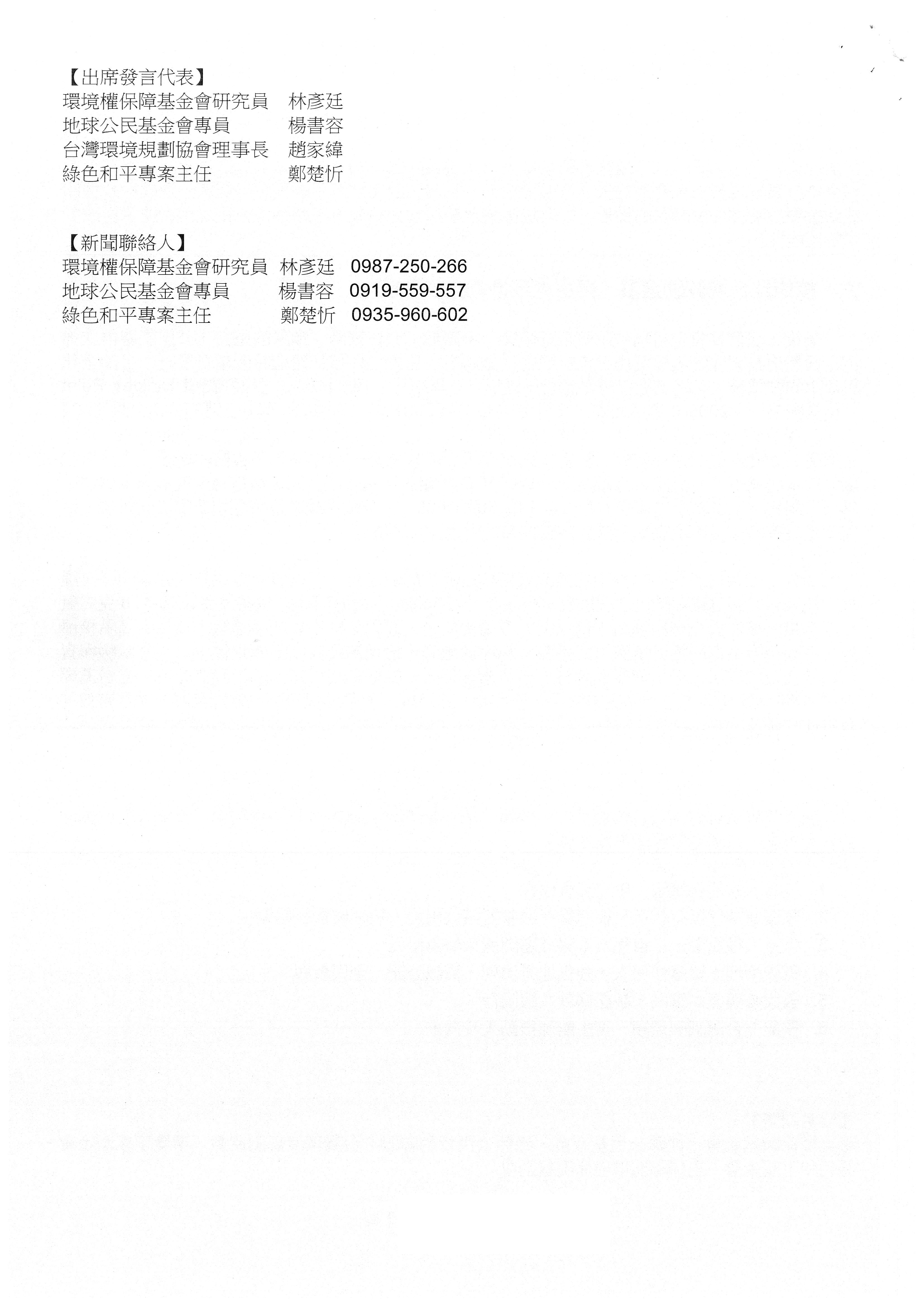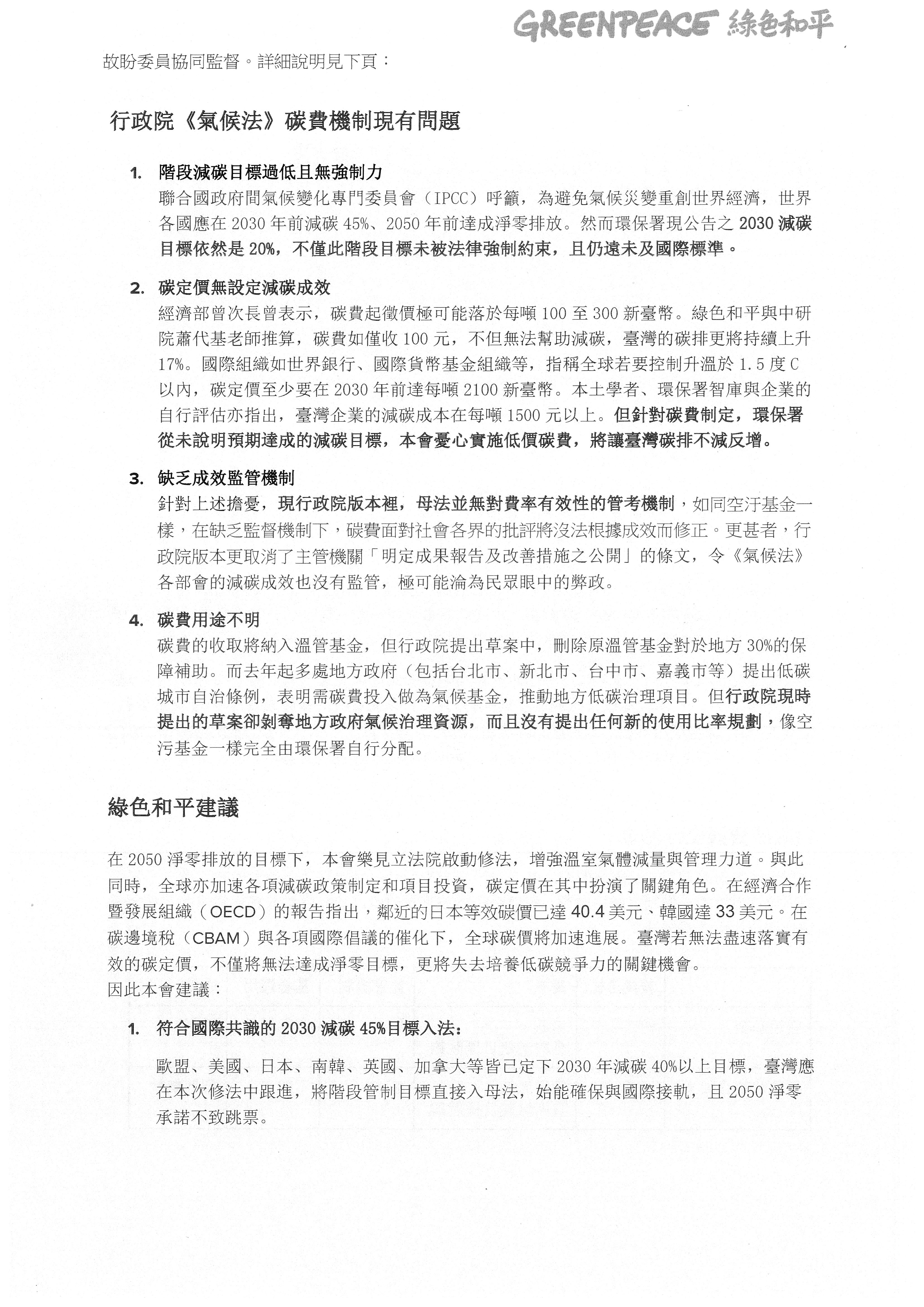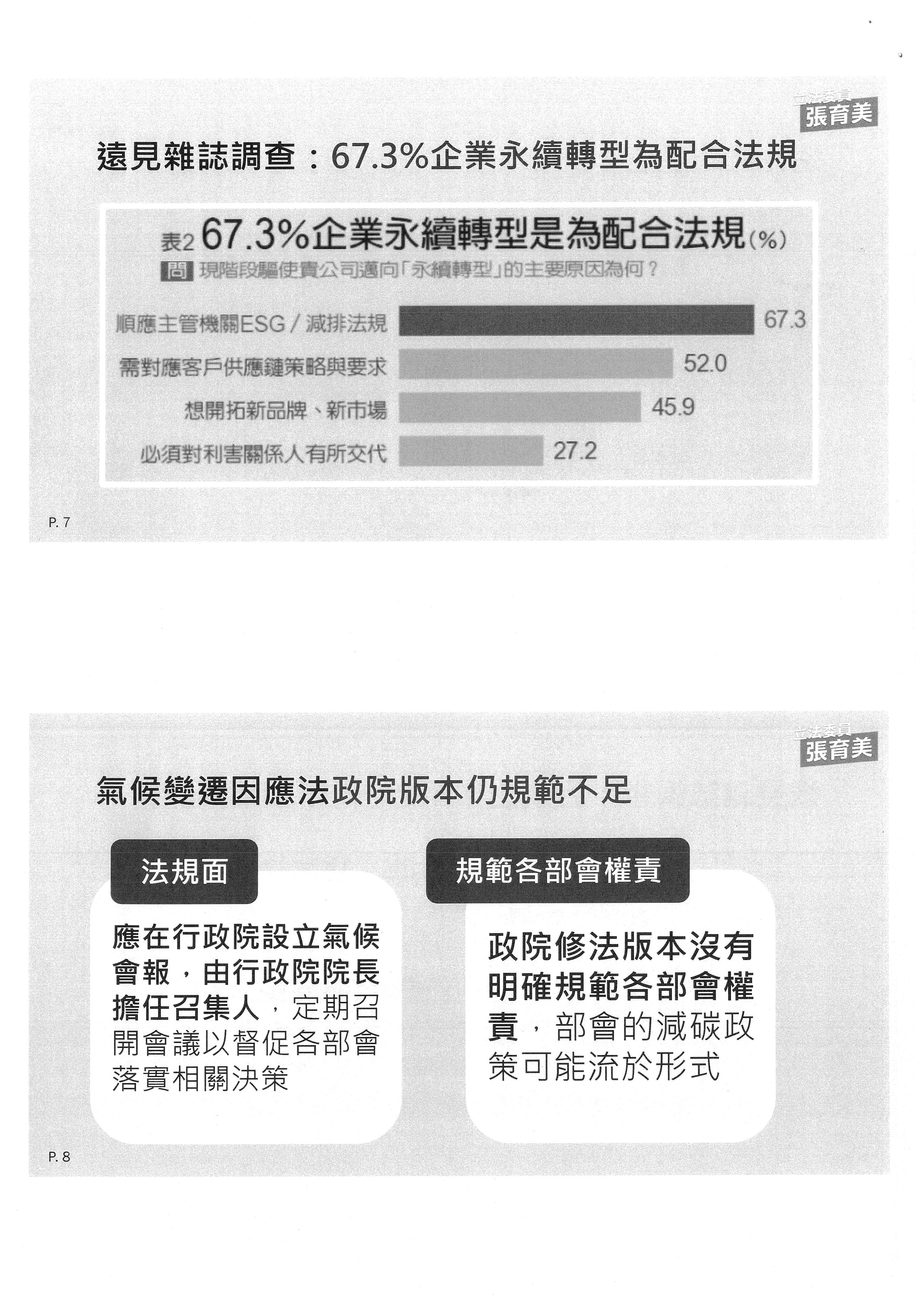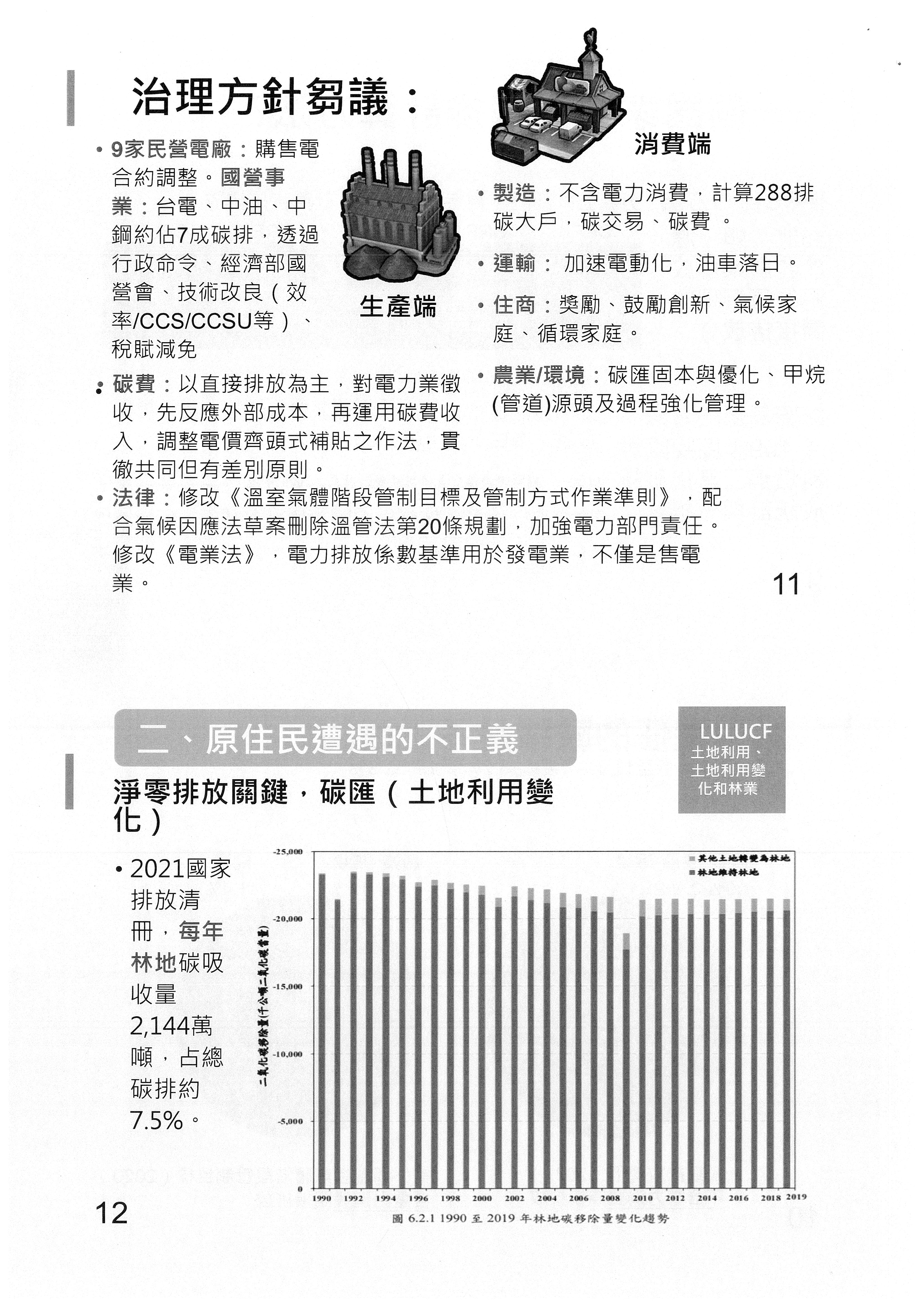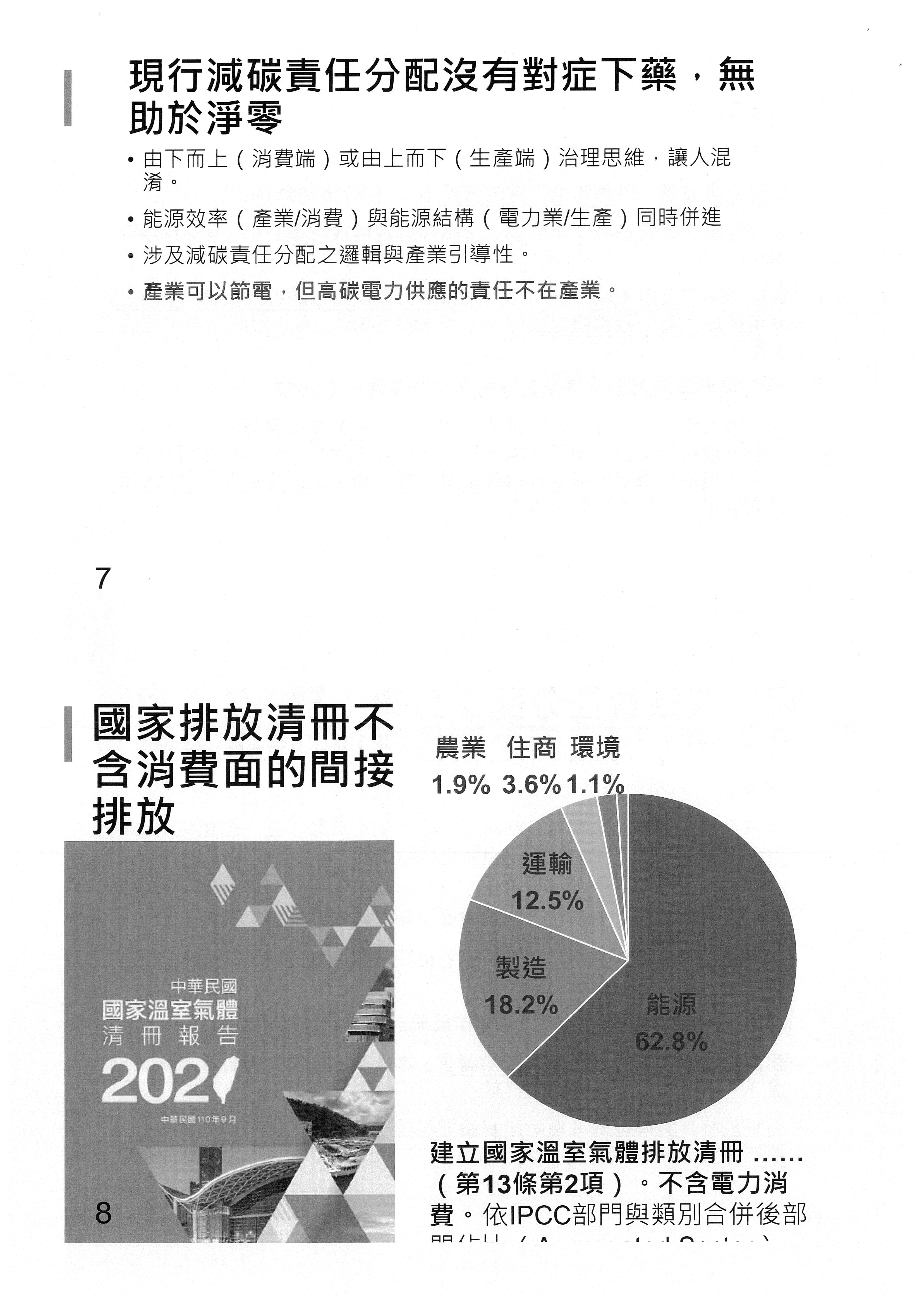另外,這裡有一點很重要,就是溫減基金的用途,不可以用在補貼污染源,就是要符合污染者付費原則,另外也要用來移除溫室氣體,這一點是非常重要,我們現在如果不移除溫室氣體就是債留子孫,因為2050年之後是要淨負排放,那是非常重要的。我的報告到這裡,謝謝。